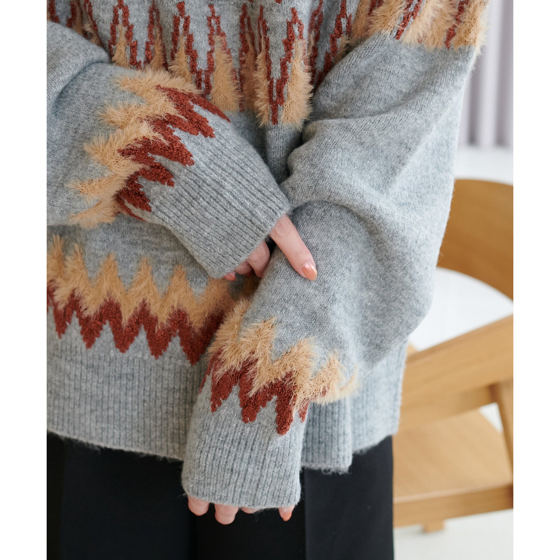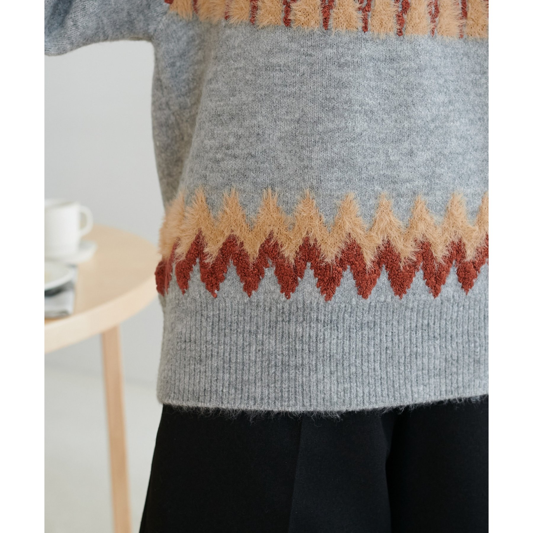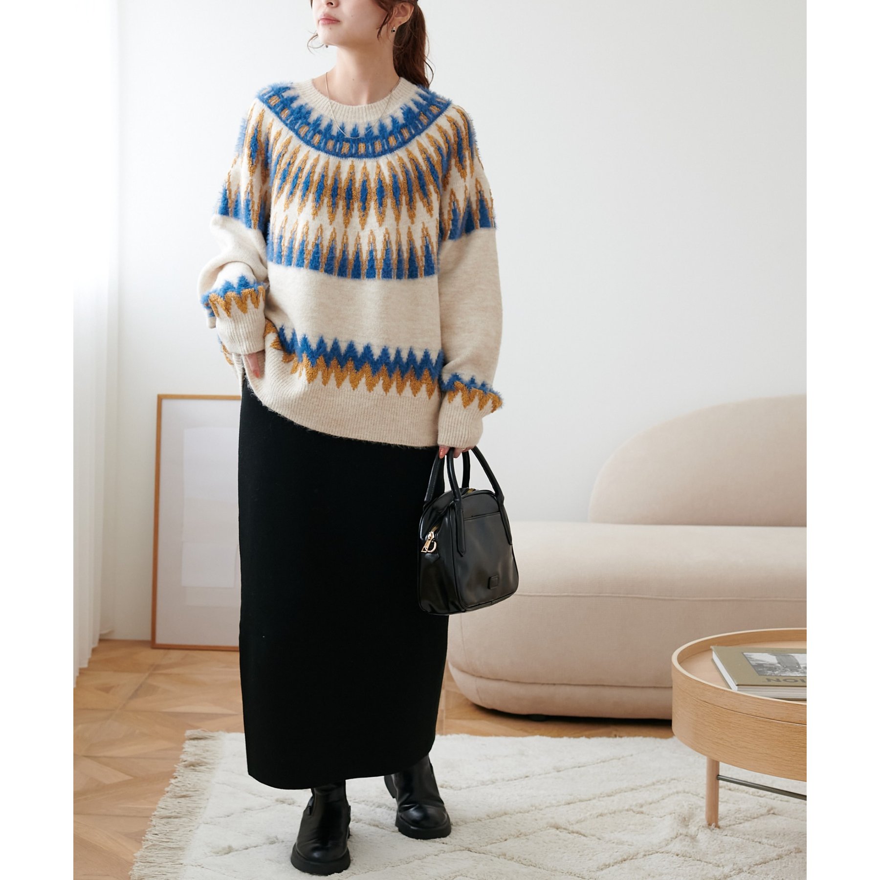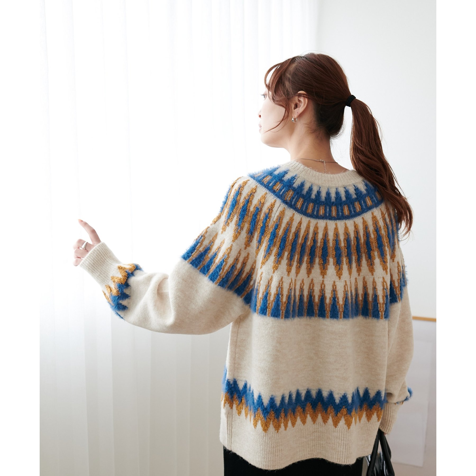 ・シーズンムードを高める求心柄デザインで、アクセントになる配色が目を惹く主役級ニット