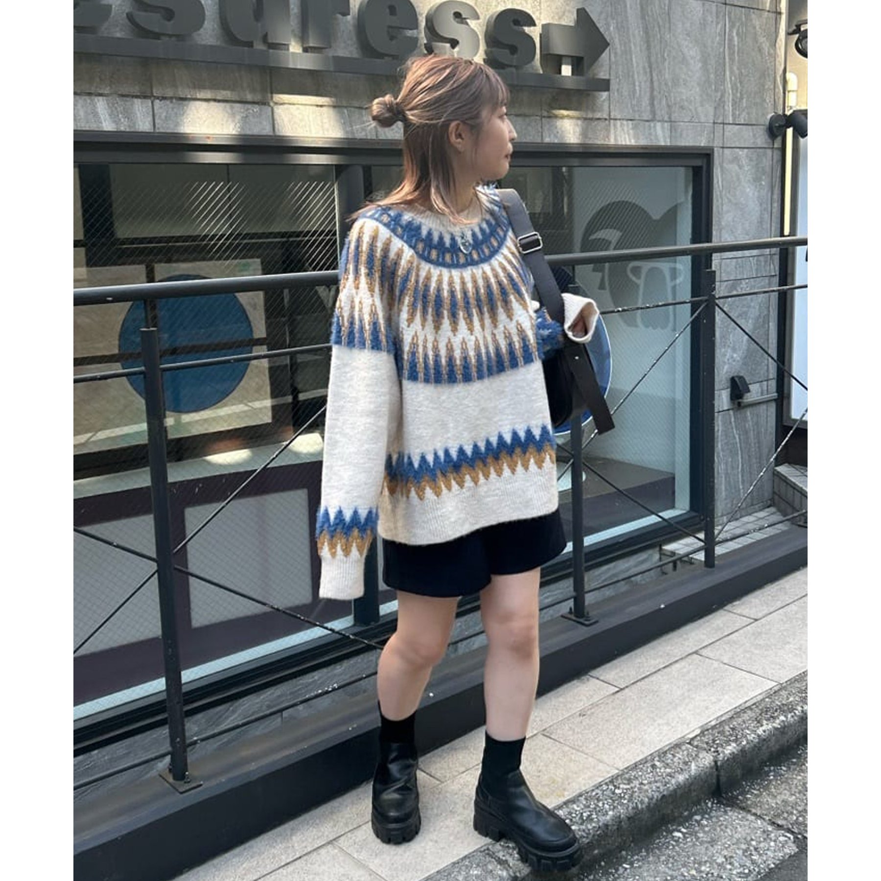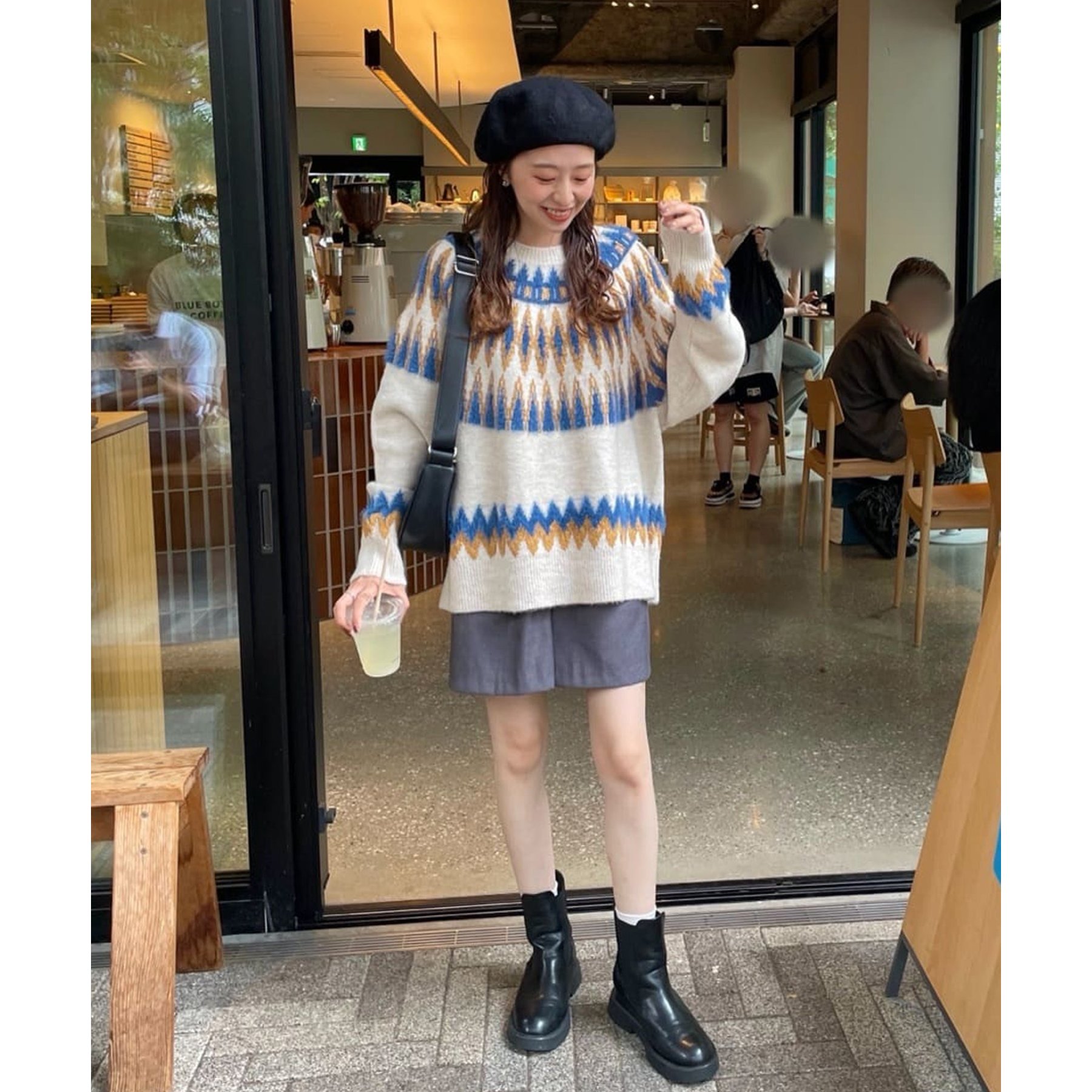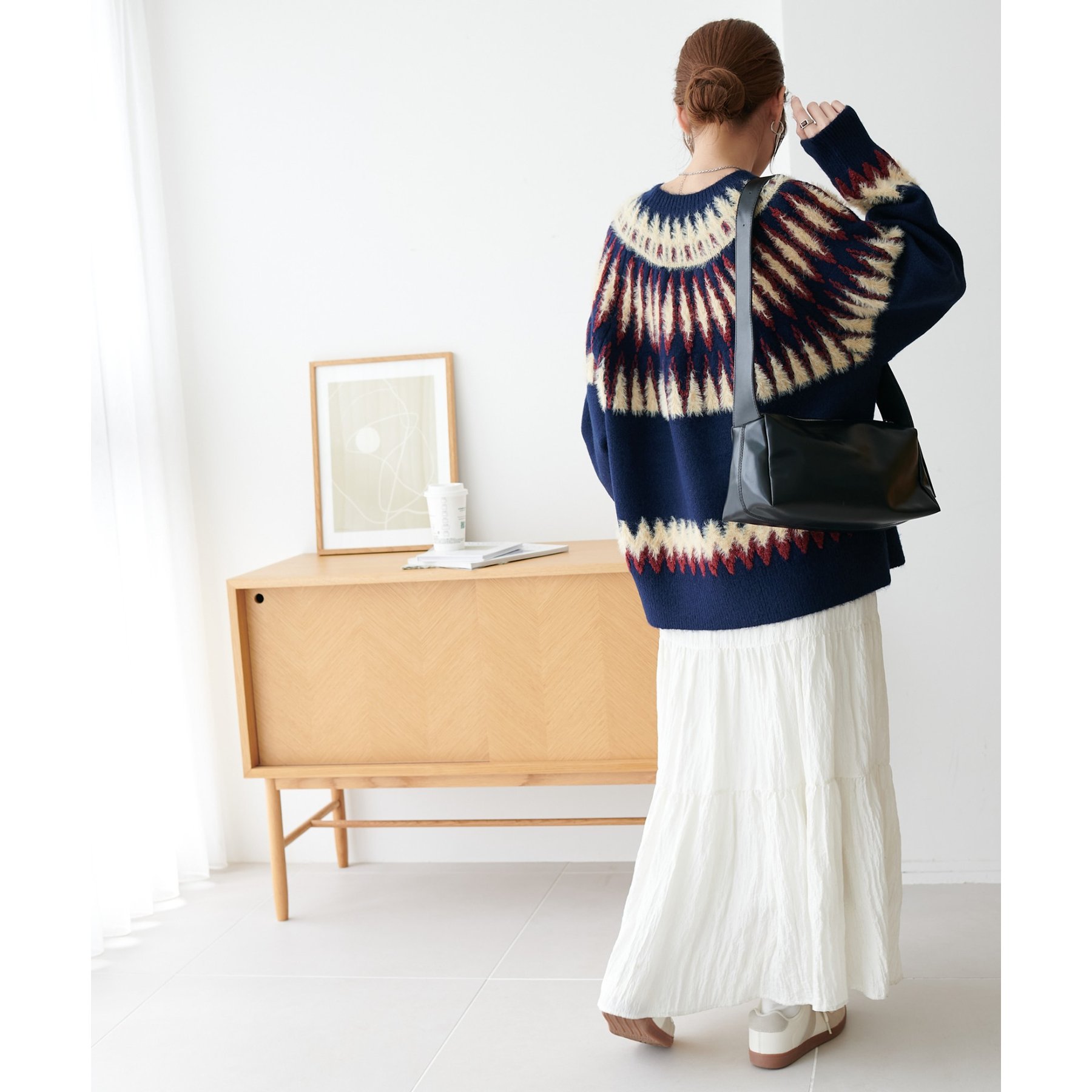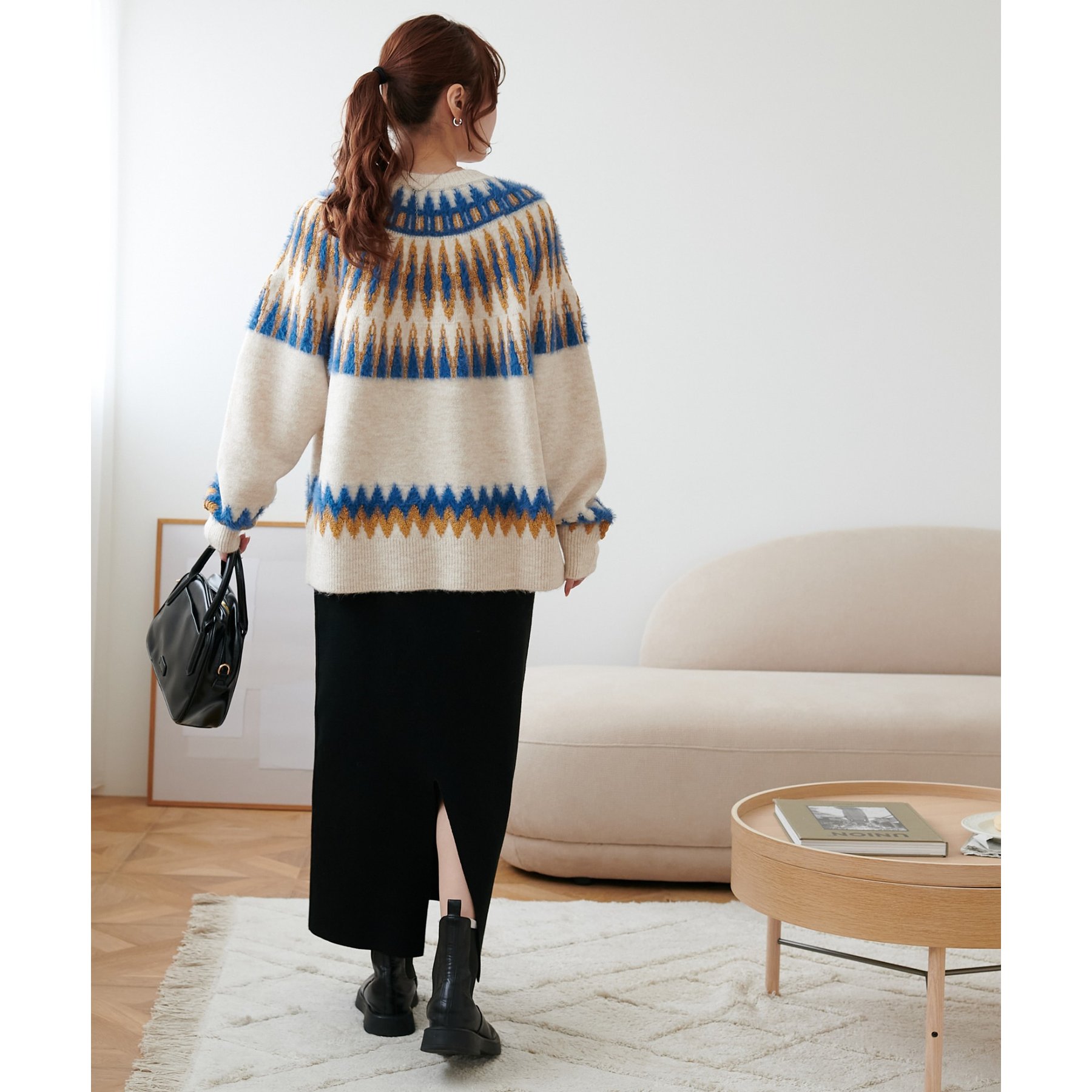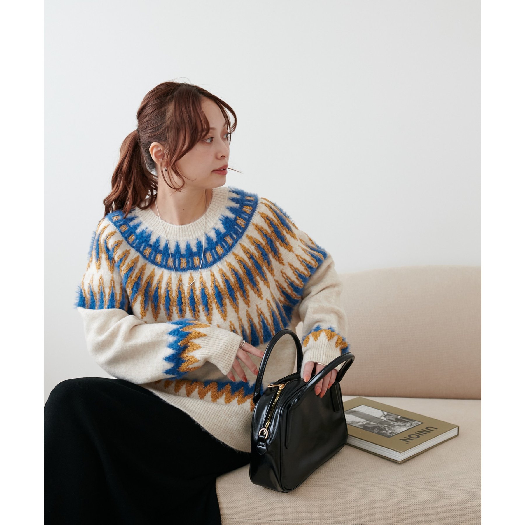 ・シーズンムードを高める求心柄デザインで、アクセントになる配色が目を惹く主役級ニット