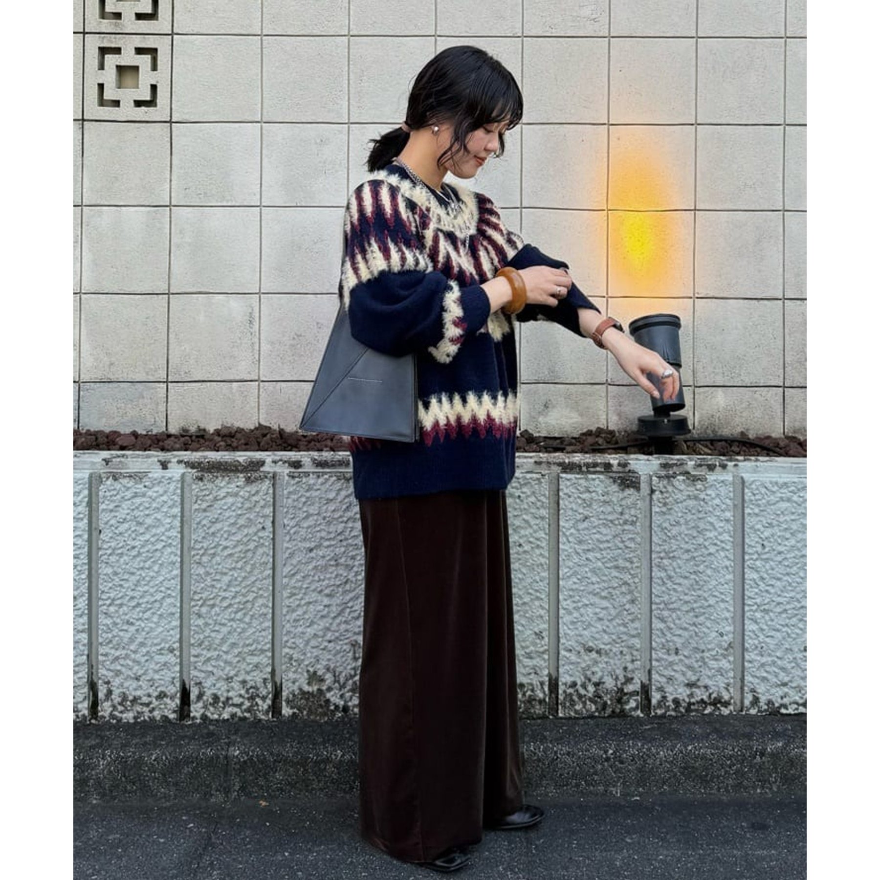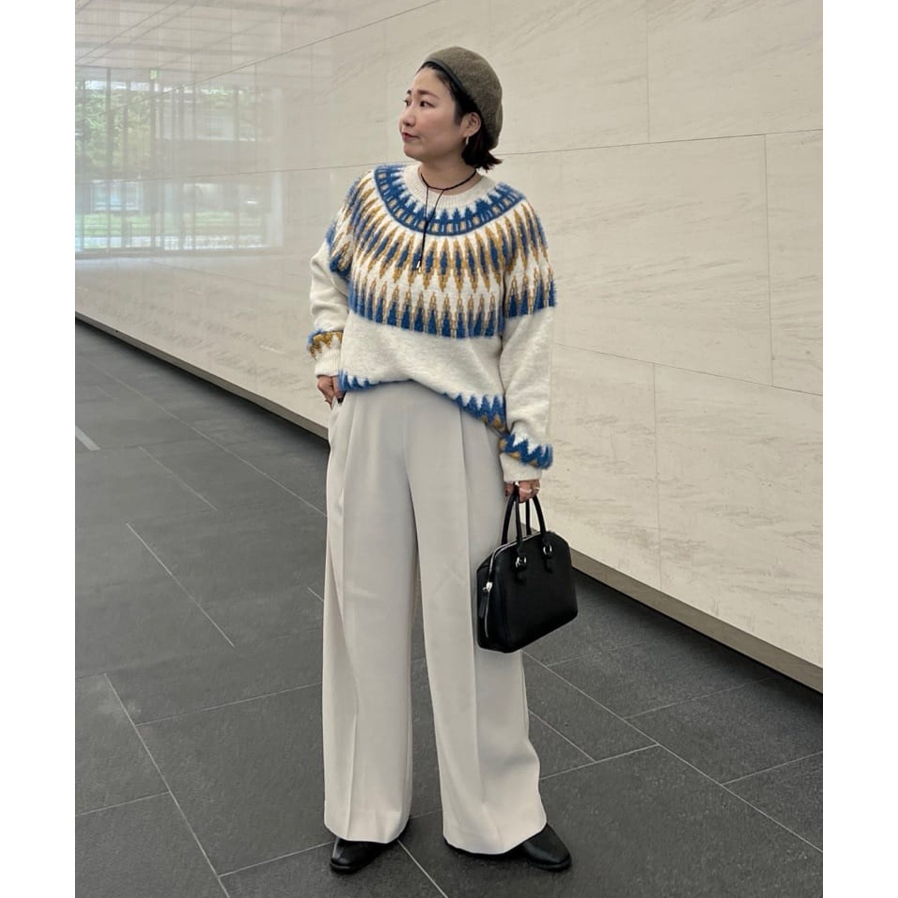 ・存在感のある柄ニットなので、ボトムスはシンプルなナロースカート・ワイドパンツ・デニムパンツがおすすめ