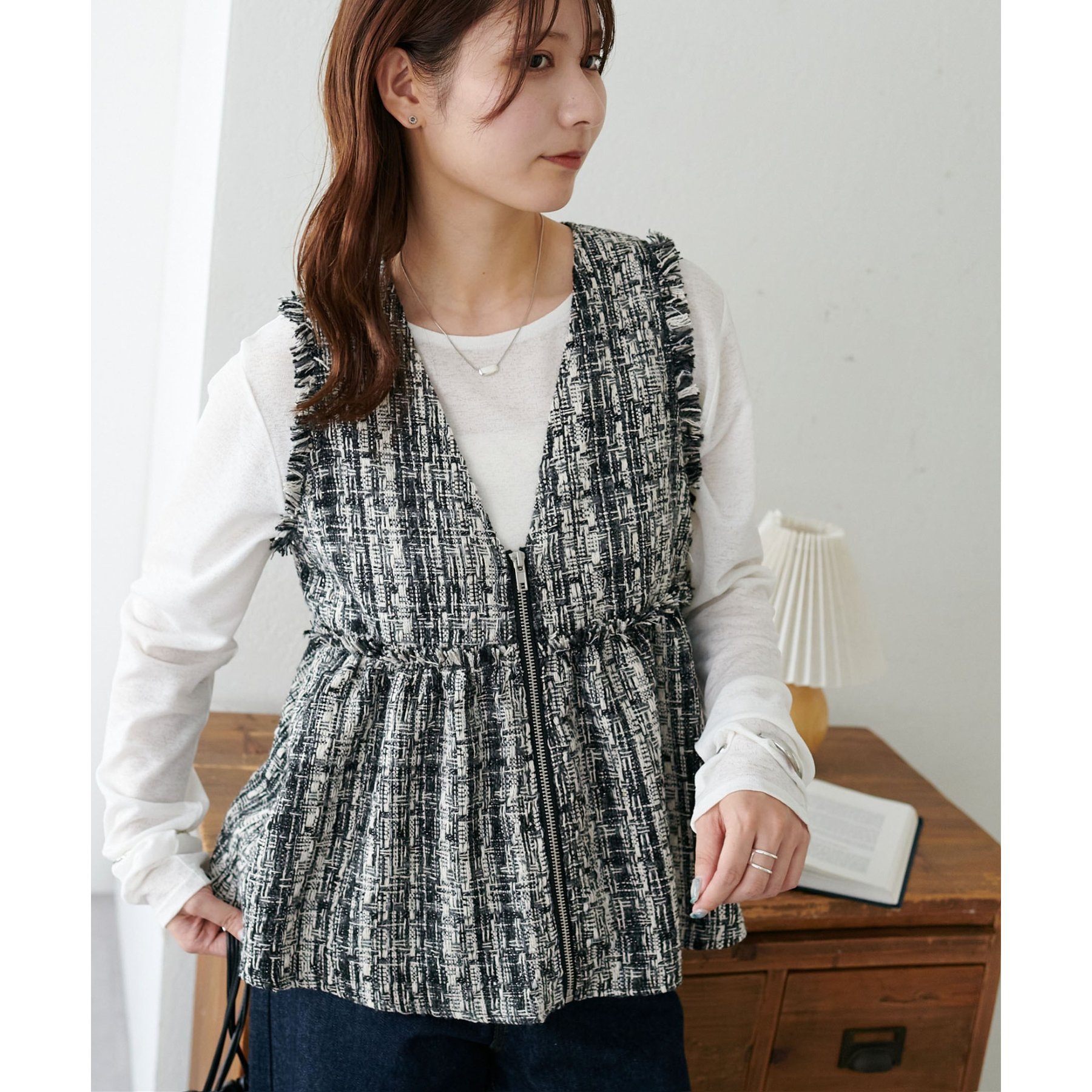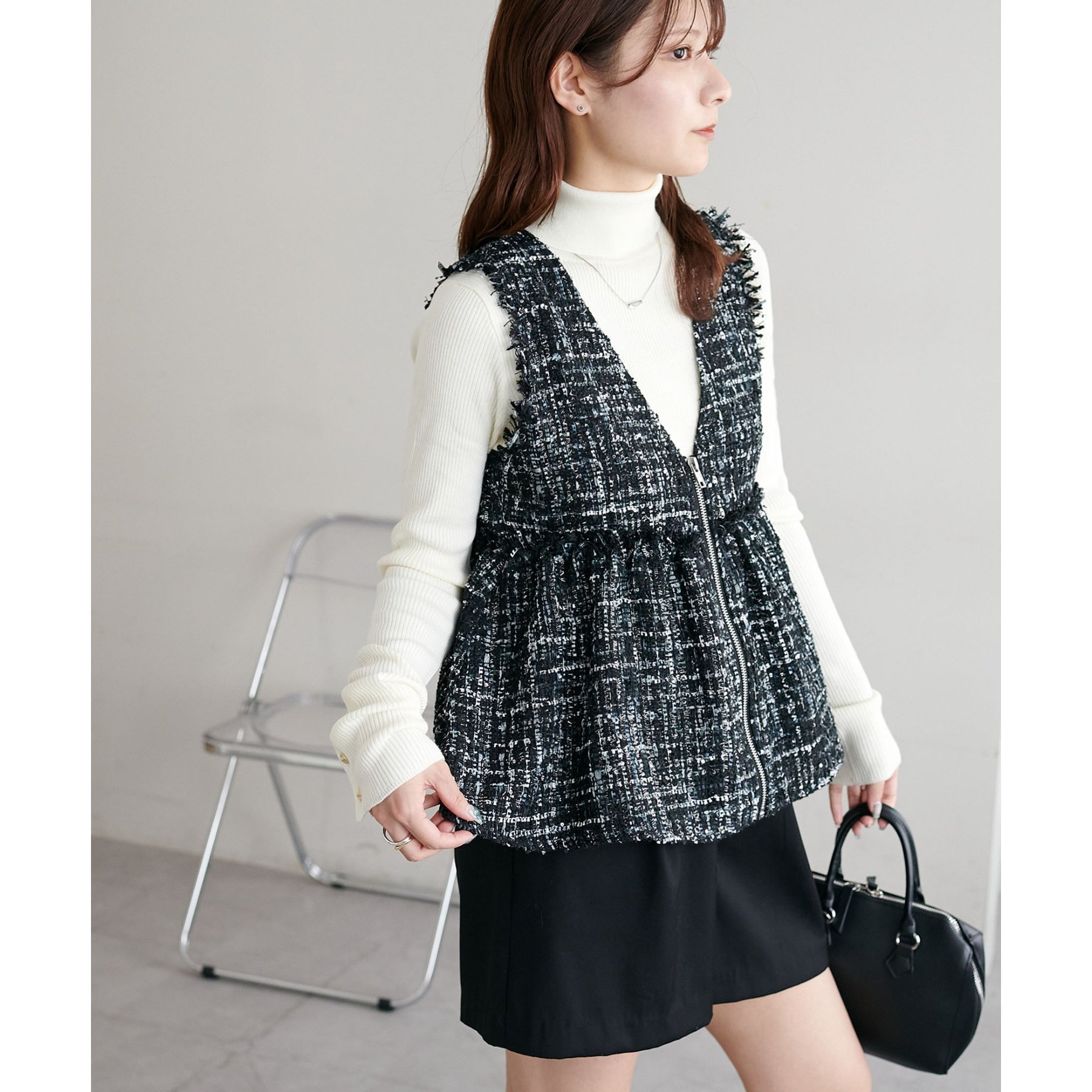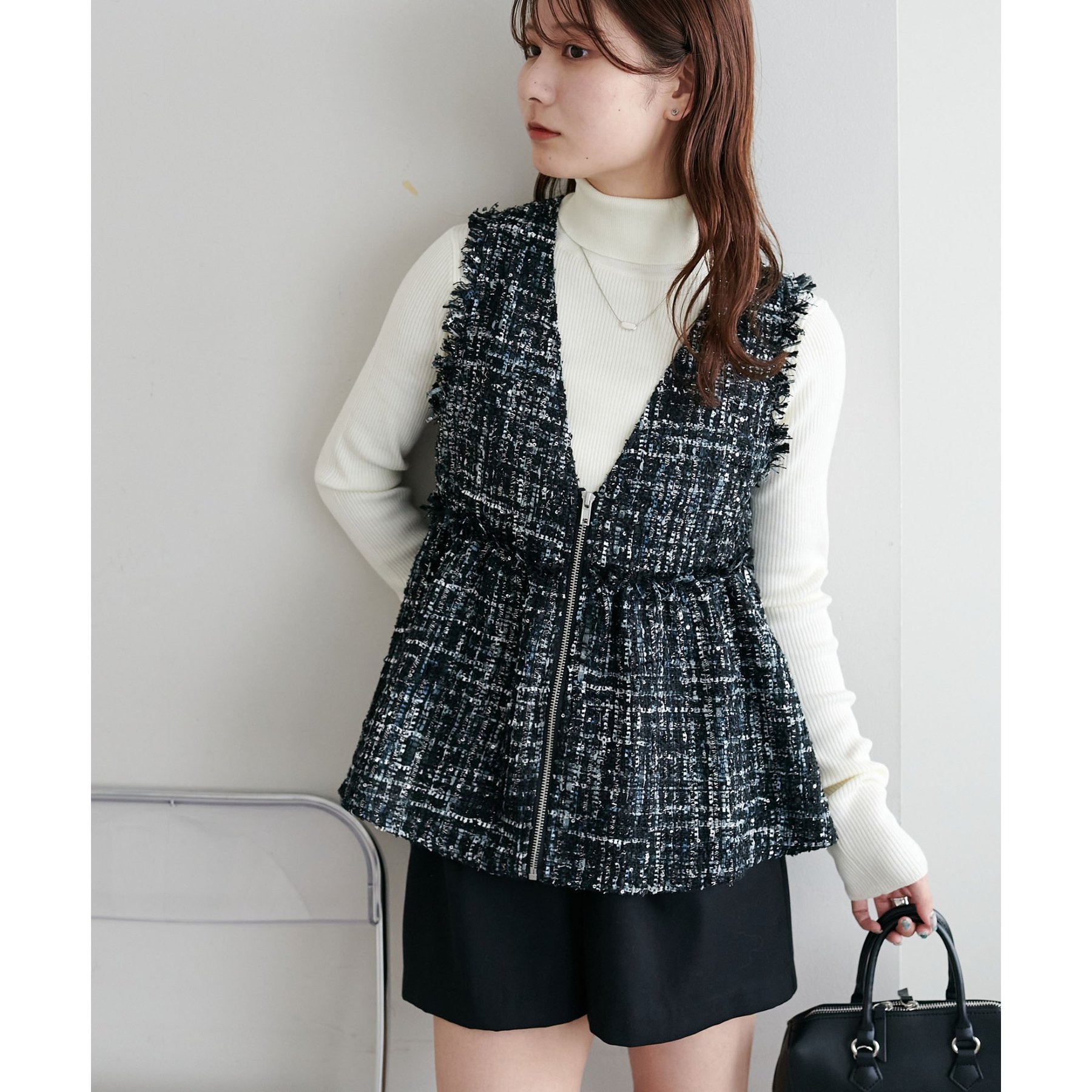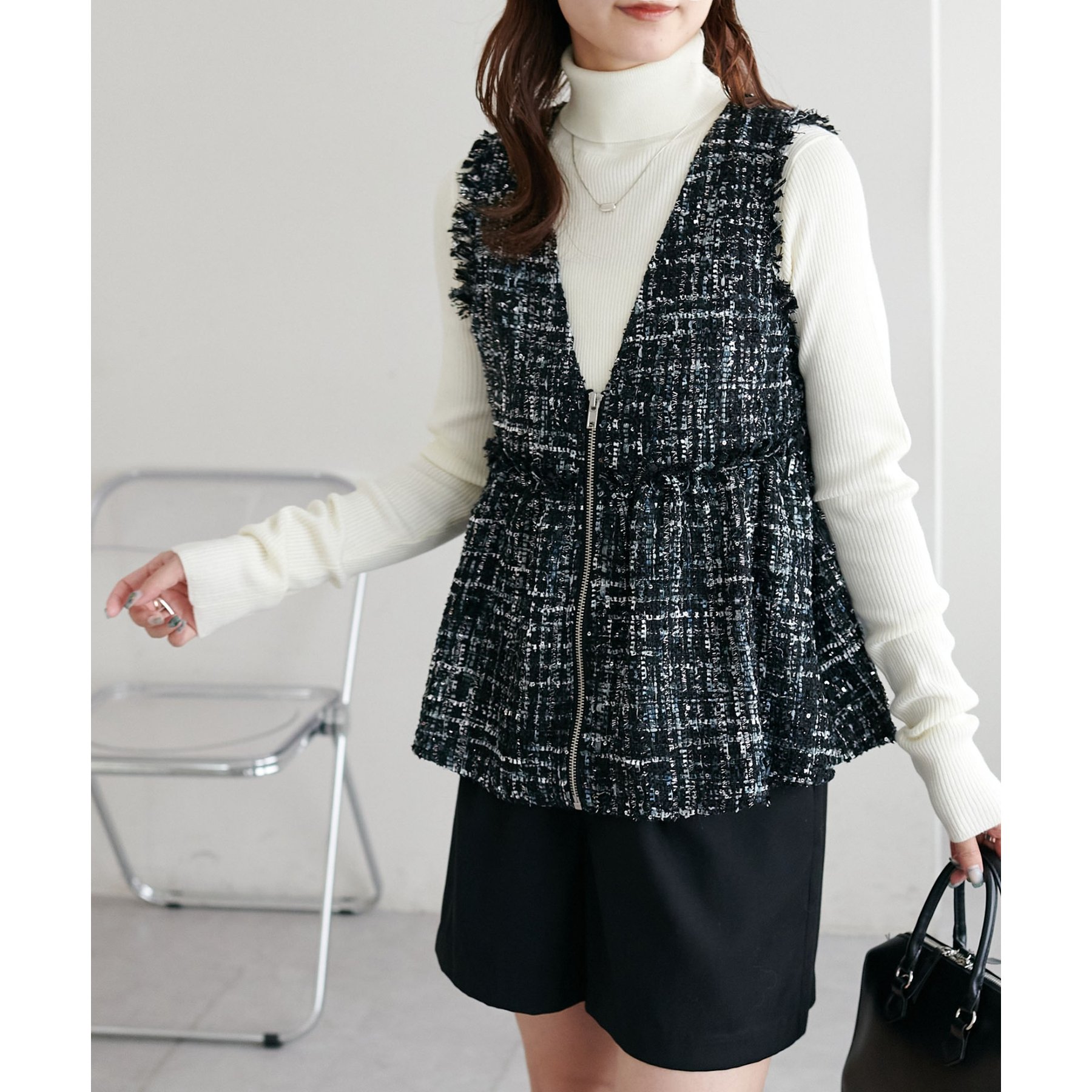 トレンドのツイード素材を使用した、上品で華やかな印象のZIPベスト。