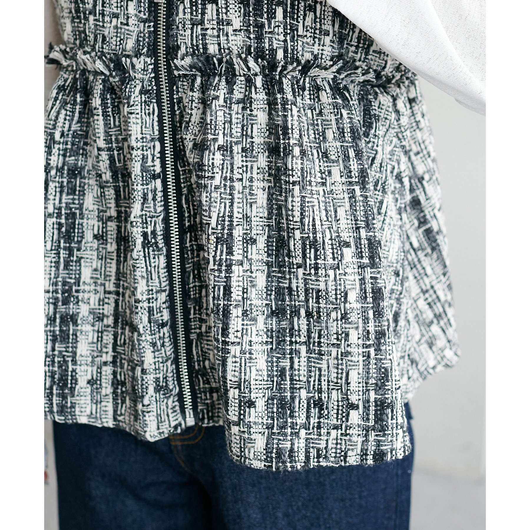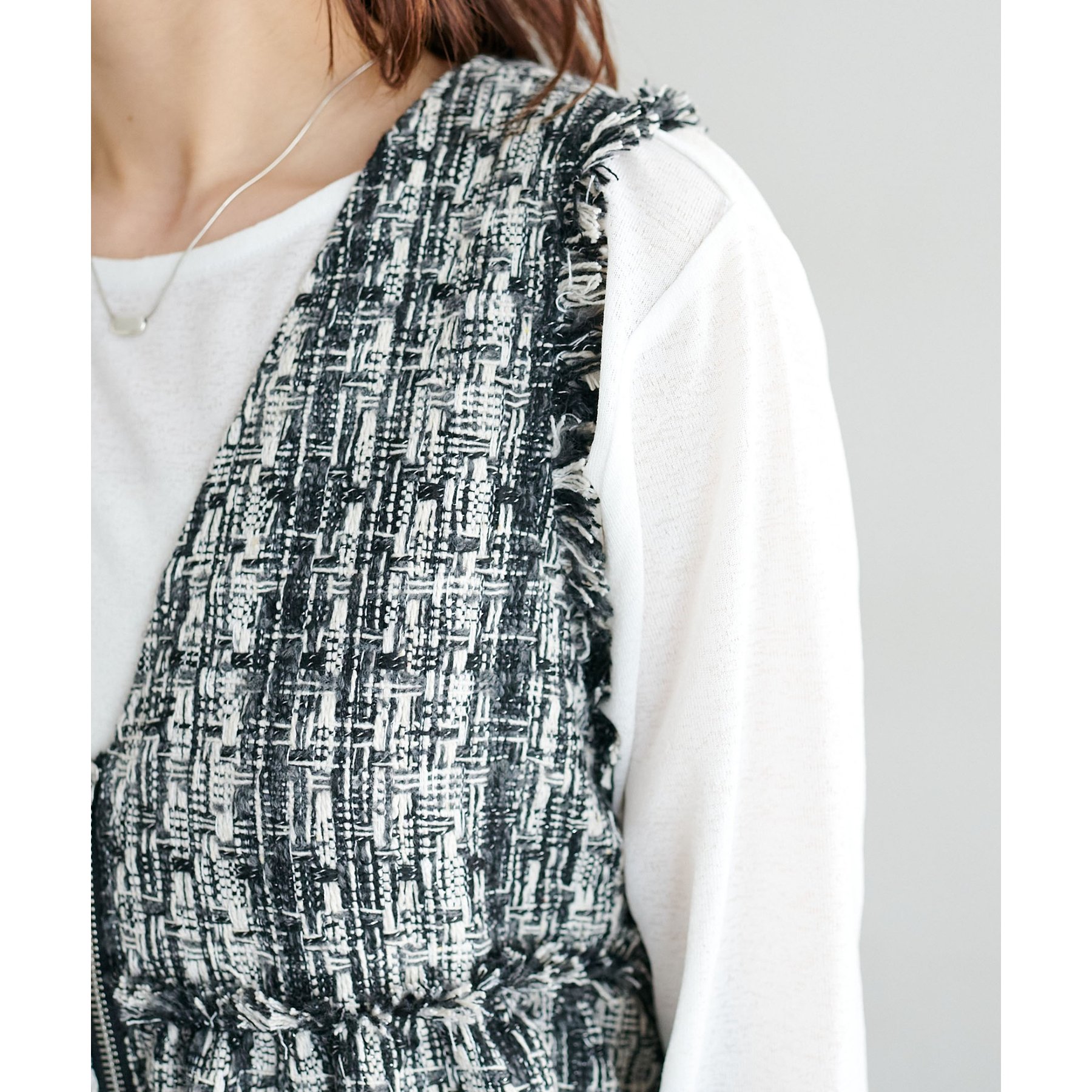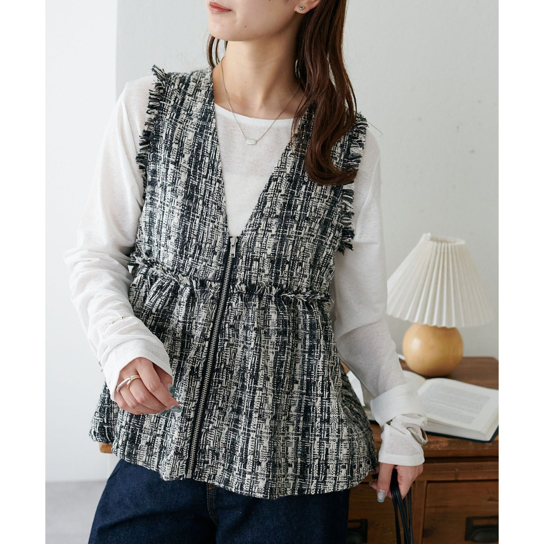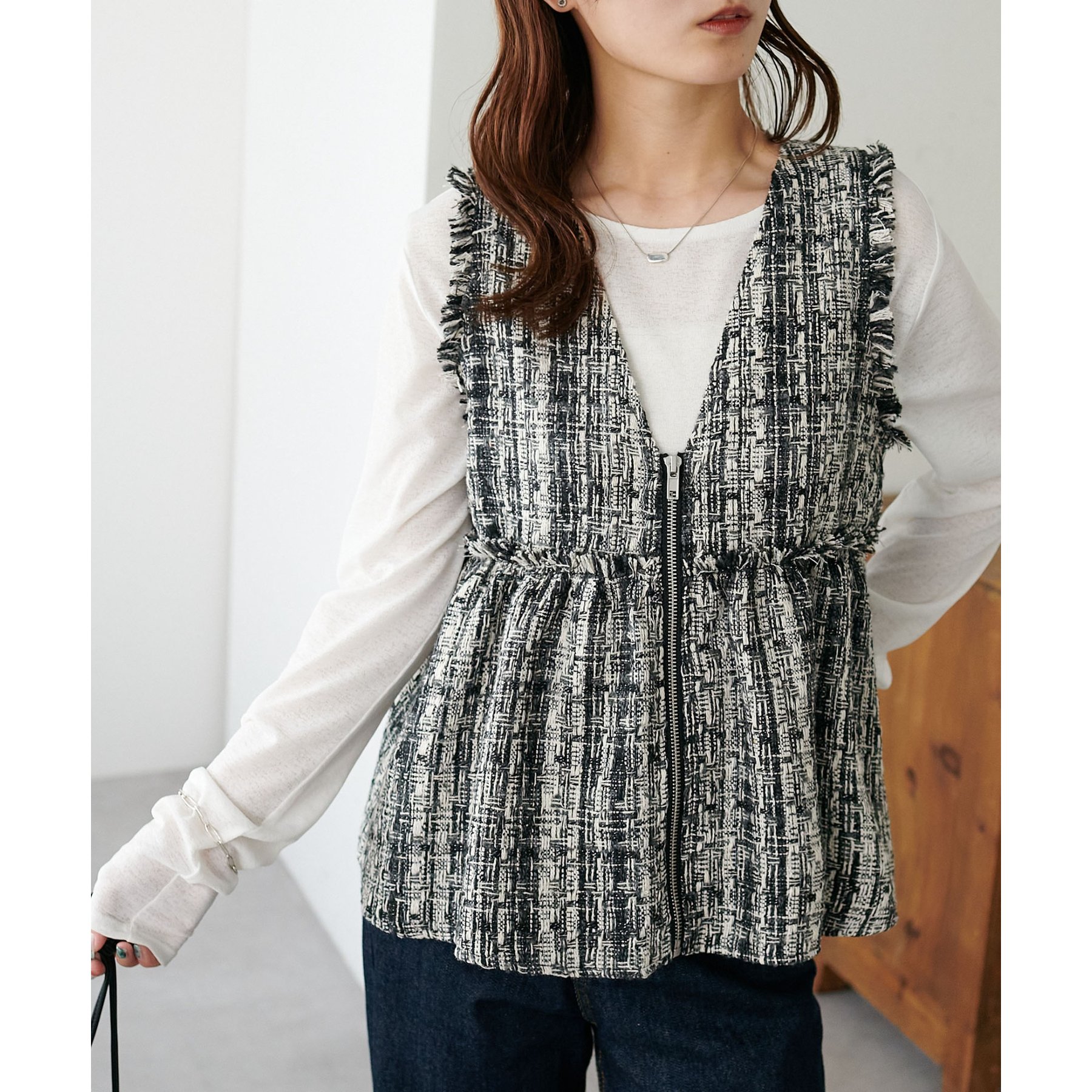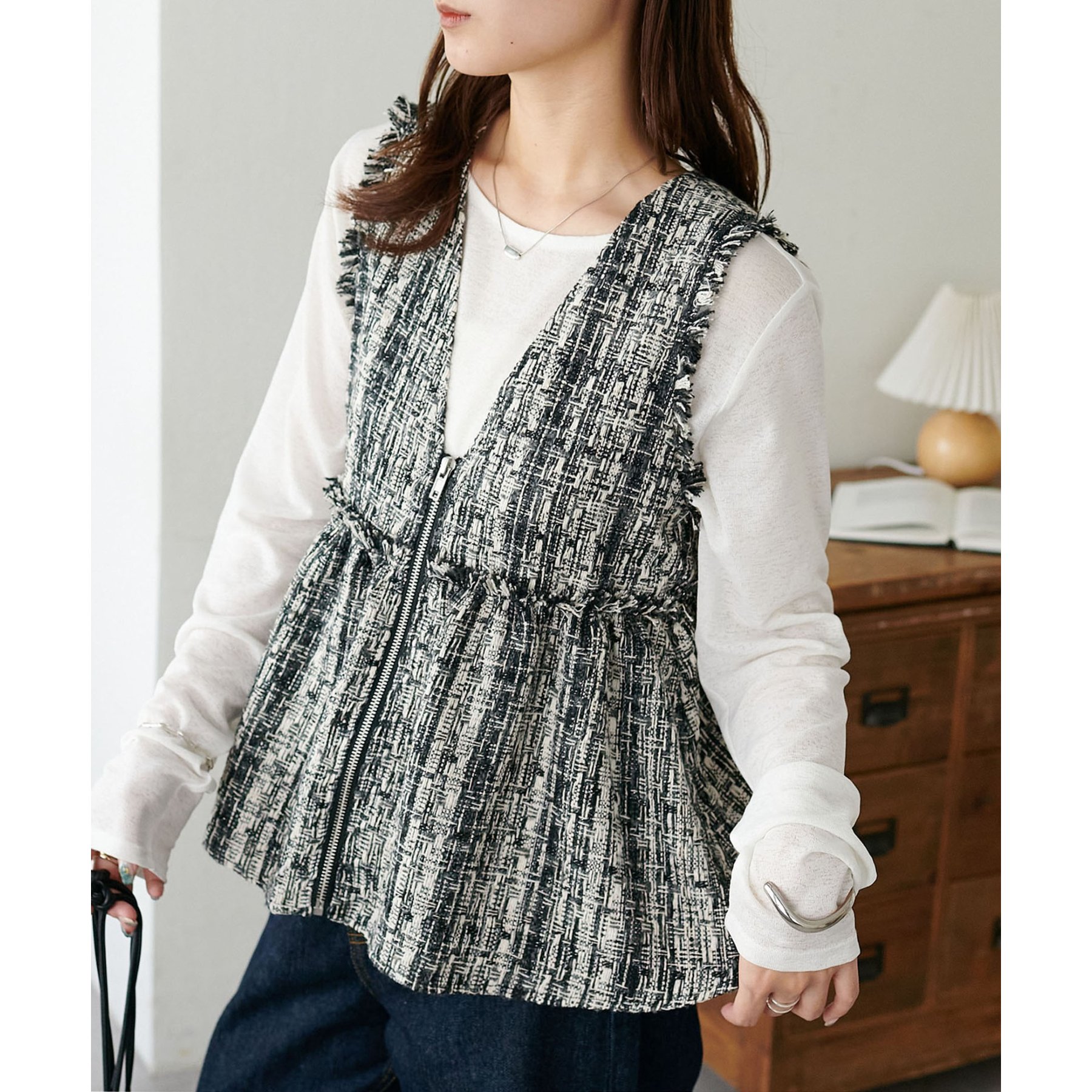 トレンドのツイード素材を使用した、上品で華やかな印象のZIPベスト。