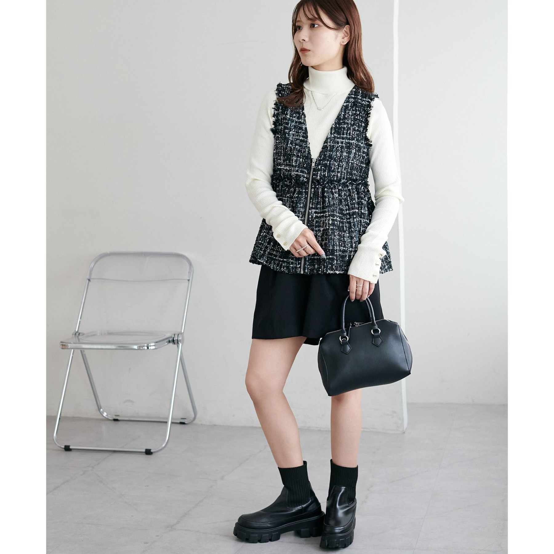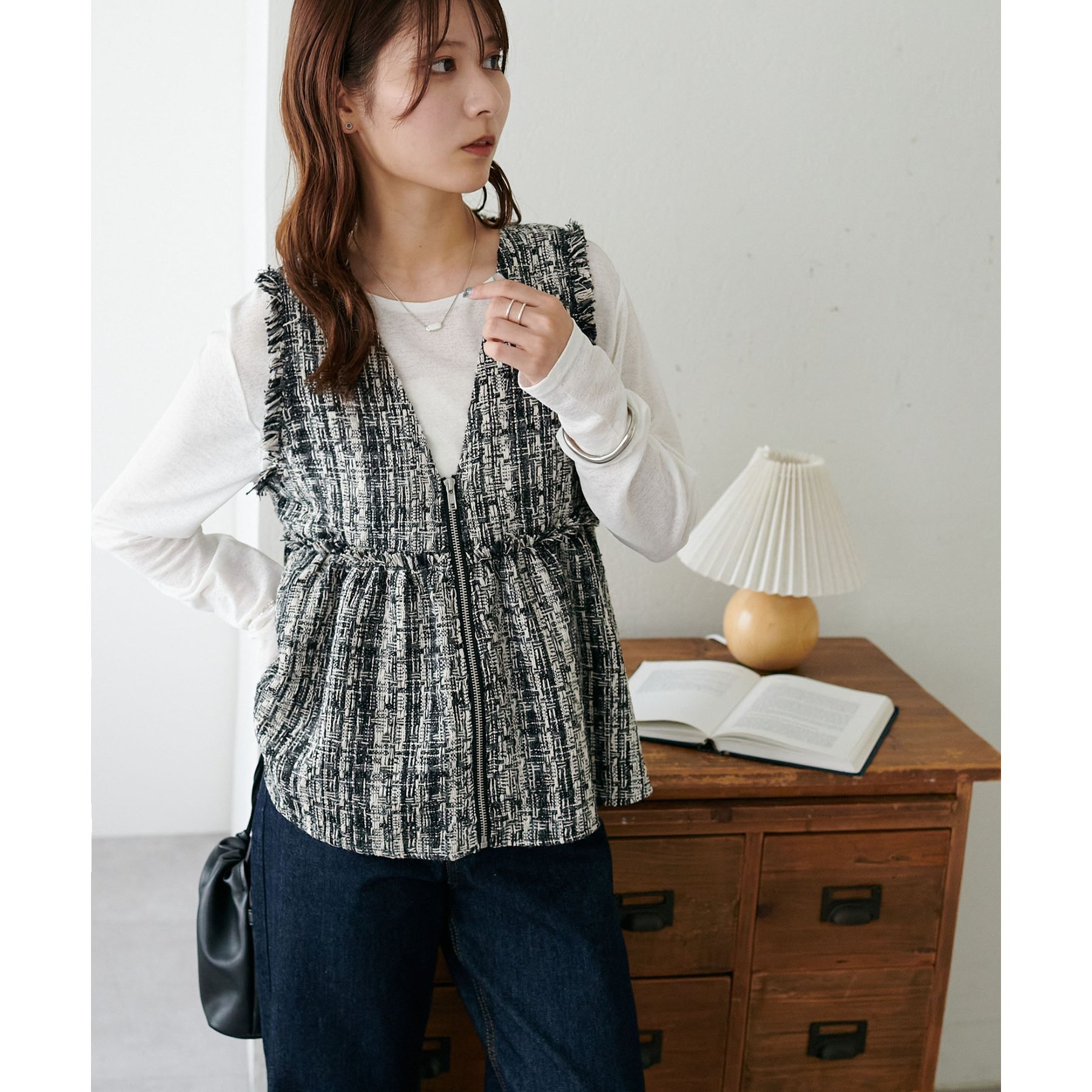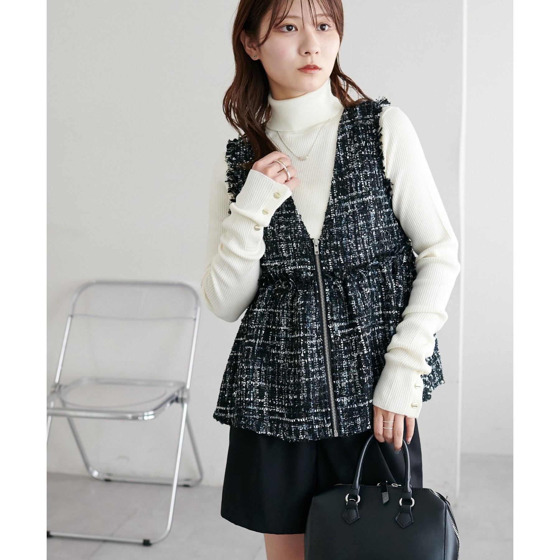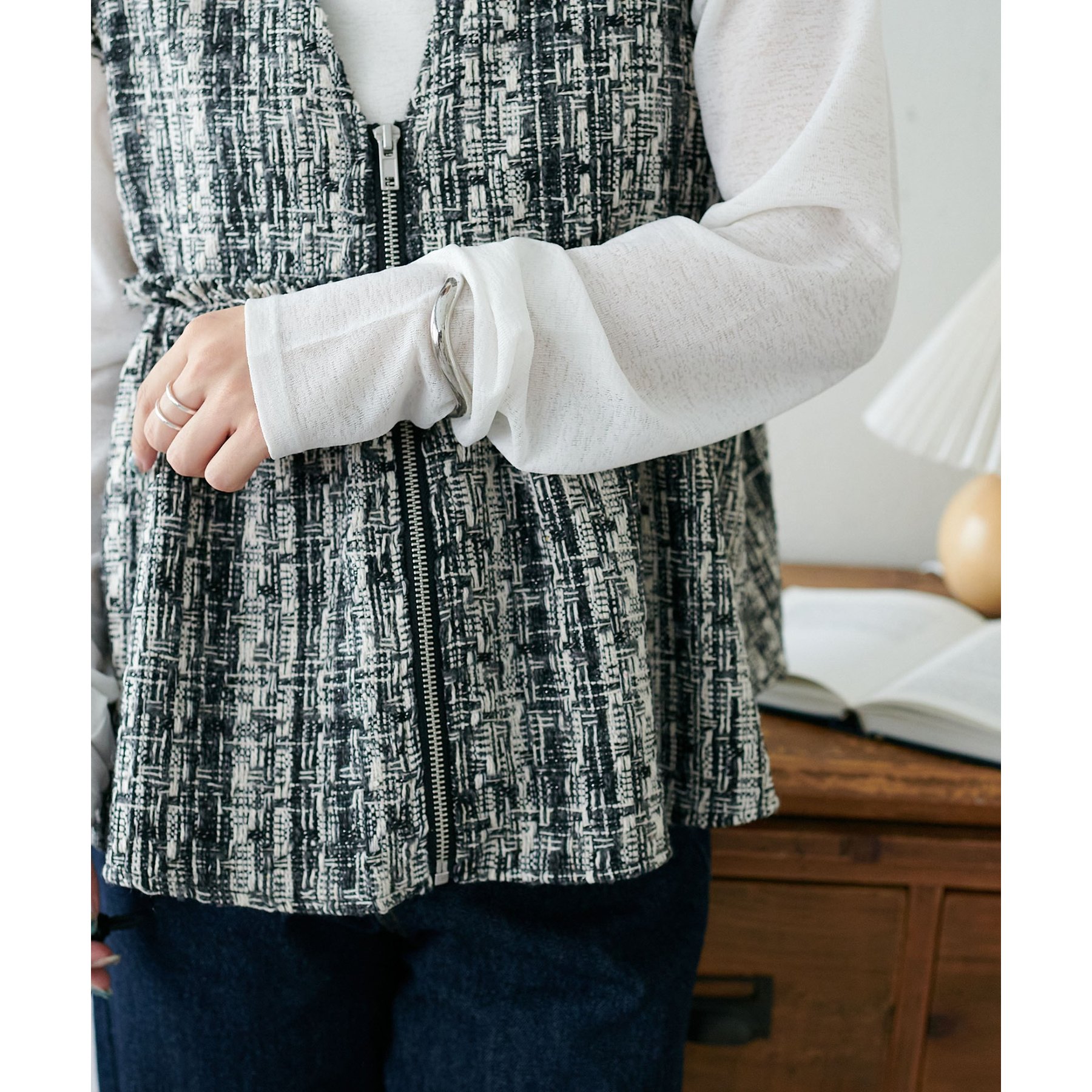 トレンドのツイード素材を使用した、上品で華やかな印象のZIPベスト。