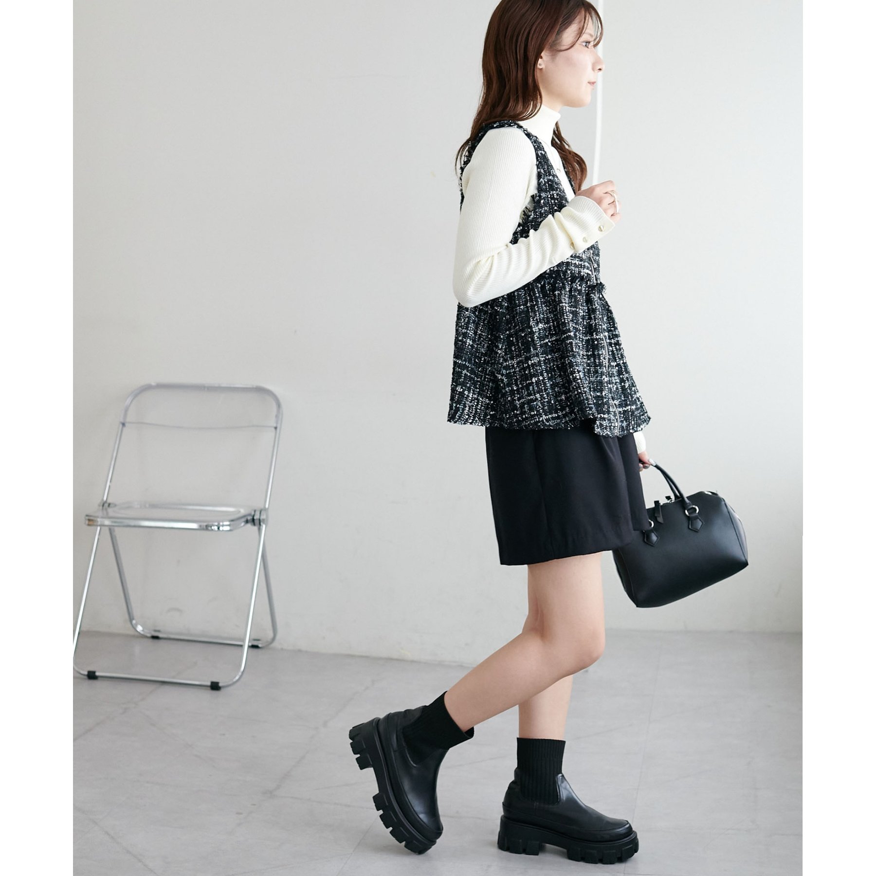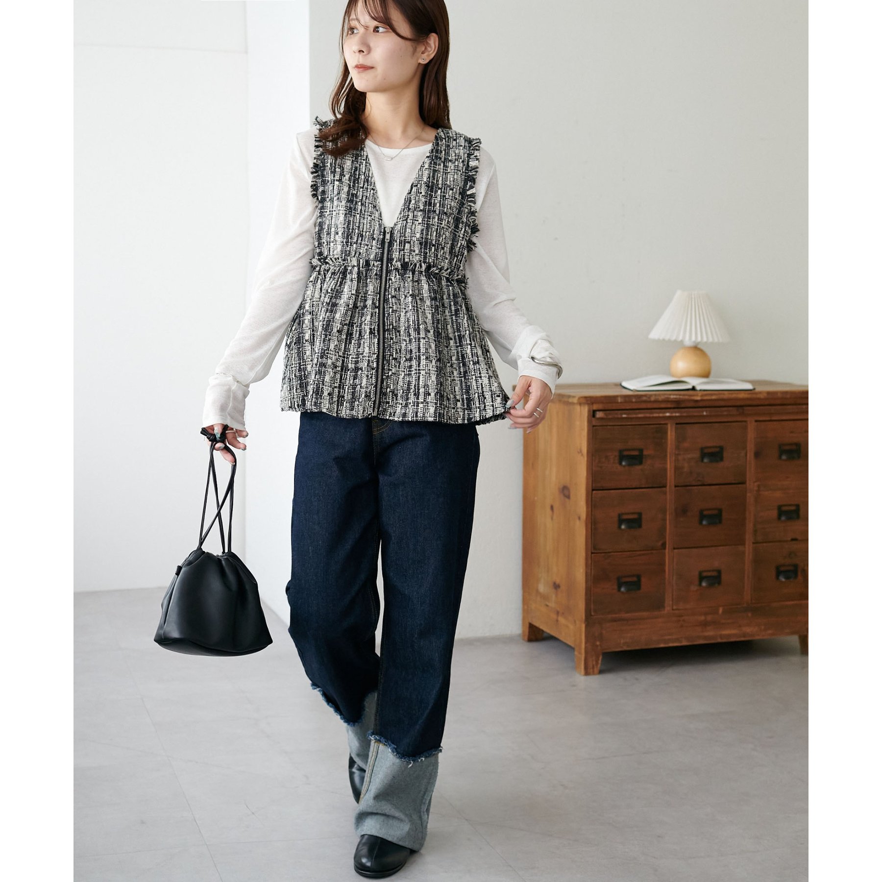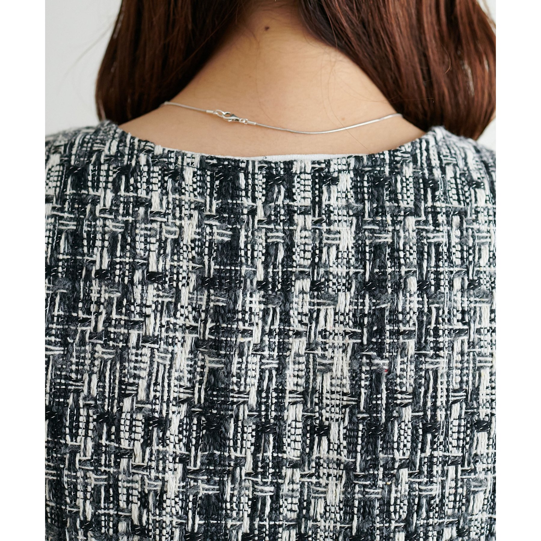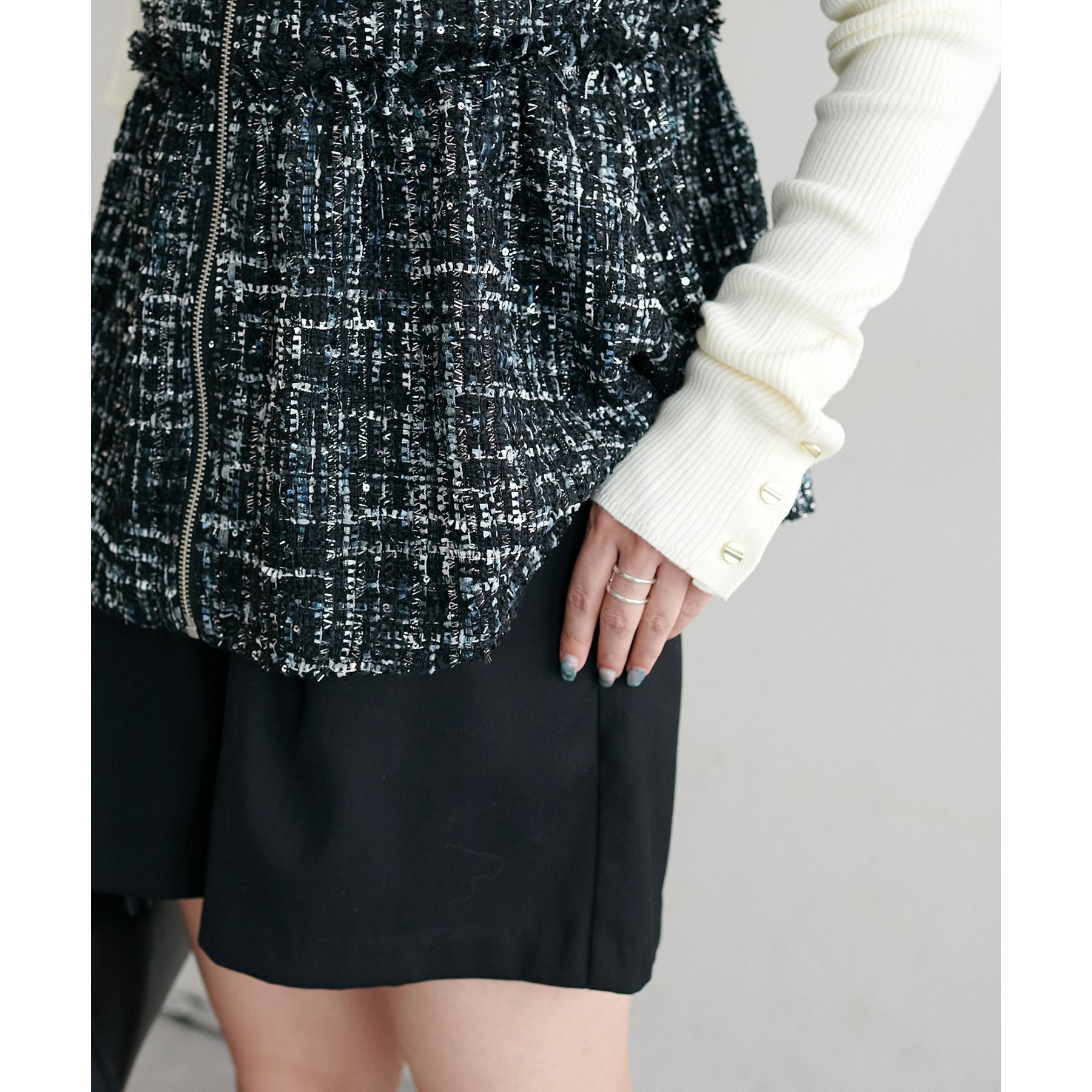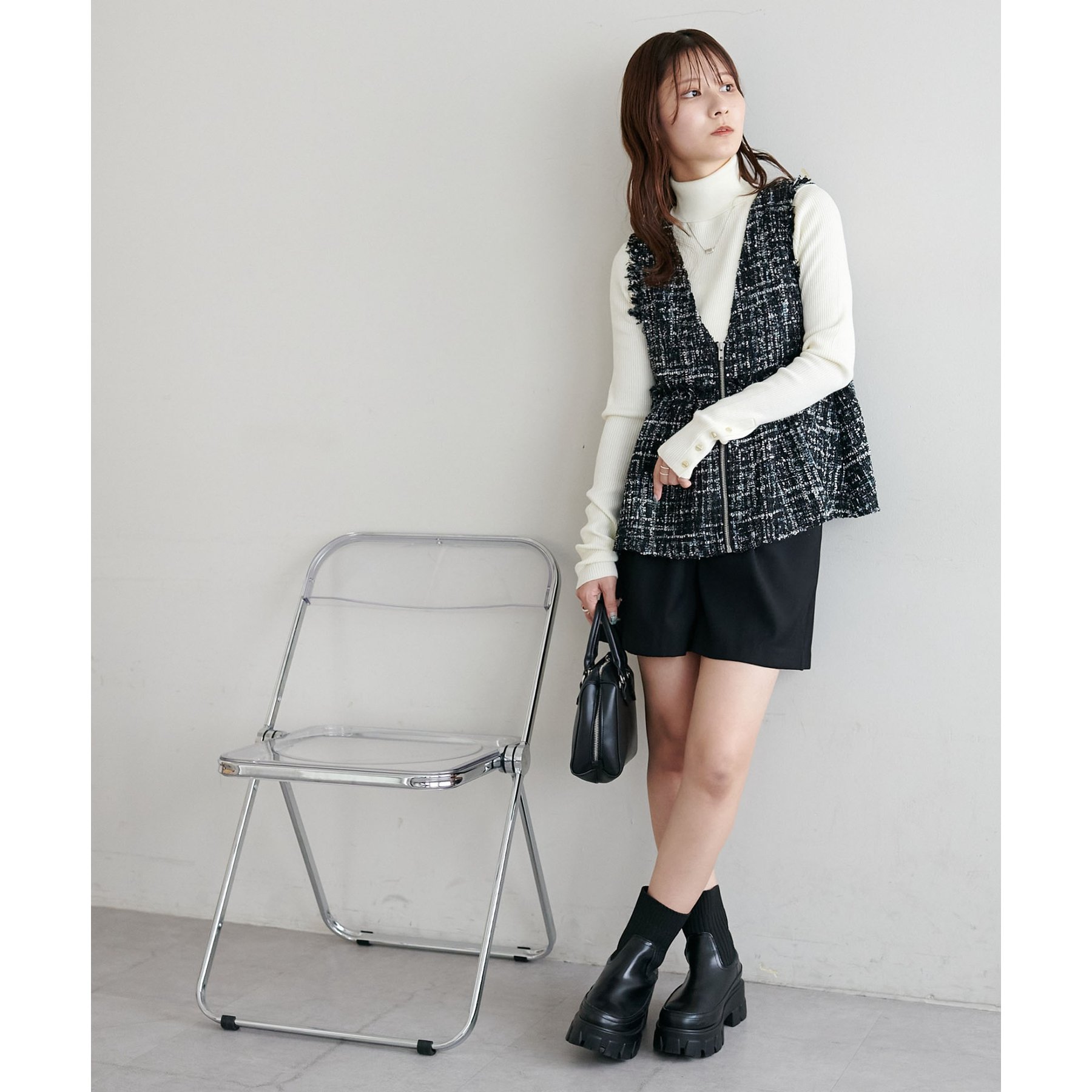 トレンドのツイード素材を使用した、上品で華やかな印象のZIPベスト。
