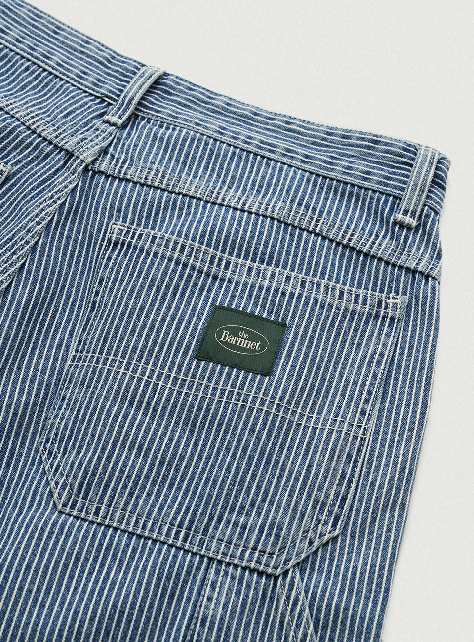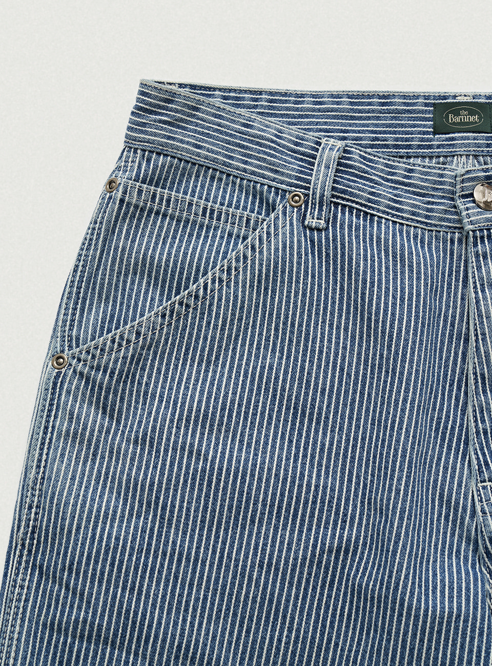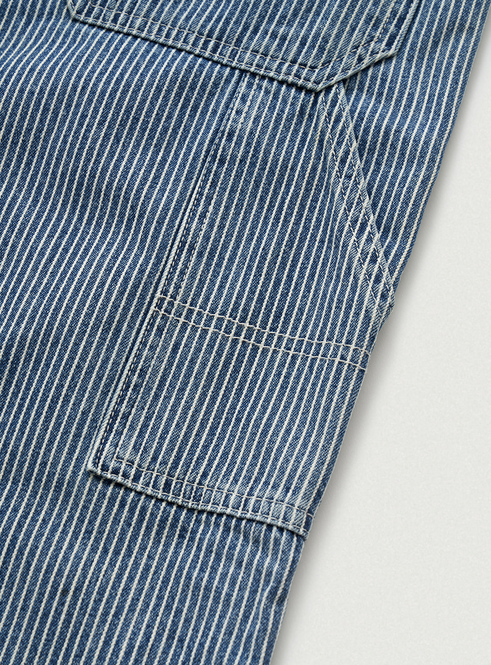 "ブルーカラーの独特なテクスチャーが際立つヒッコリーストライプデニムファブリック。