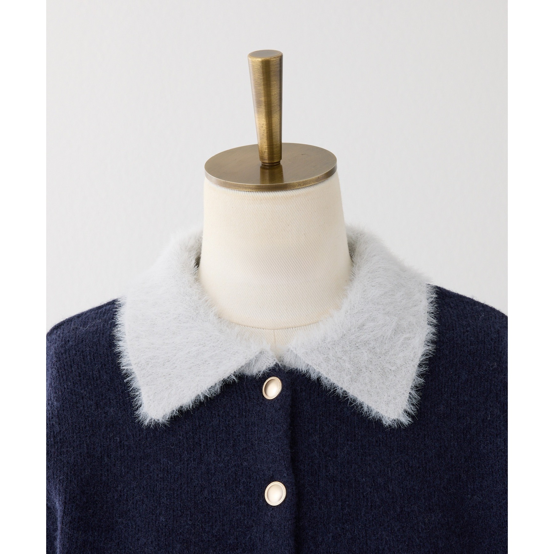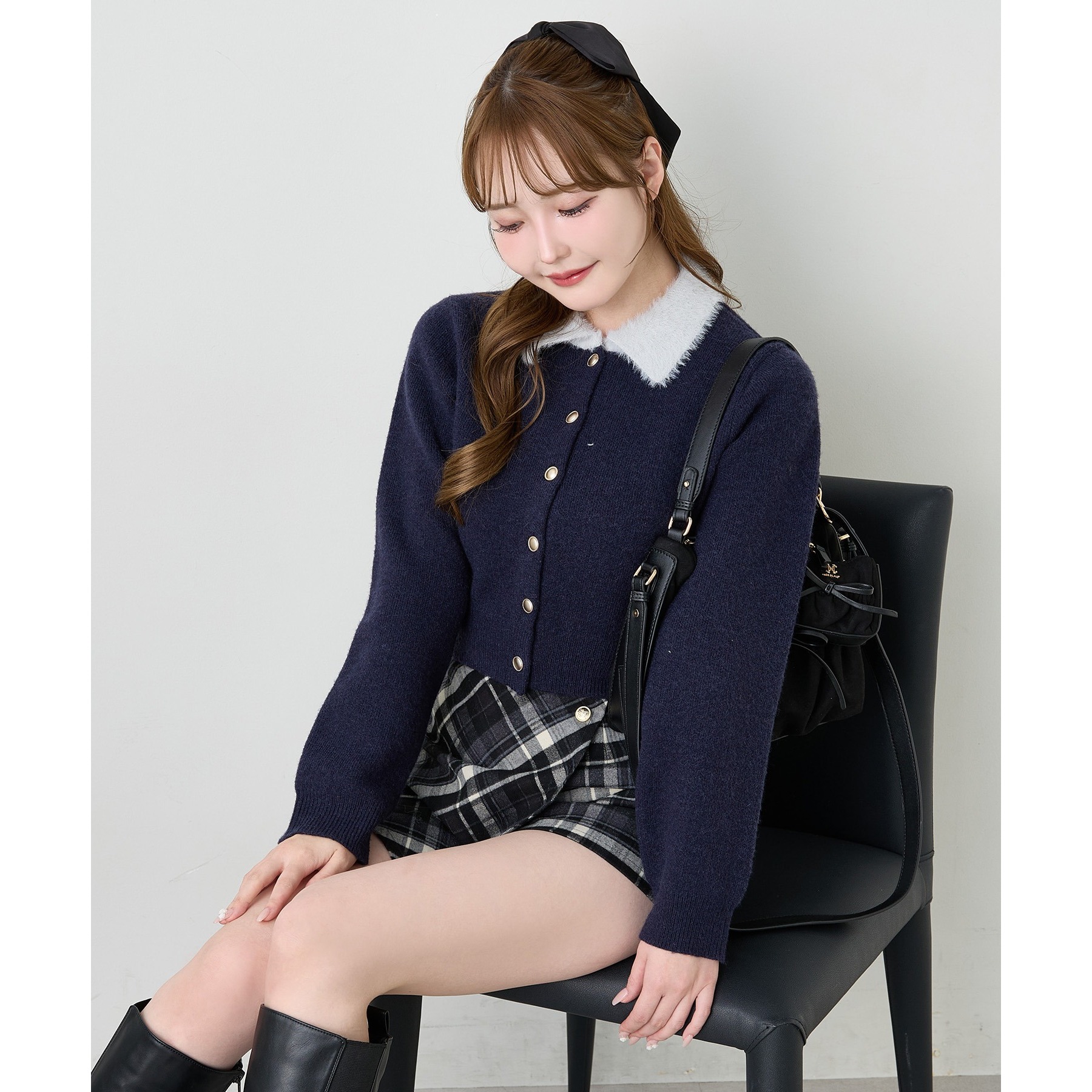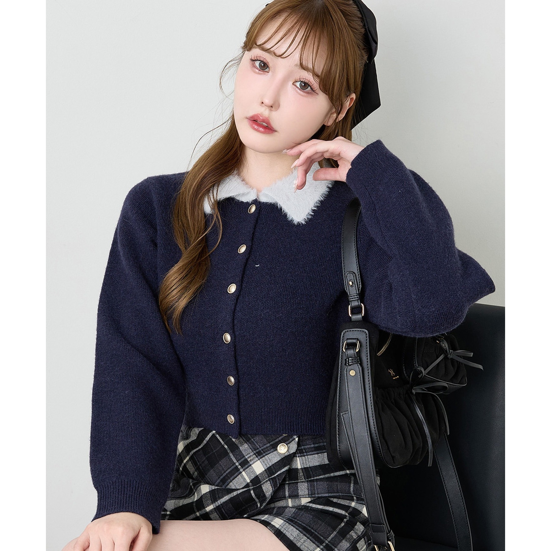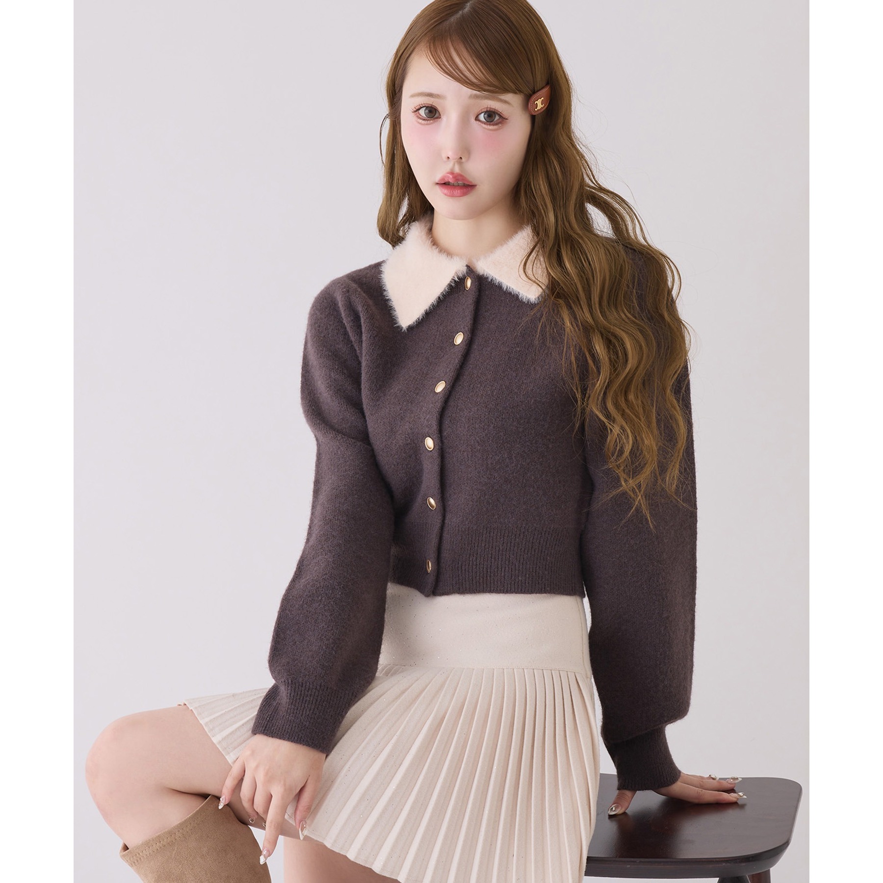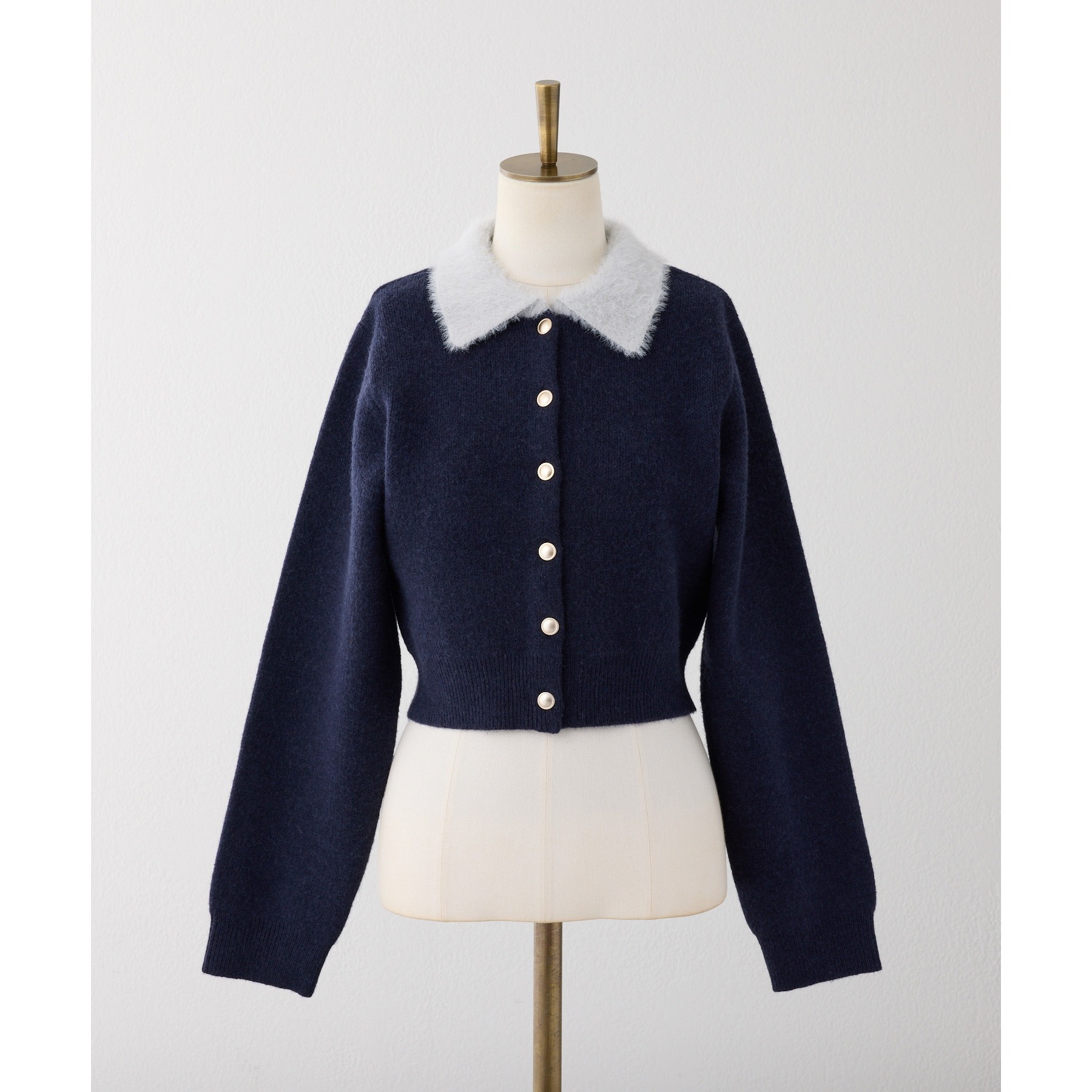 襟にふんわりフェザーをあしらい、フロントに金ボタンを施したカーディガン。