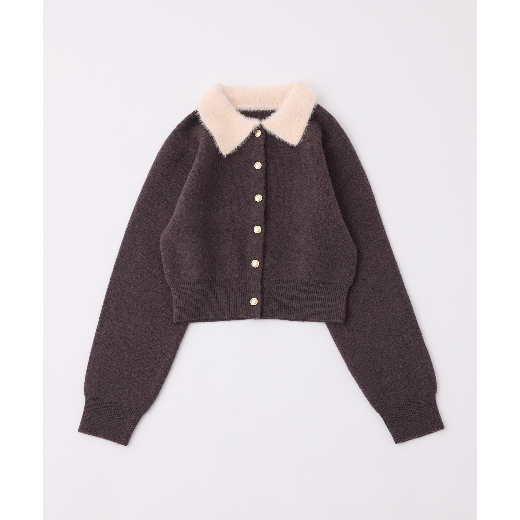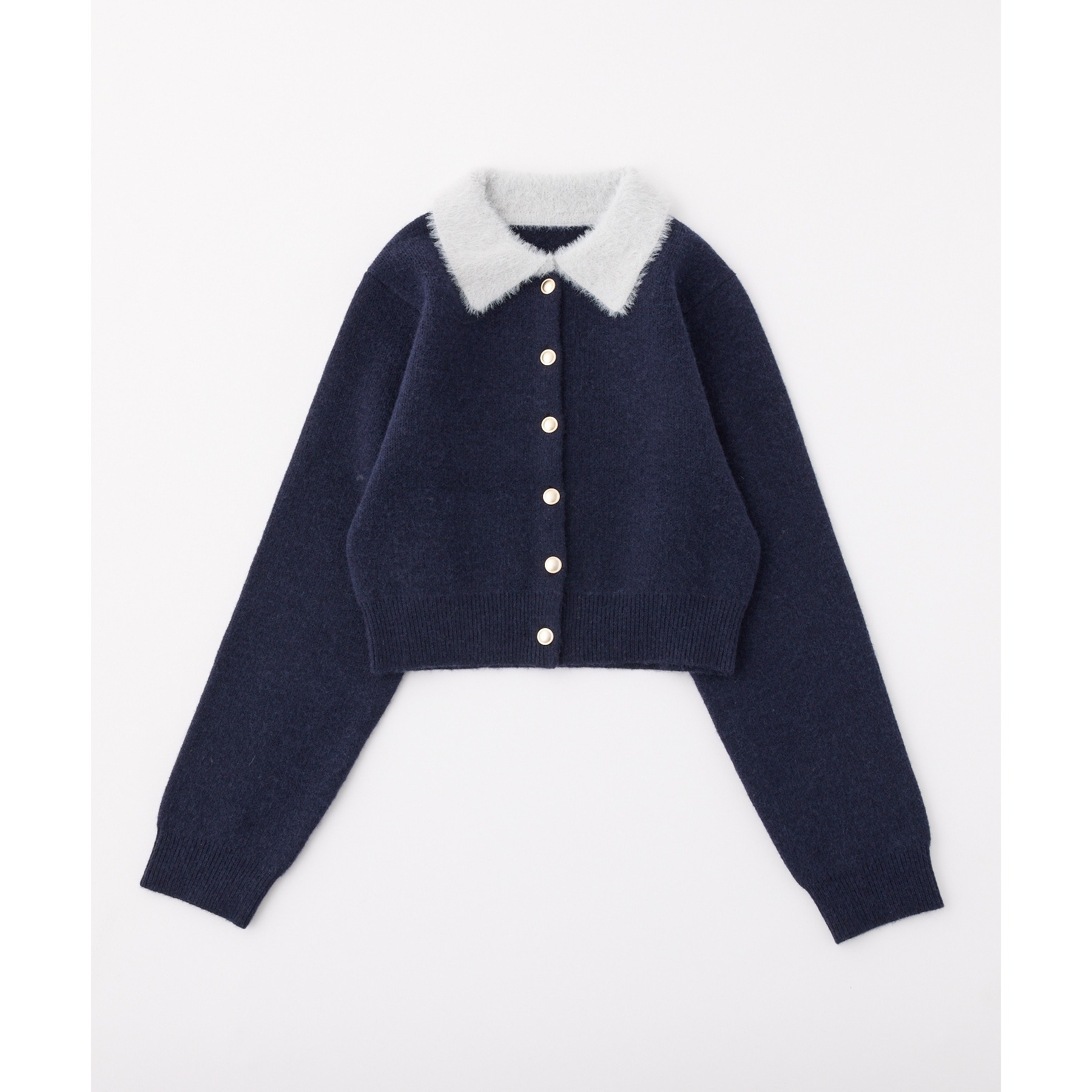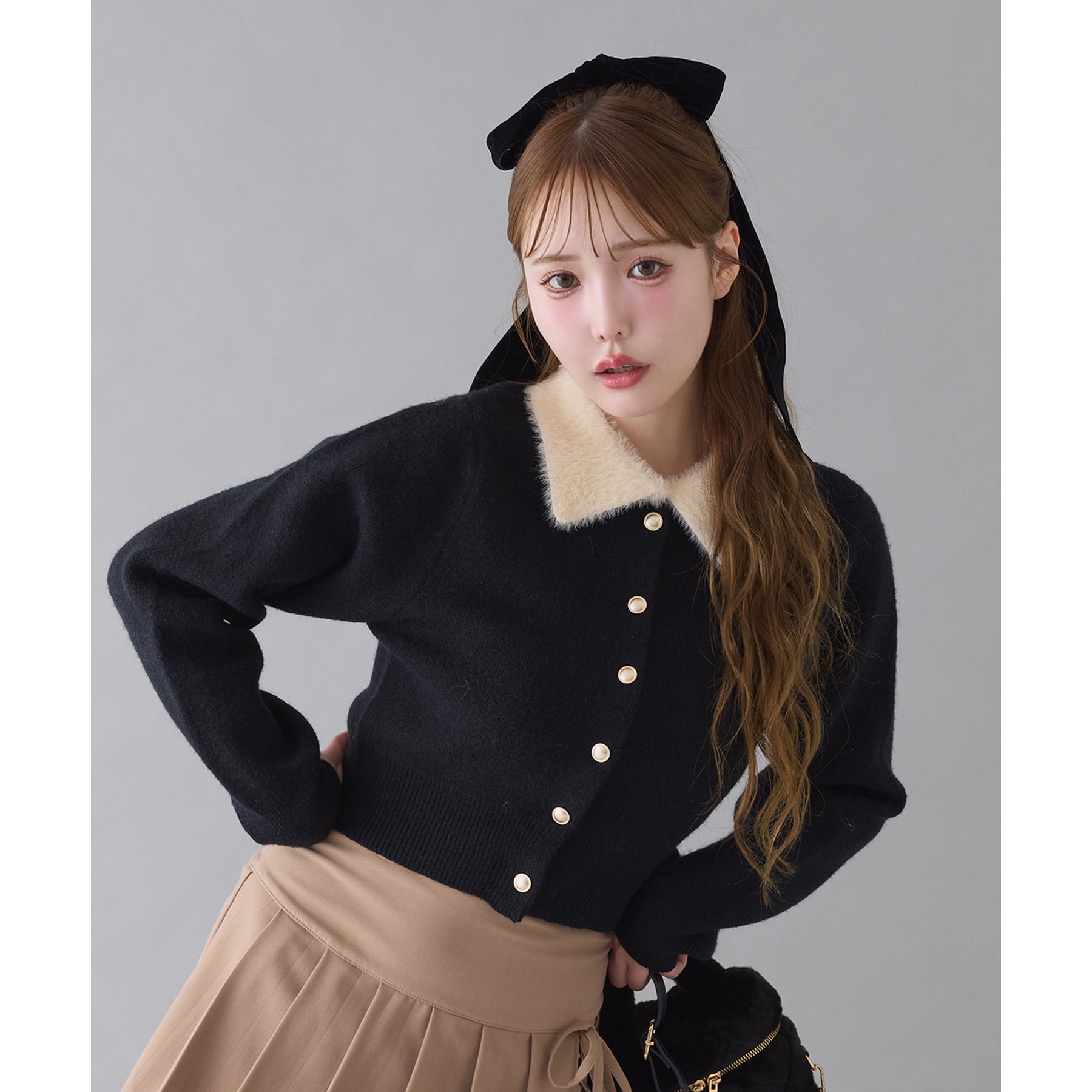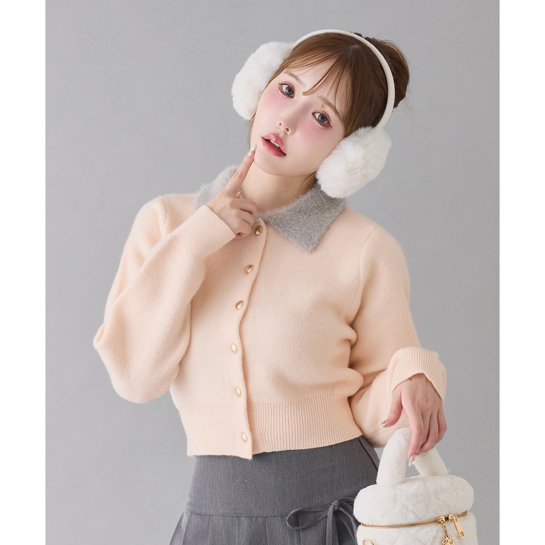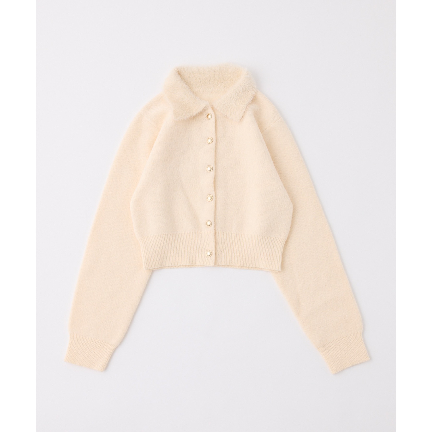 襟にふんわりフェザーをあしらい、フロントに金ボタンを施したカーディガン。