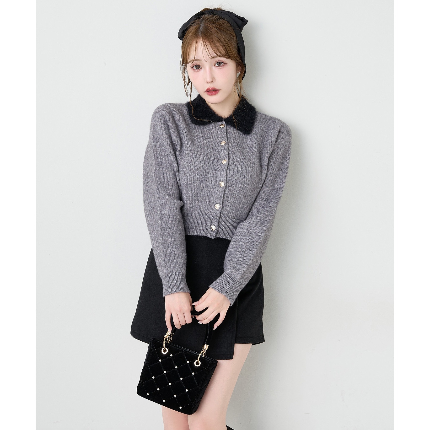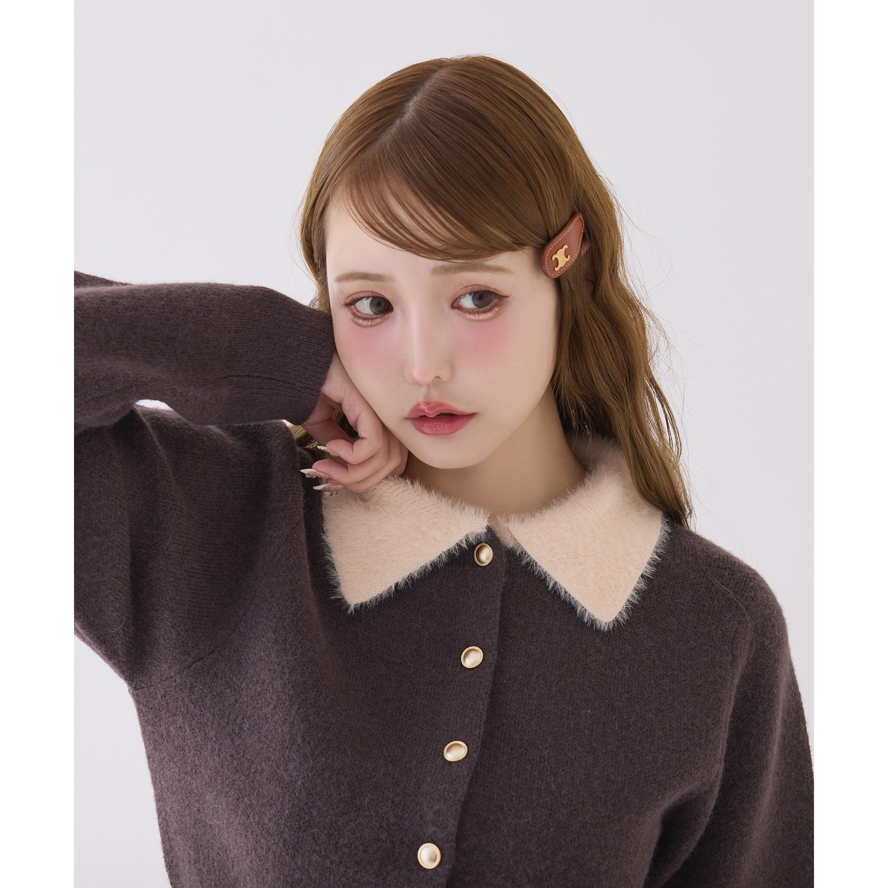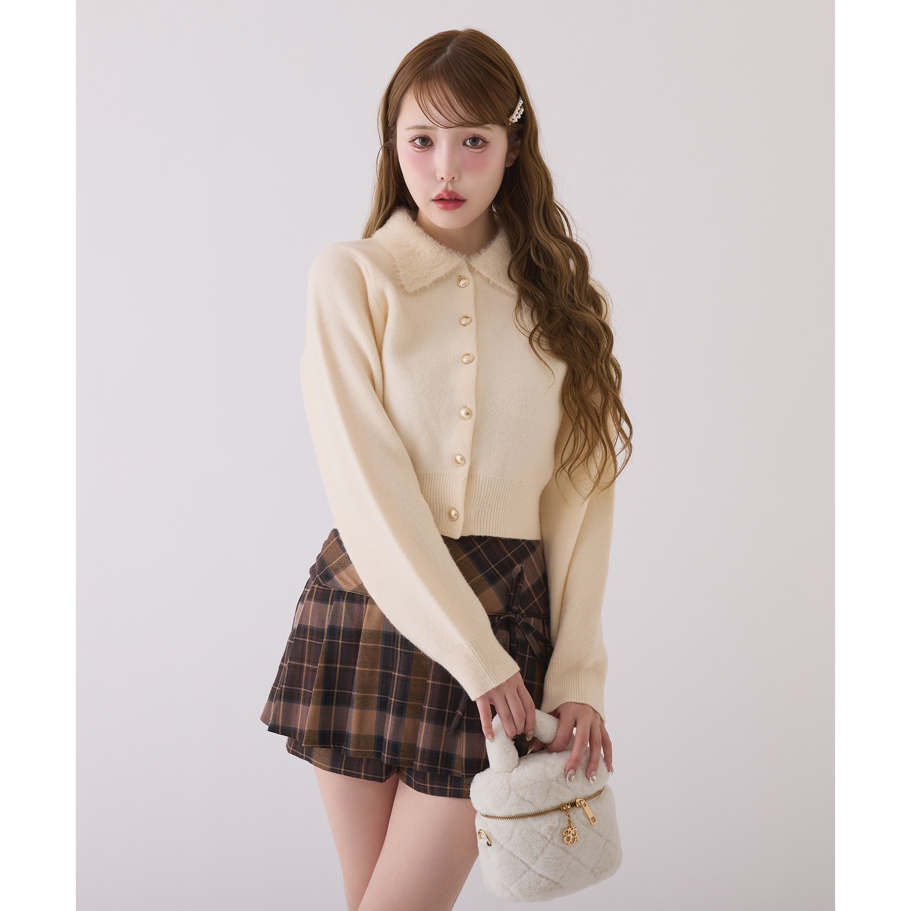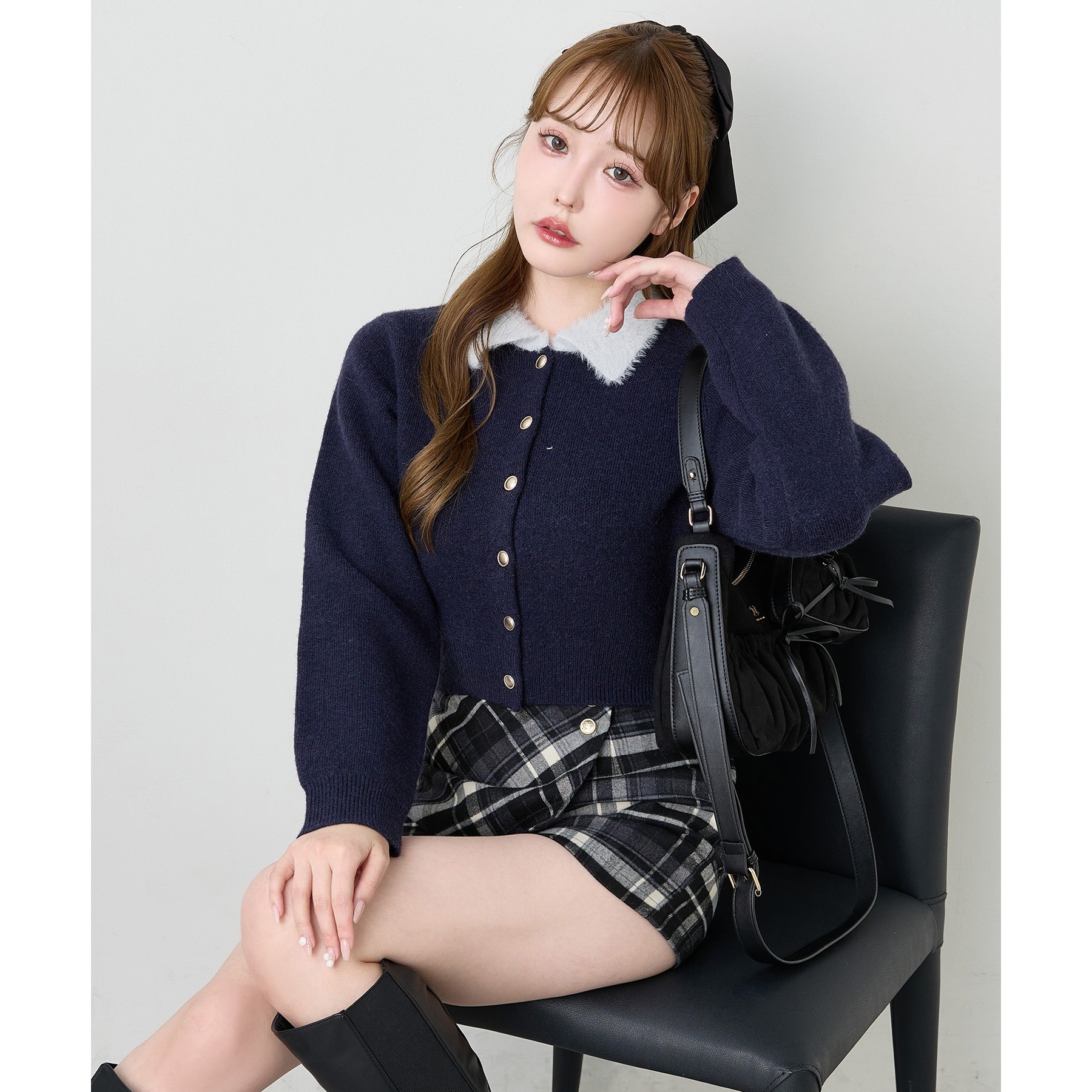 襟にふんわりフェザーをあしらい、フロントに金ボタンを施したカーディガン。