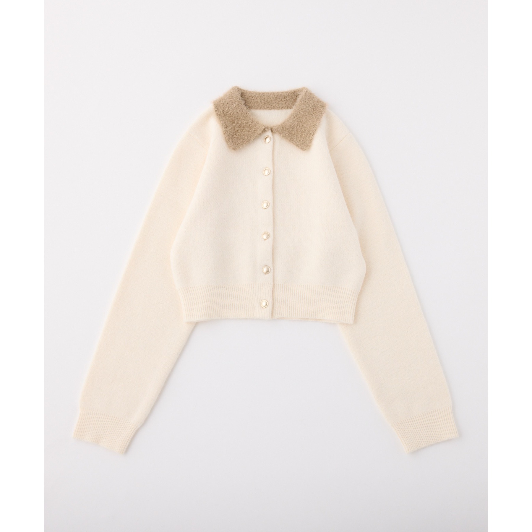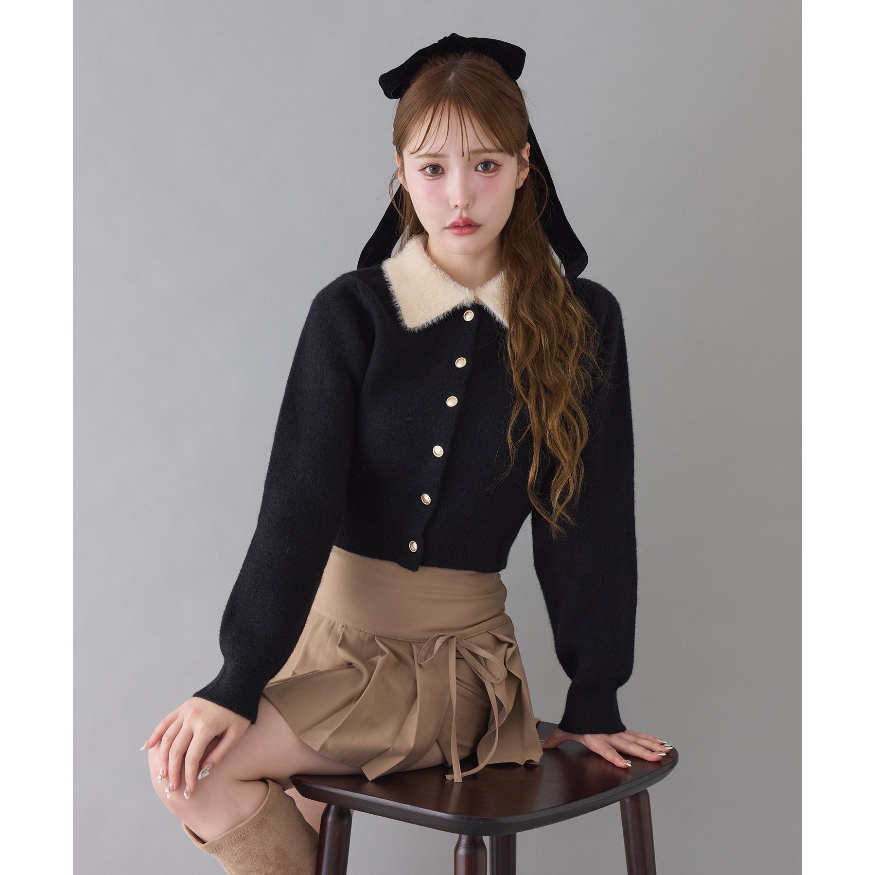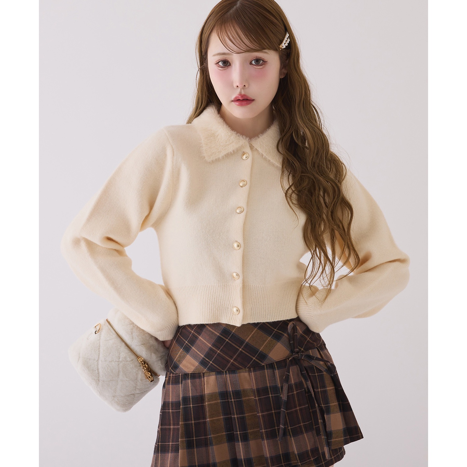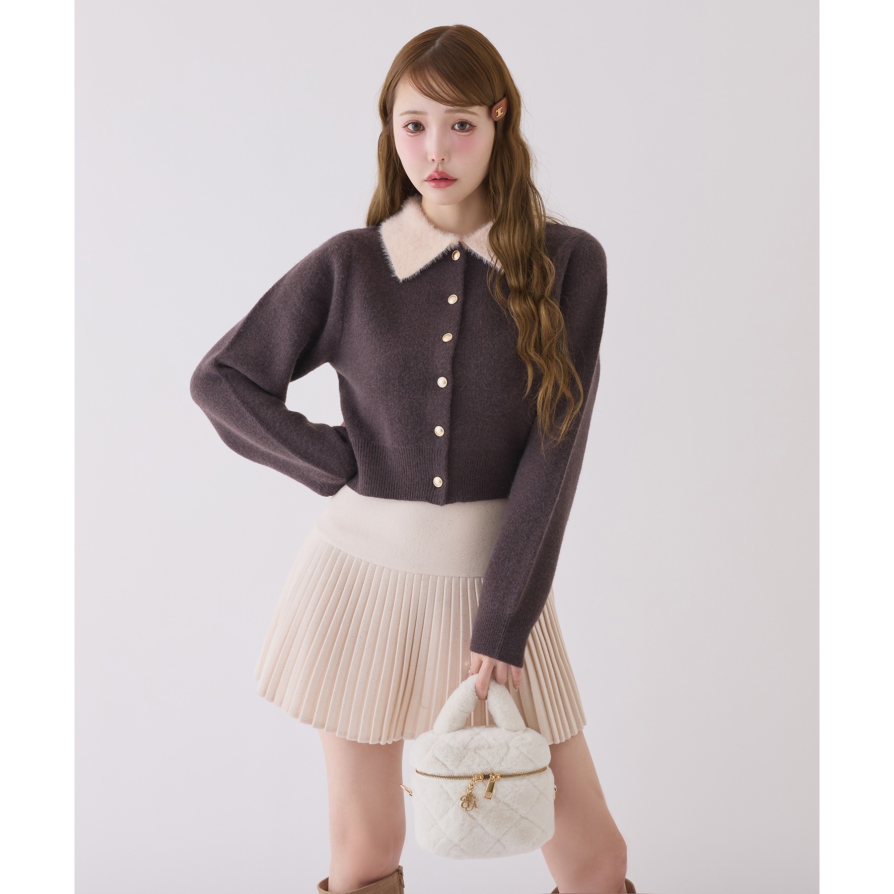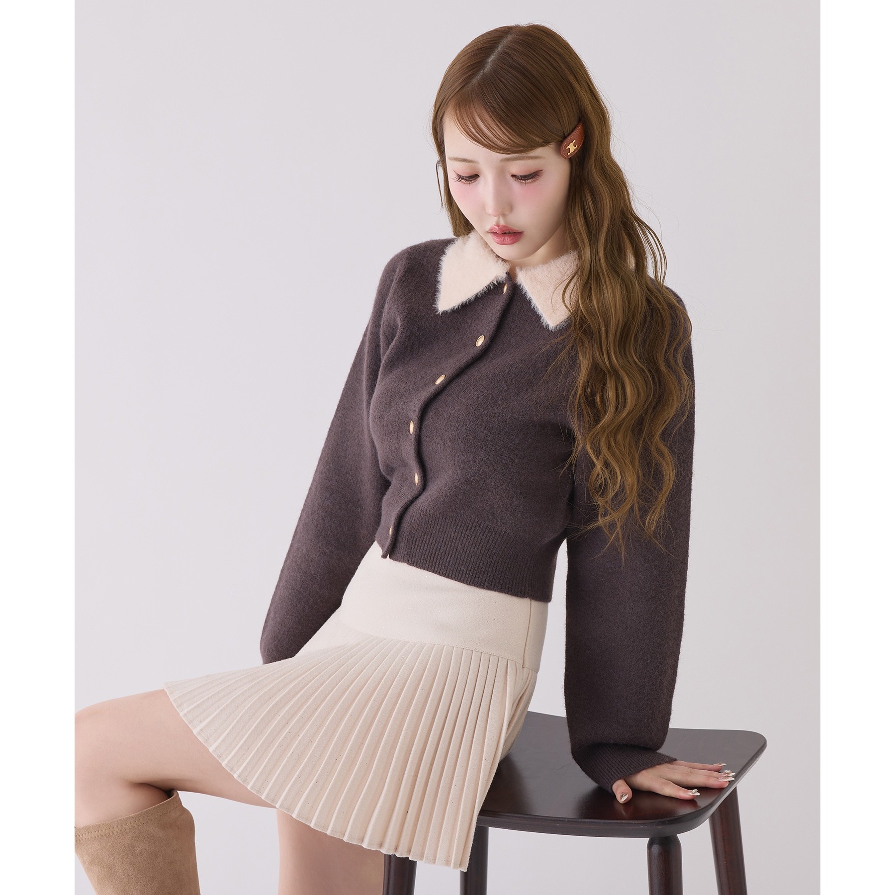 襟にふんわりフェザーをあしらい、フロントに金ボタンを施したカーディガン。