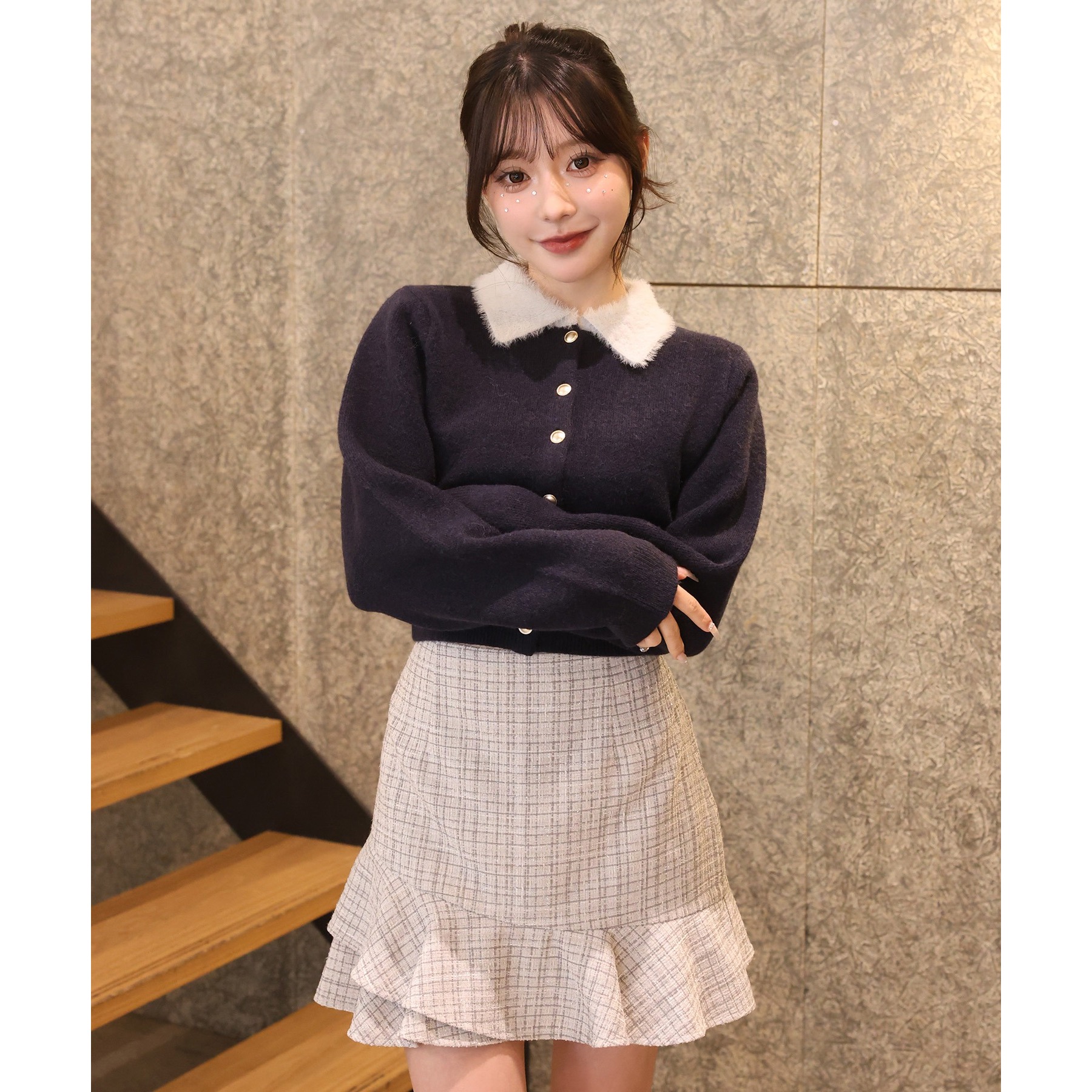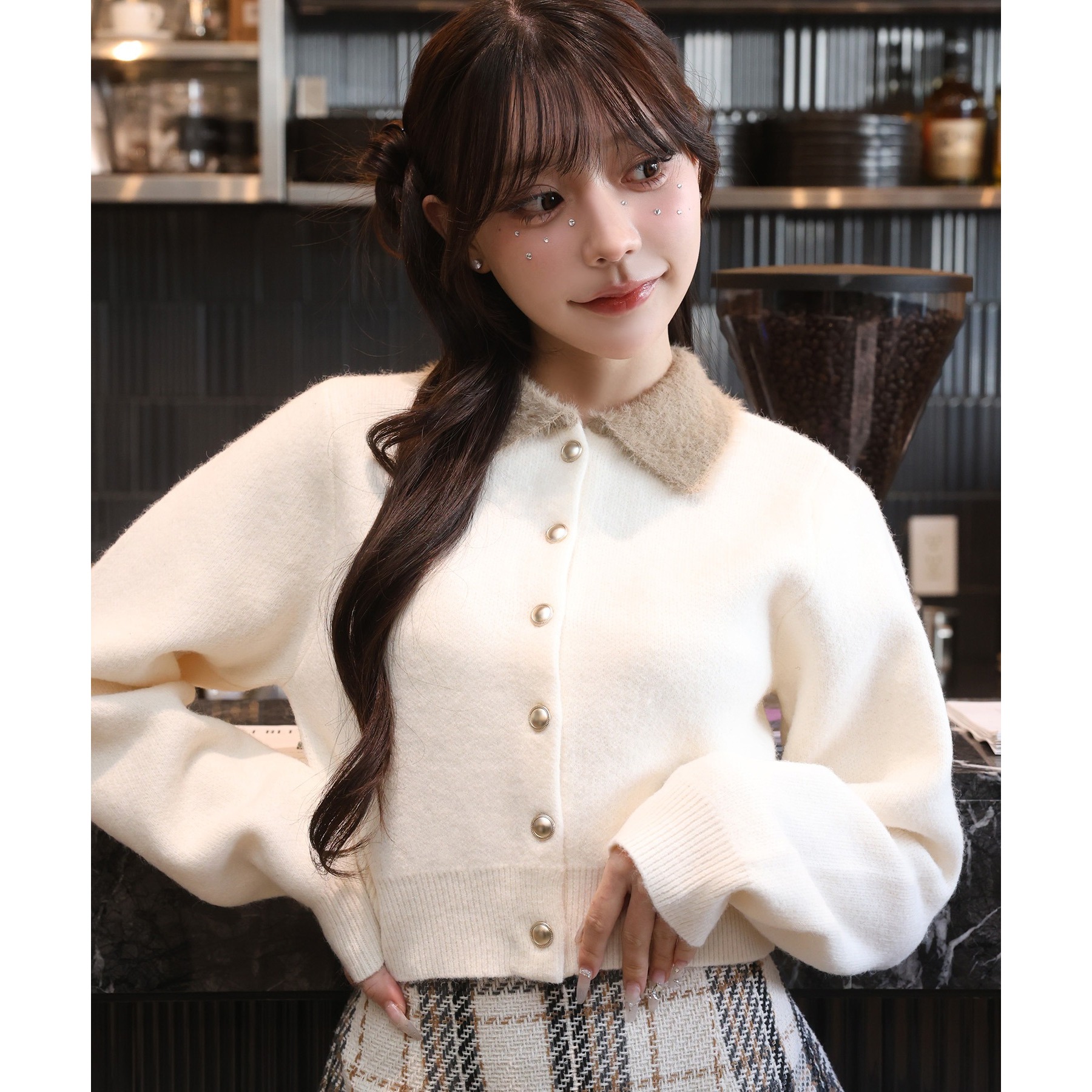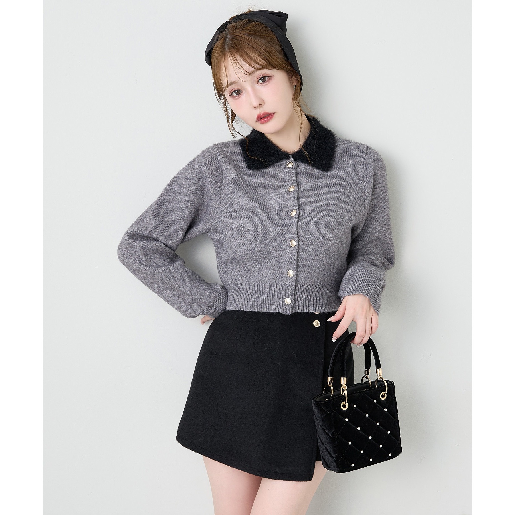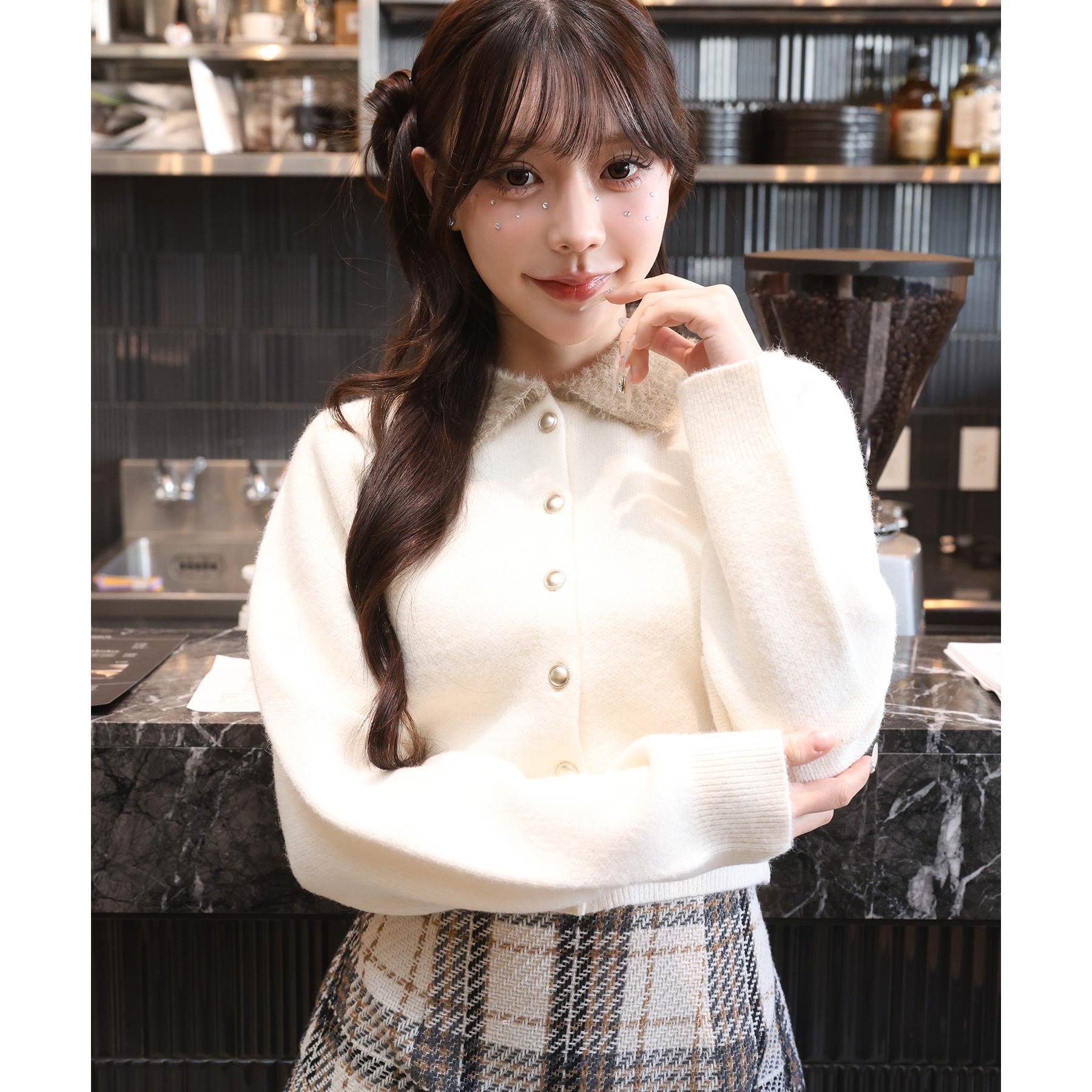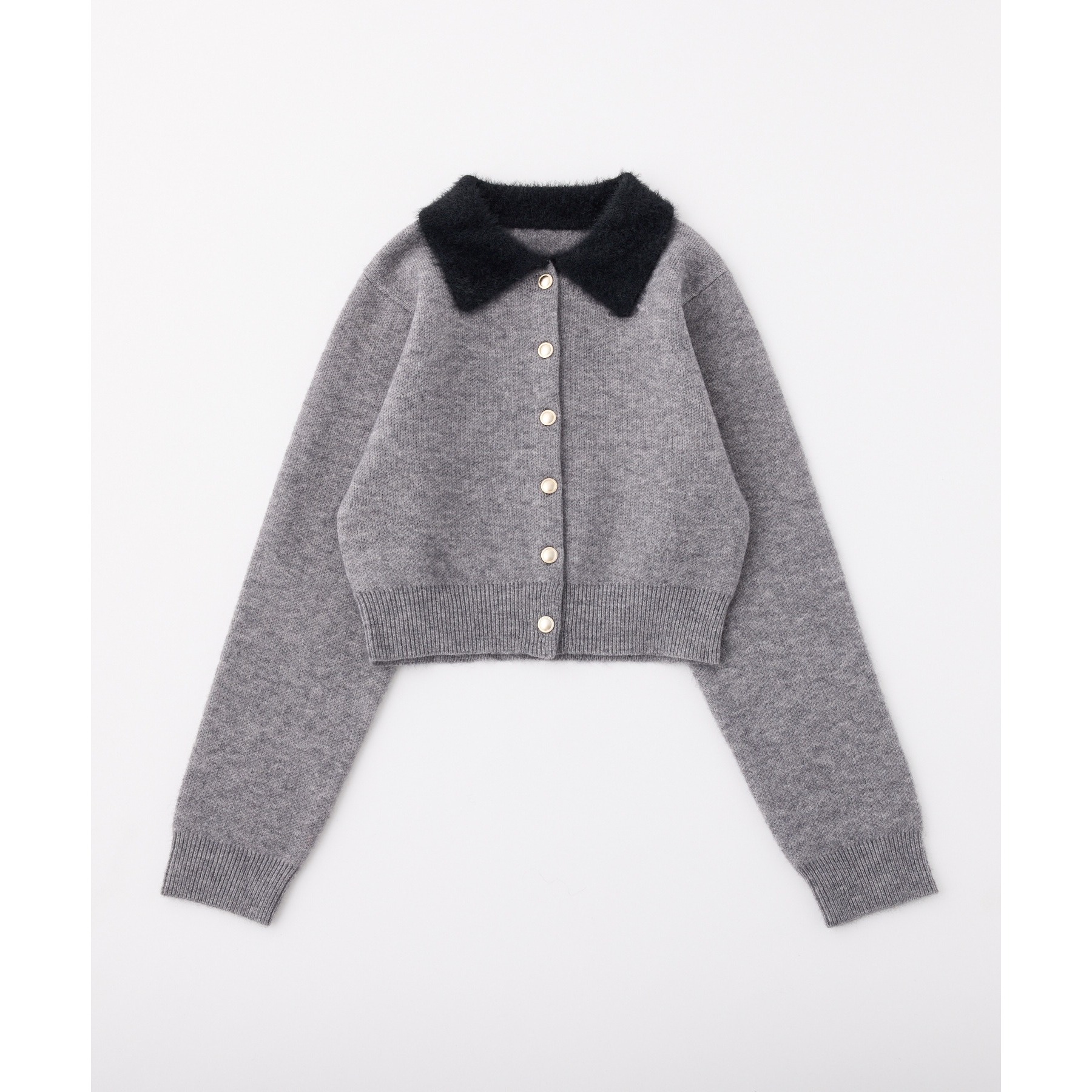 襟にふんわりフェザーをあしらい、フロントに金ボタンを施したカーディガン。