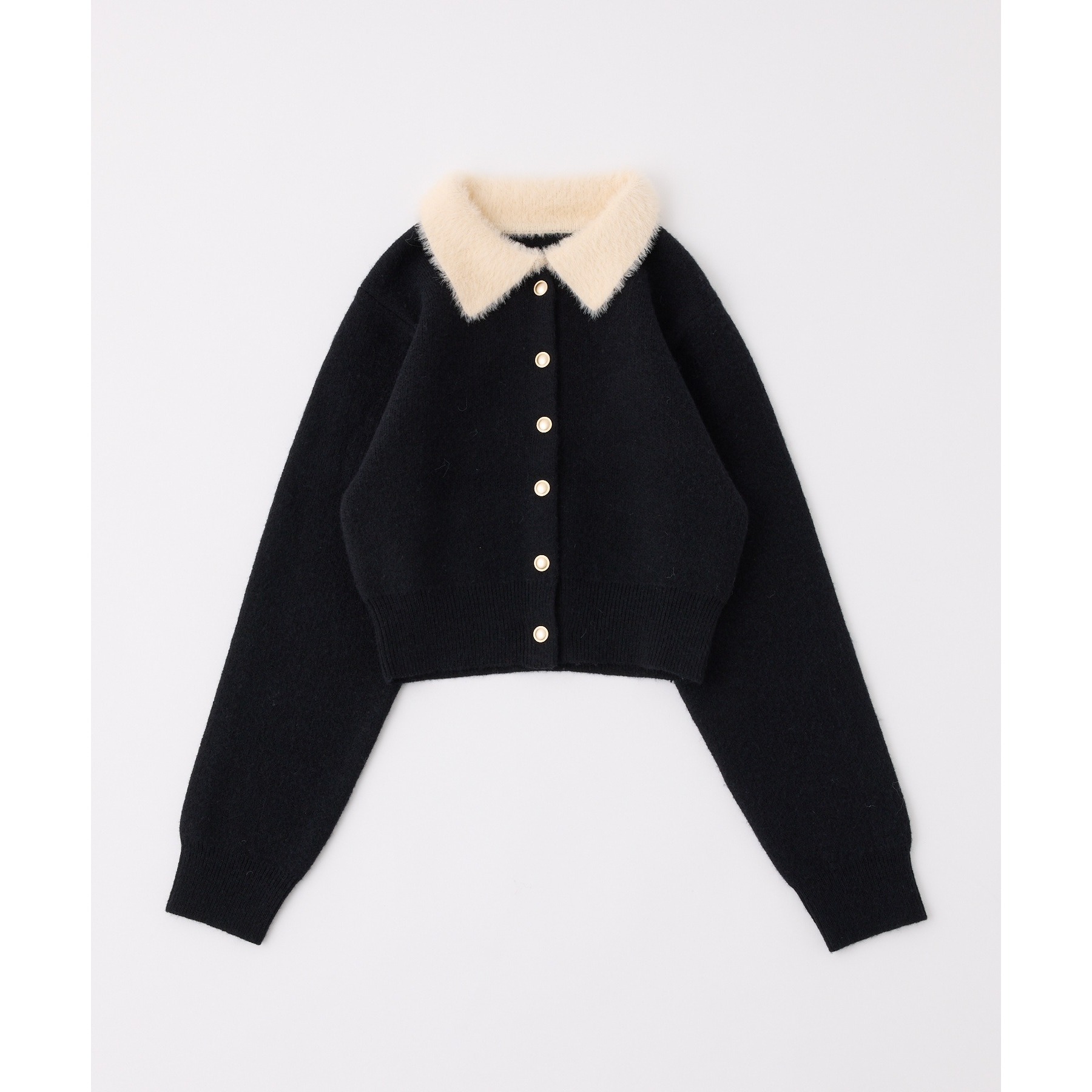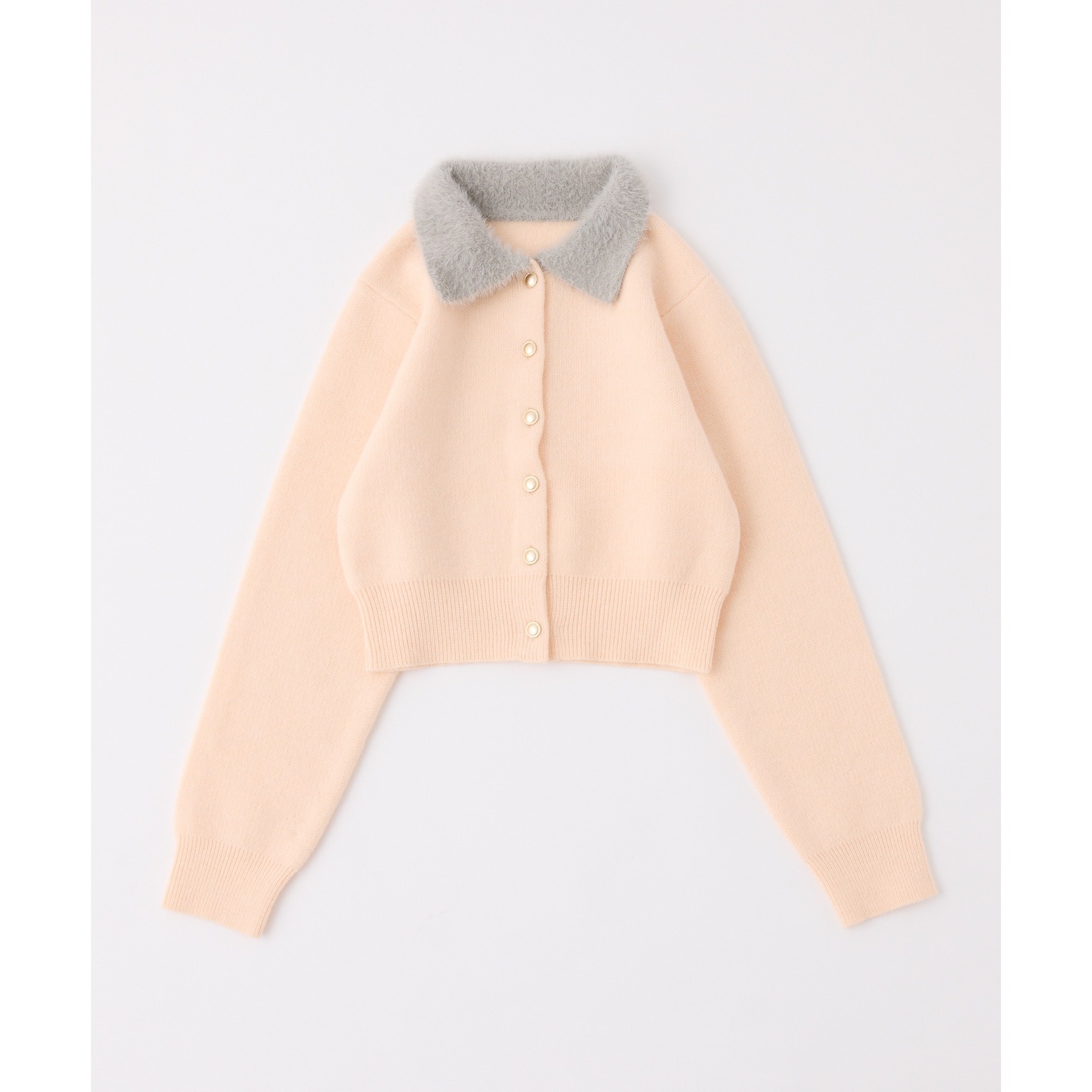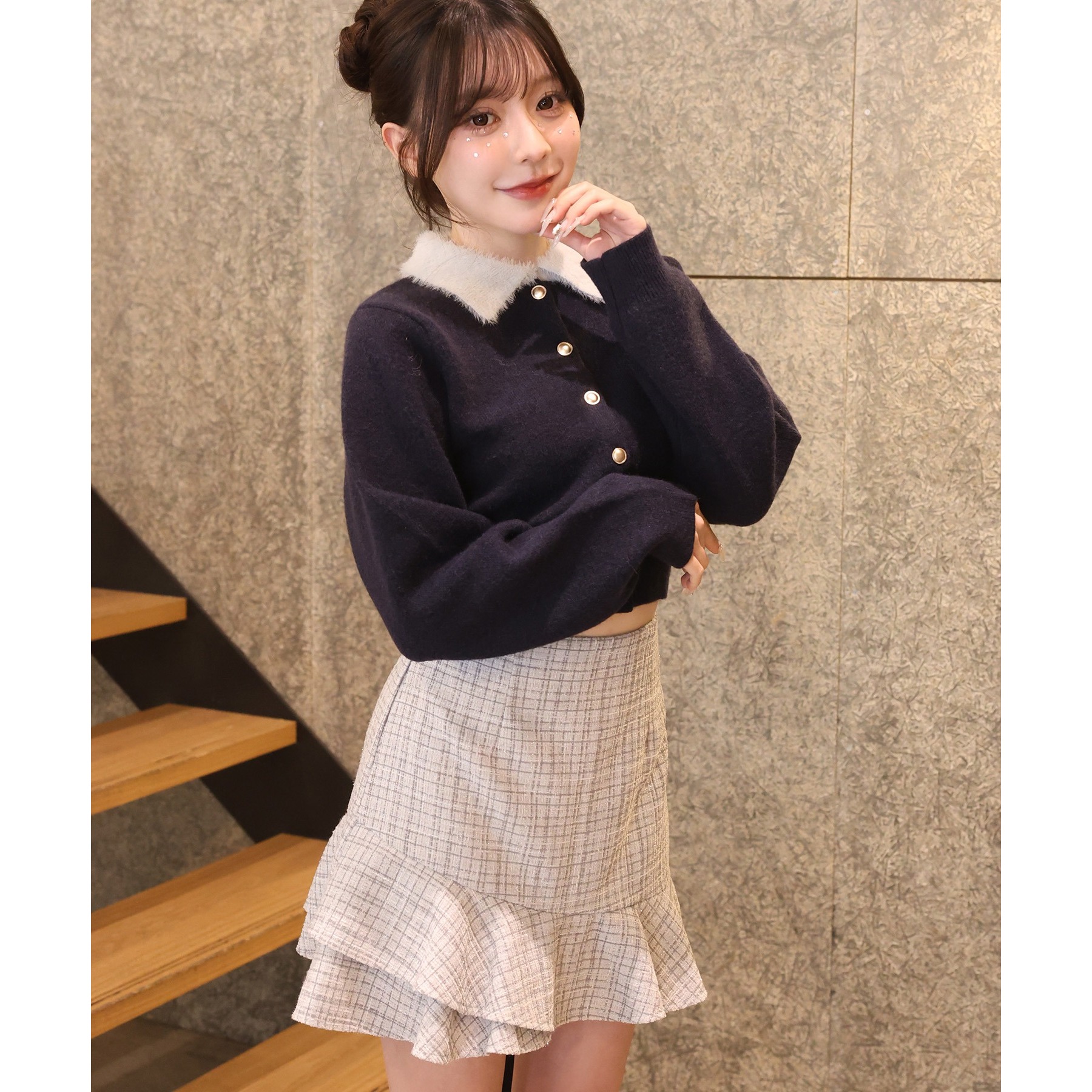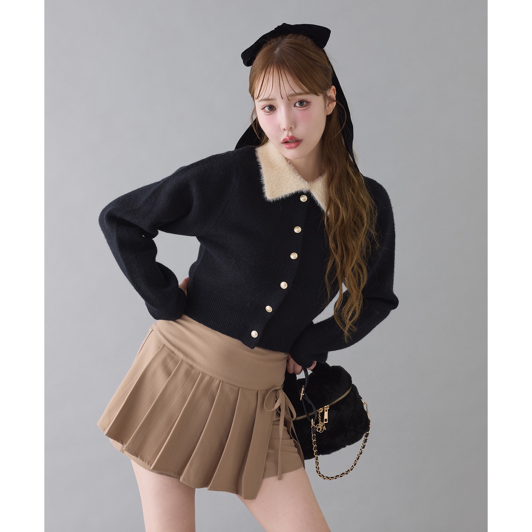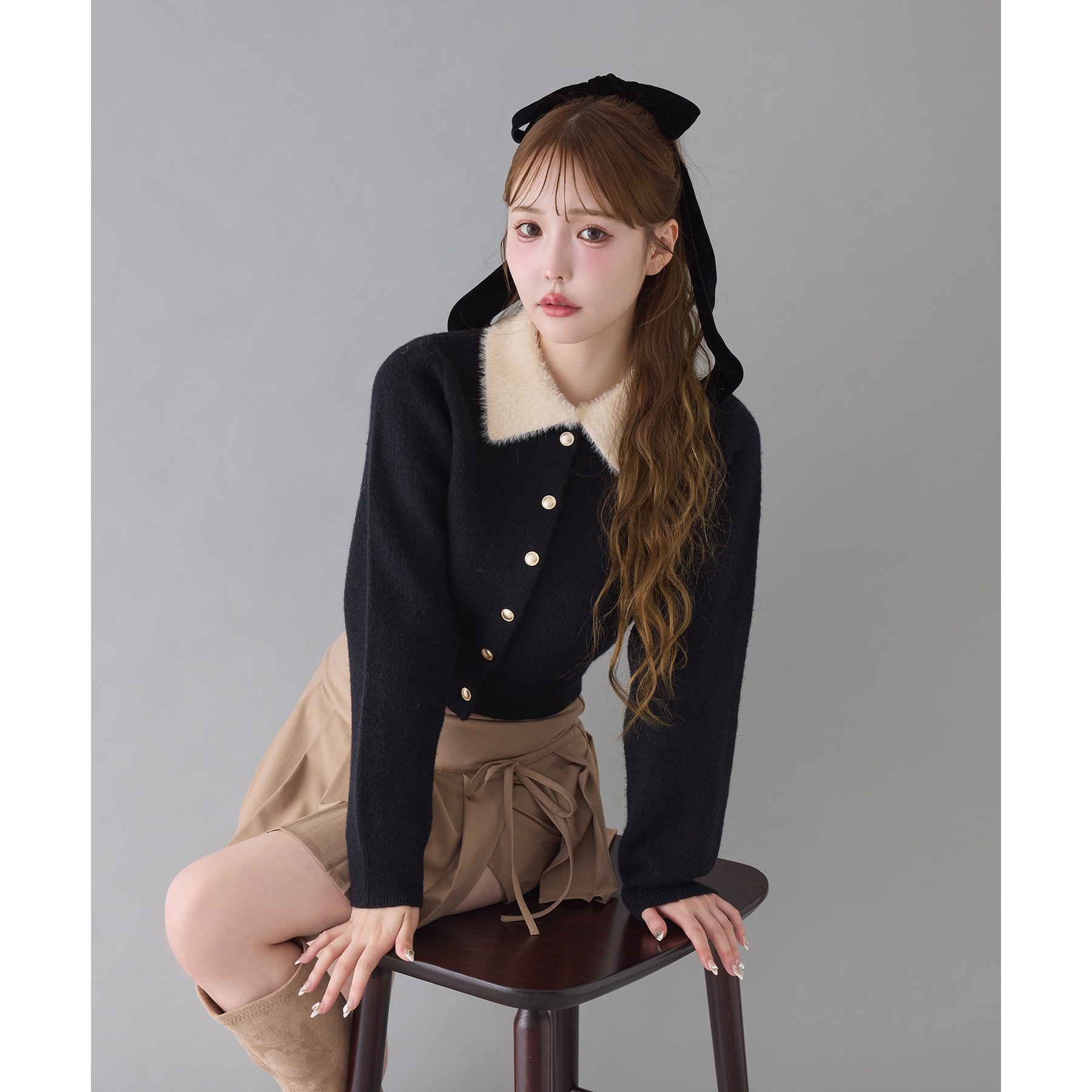 襟にふんわりフェザーをあしらい、フロントに金ボタンを施したカーディガン。