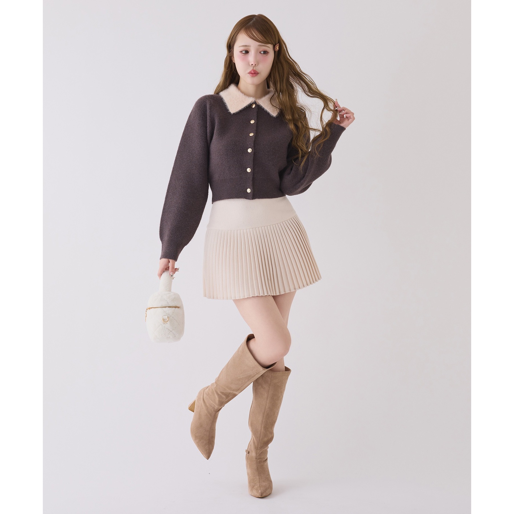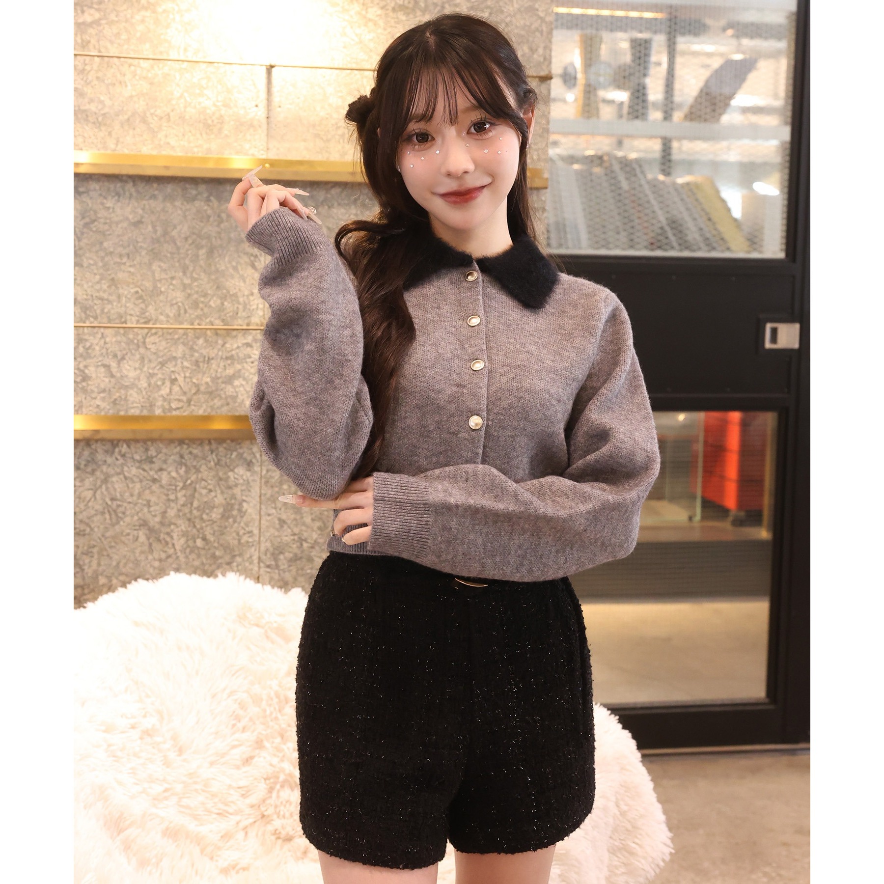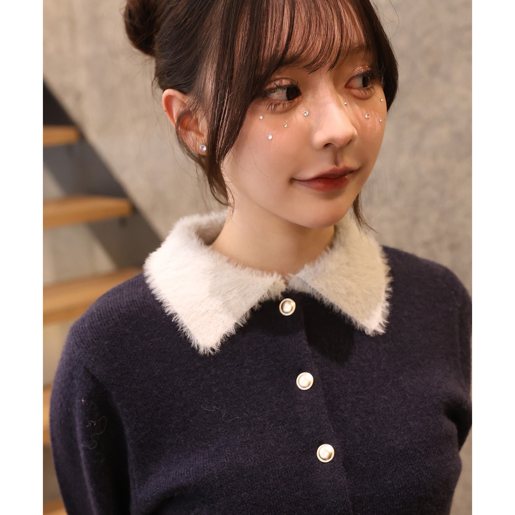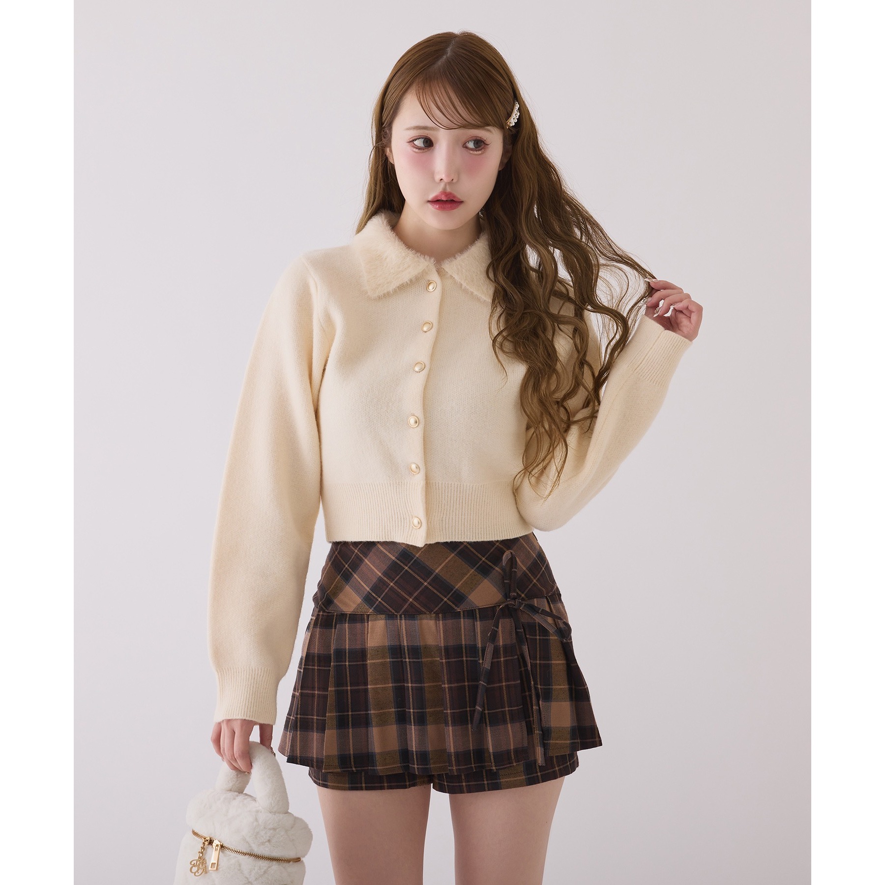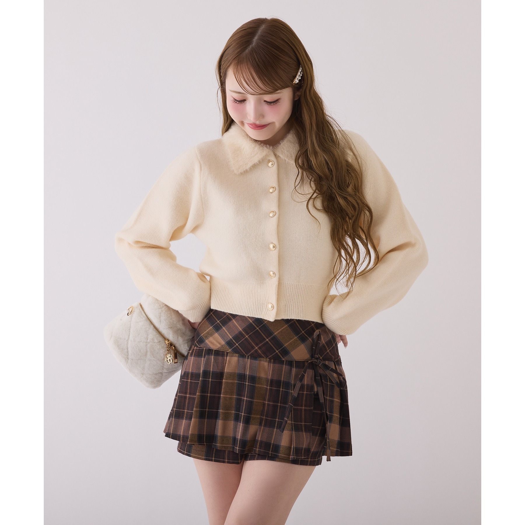 襟にふんわりフェザーをあしらい、フロントに金ボタンを施したカーディガン。