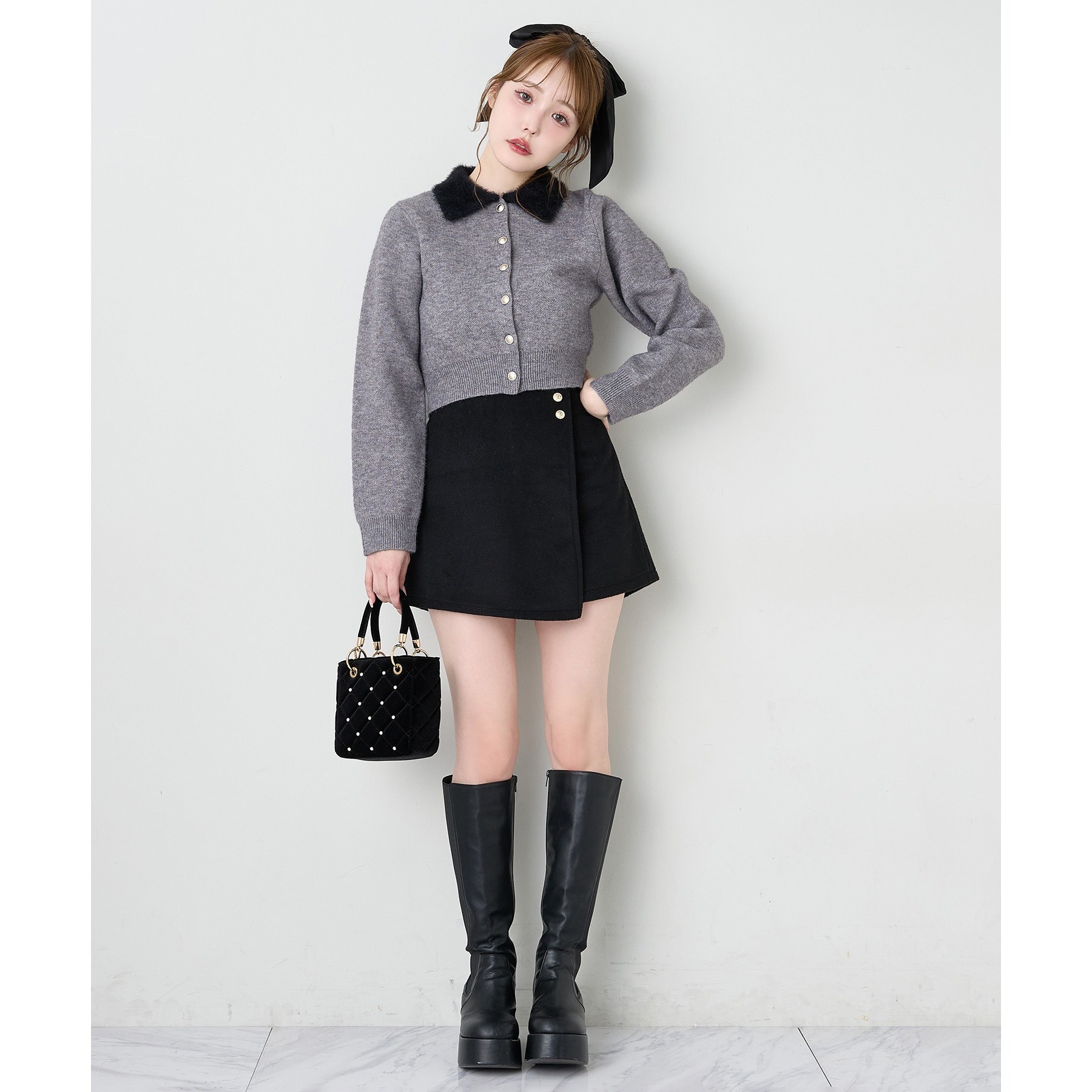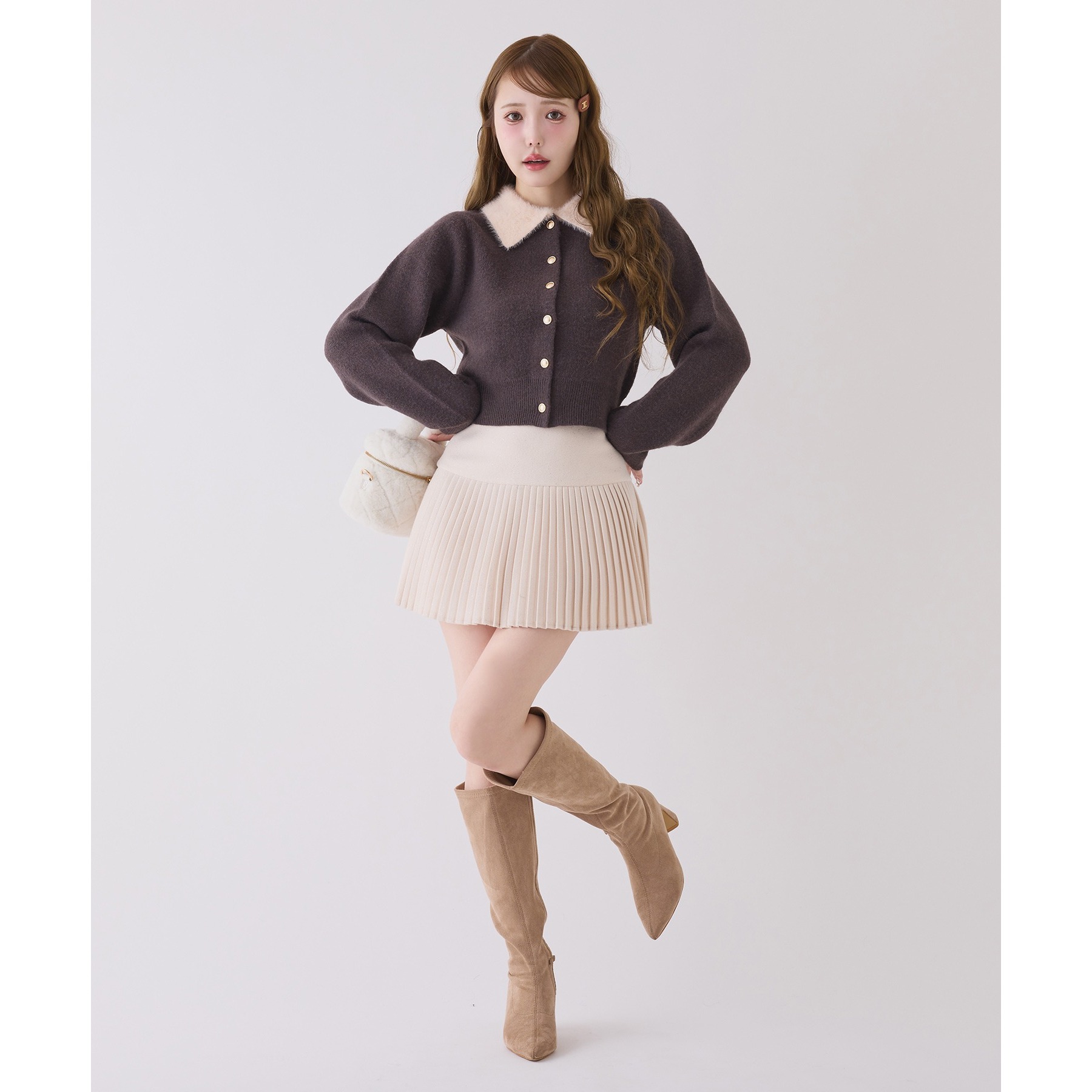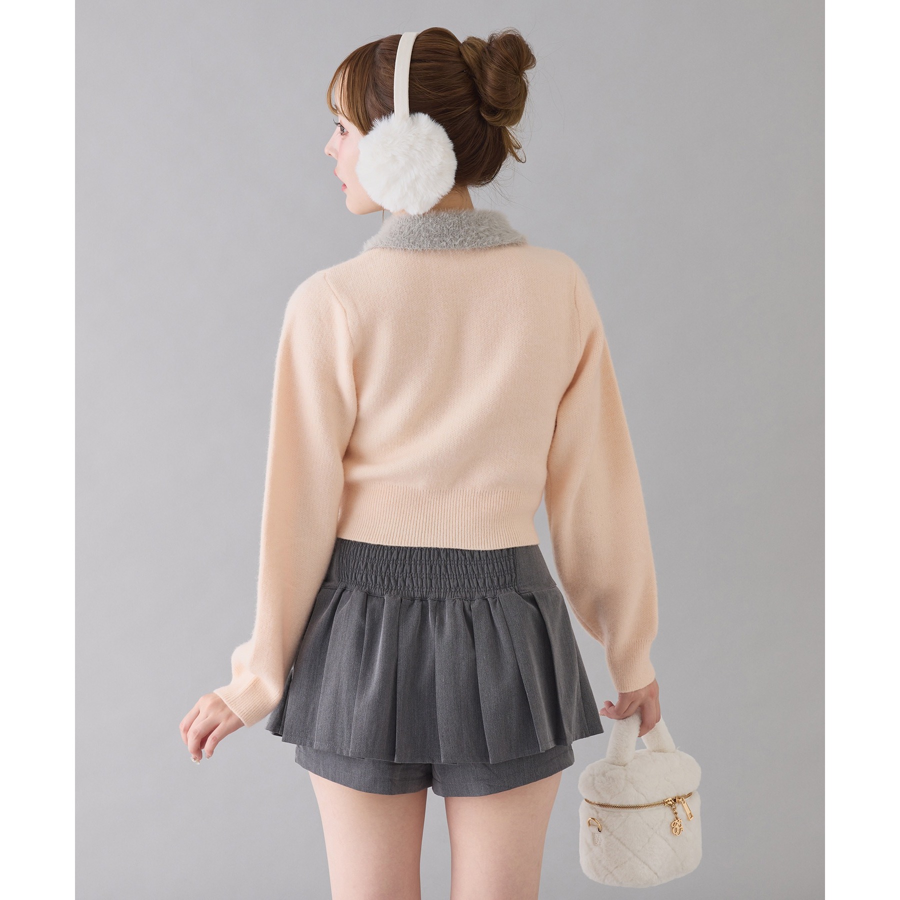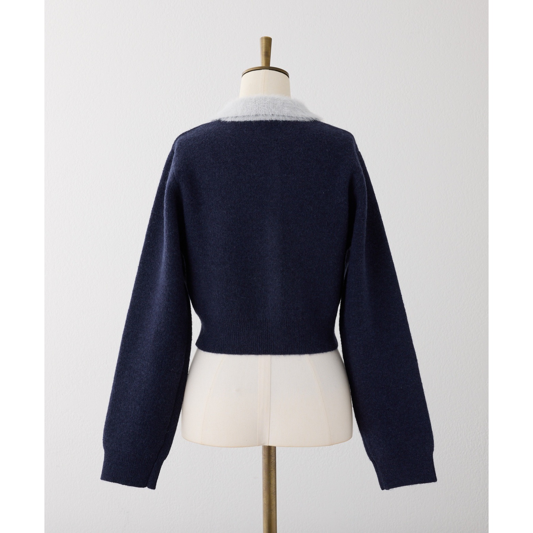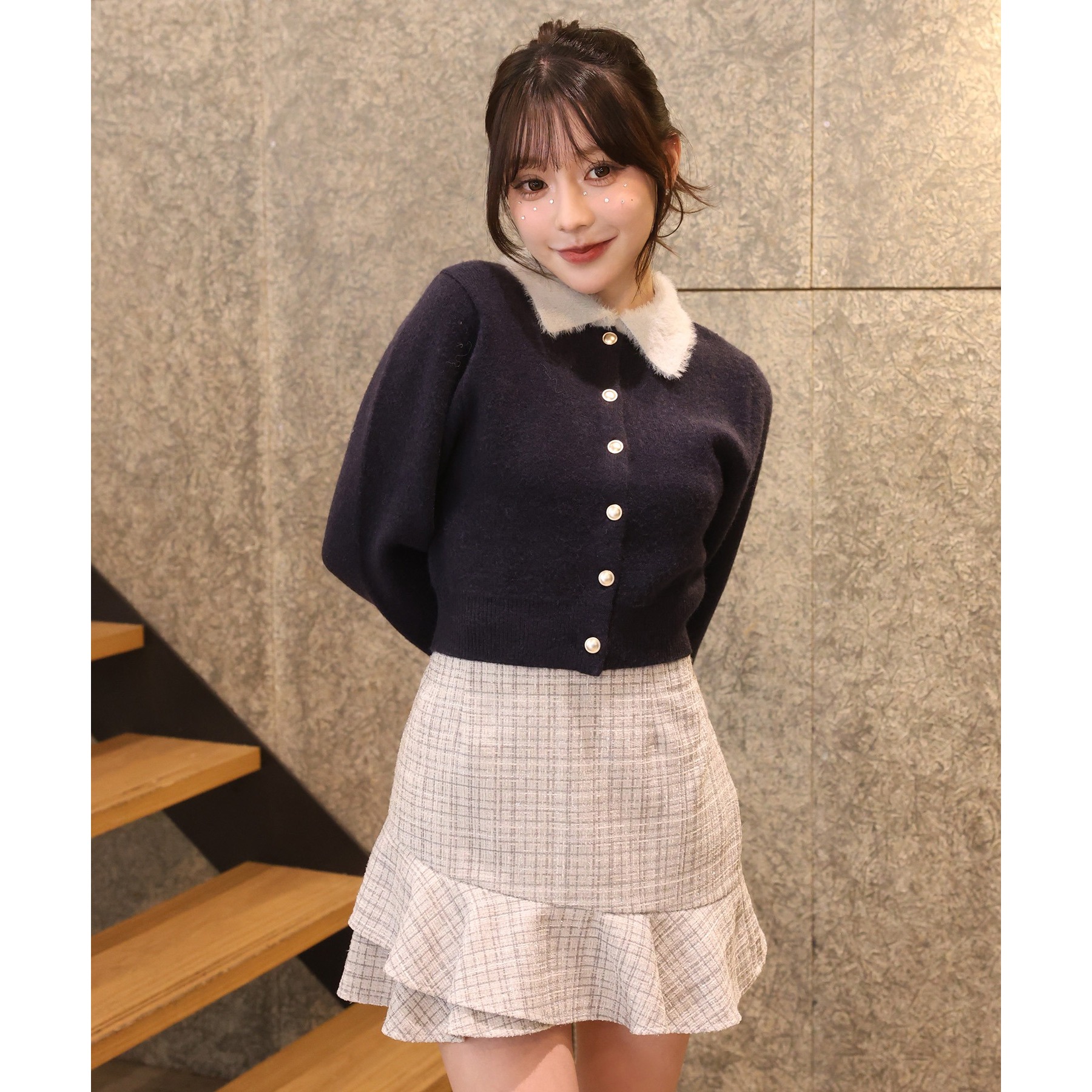 襟にふんわりフェザーをあしらい、フロントに金ボタンを施したカーディガン。