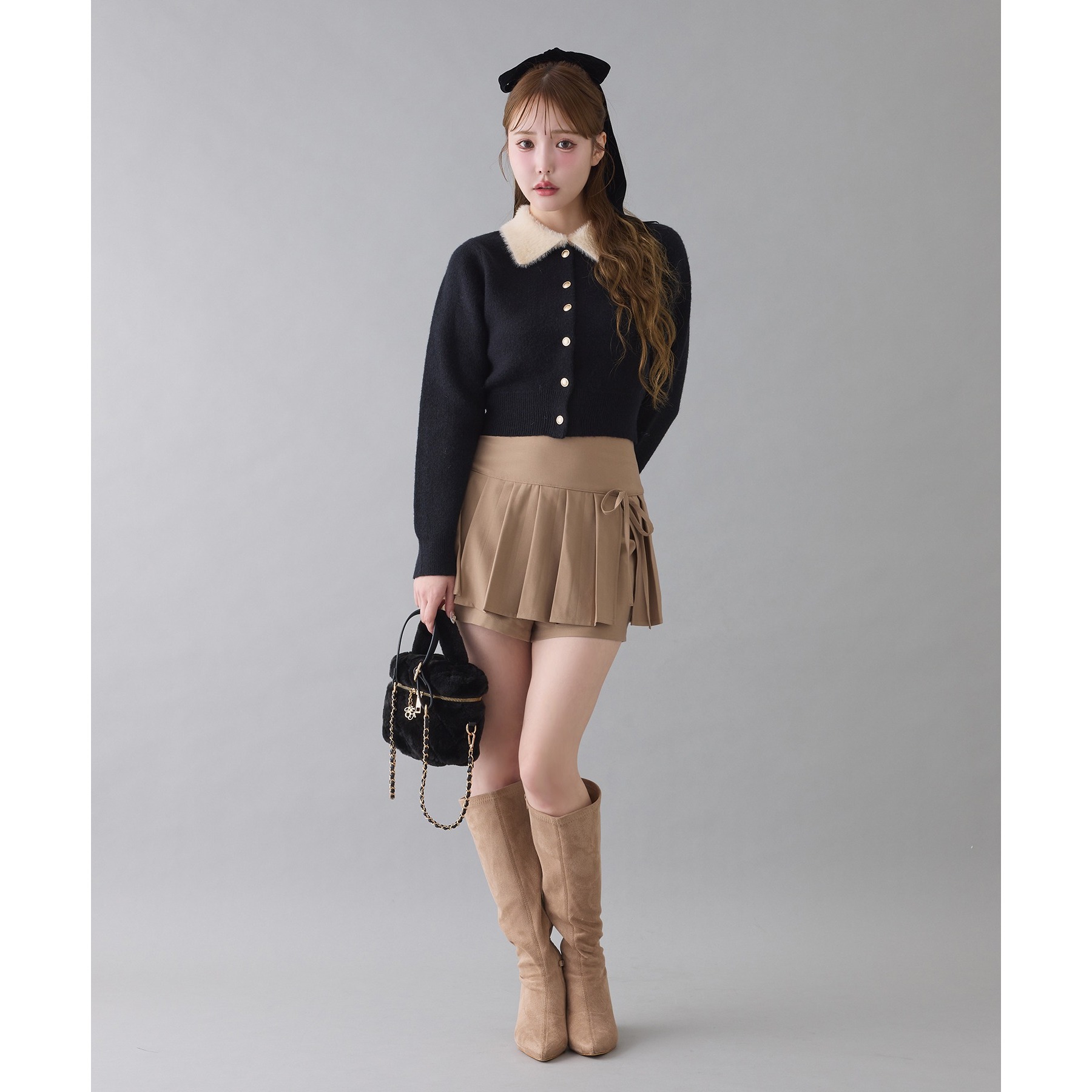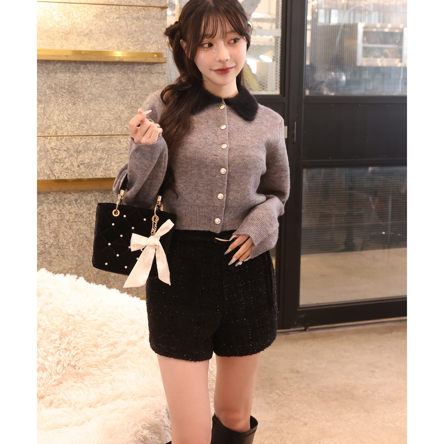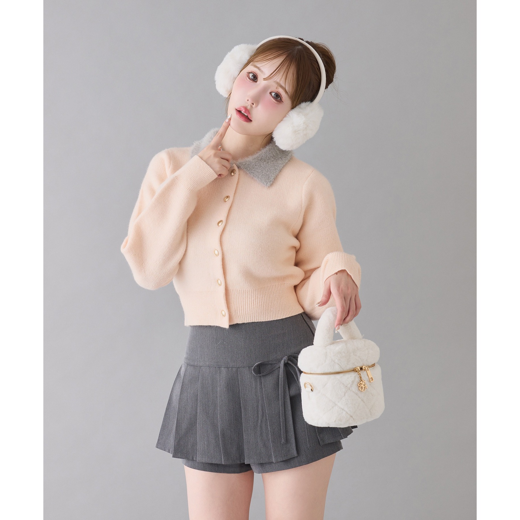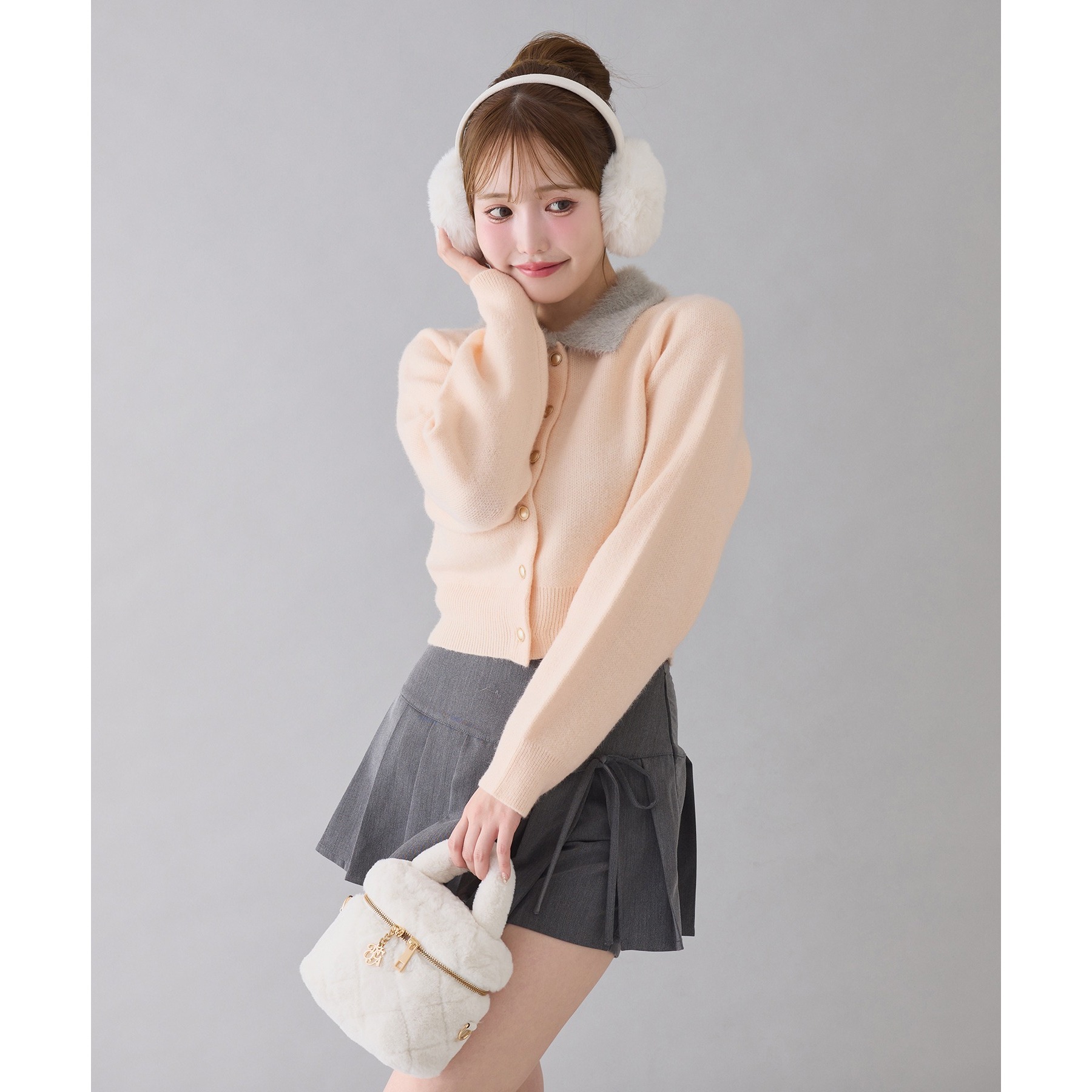 襟にふんわりフェザーをあしらい、フロントに金ボタンを施したカーディガン。