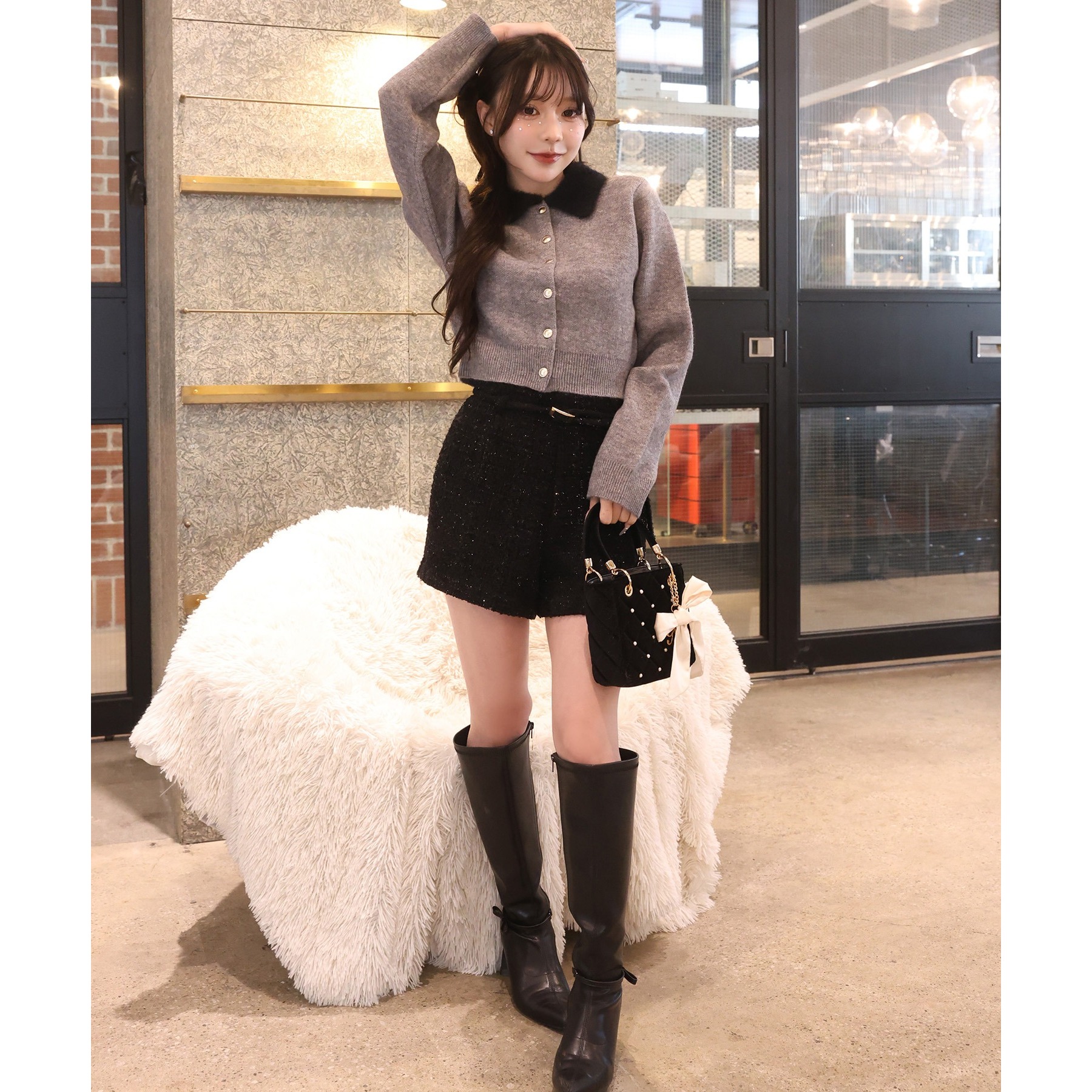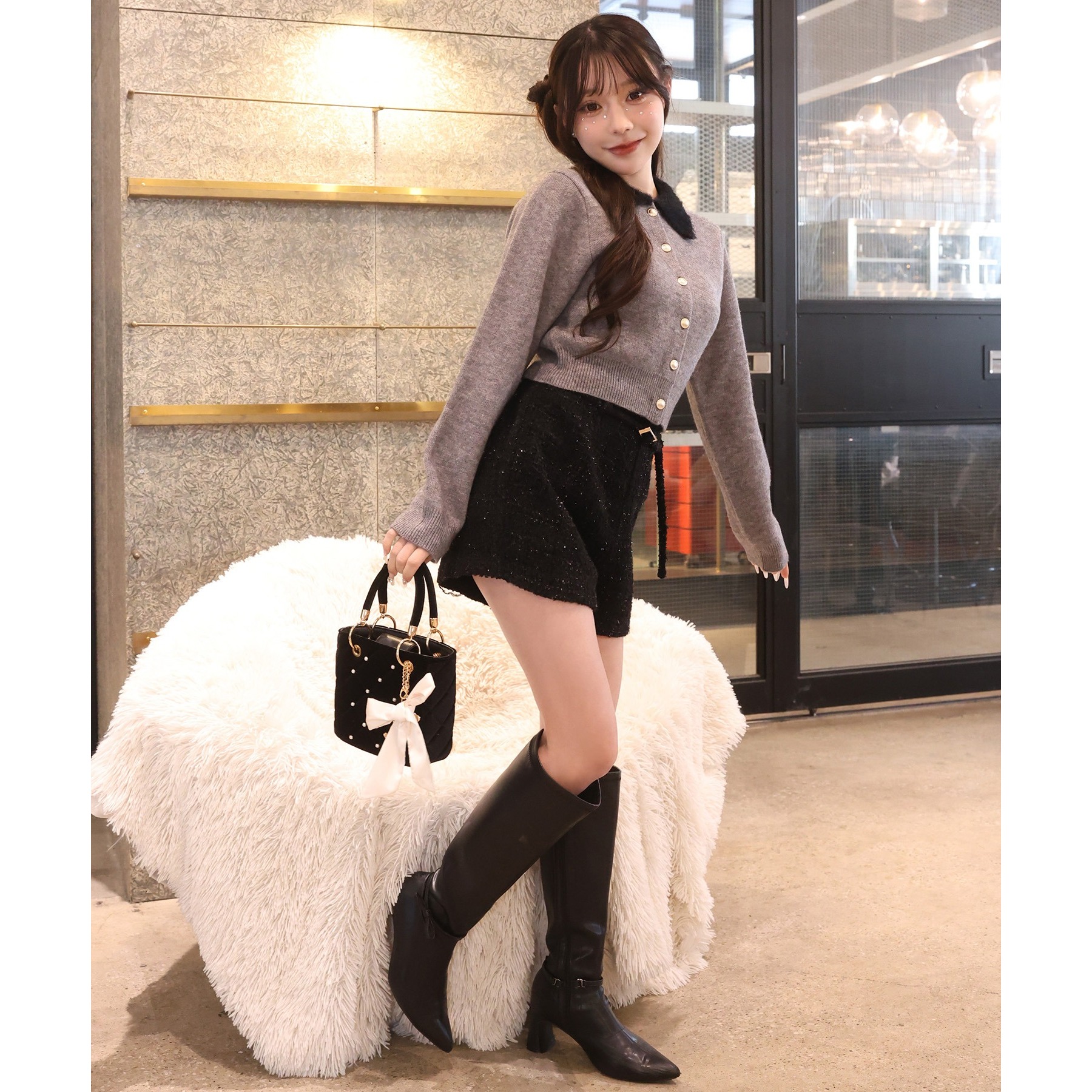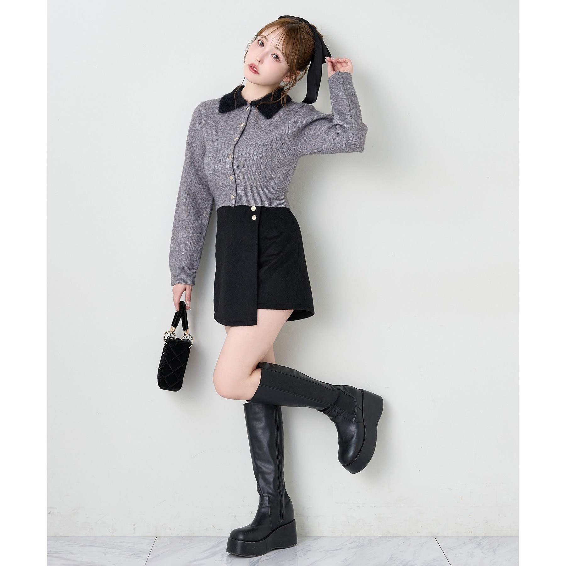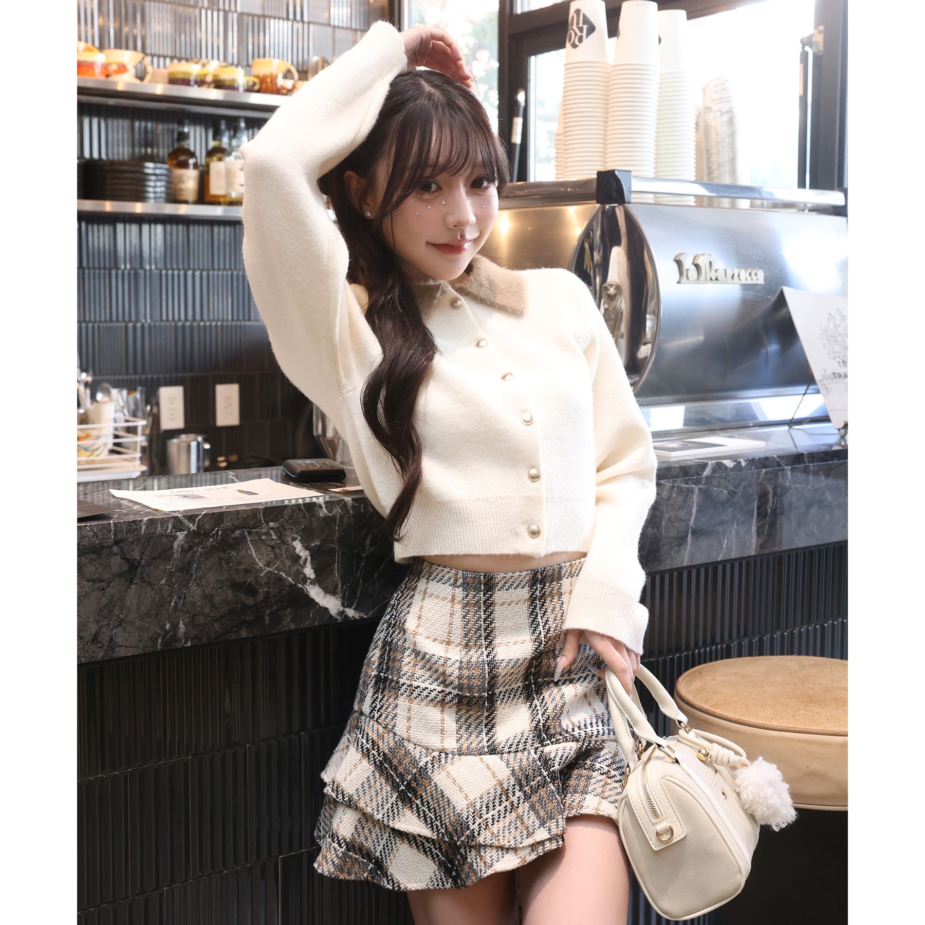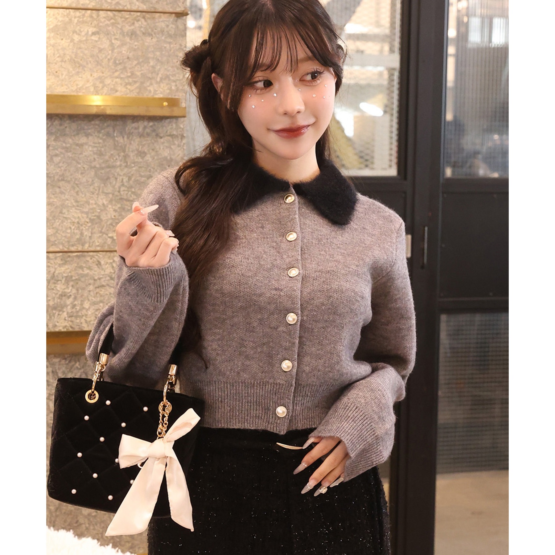 襟にふんわりフェザーをあしらい、フロントに金ボタンを施したカーディガン。