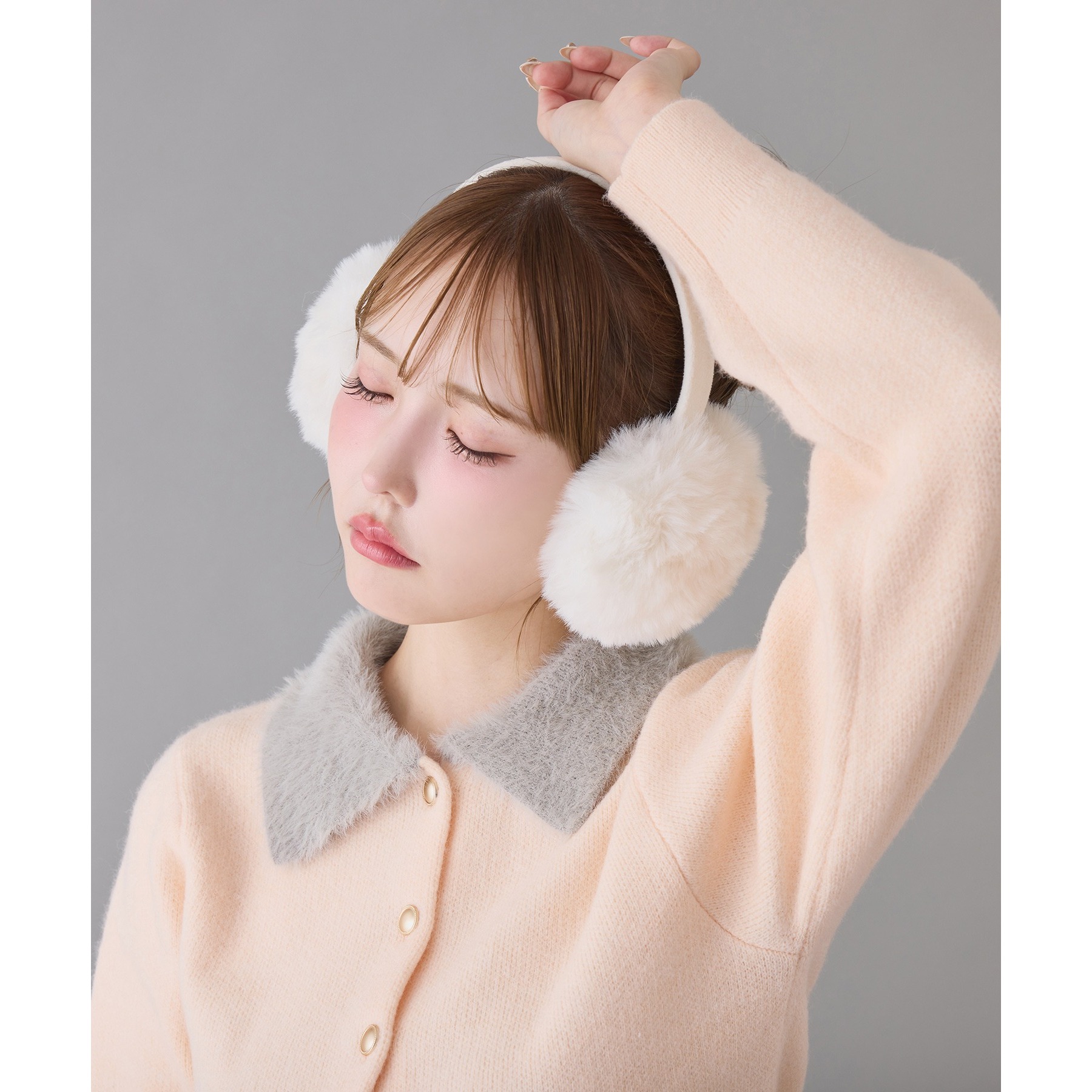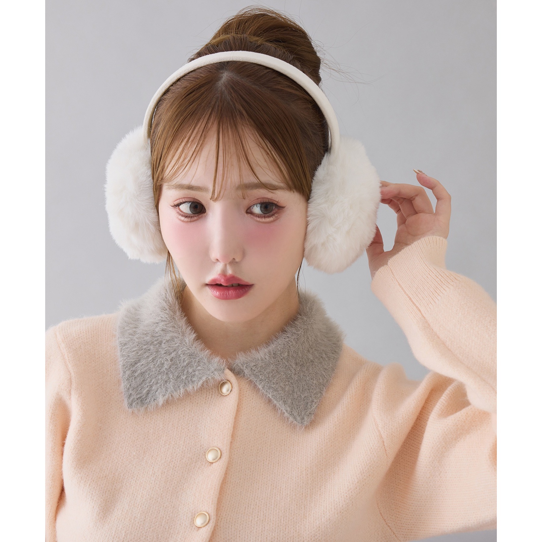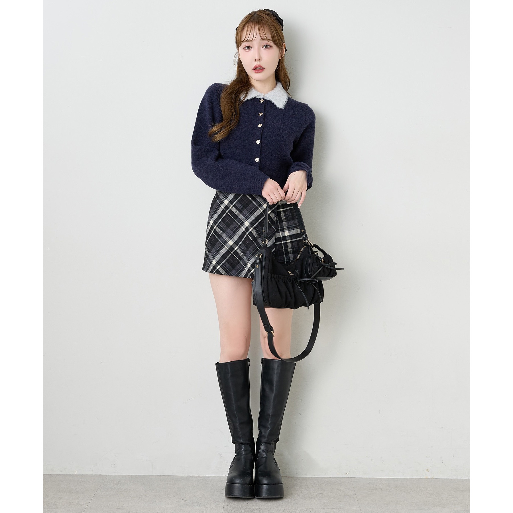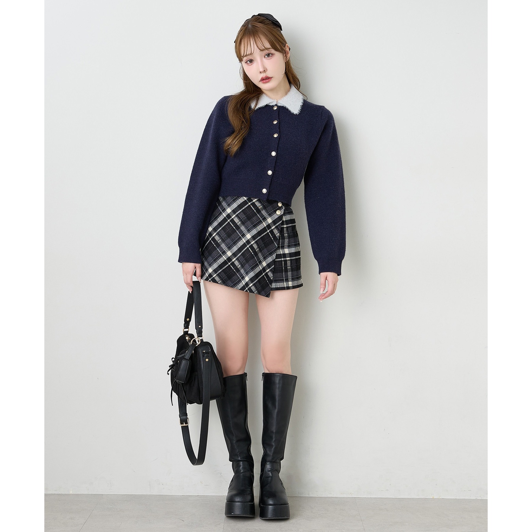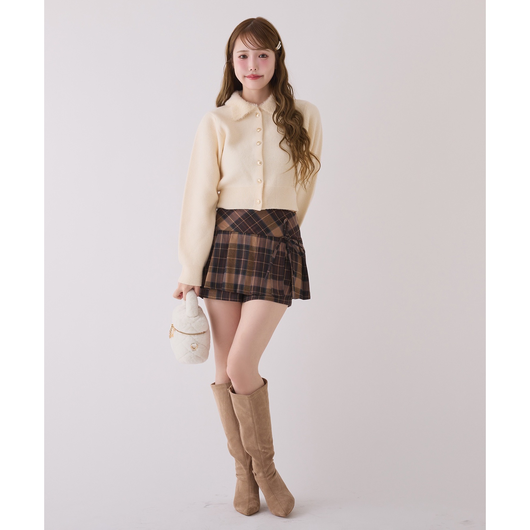 襟にふんわりフェザーをあしらい、フロントに金ボタンを施したカーディガン。