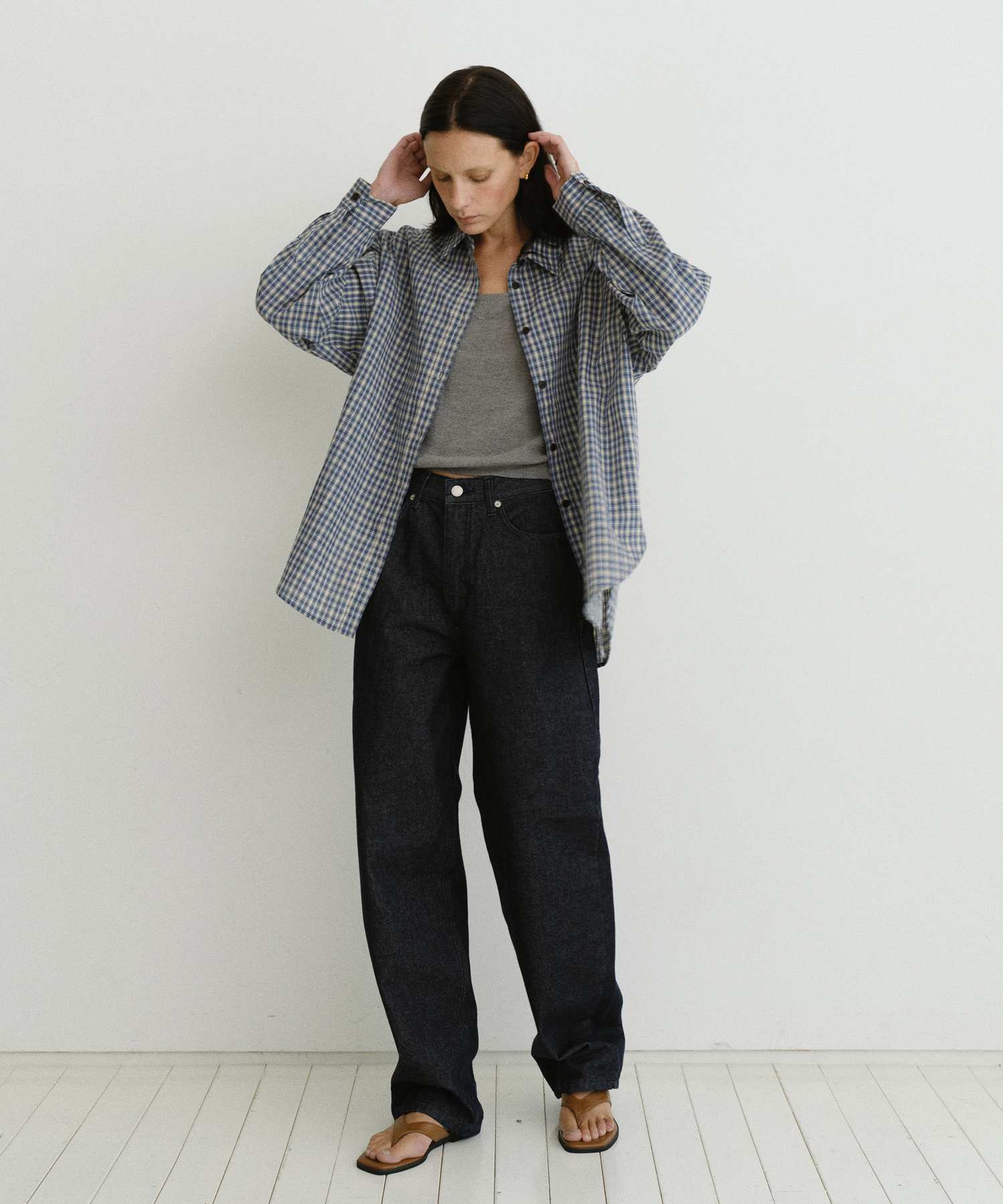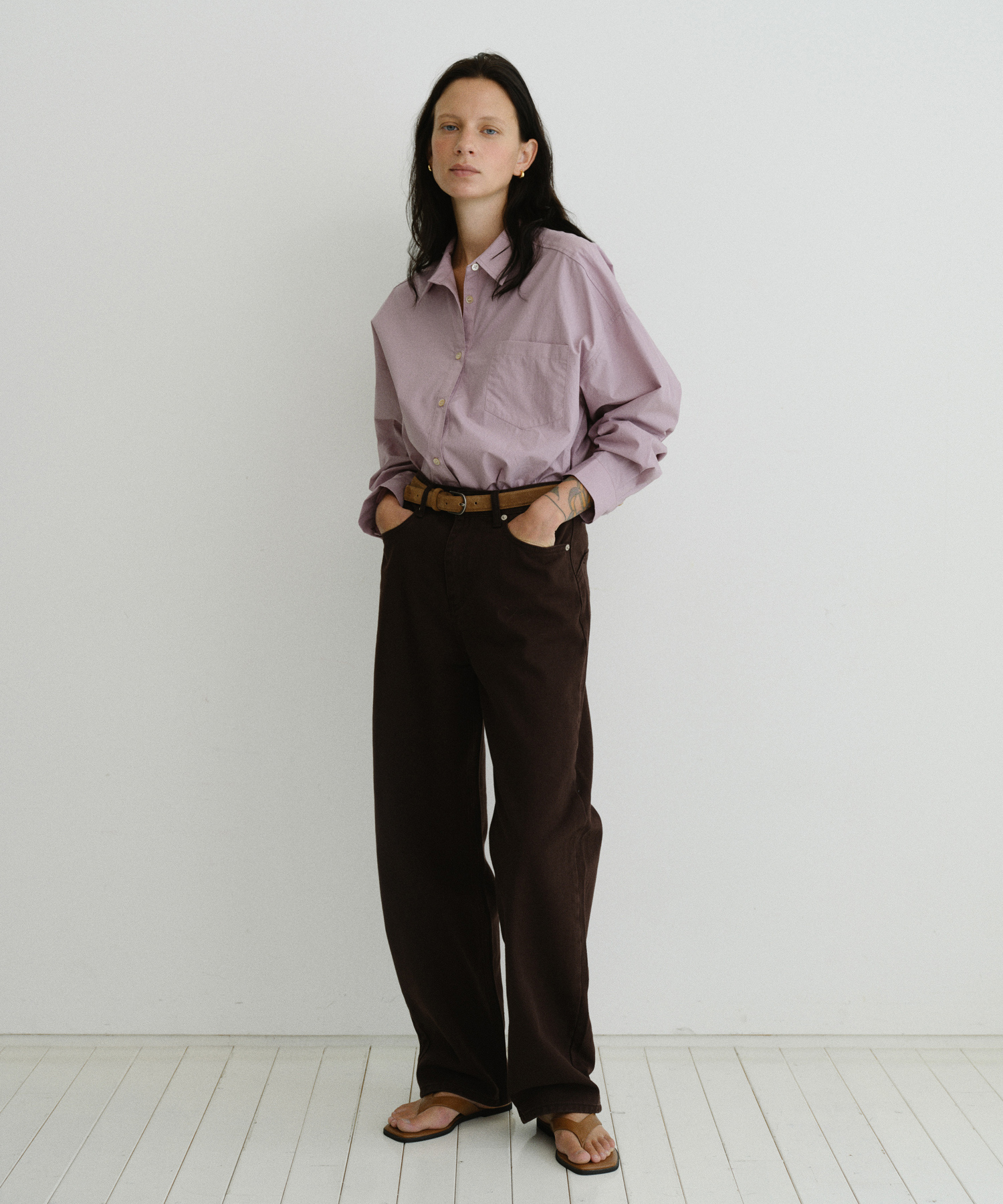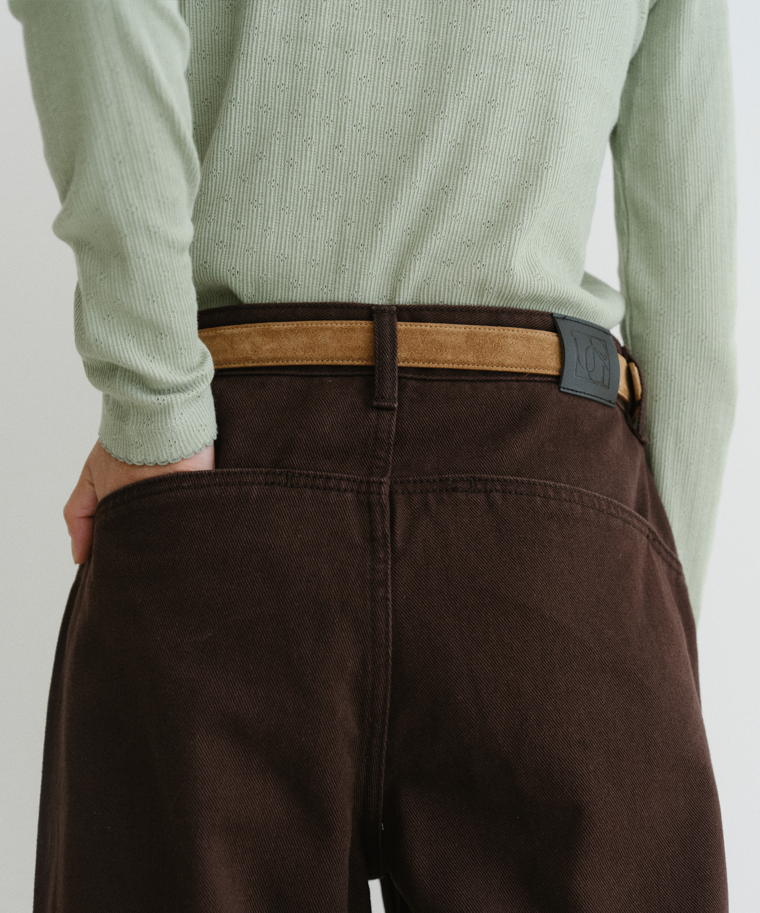 -ヒップラインの一般的なポケットを隠し、丸みのあるステッチラインを採用することで、シルエットにフォーカスしたミニマルなデザインに仕上げました。