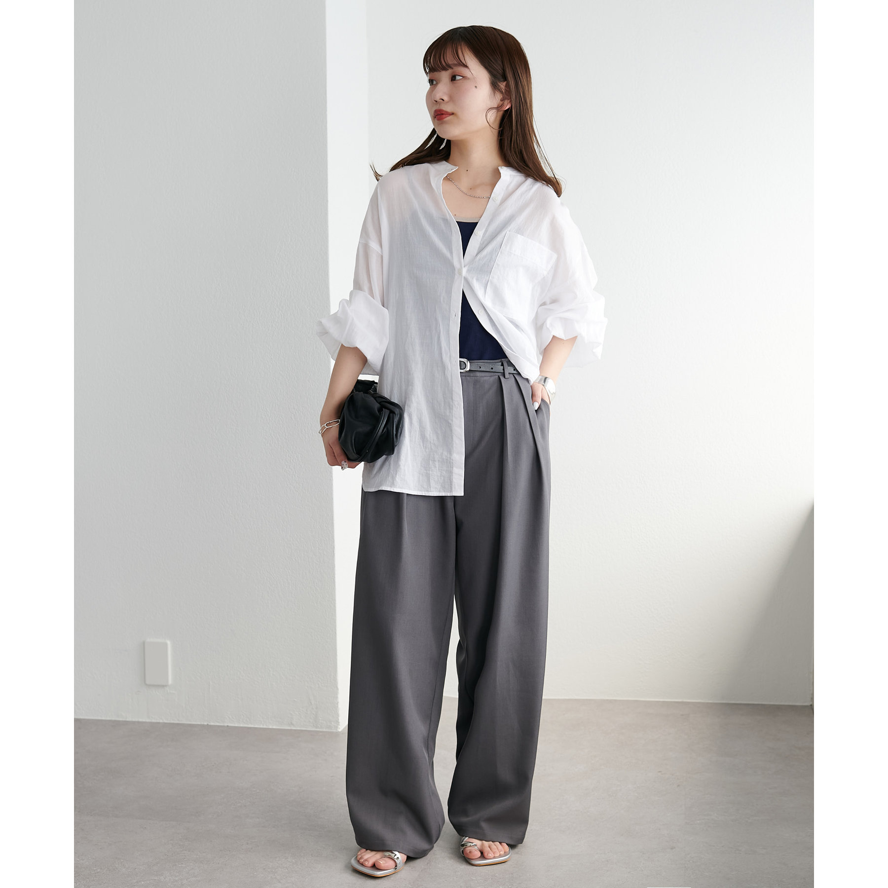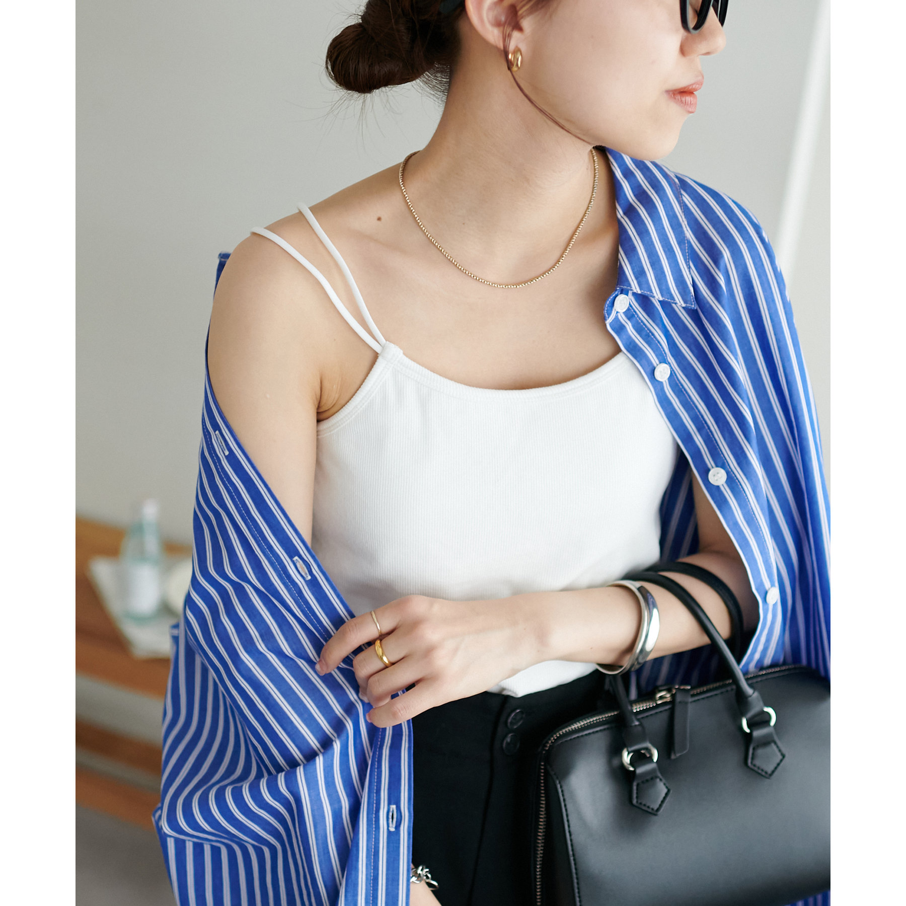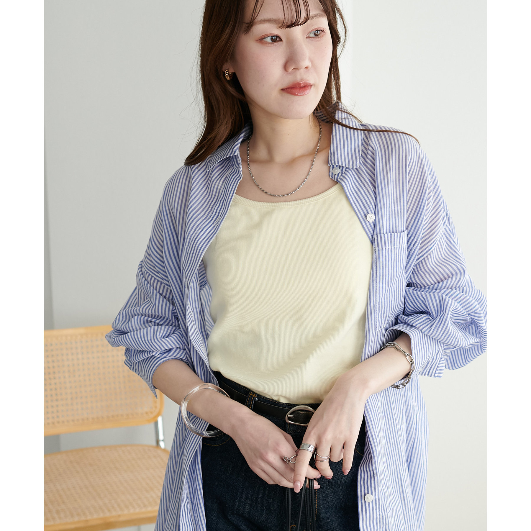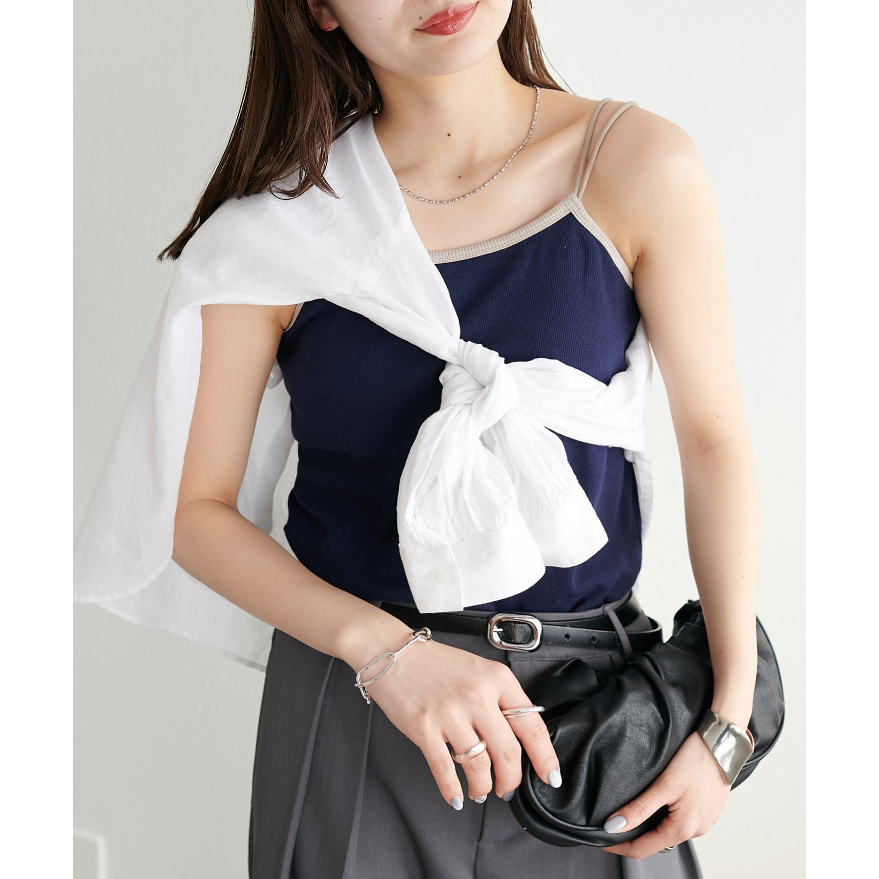 シャツやシアートップスのインナーとしてはもちろん、1枚でさらっと着てもサマになる万能アイテム。