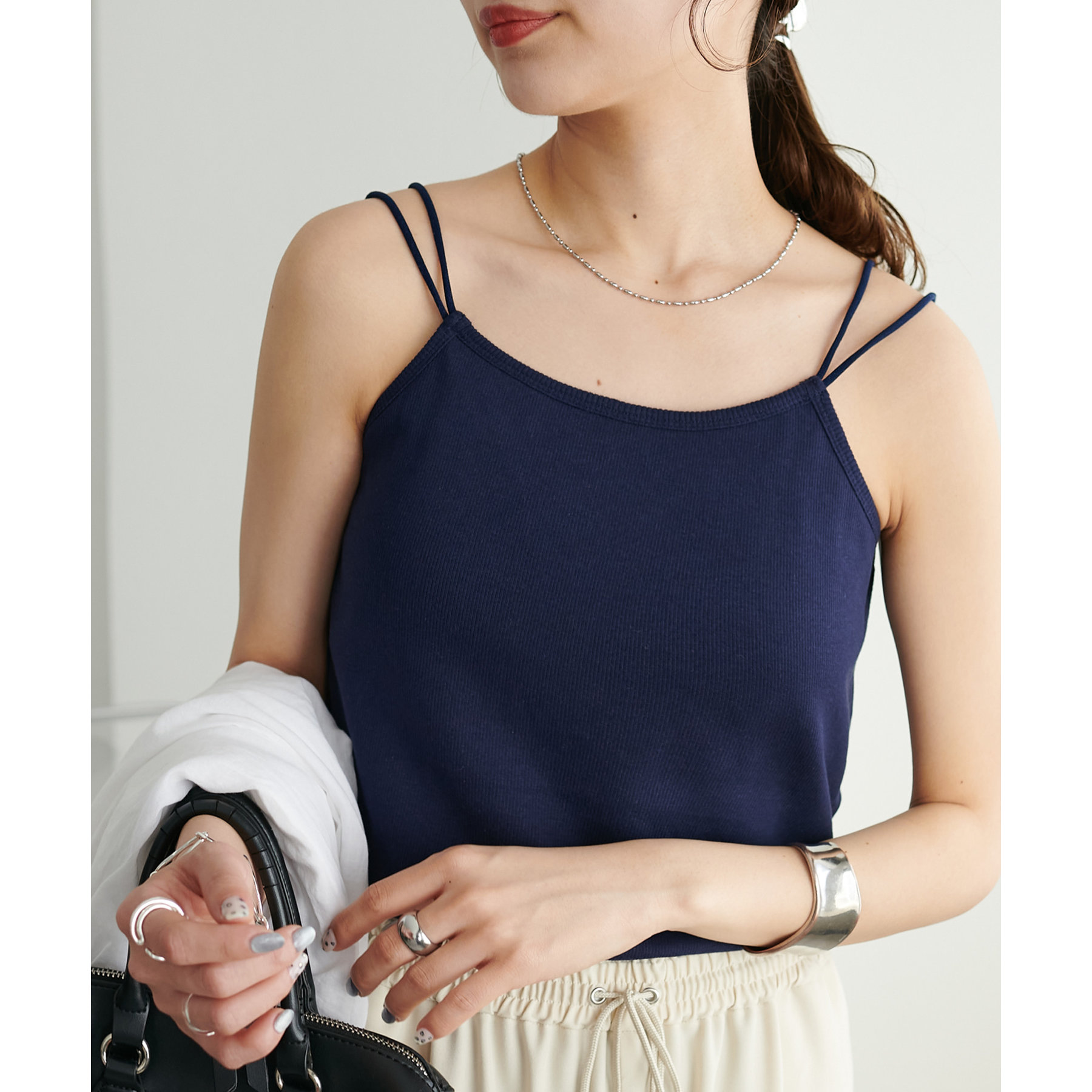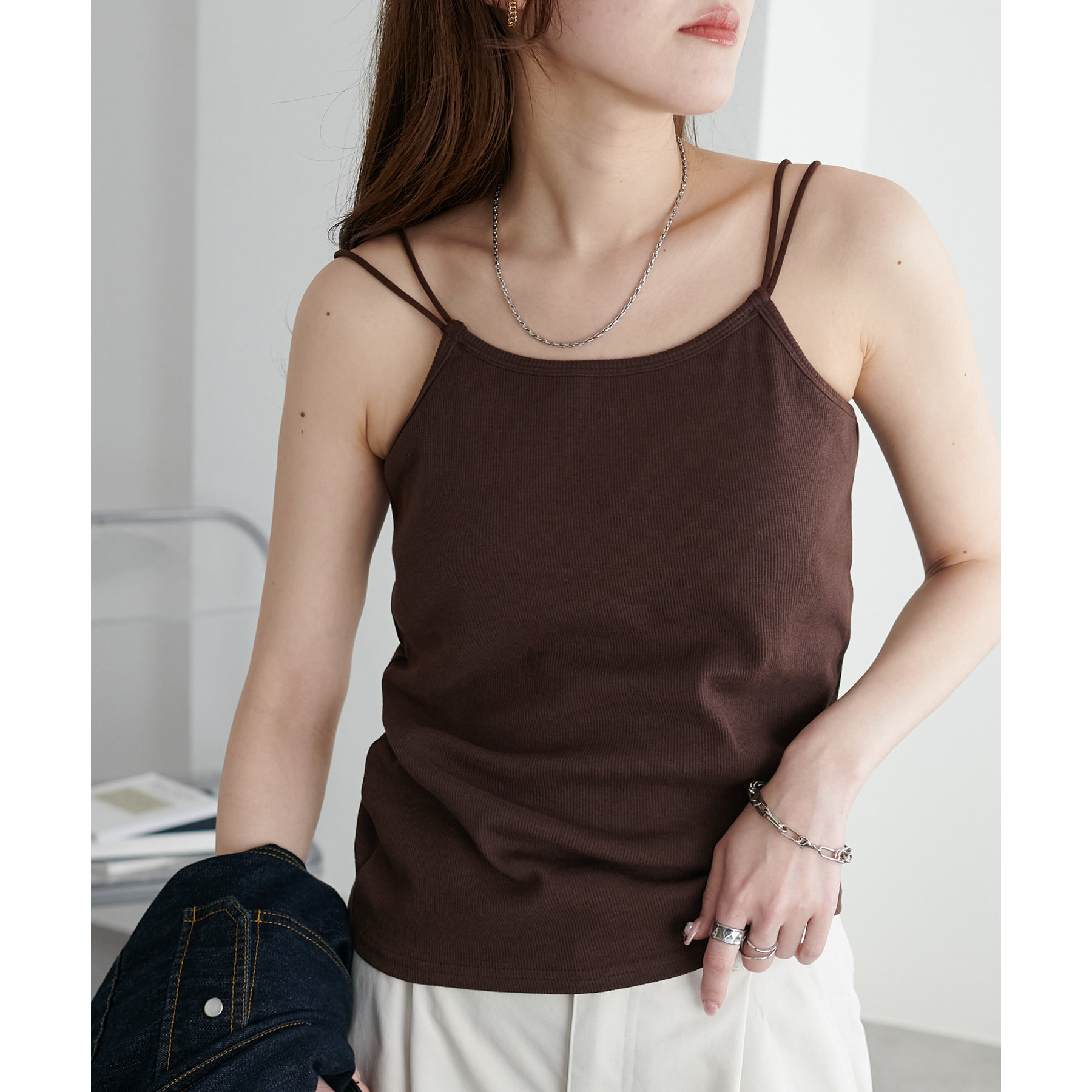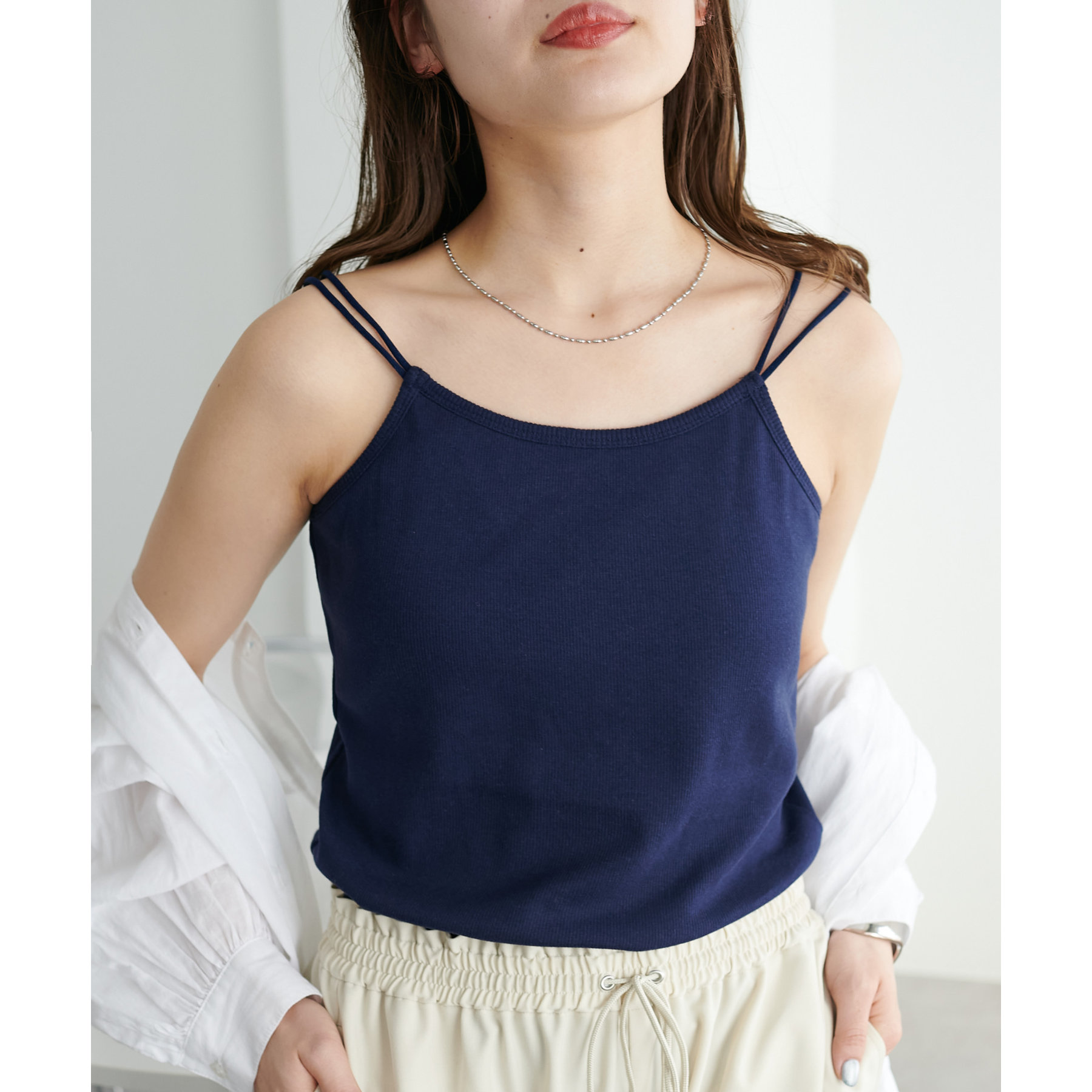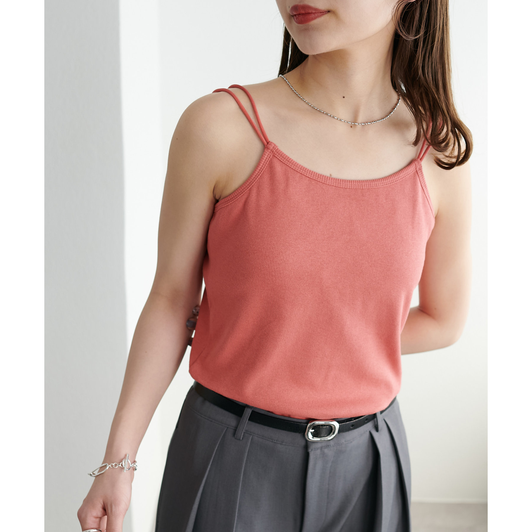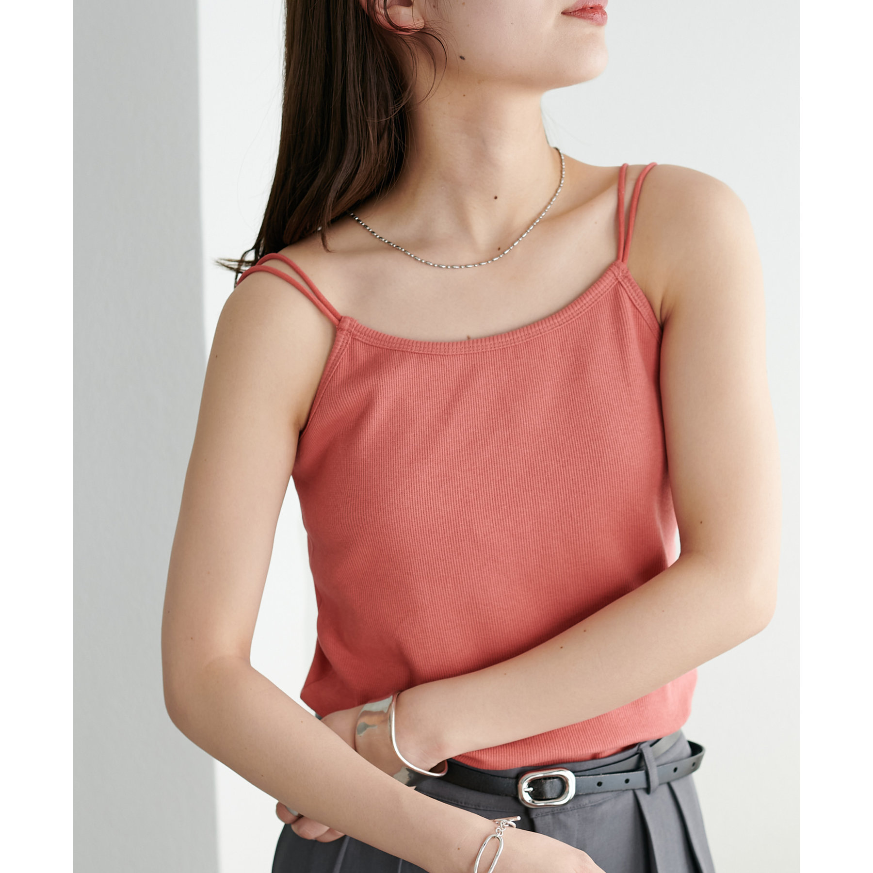 華奢なダブルストラップが女性らしい抜け感を演出するリブキャミソール。