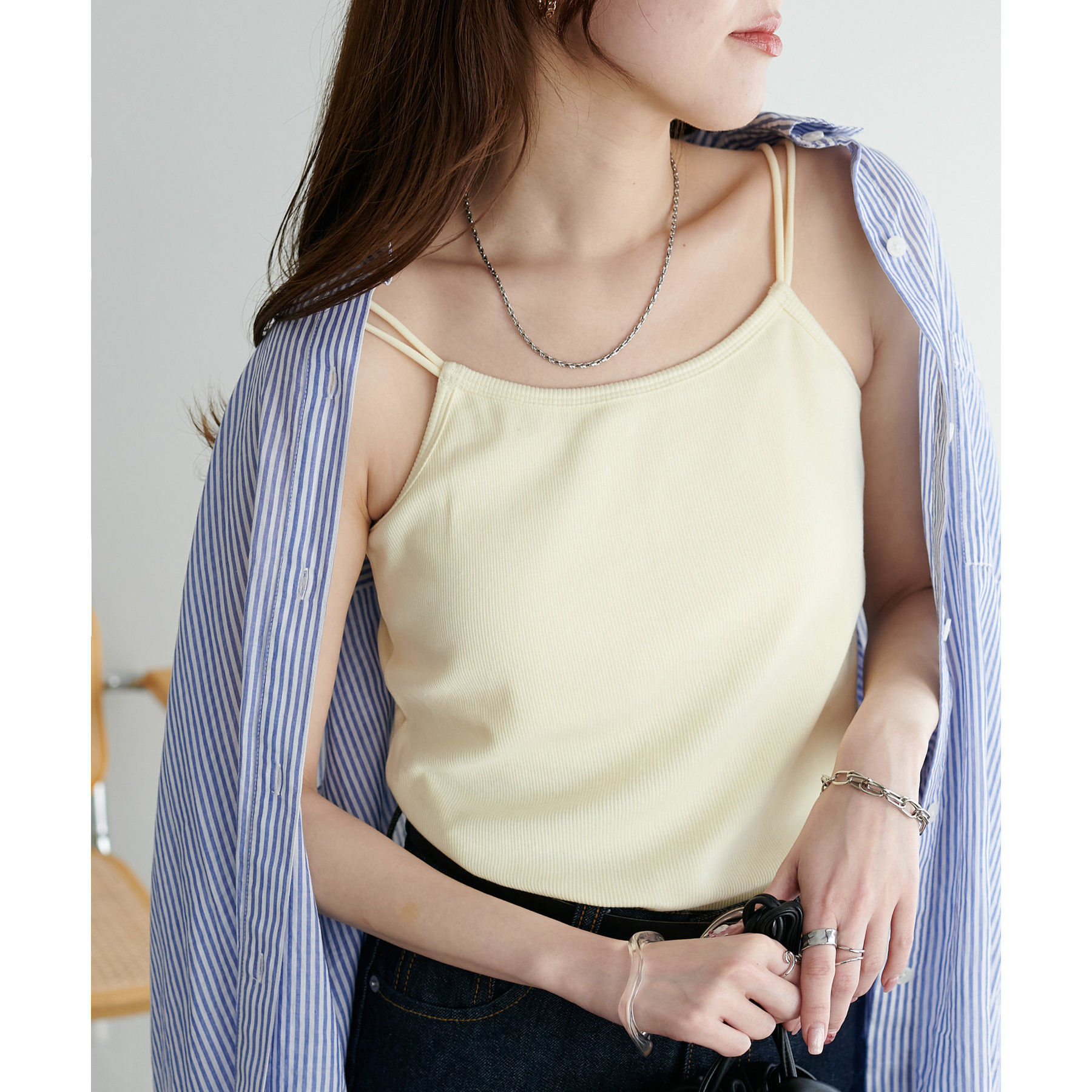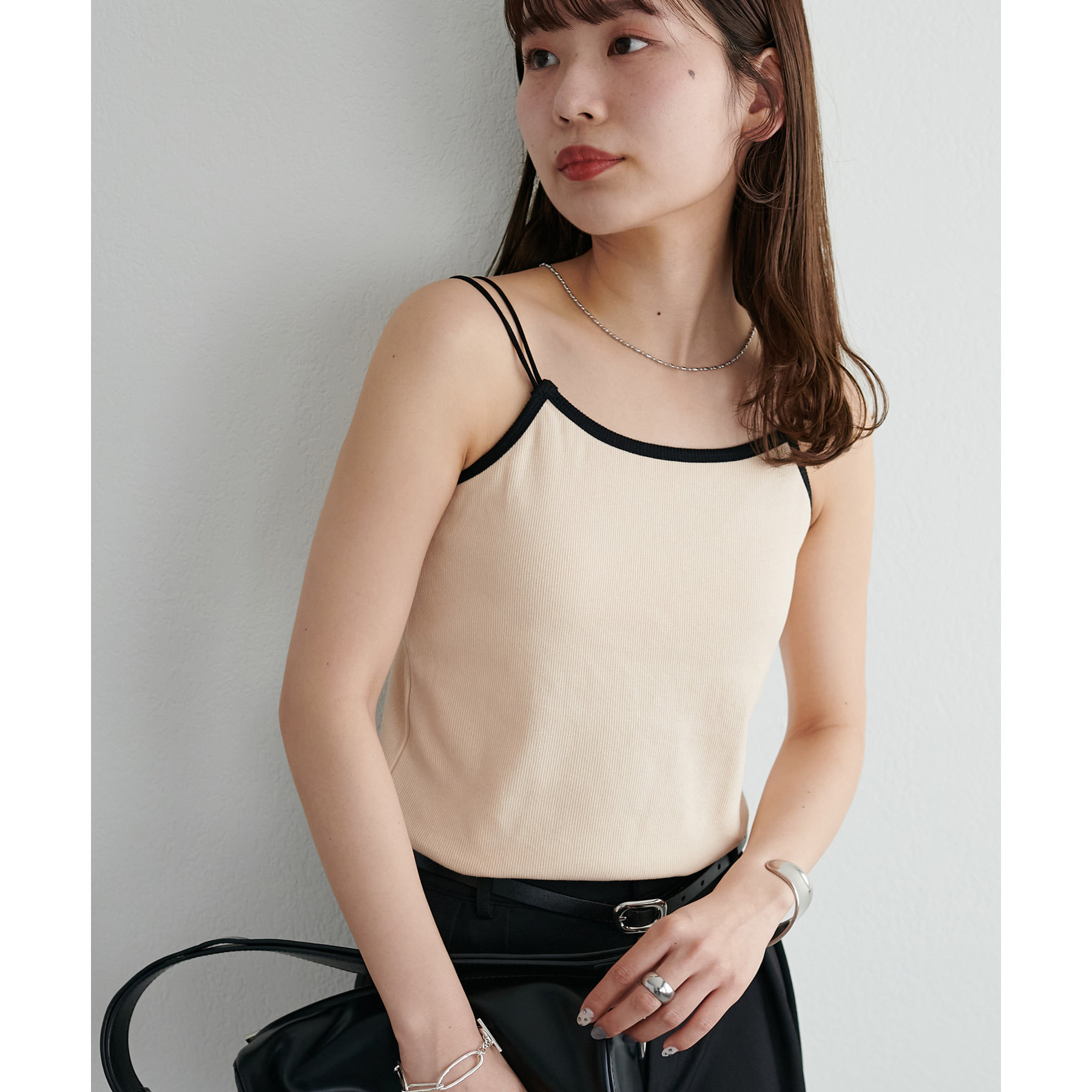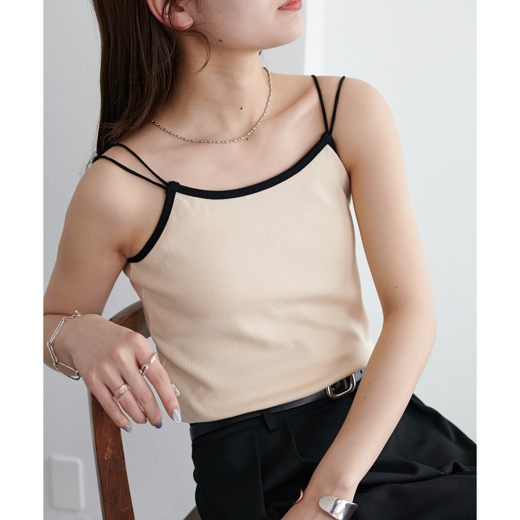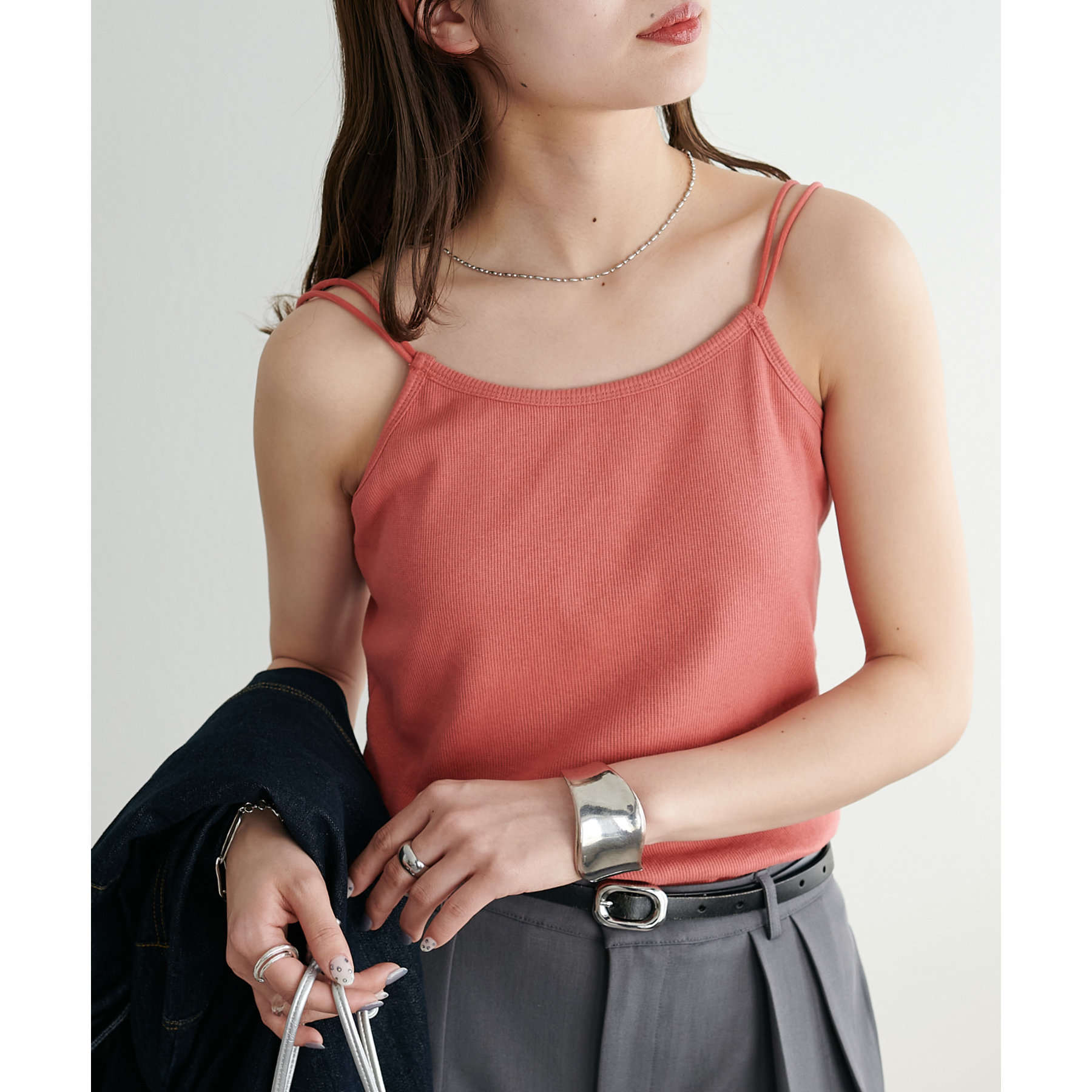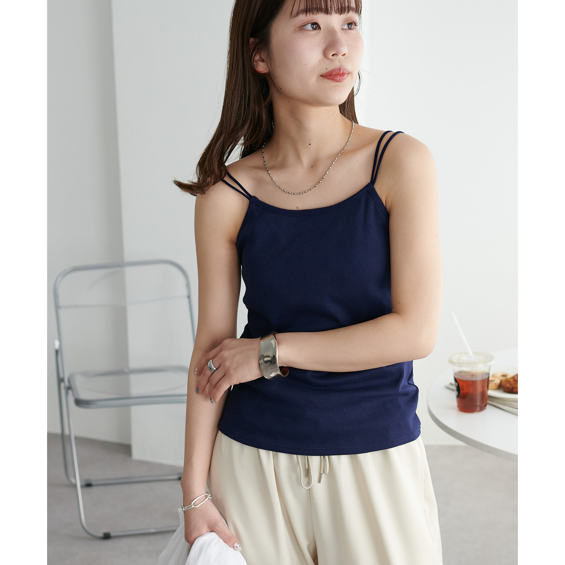 華奢なダブルストラップが女性らしい抜け感を演出するリブキャミソール。