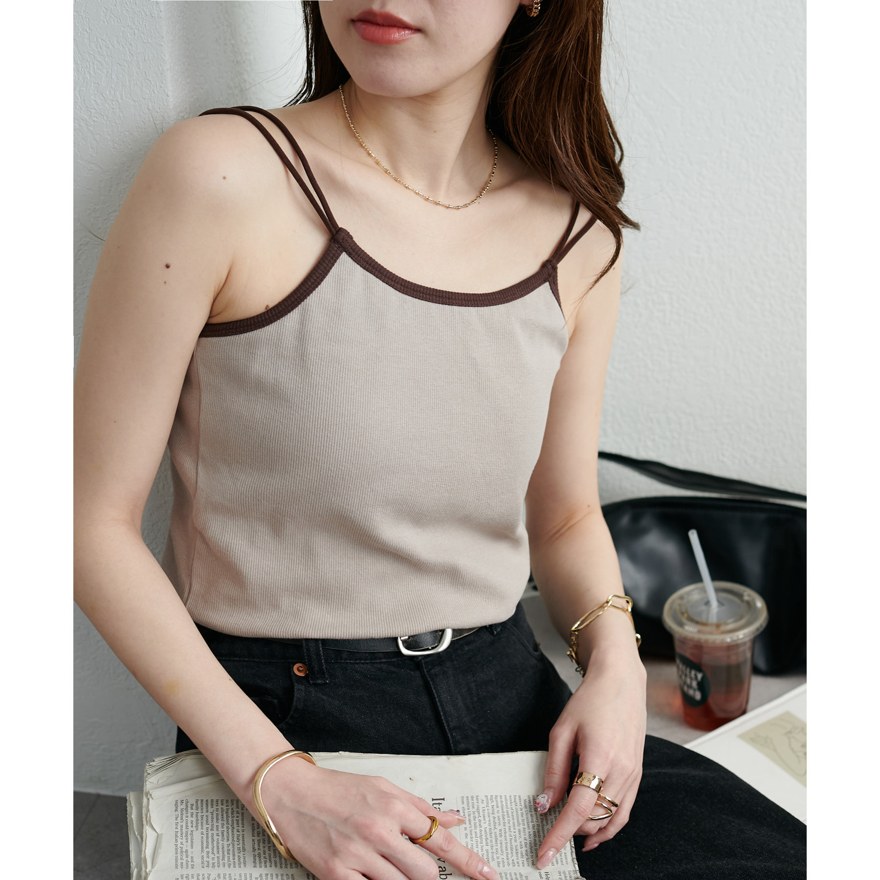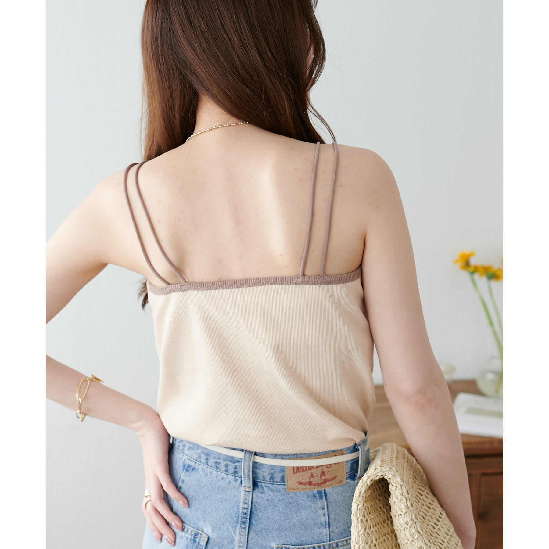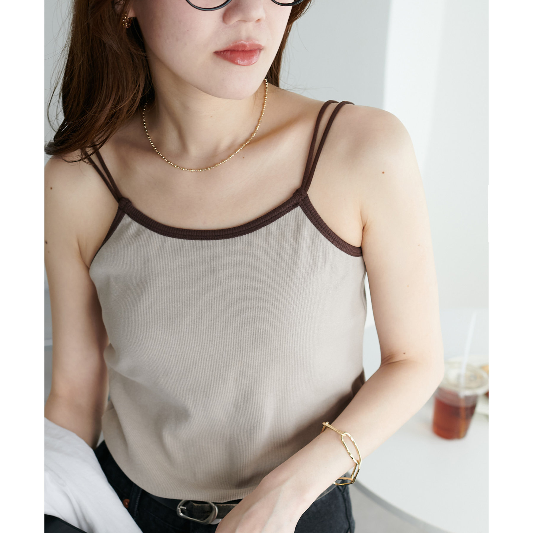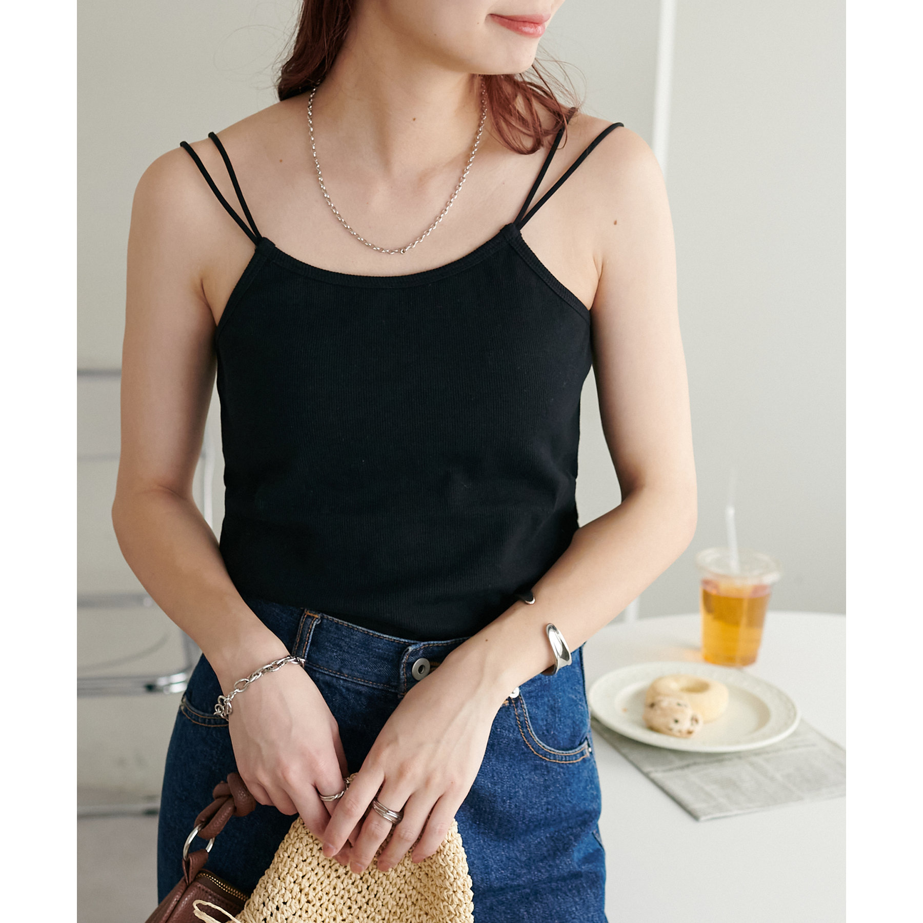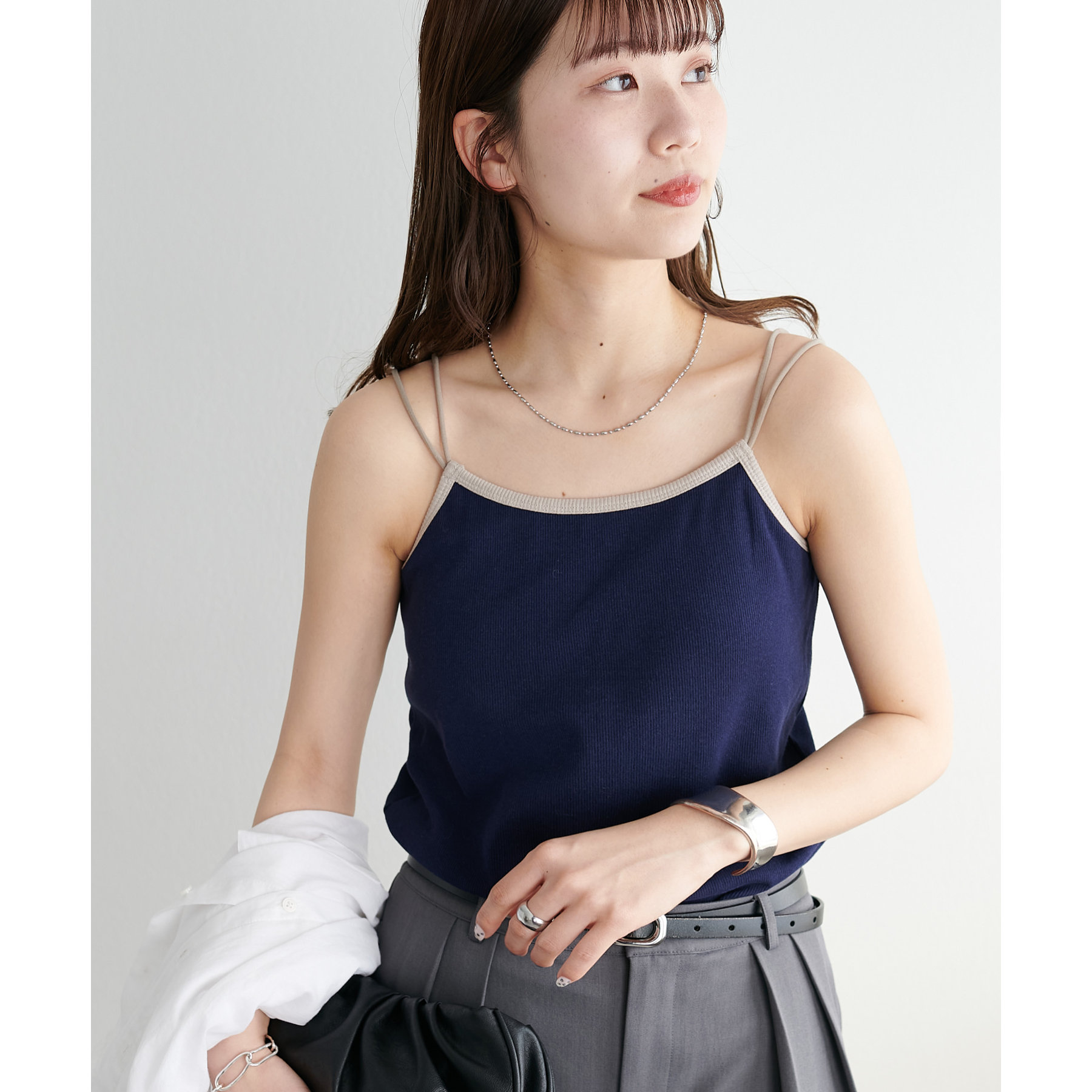 華奢なダブルストラップが女性らしい抜け感を演出するリブキャミソール。