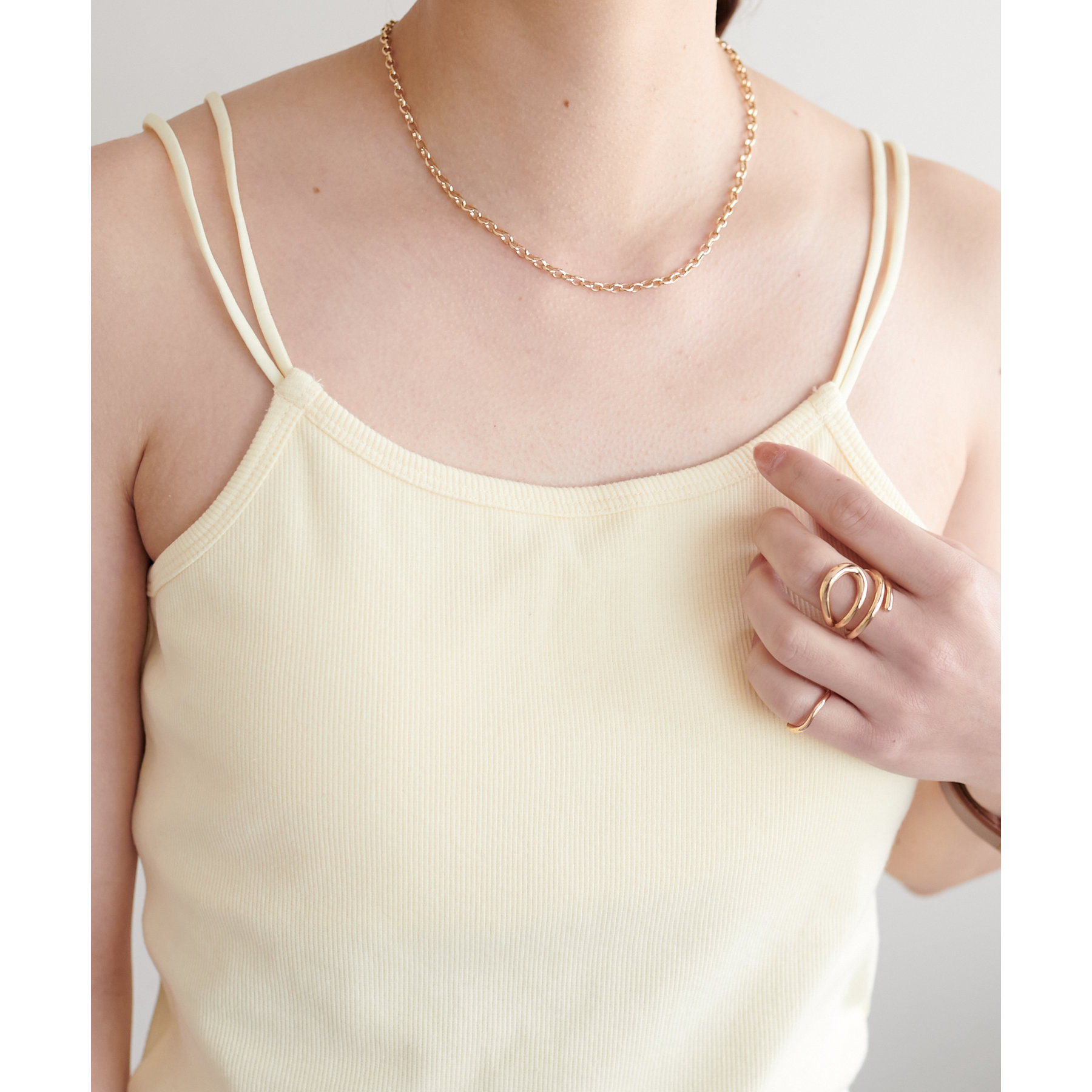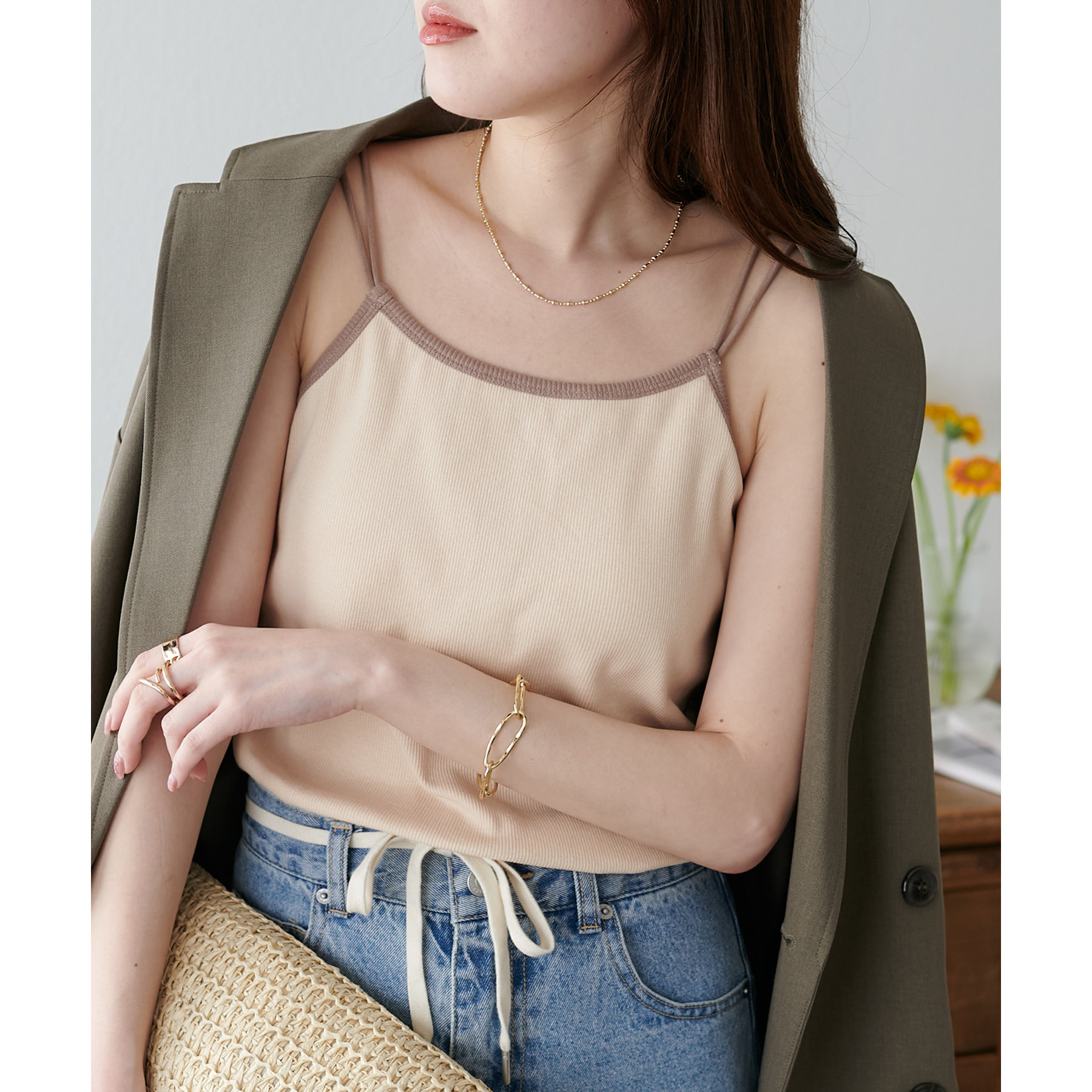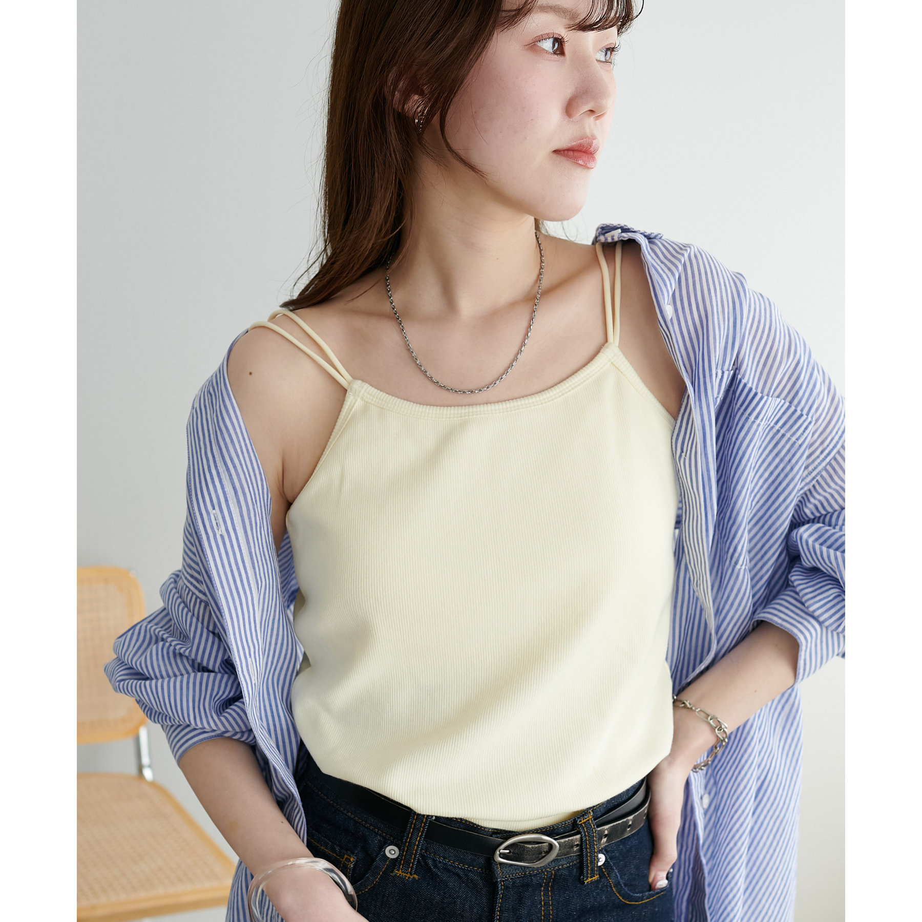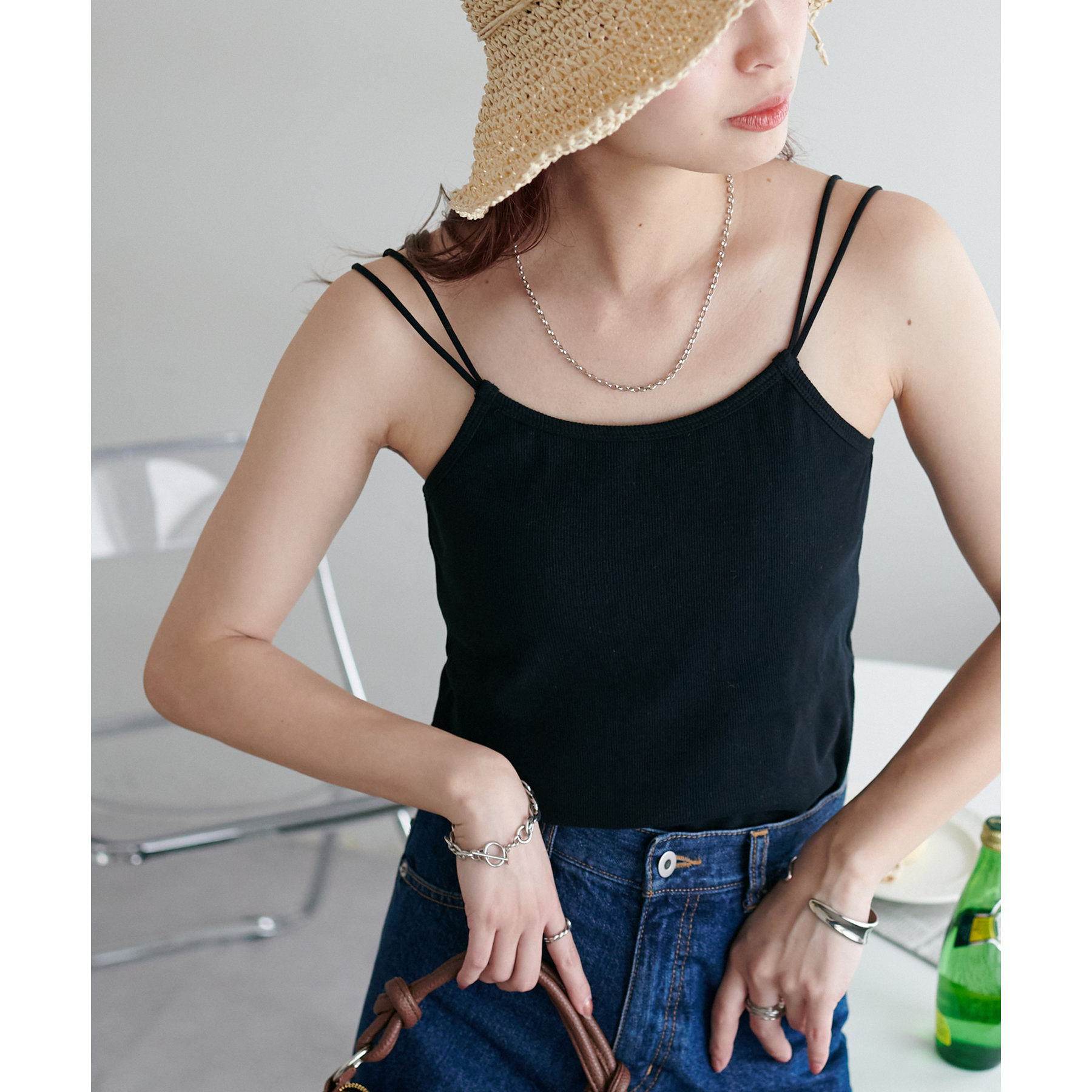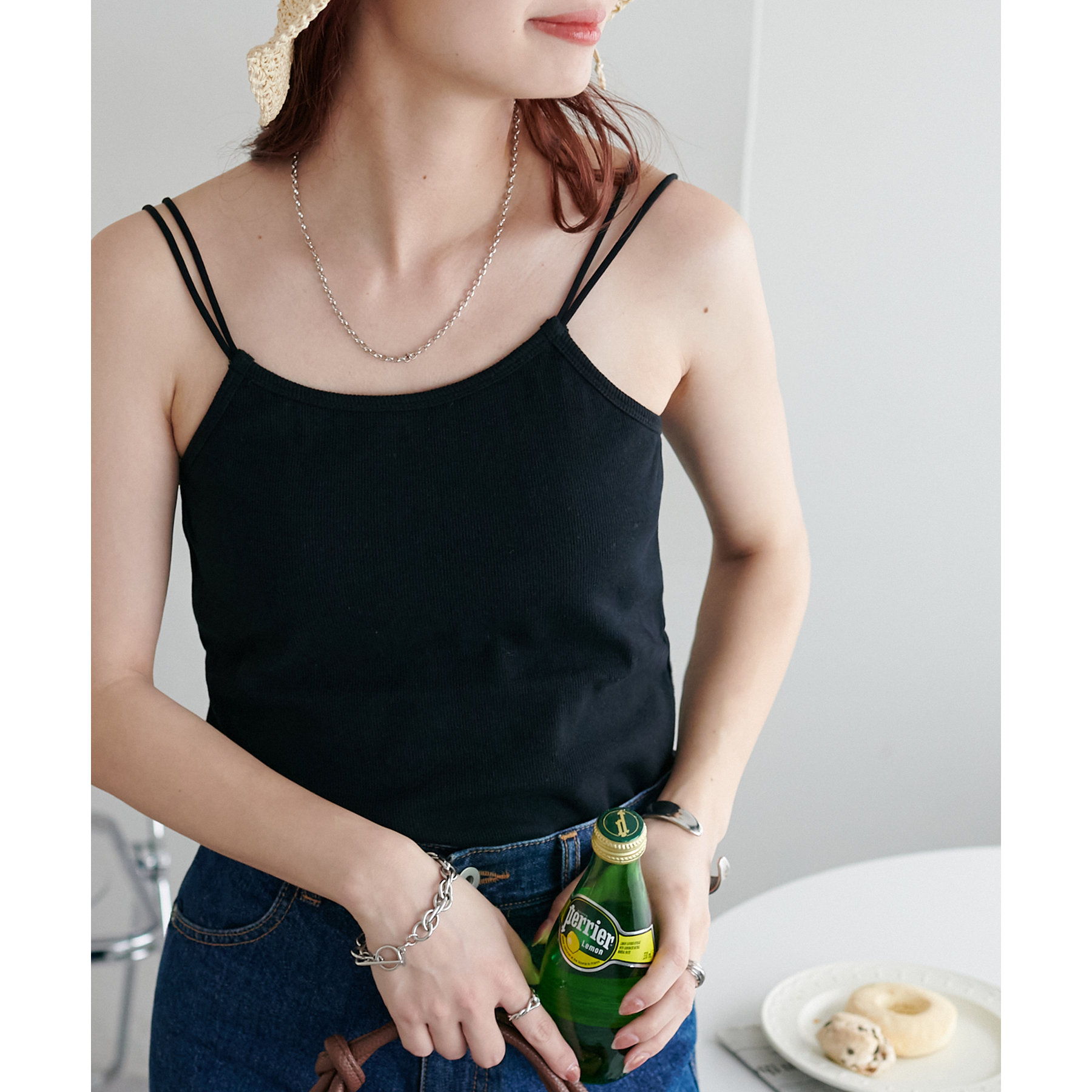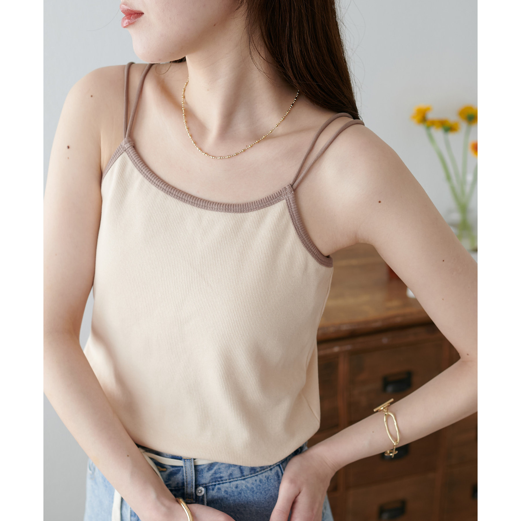 華奢なダブルストラップが女性らしい抜け感を演出するリブキャミソール。