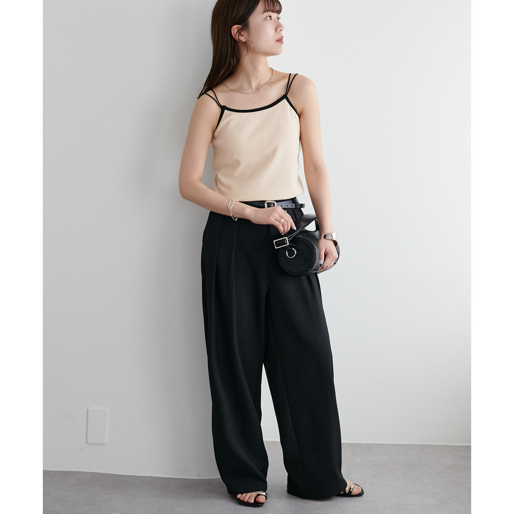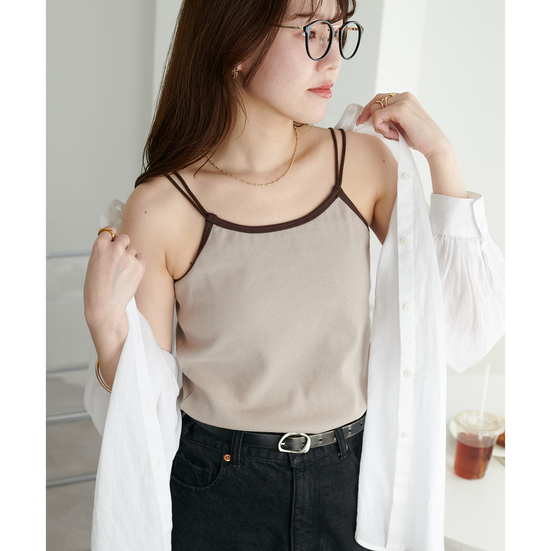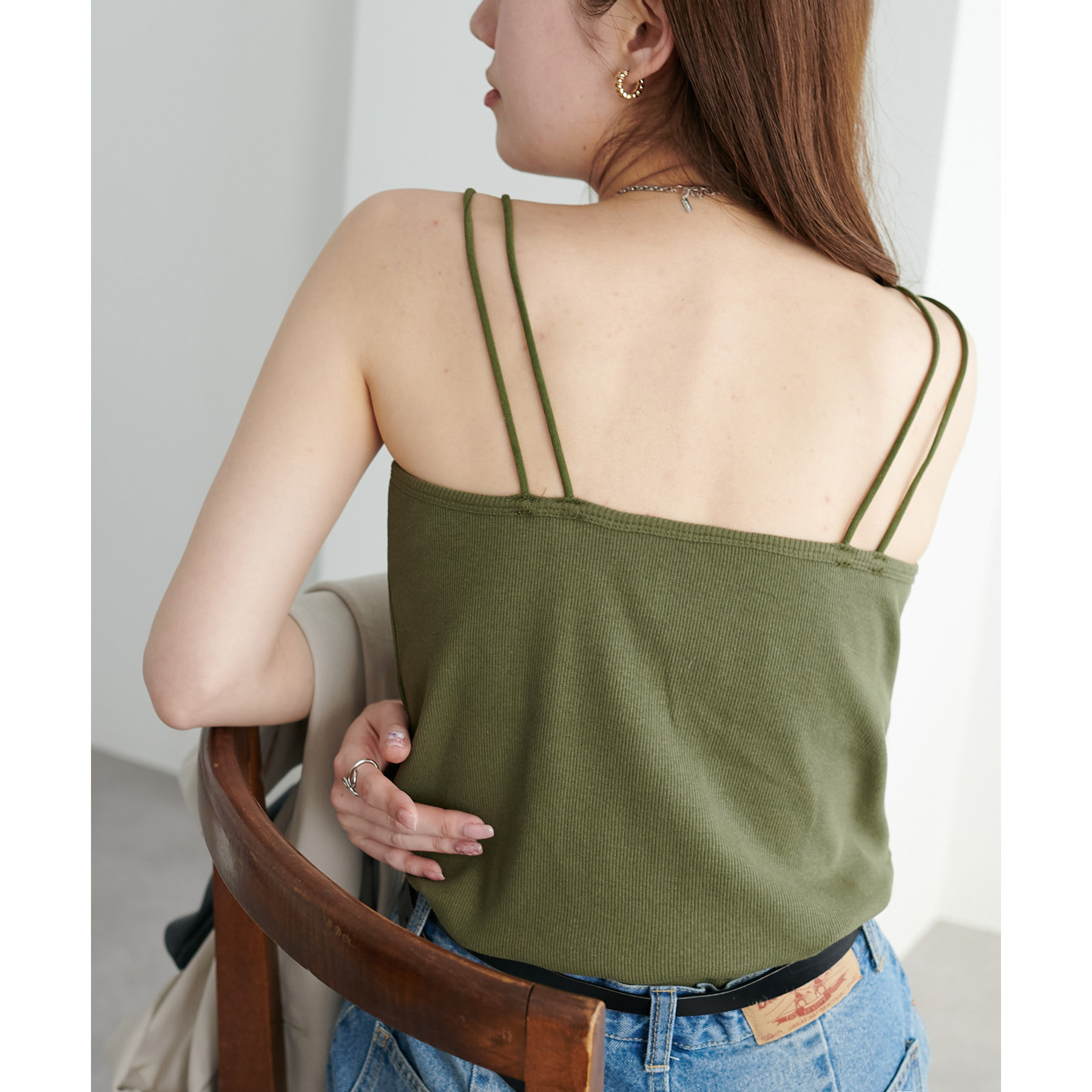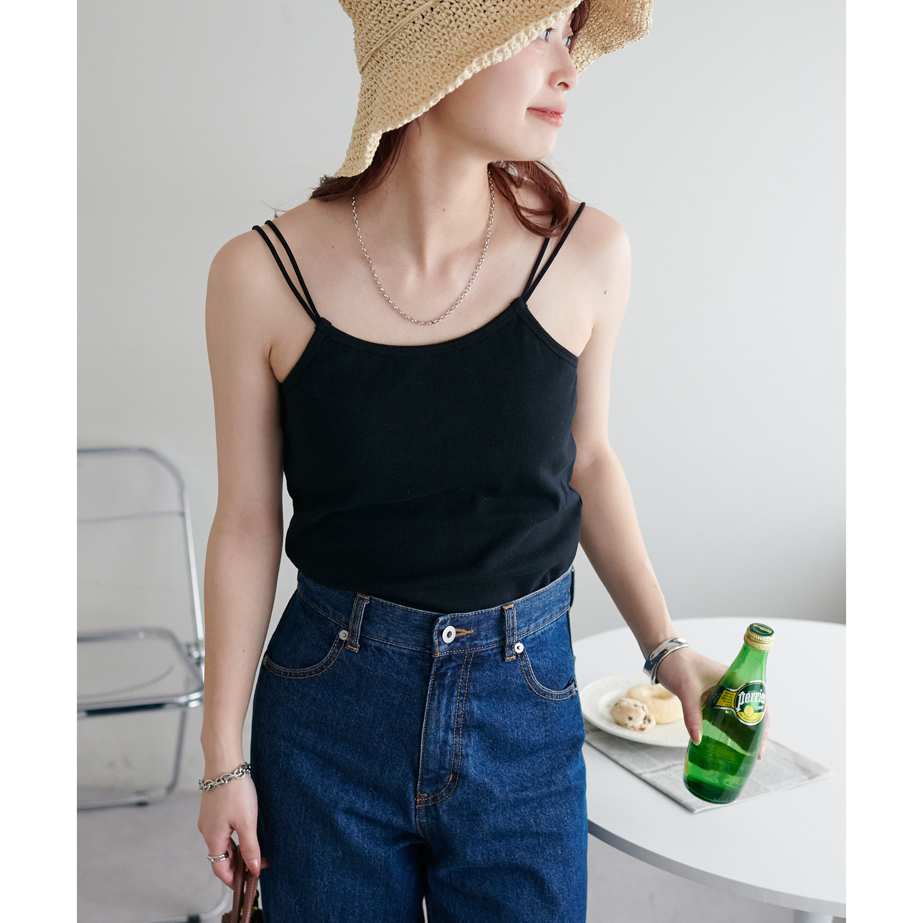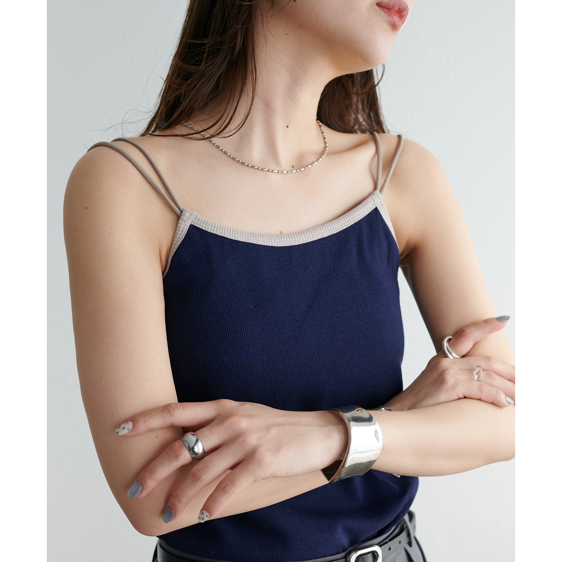 華奢なダブルストラップが女性らしい抜け感を演出するリブキャミソール。