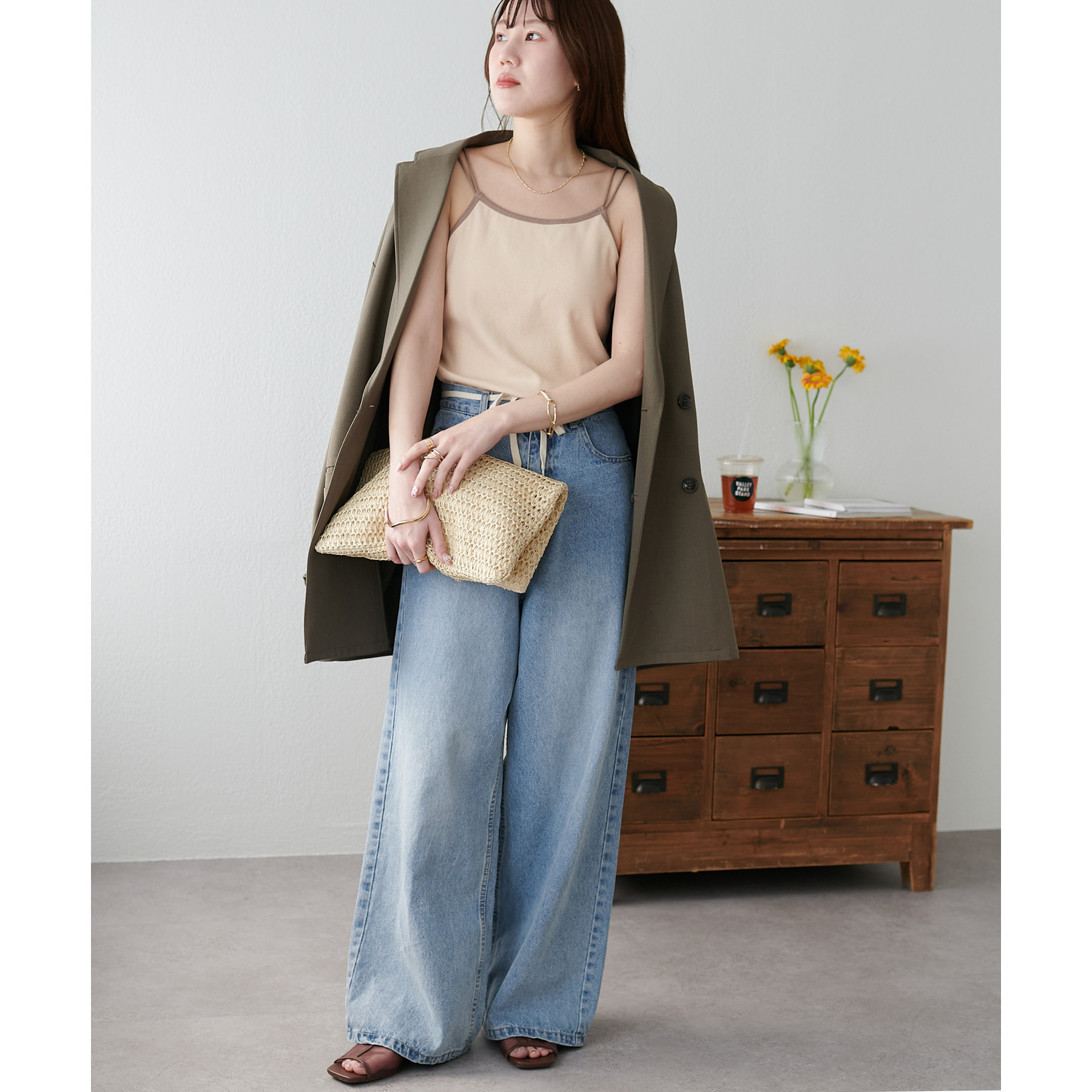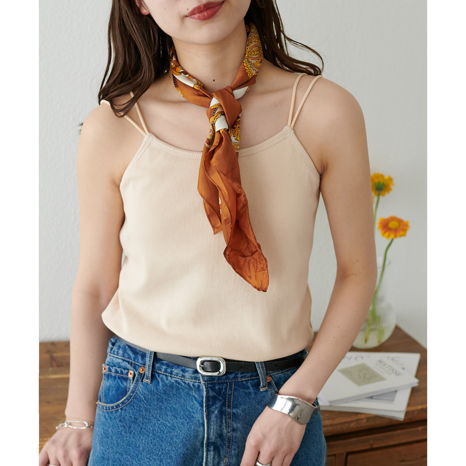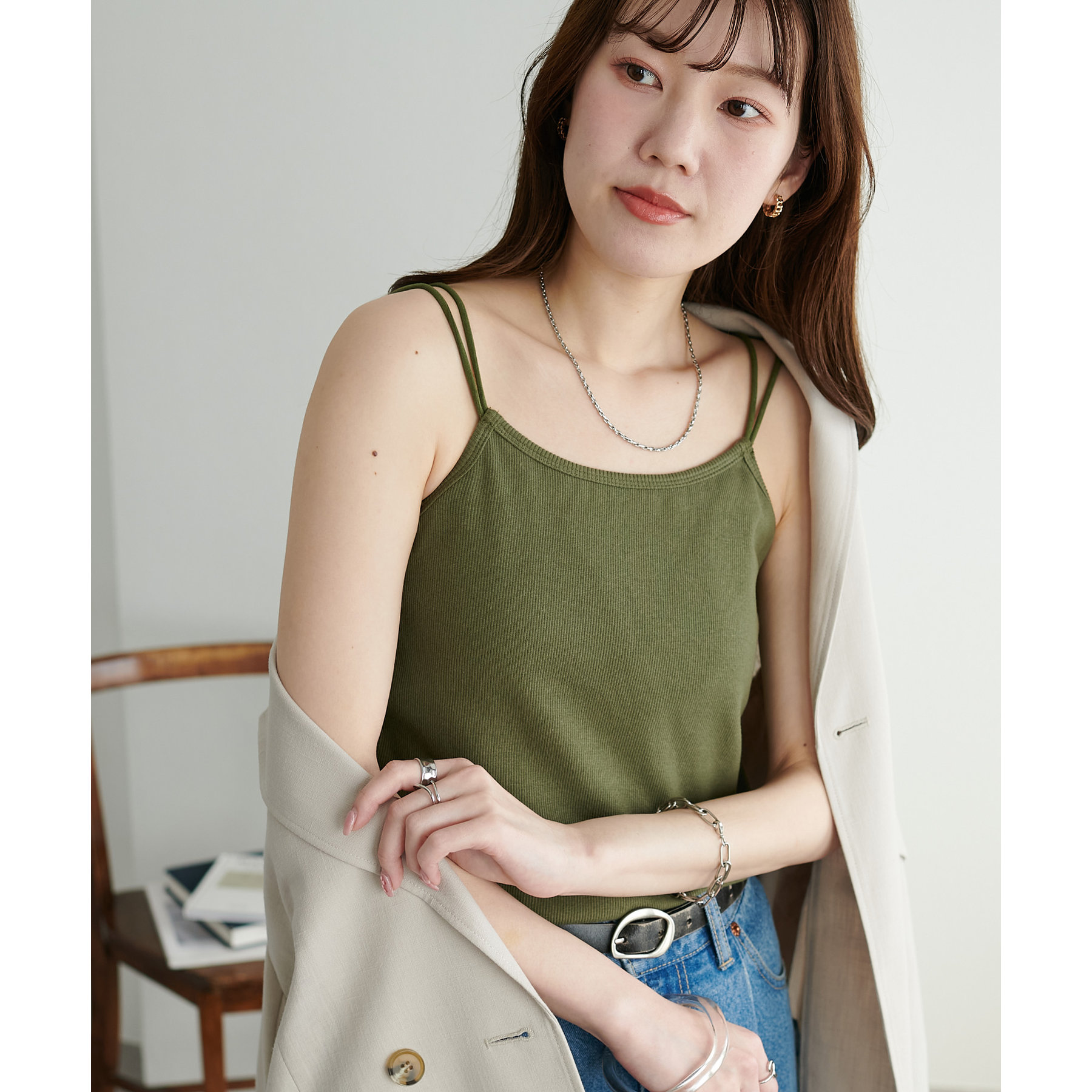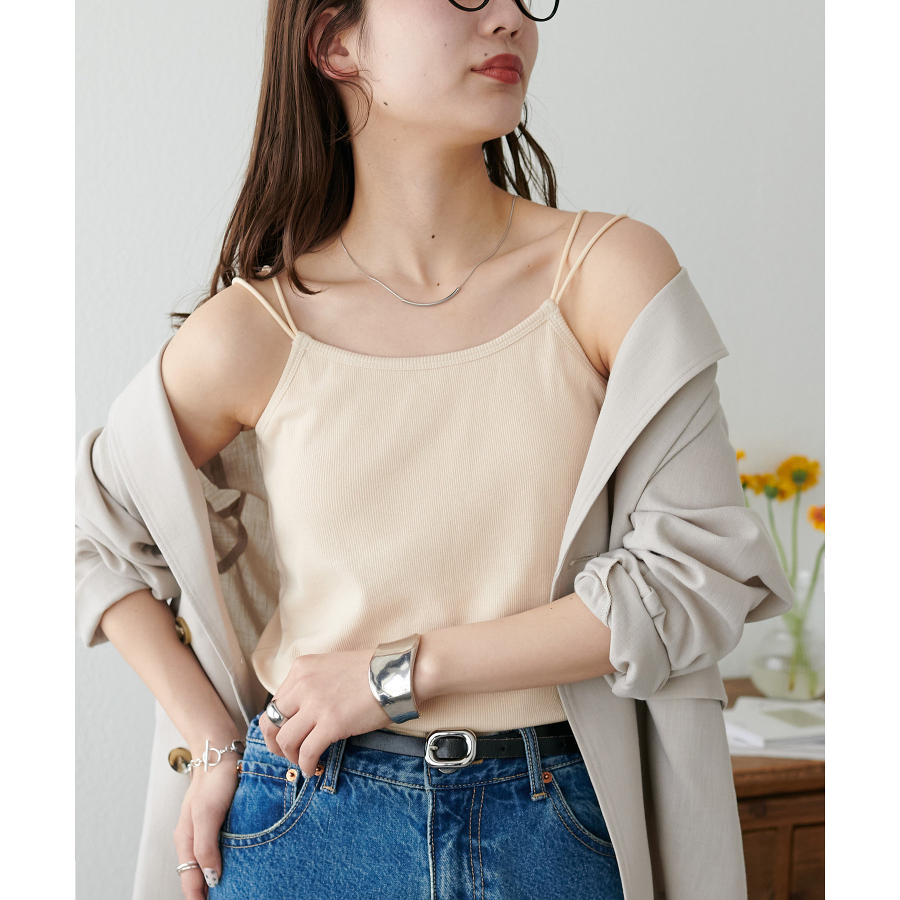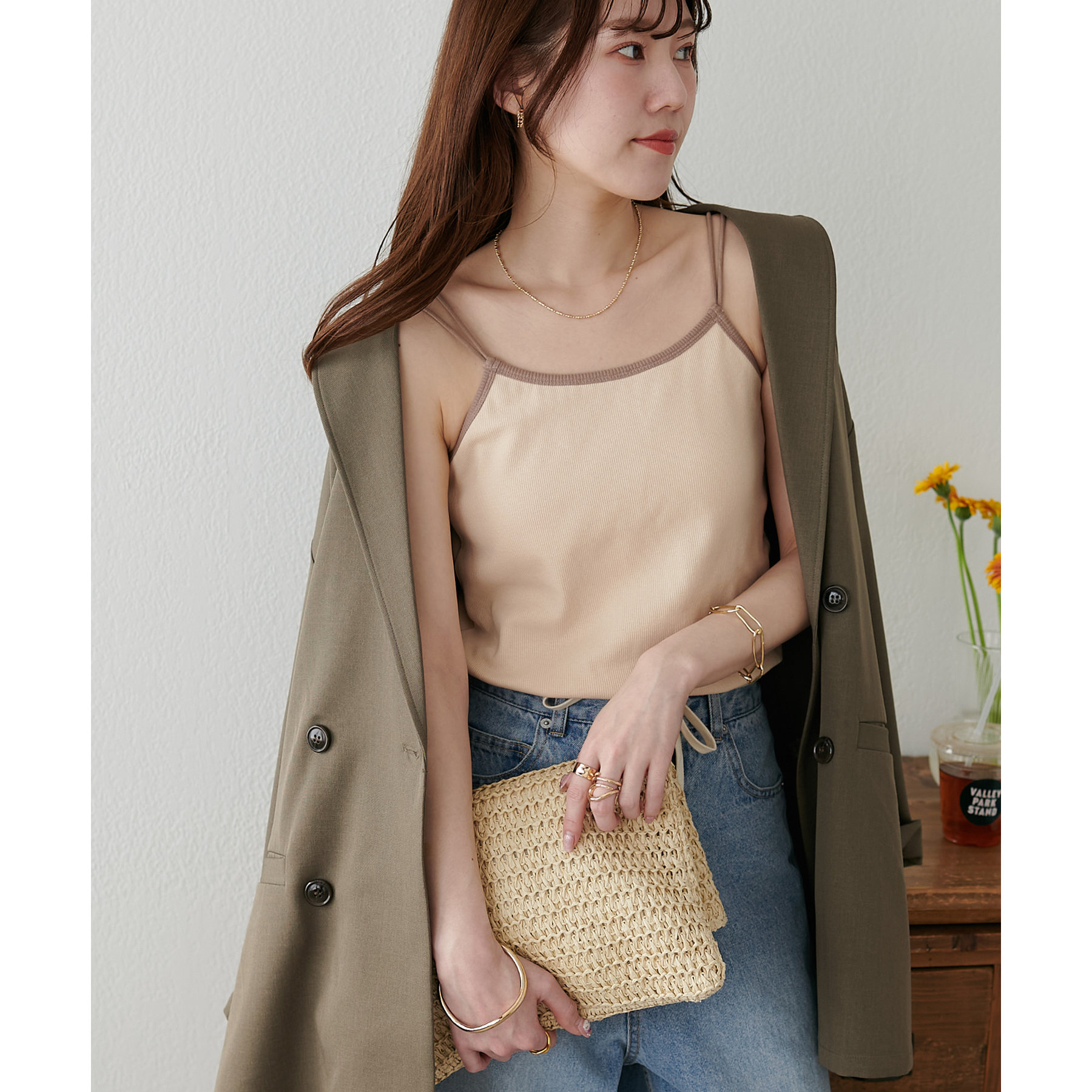 華奢なダブルストラップが女性らしい抜け感を演出するリブキャミソール。