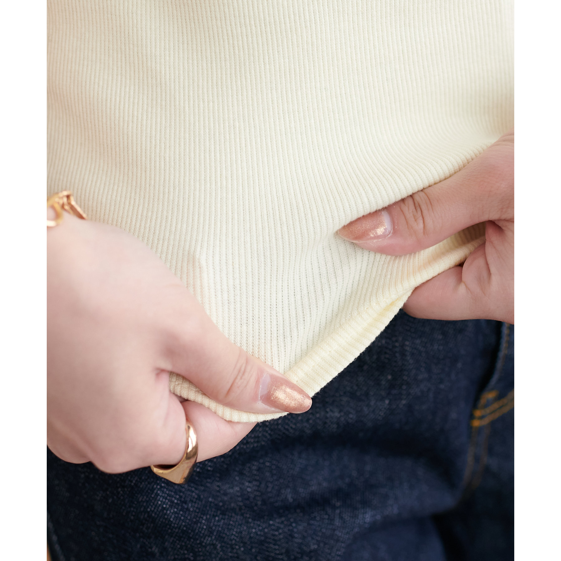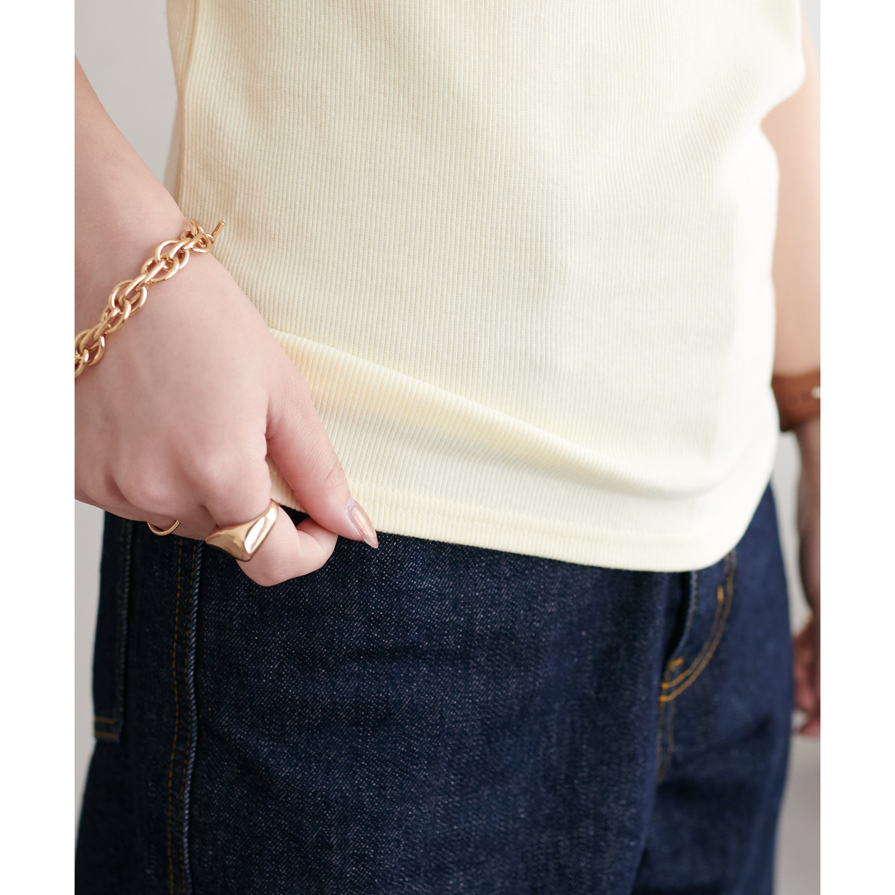158cmスタッフ:柔らかく、伸びの良いコットン混のリブ素材を使用しており、肌あたりが優しくストレスフリーな着心地です!程よい厚みで透け感を気にせず着用でき、1枚でも安心して着られるのも魅力です。