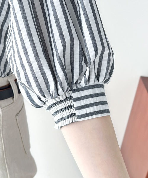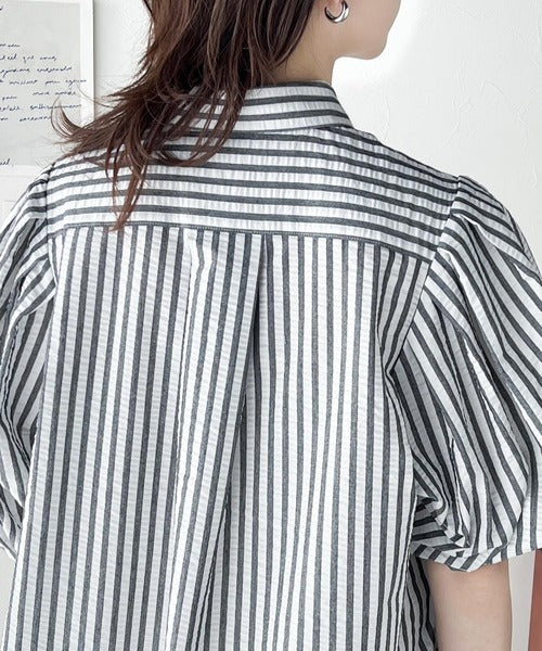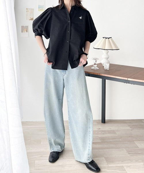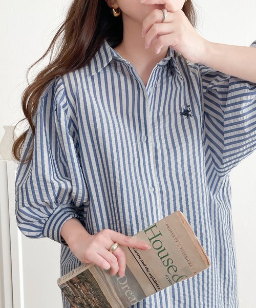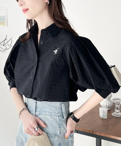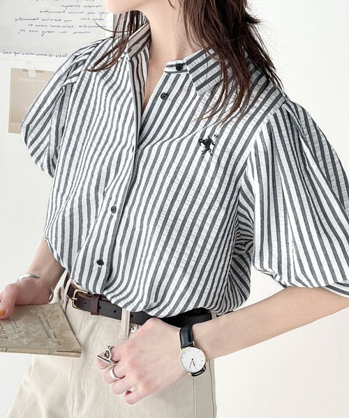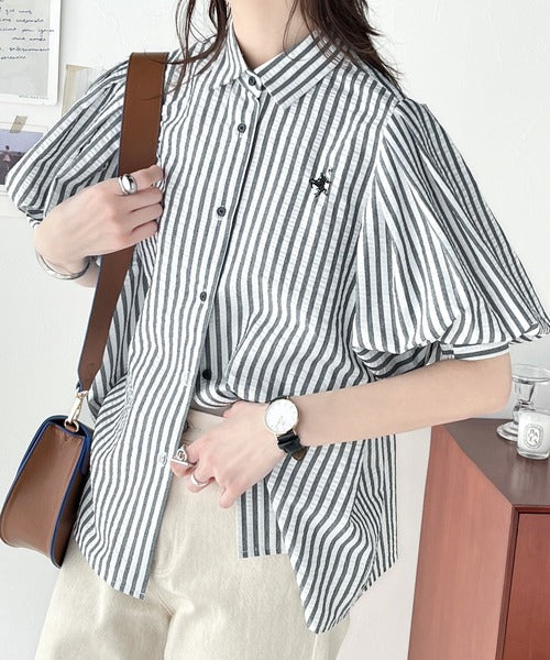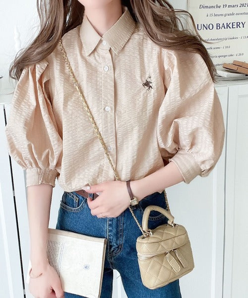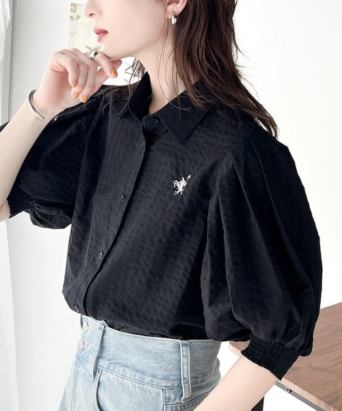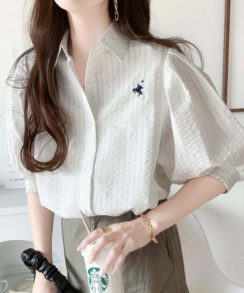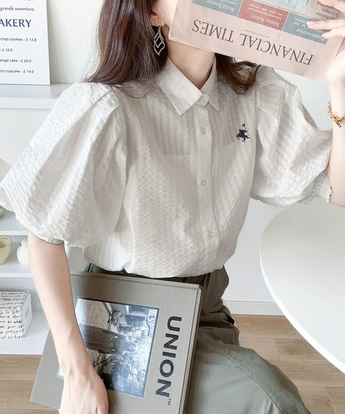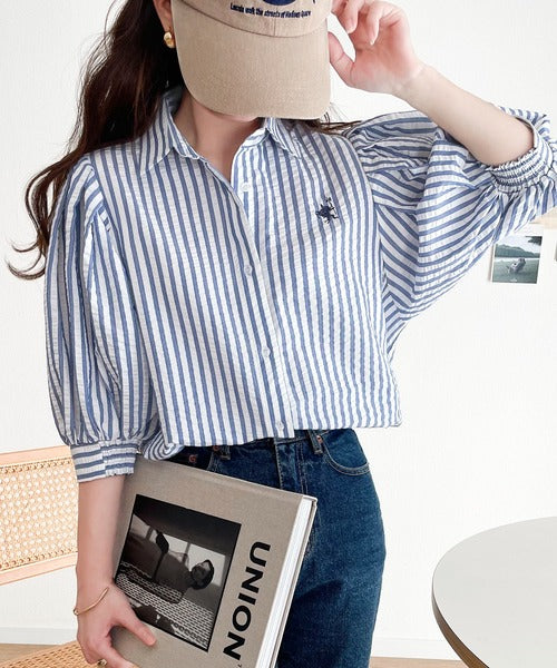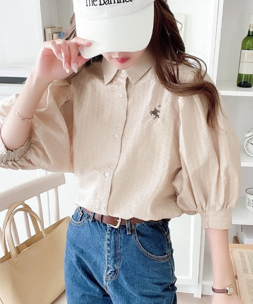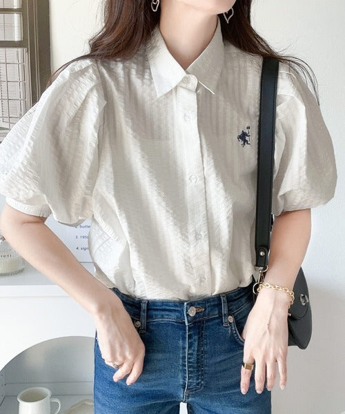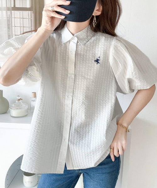 爽やかふんわりテイスト。タック入りボリュームスリーブ胸刺繍サッカーシャツ ce1020139