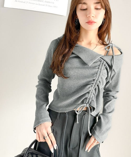 洗練されたアシンメトリーデザインで、トレンド感を兼ね備えたトップス。