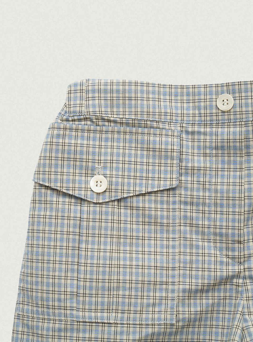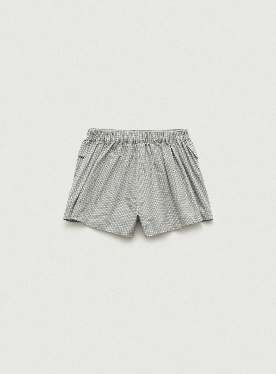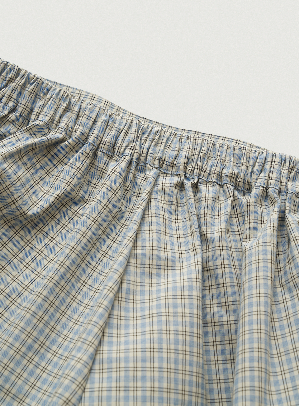 チェック配色パターンと太もも中間丈のショーツタイプ
