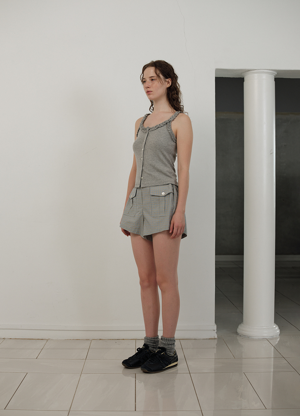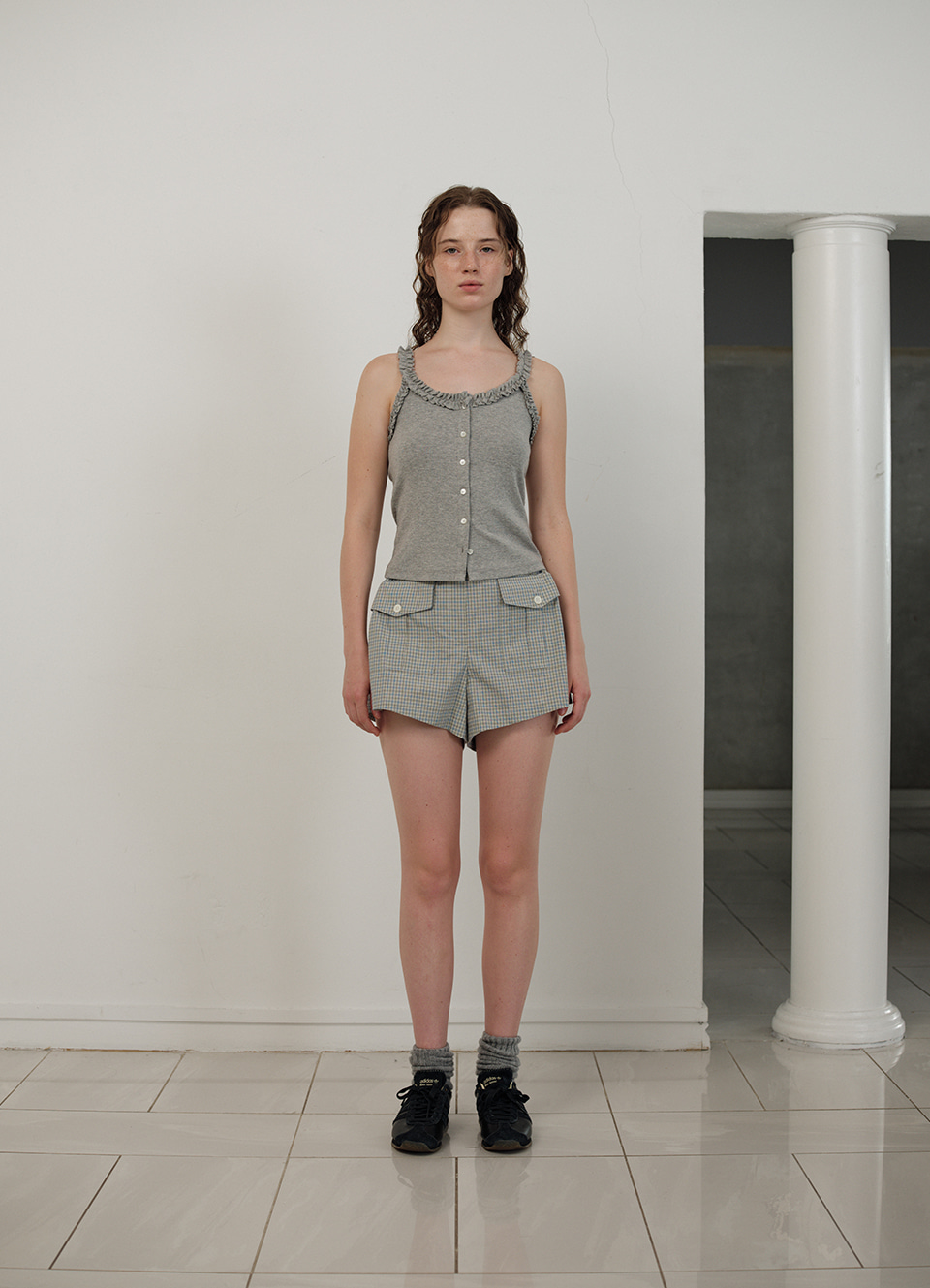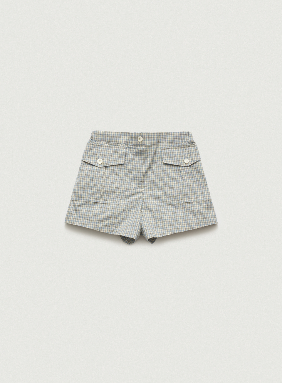 チェック配色パターンと太もも中間丈のショーツタイプ