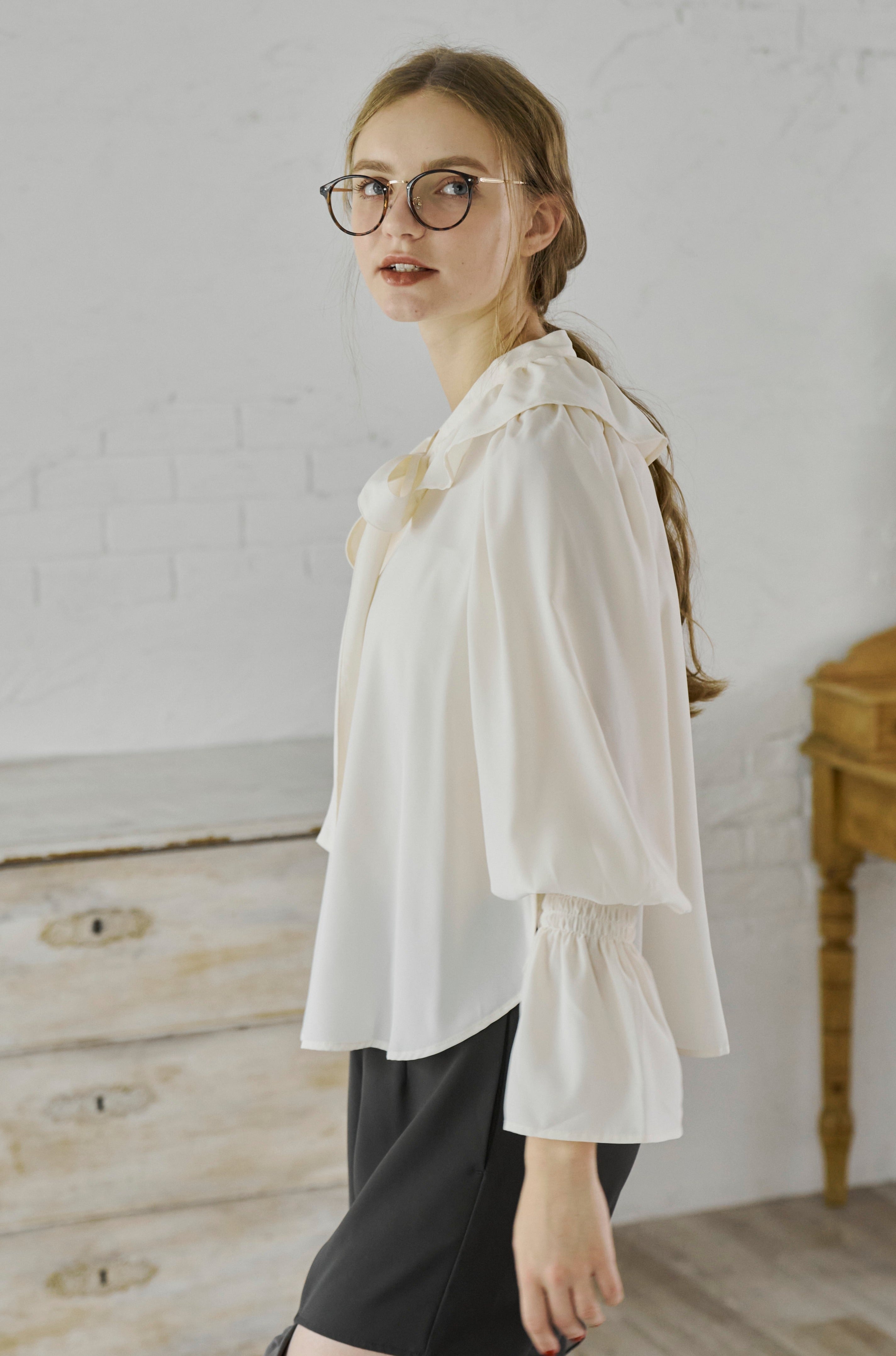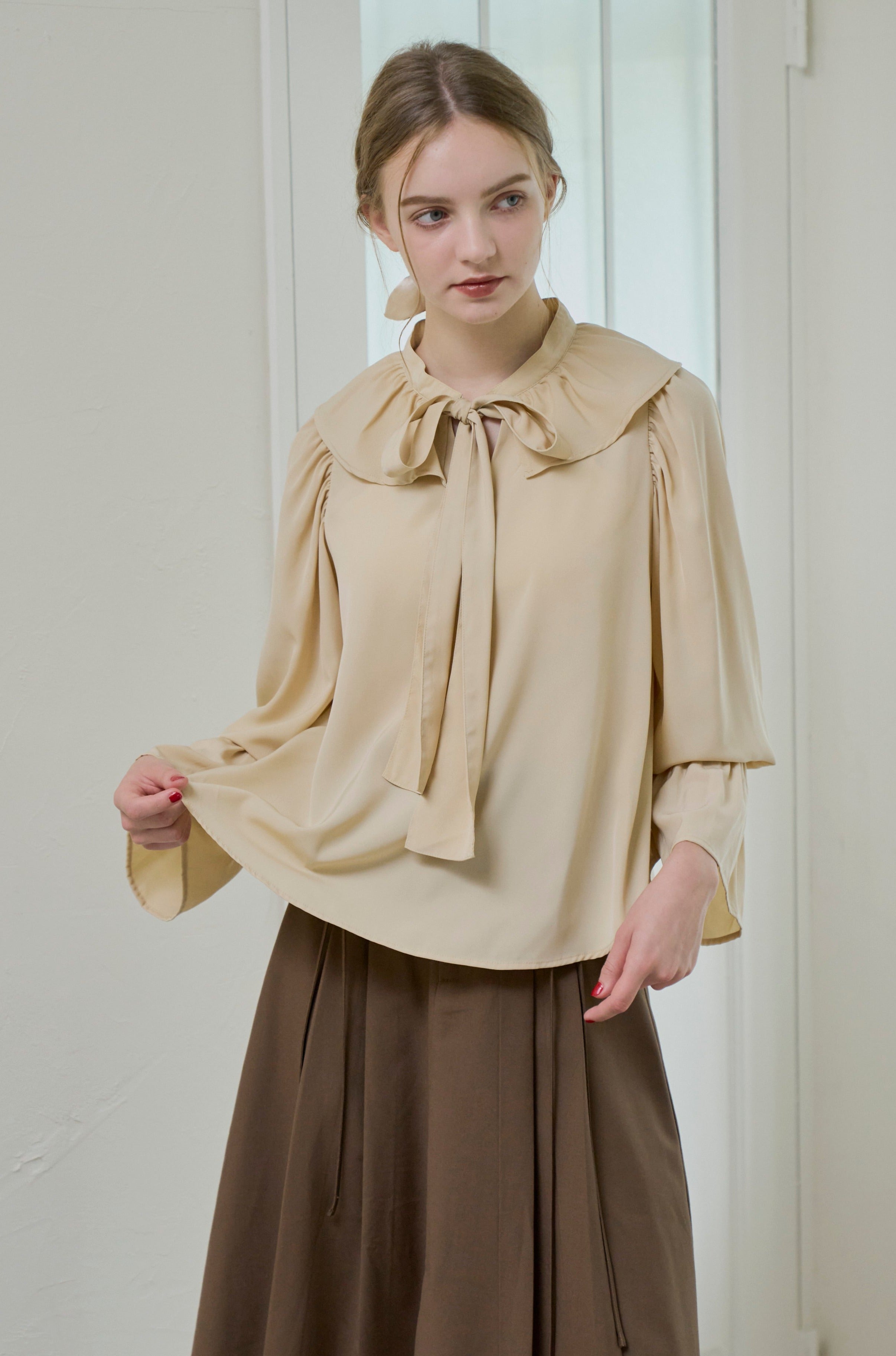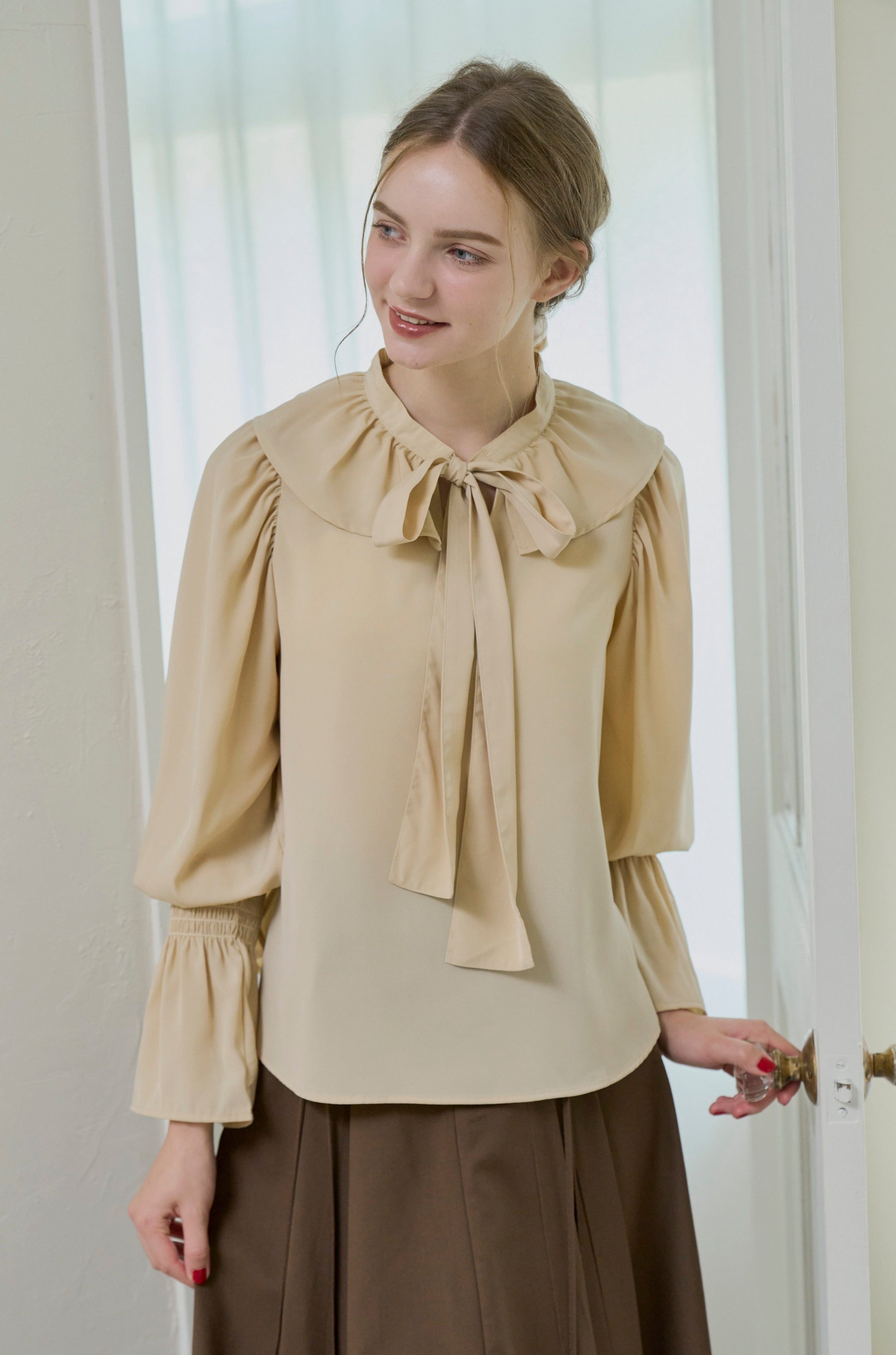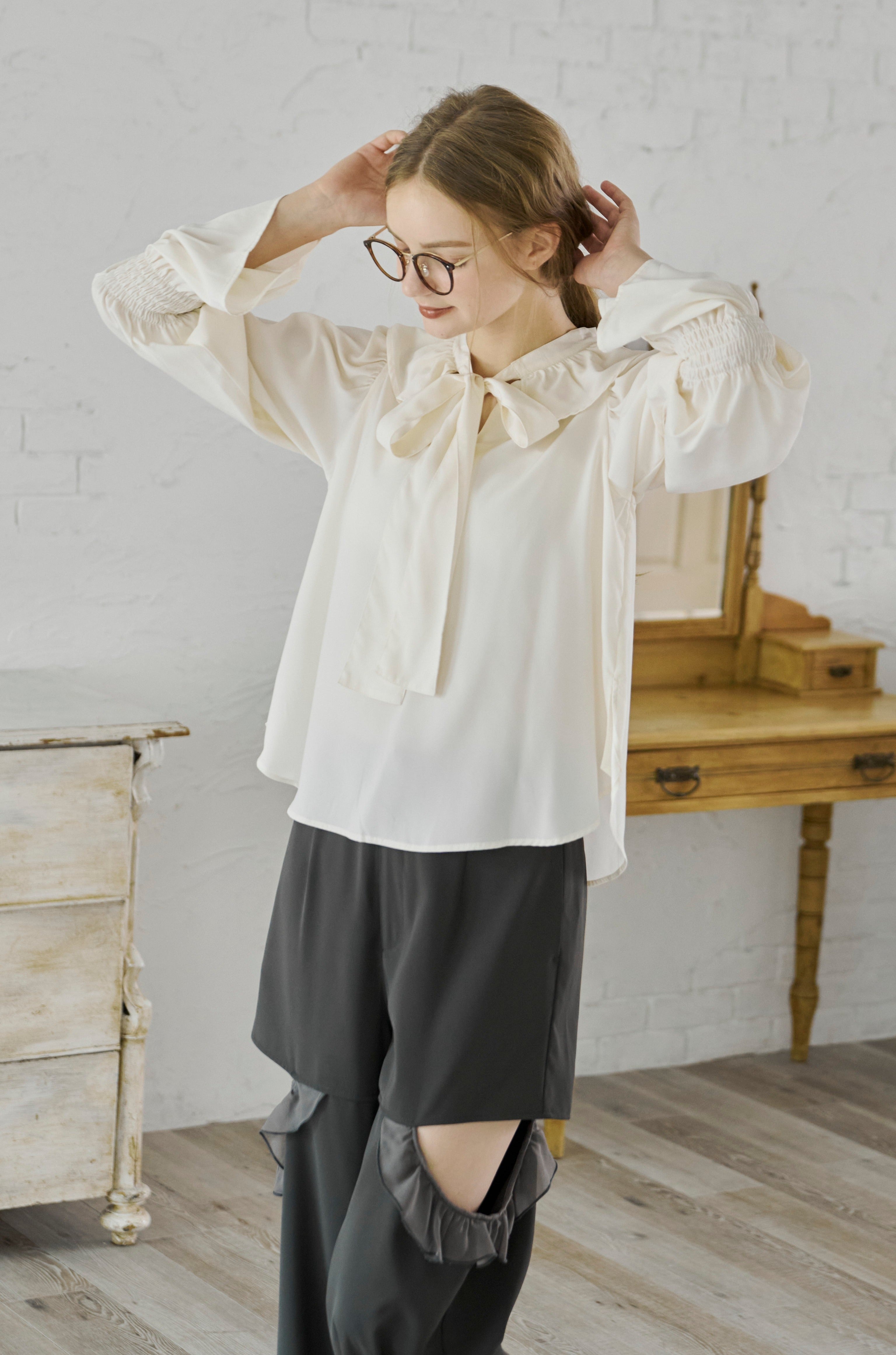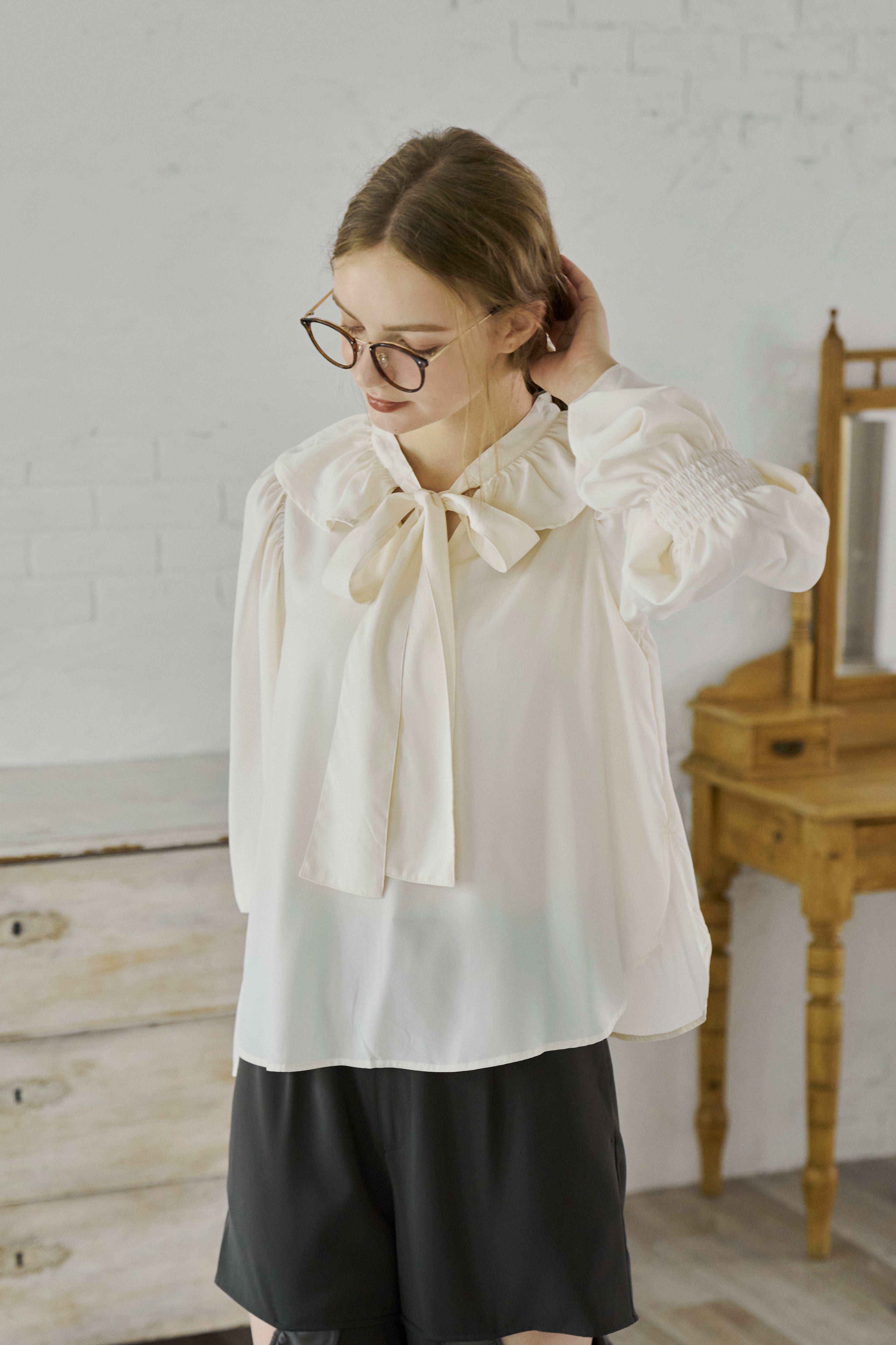 フリル襟と大きなリボンが印象的なボウタイブラウス。