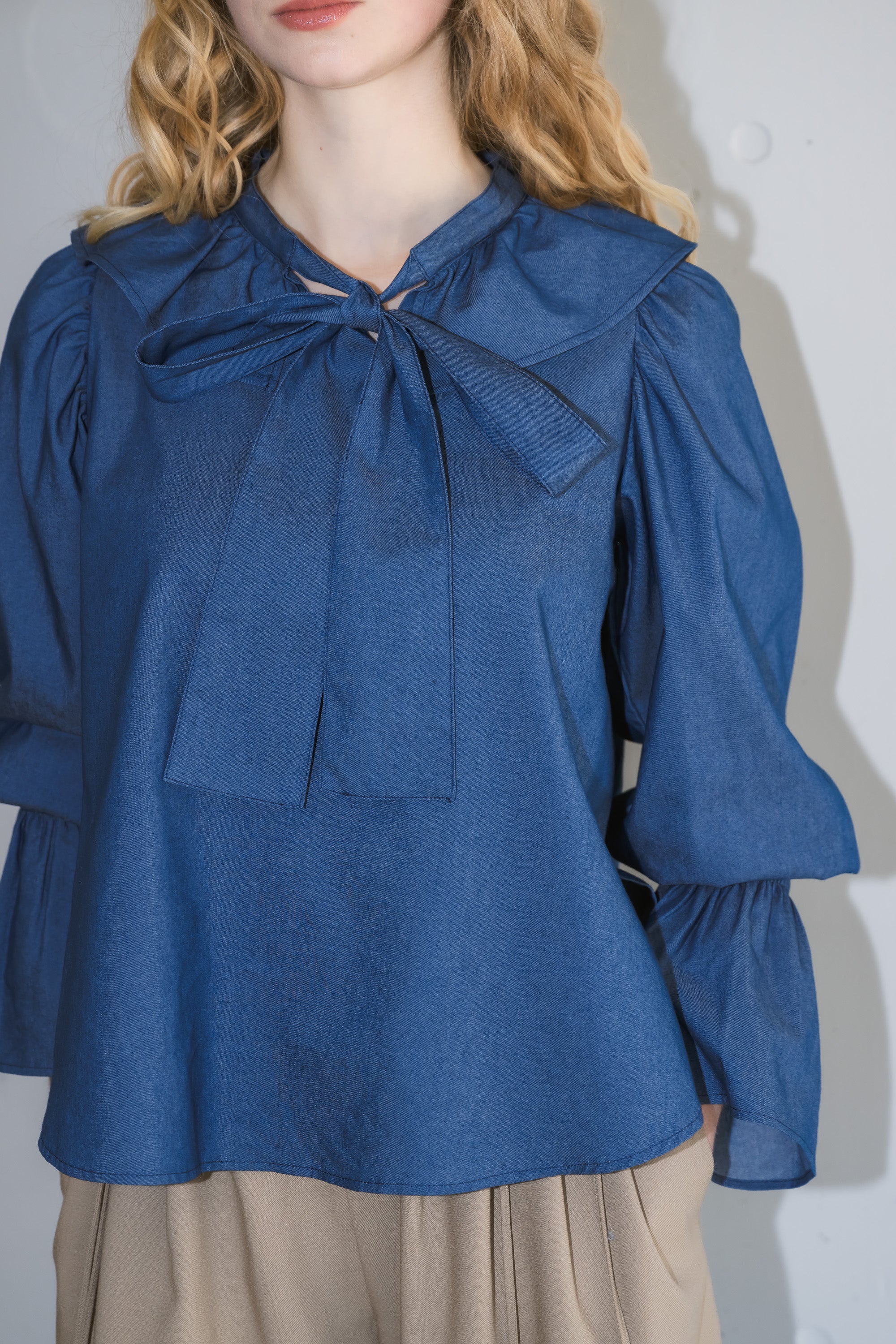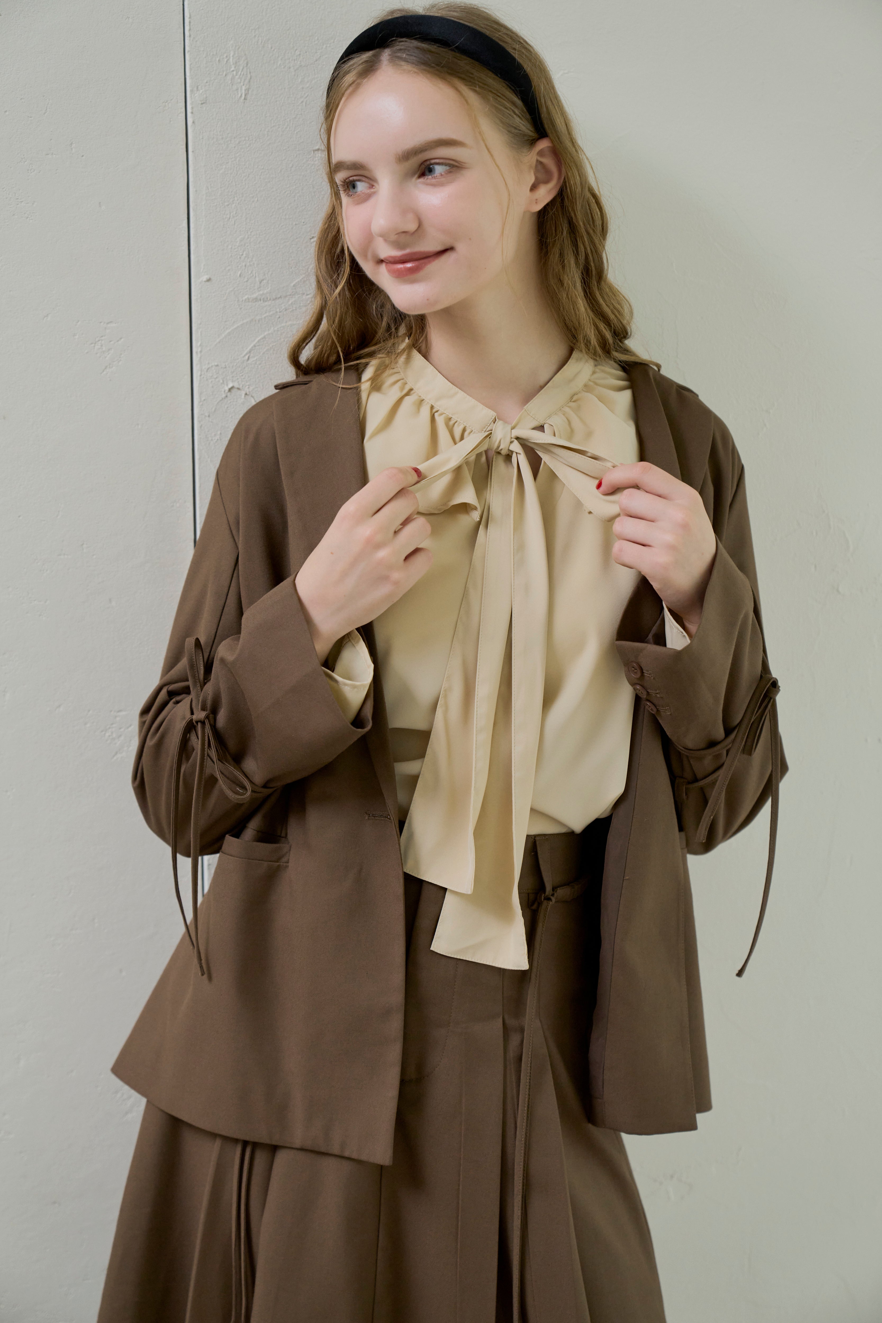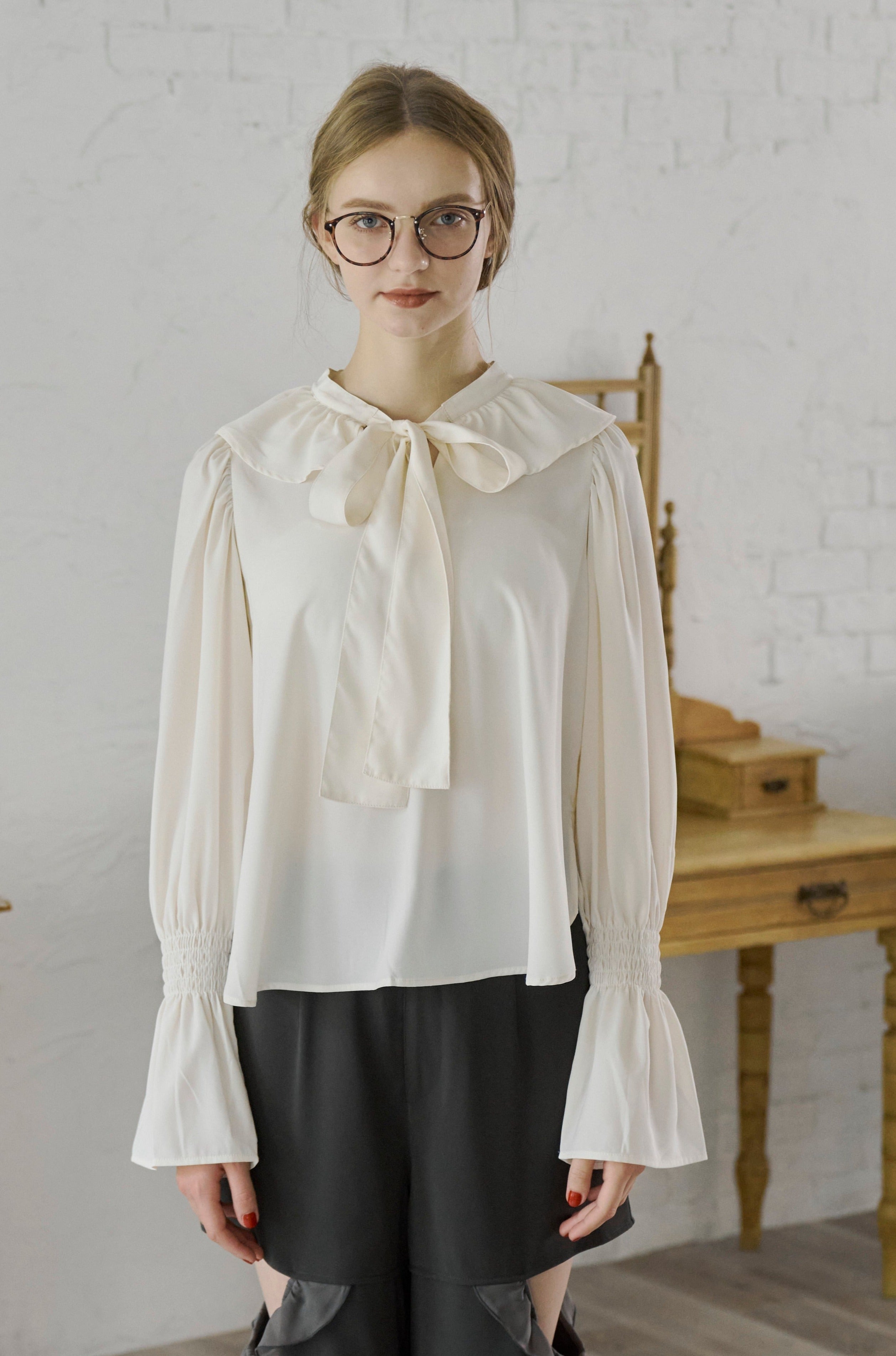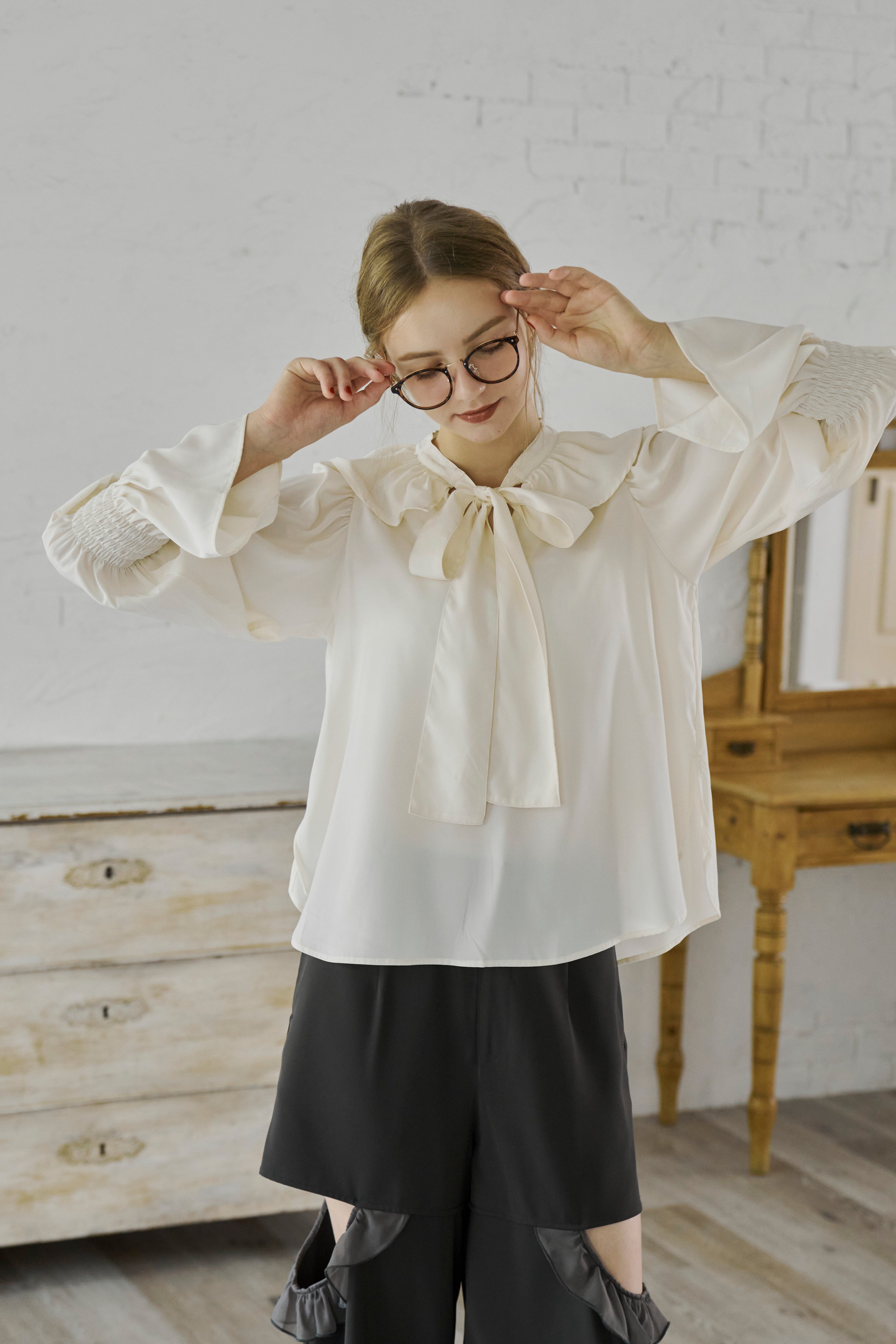 フリル襟と大きなリボンが印象的なボウタイブラウス。