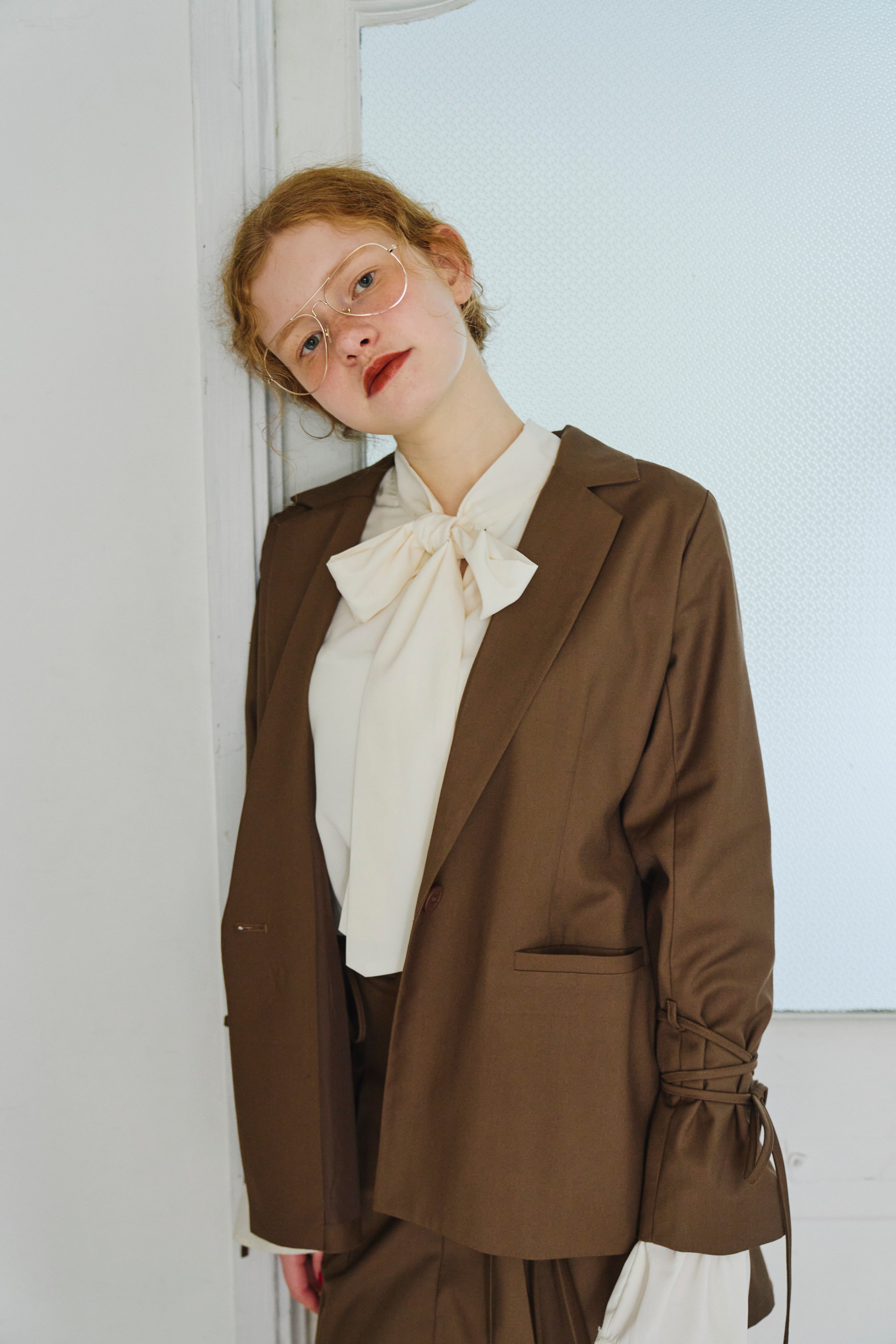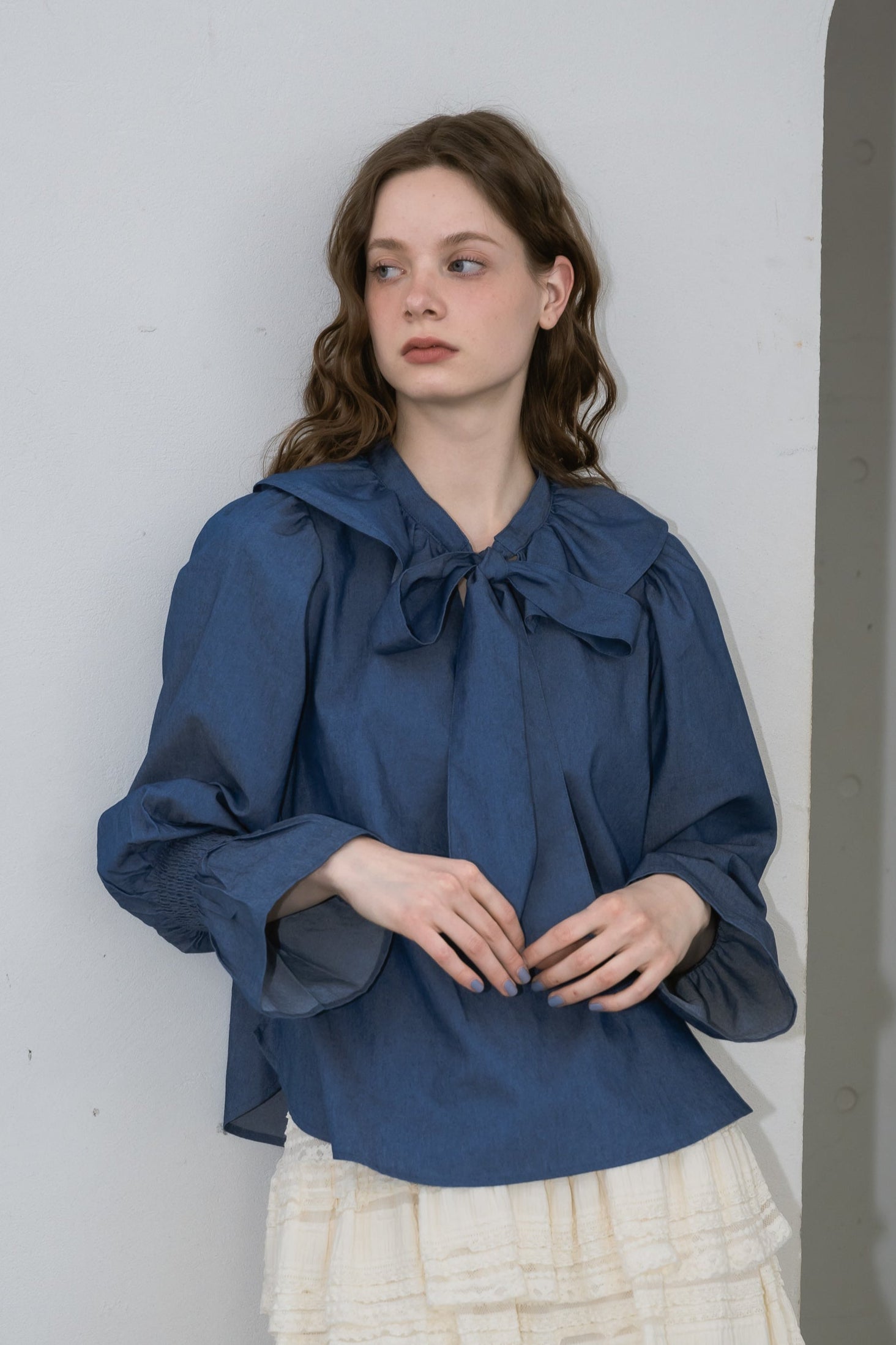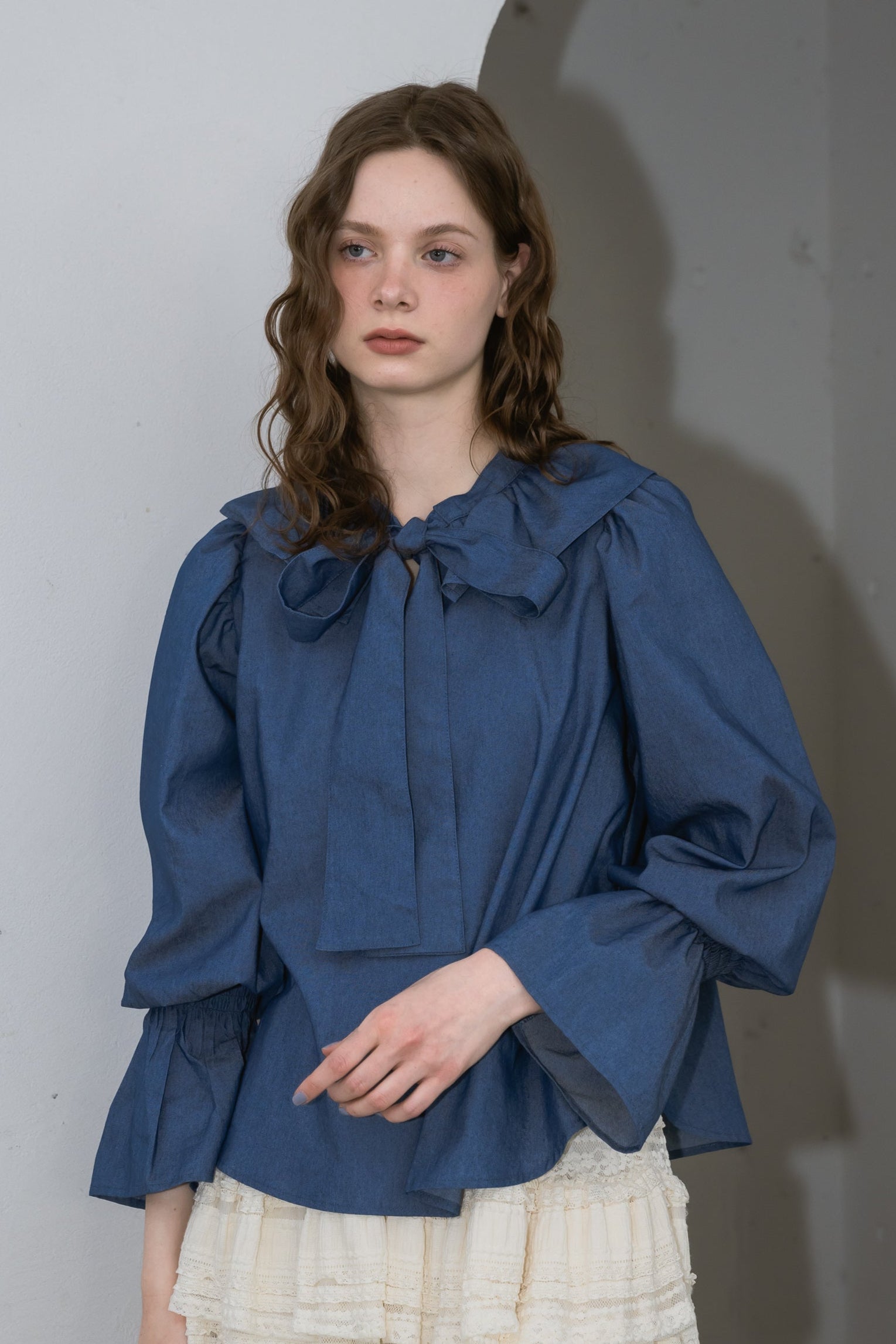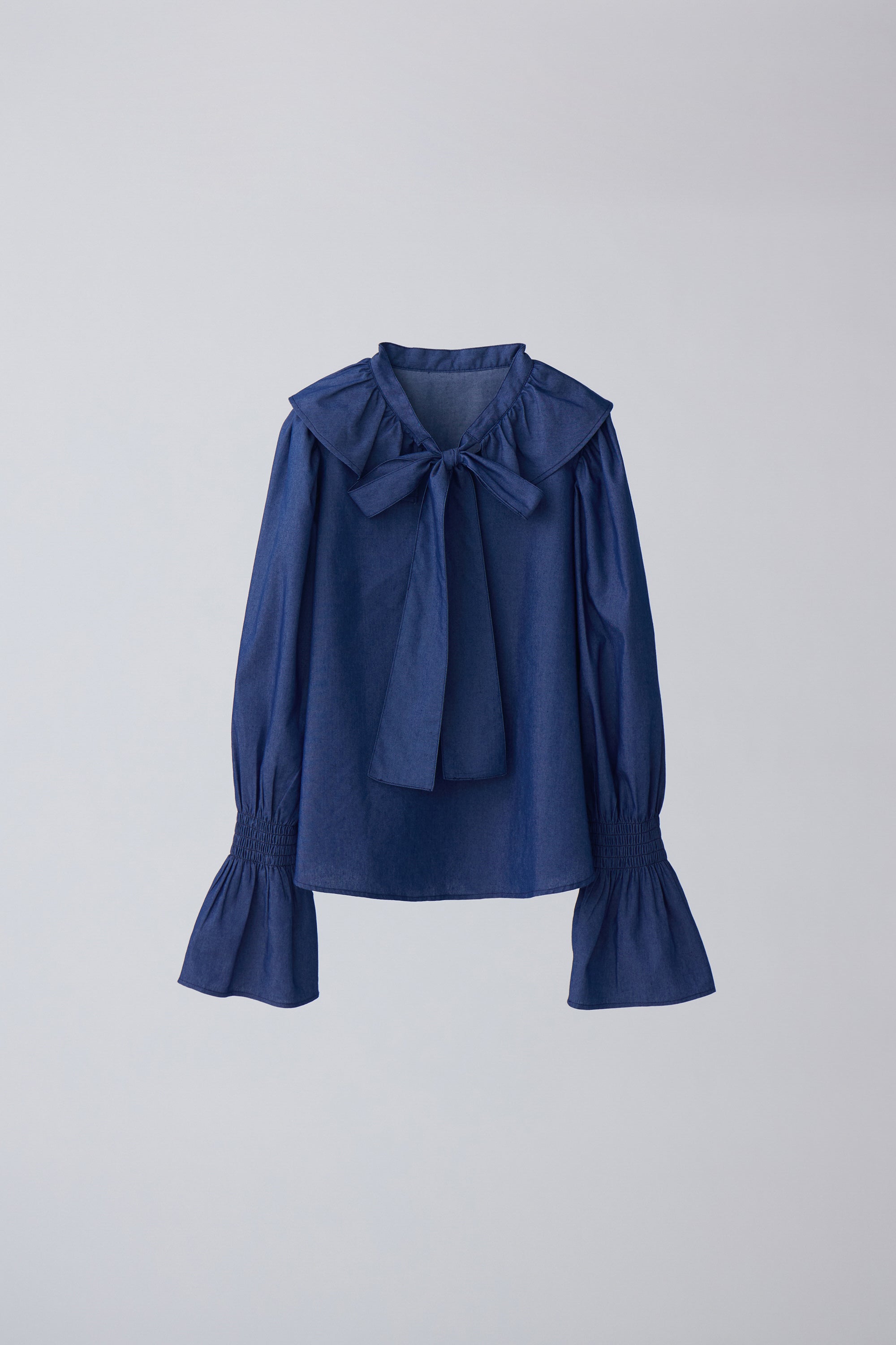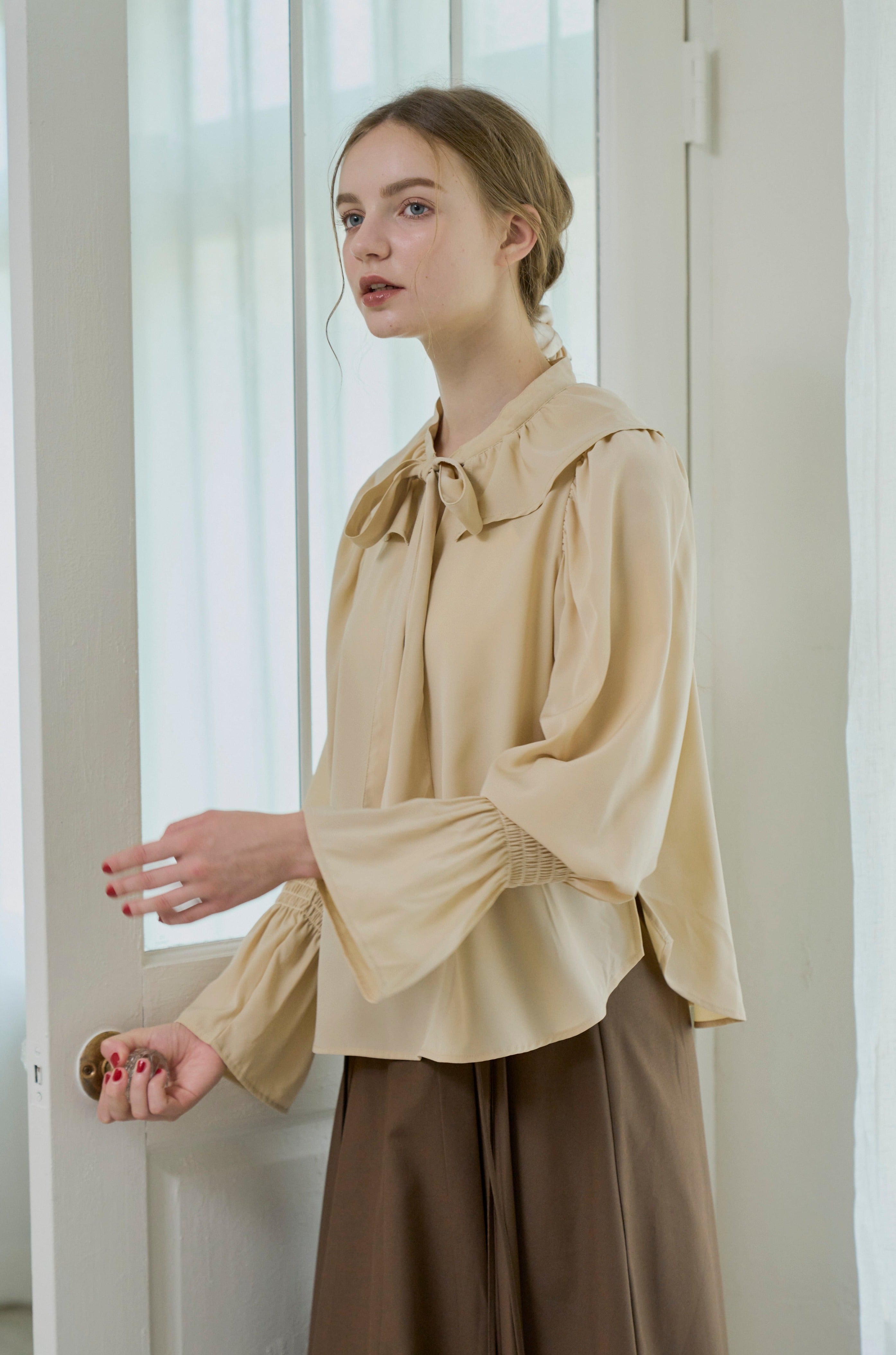 フリル襟と大きなリボンが印象的なボウタイブラウス。