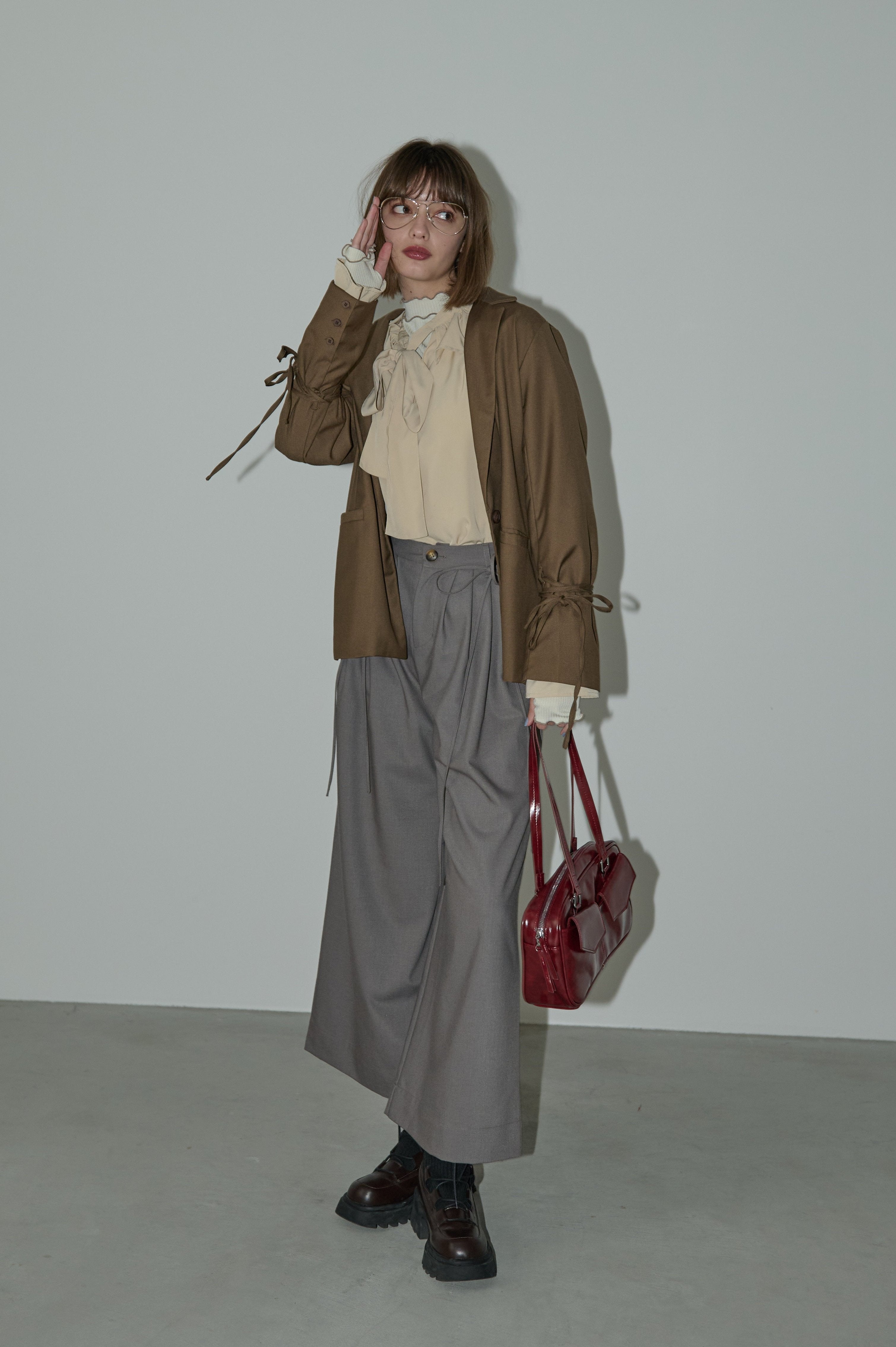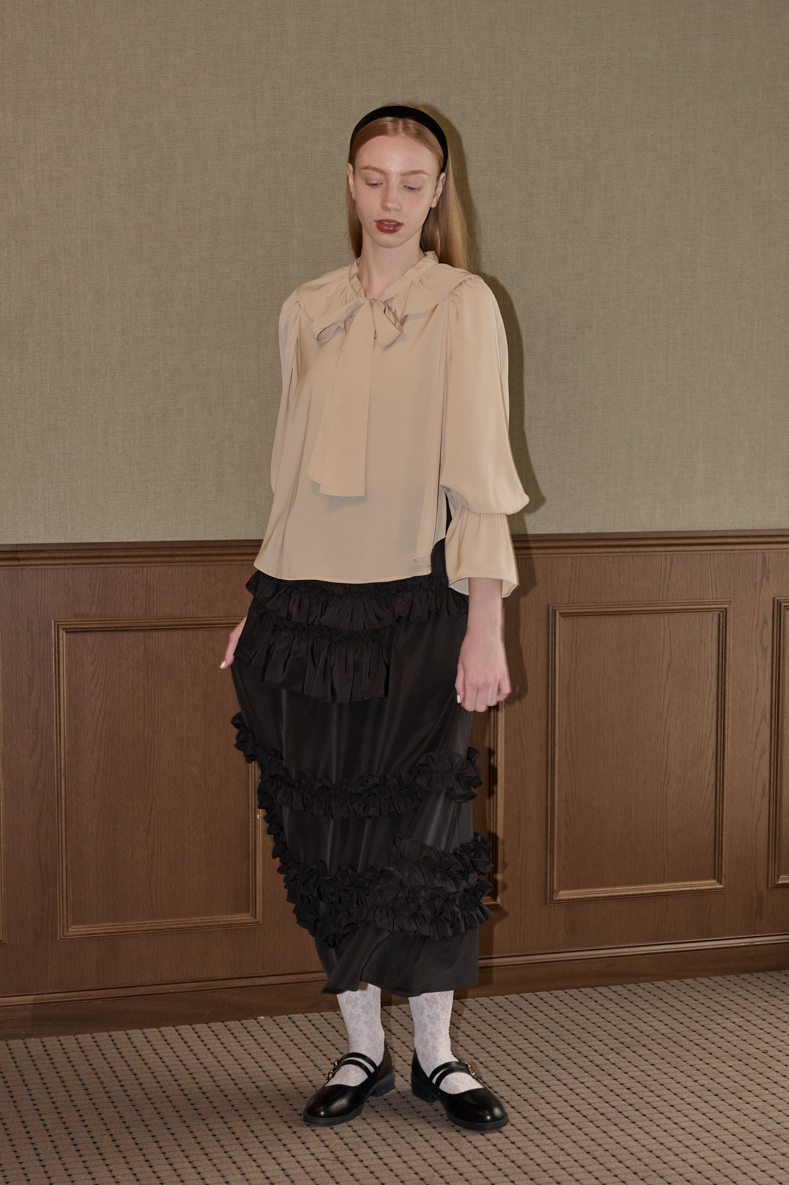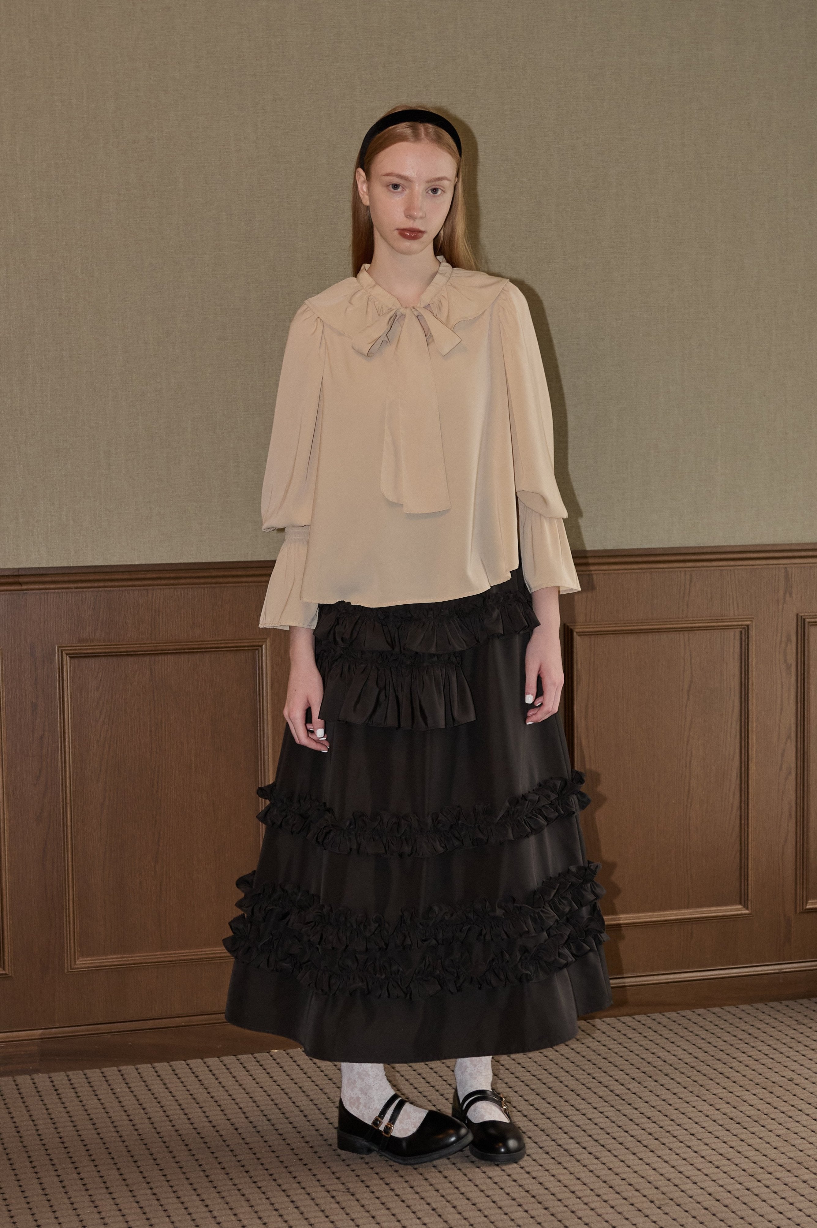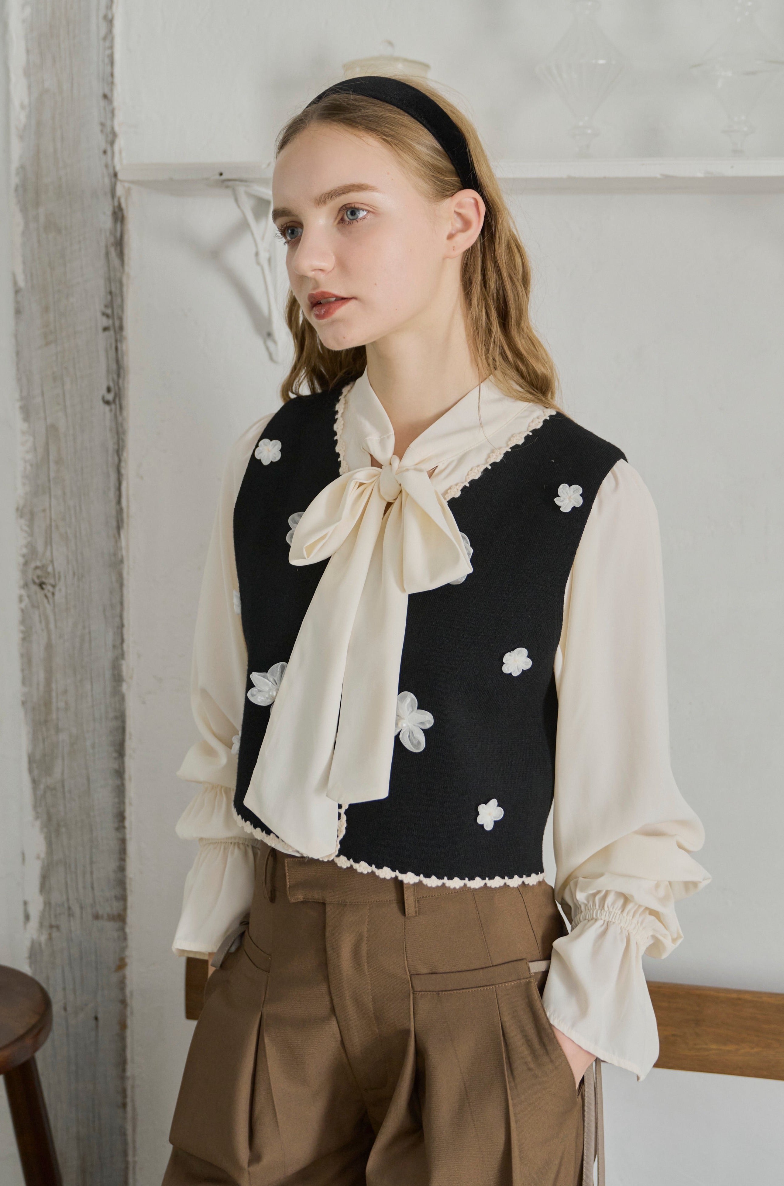 フリル襟と大きなリボンが印象的なボウタイブラウス。