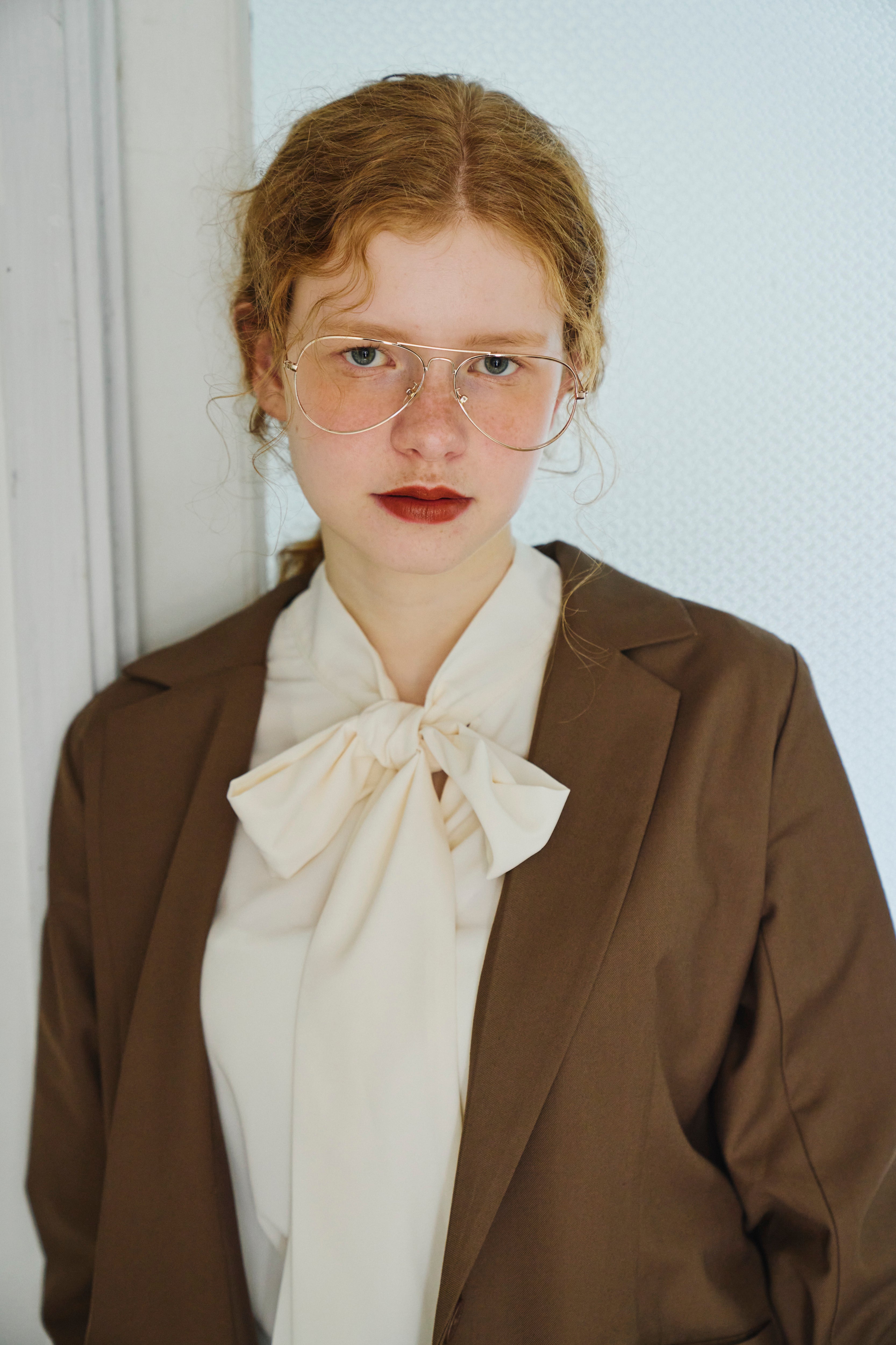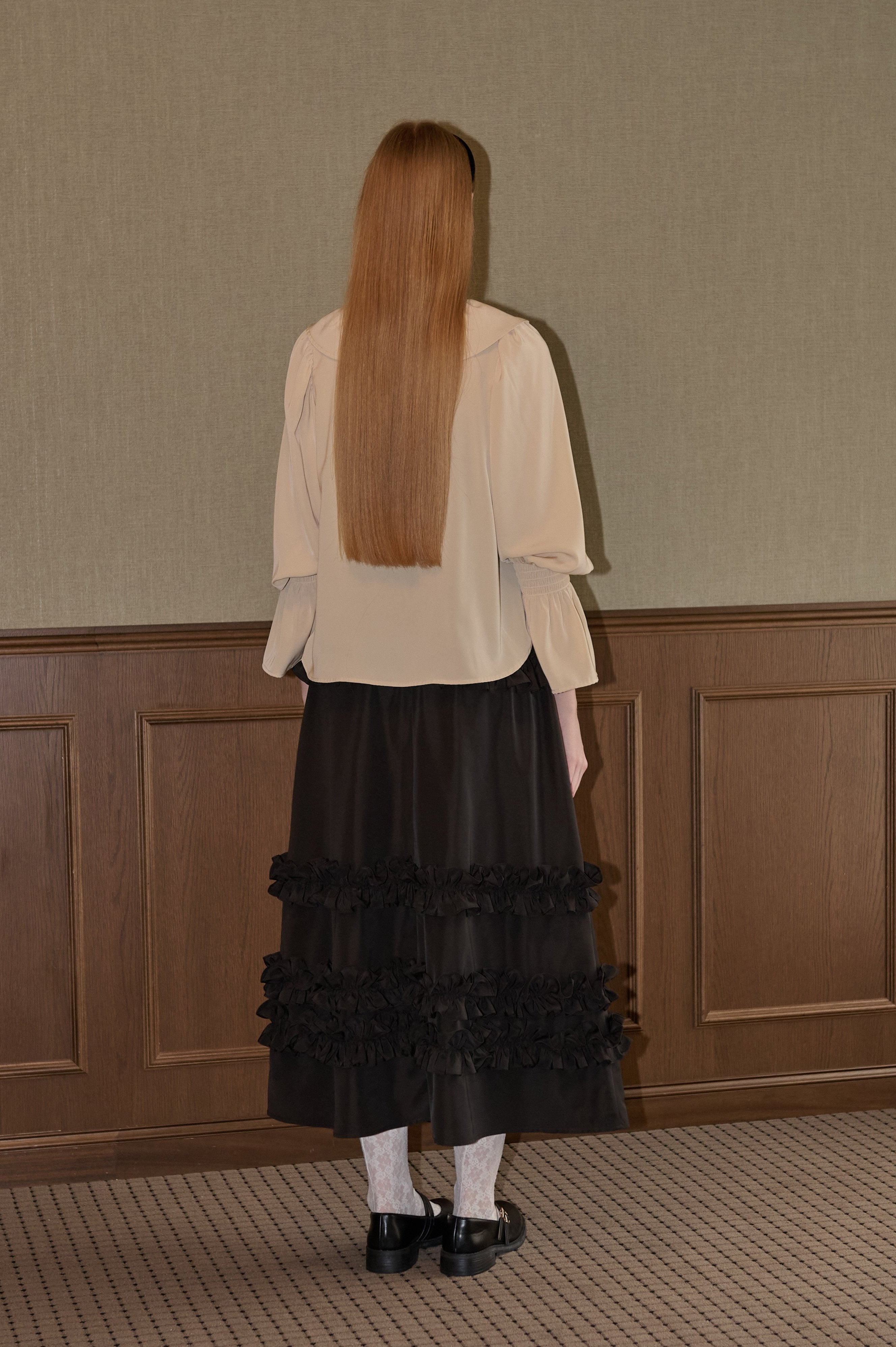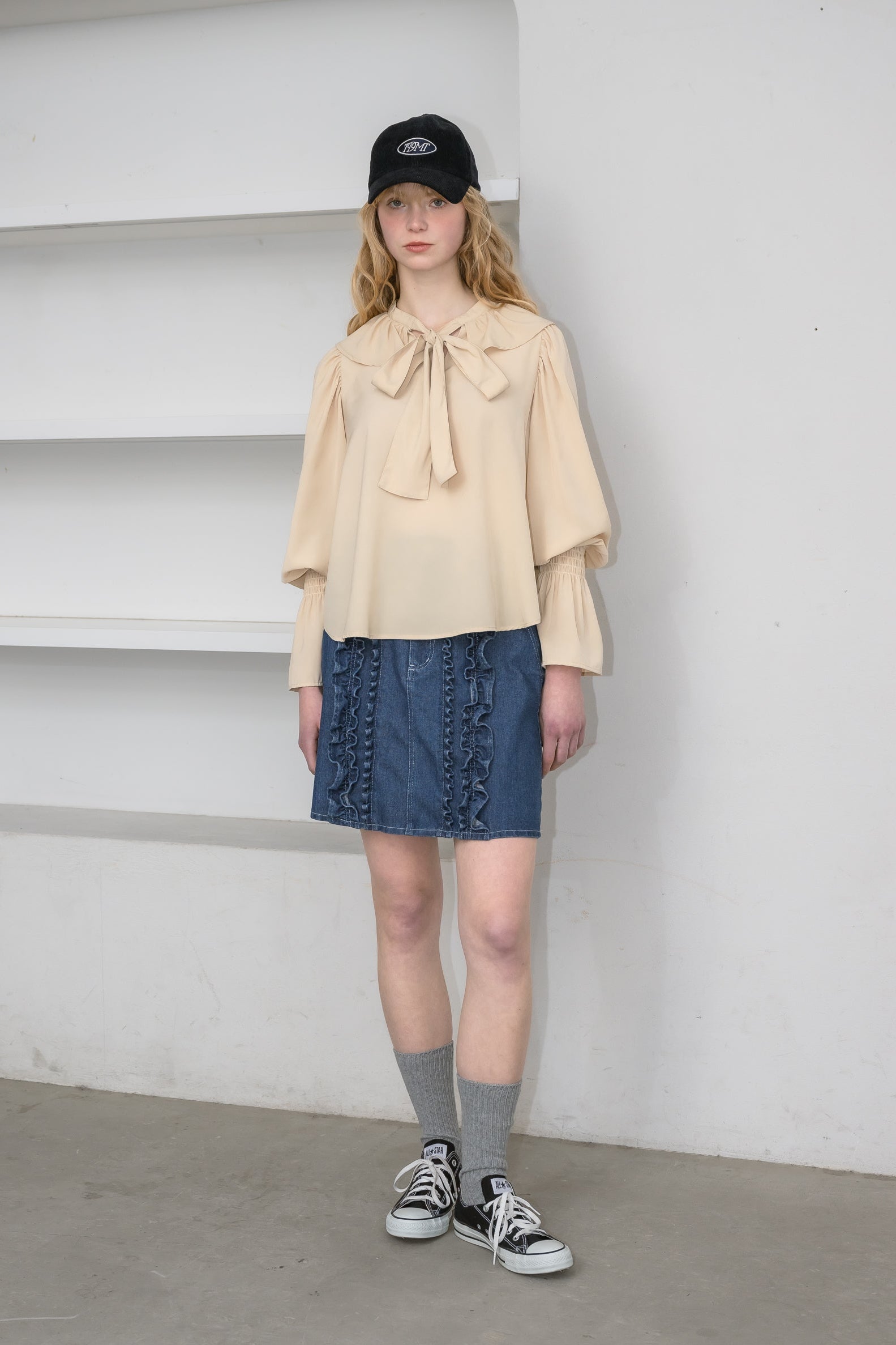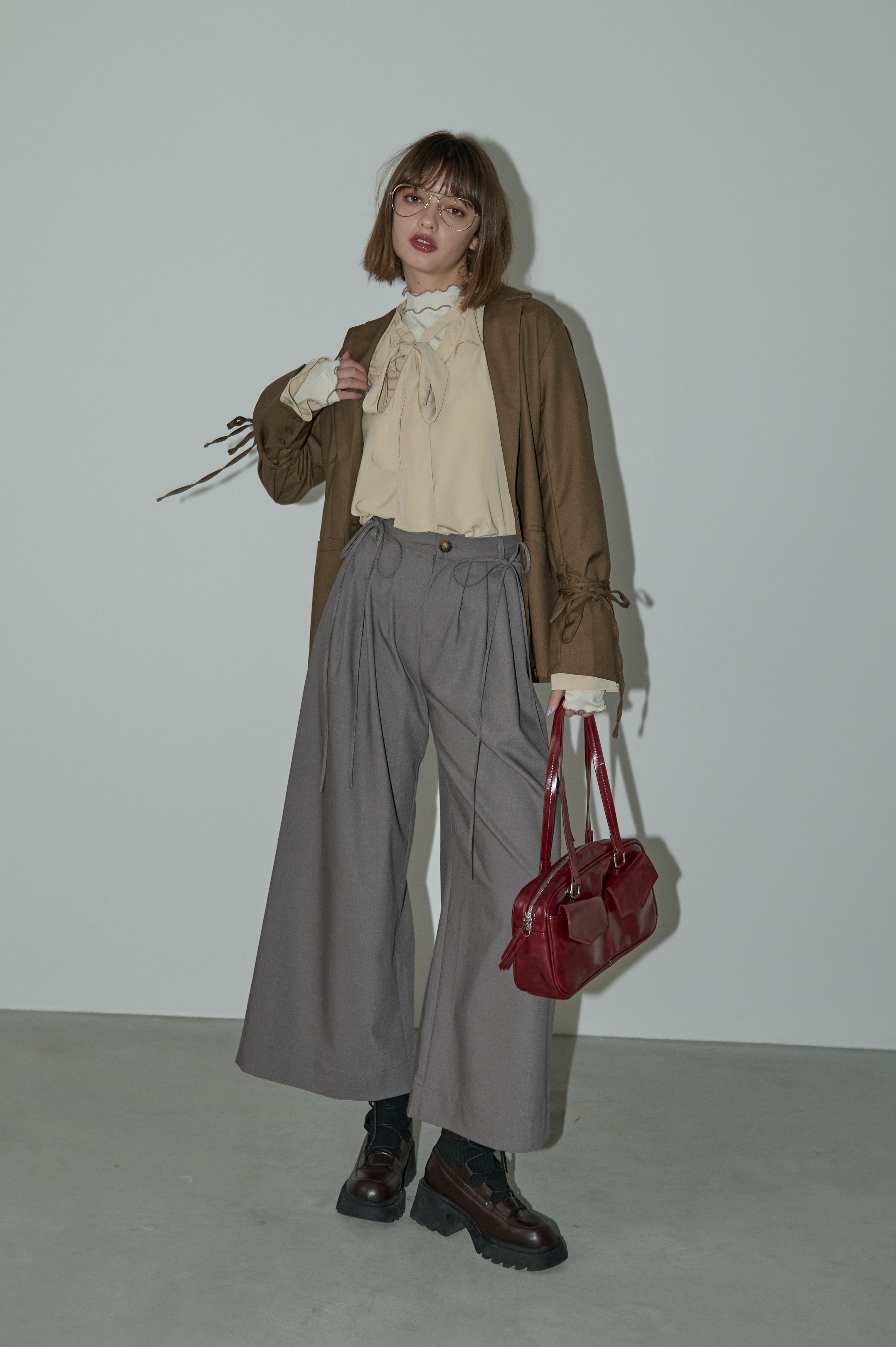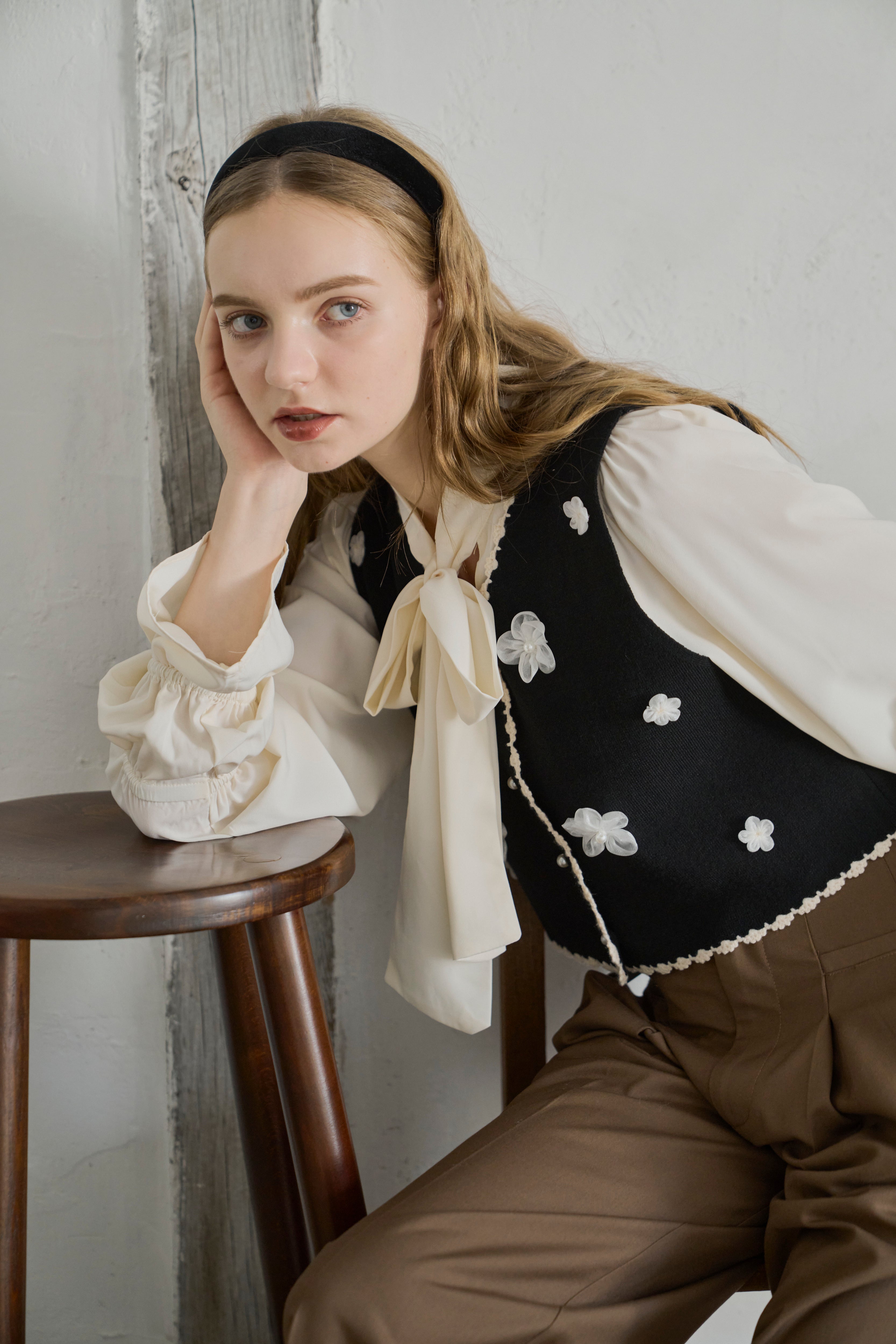 フリル襟と大きなリボンが印象的なボウタイブラウス。
