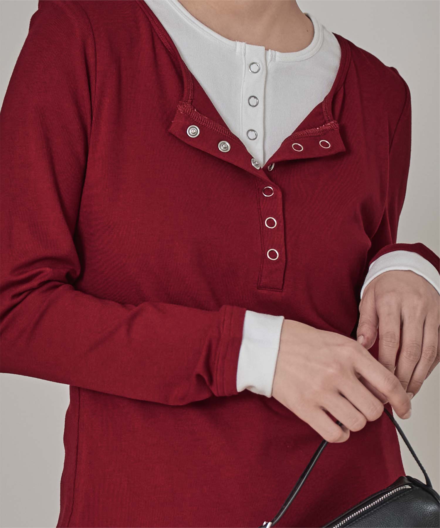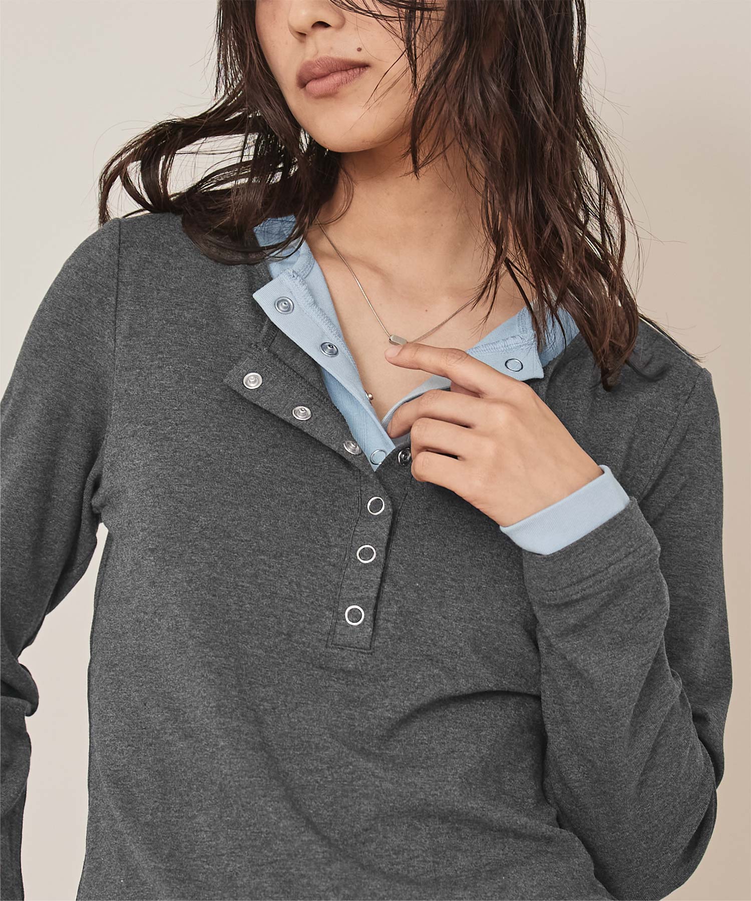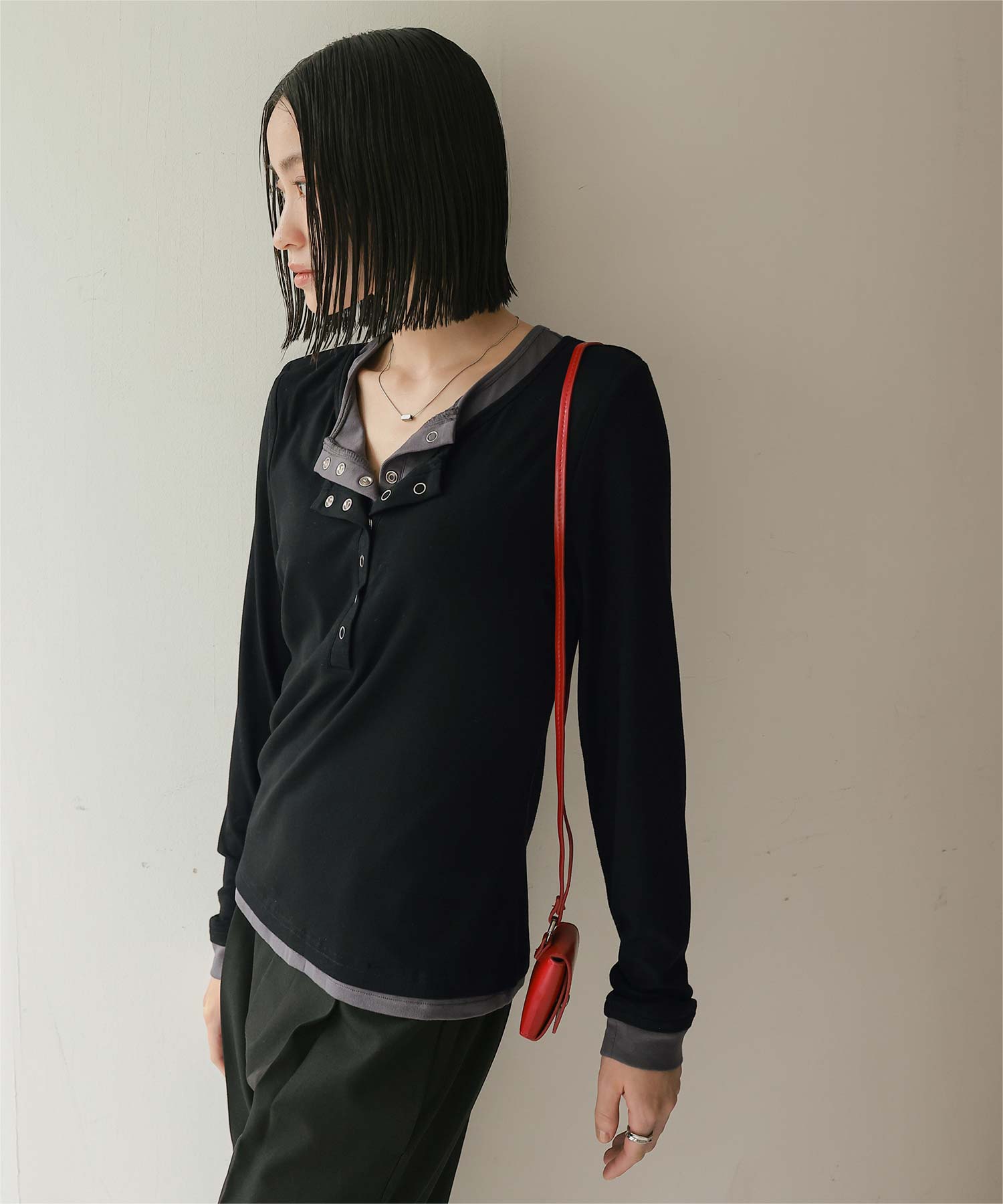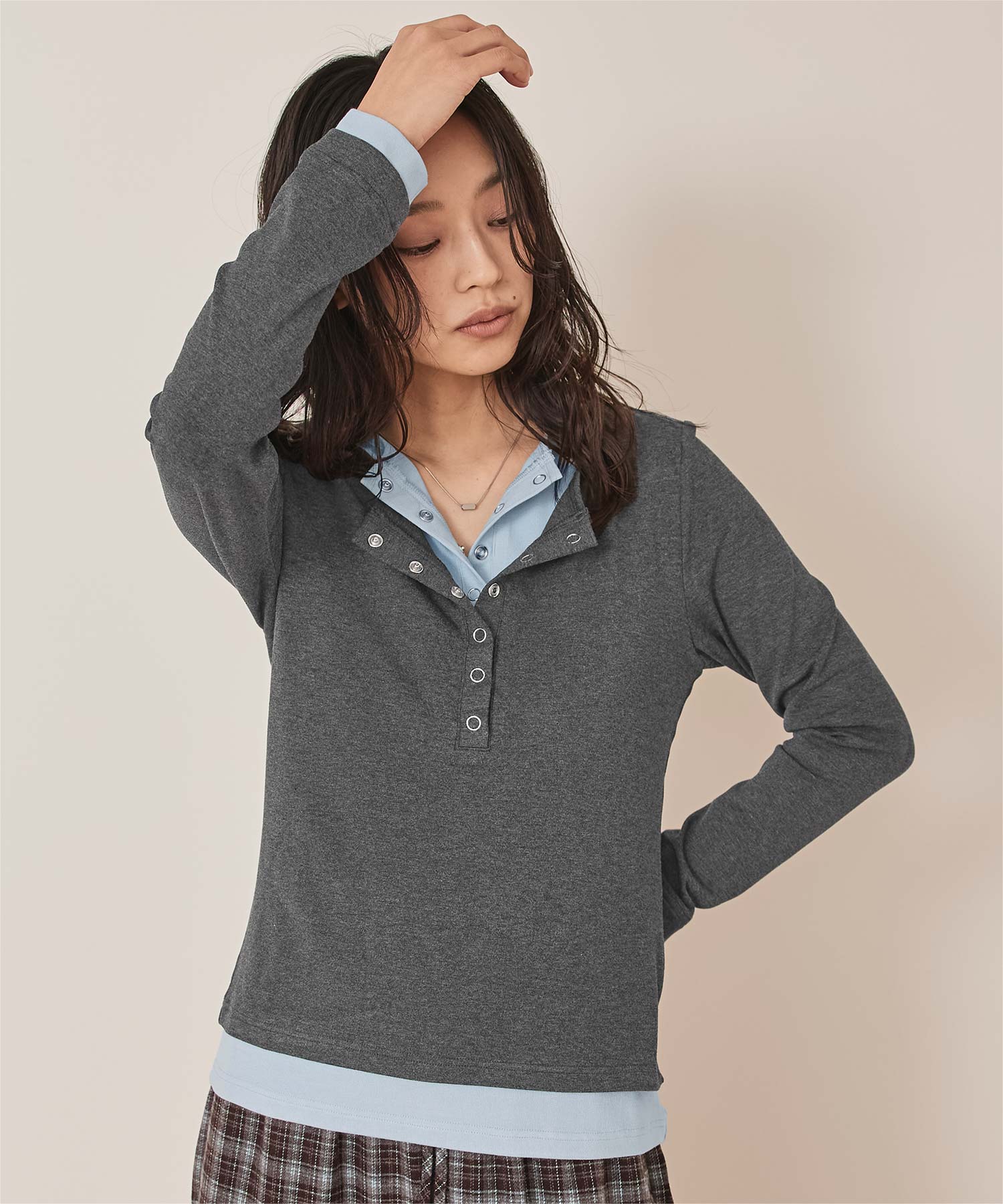 ・レイヤードスタイルを1枚で楽しめる、ヘンリーネックのトップス。
