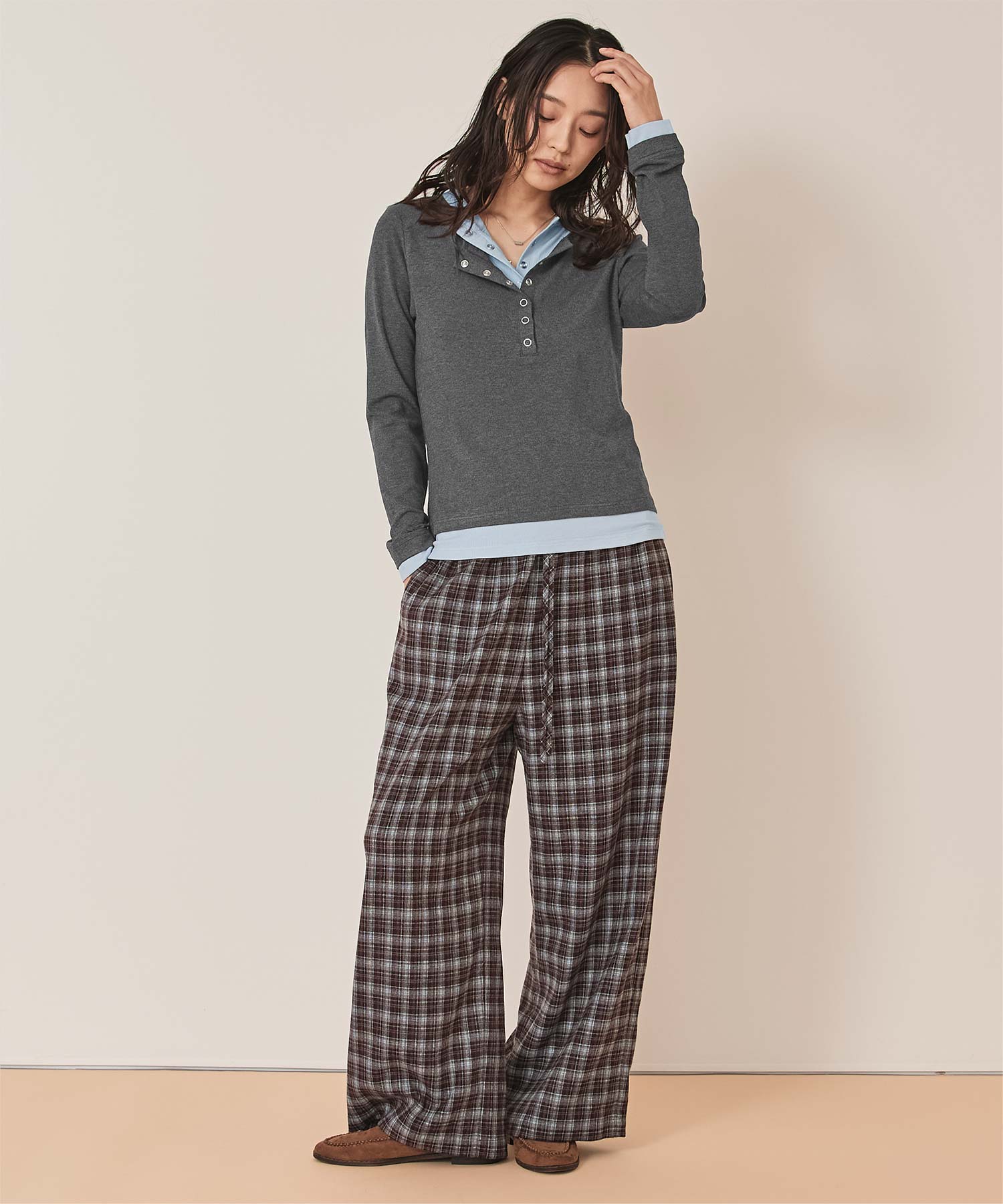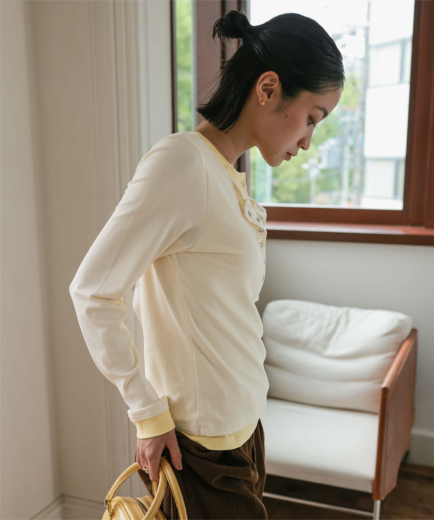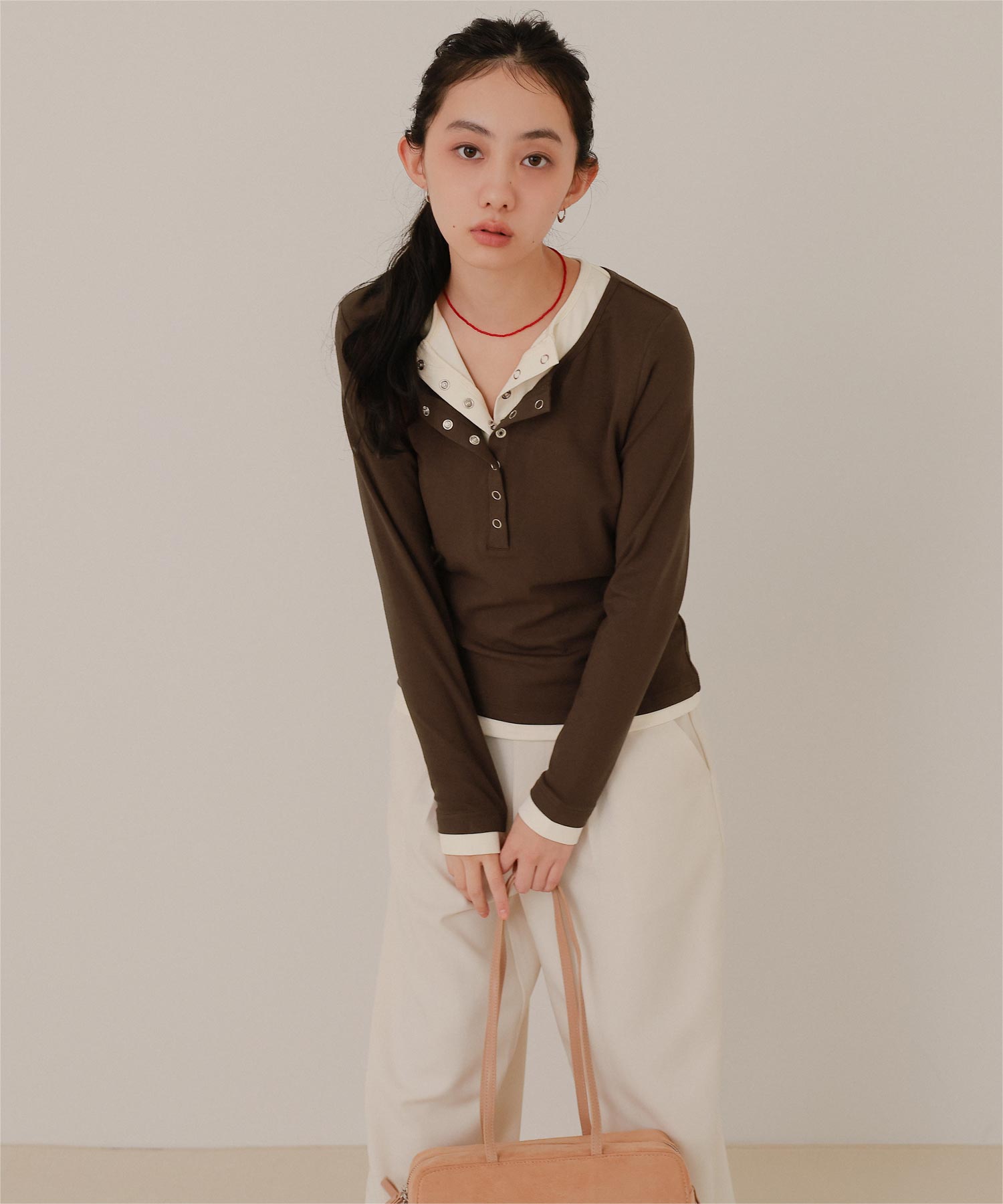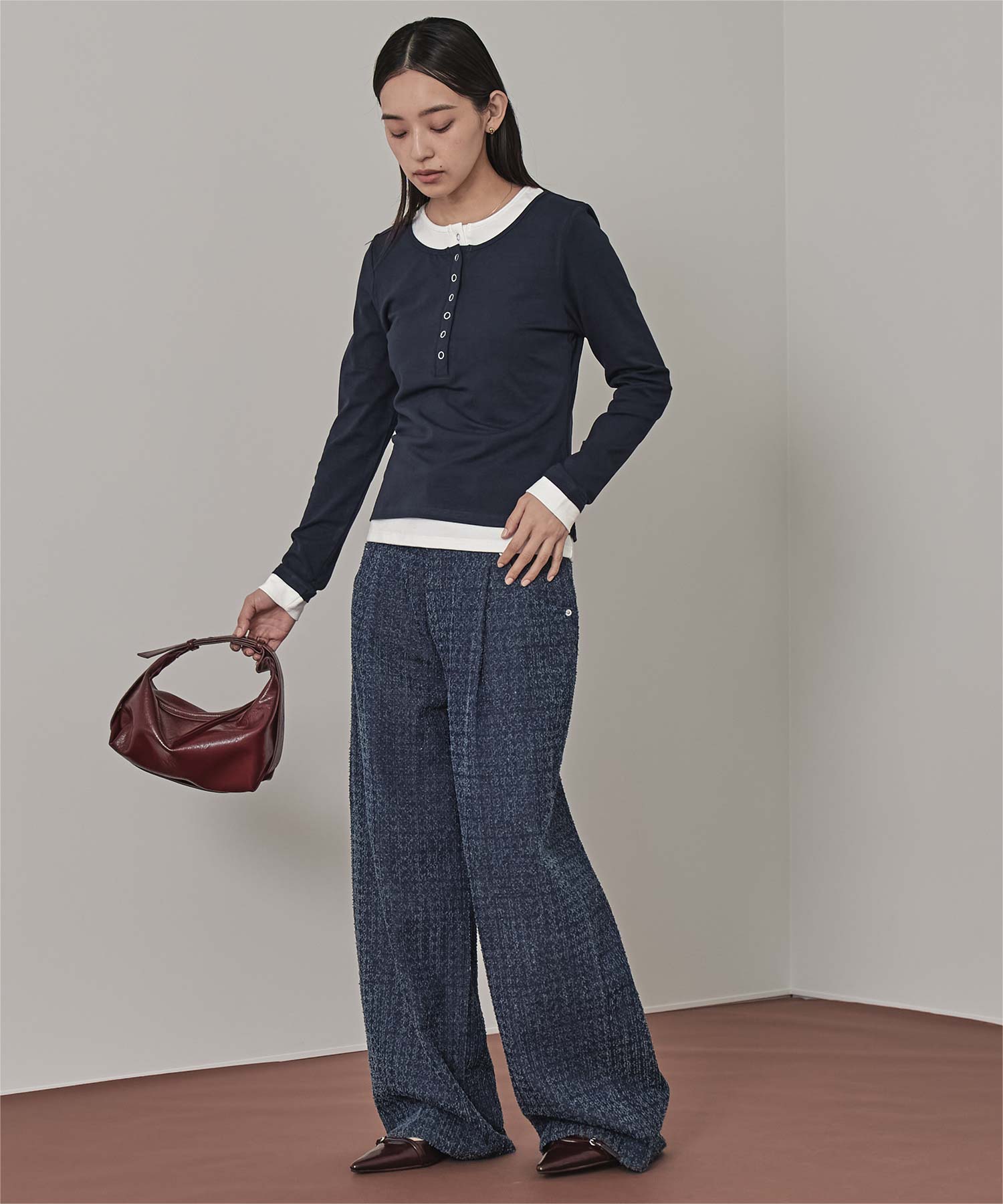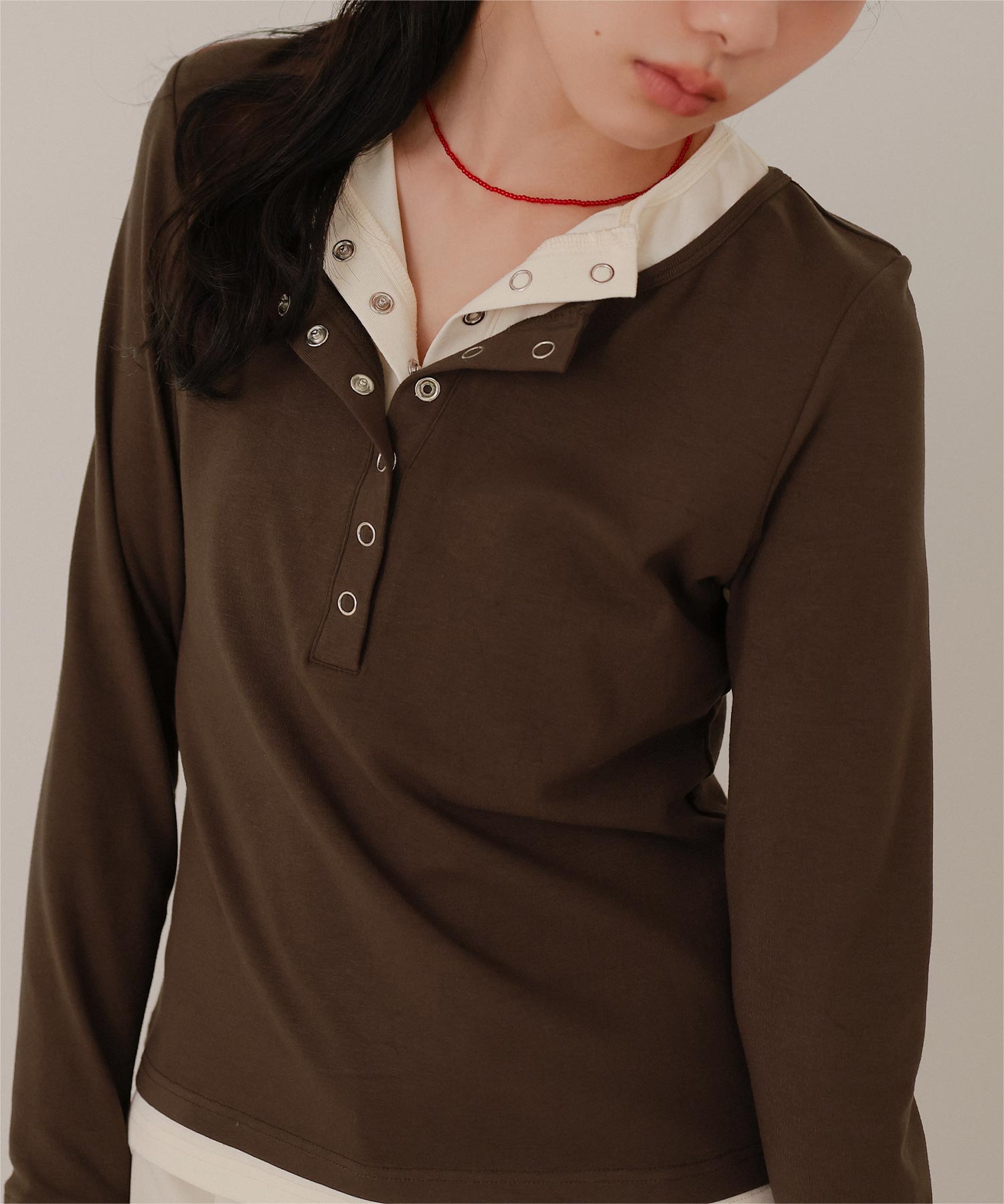 ・レイヤードスタイルを1枚で楽しめる、ヘンリーネックのトップス。