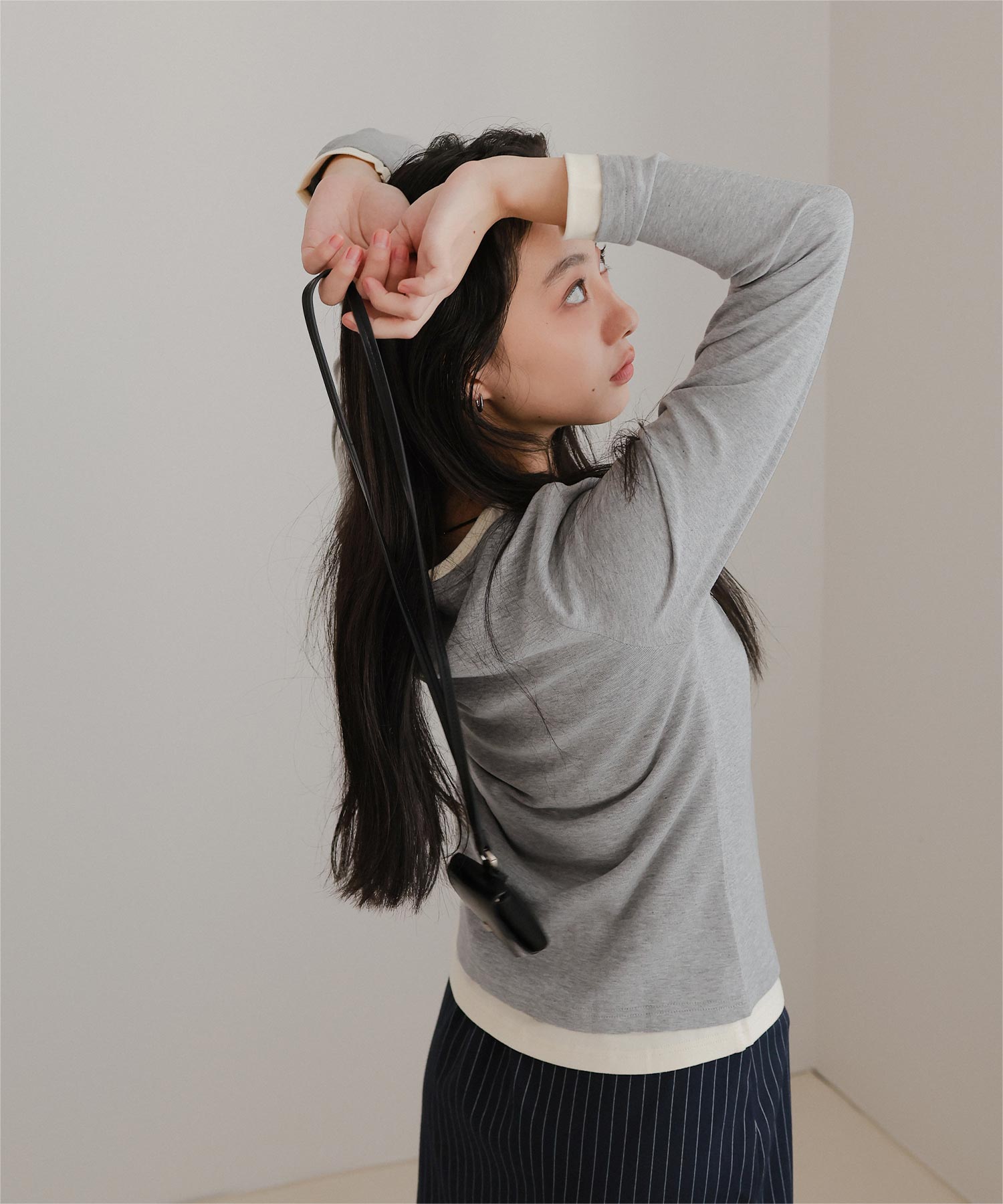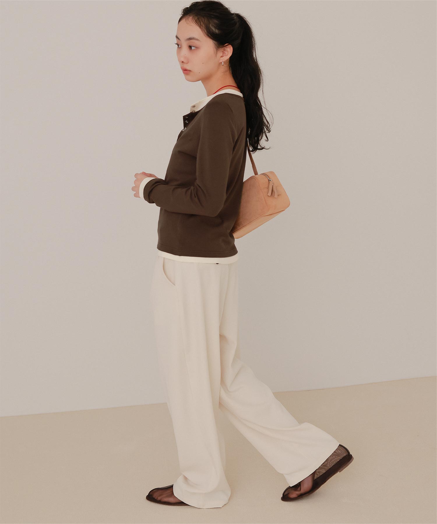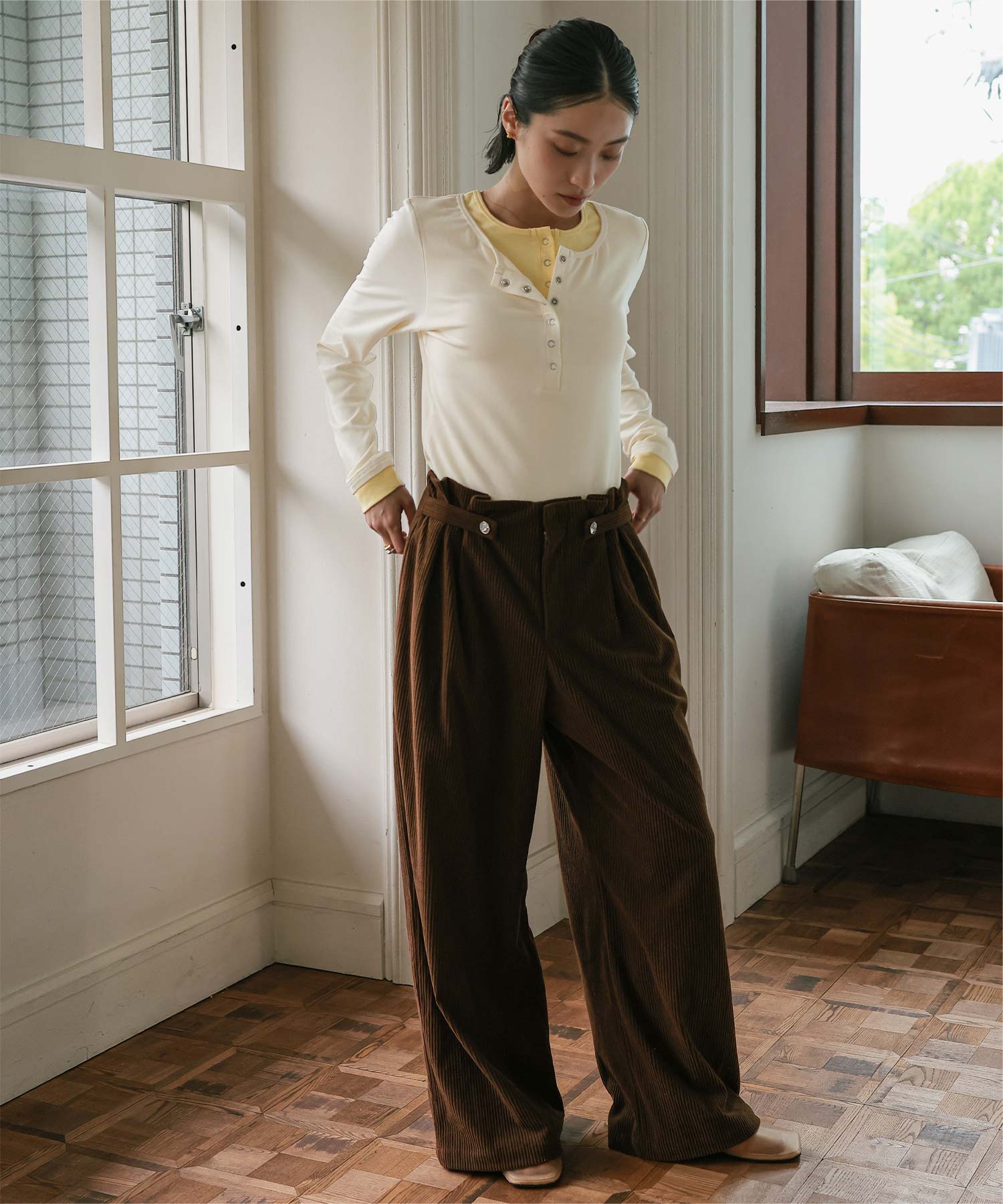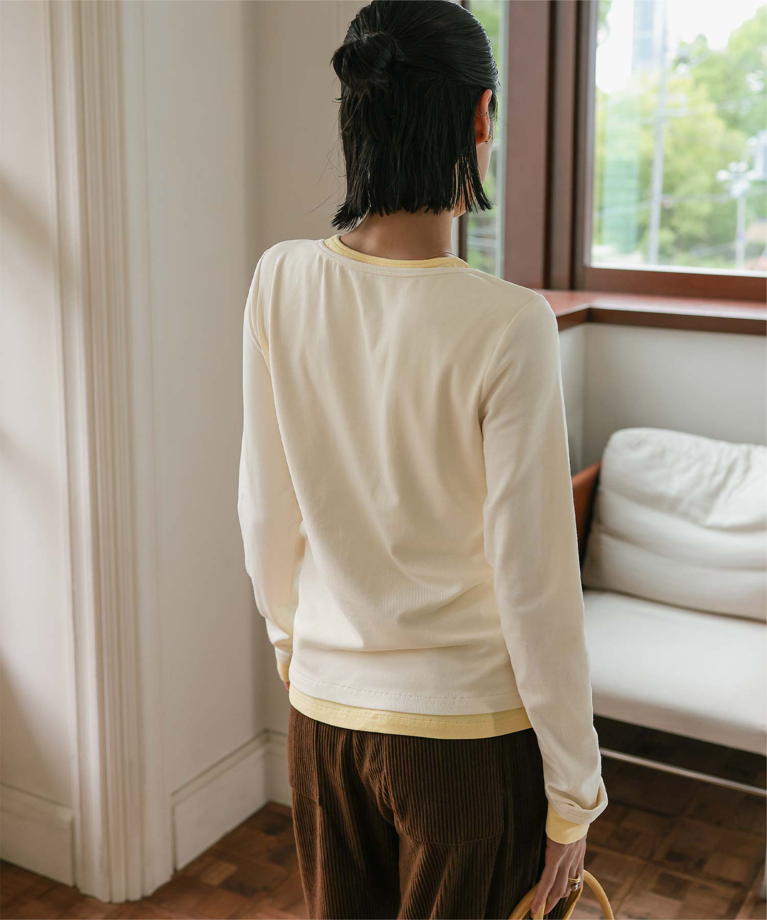 ・レイヤードスタイルを1枚で楽しめる、ヘンリーネックのトップス。