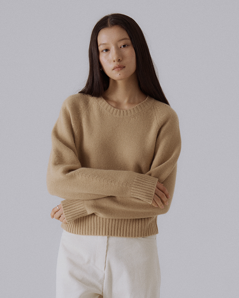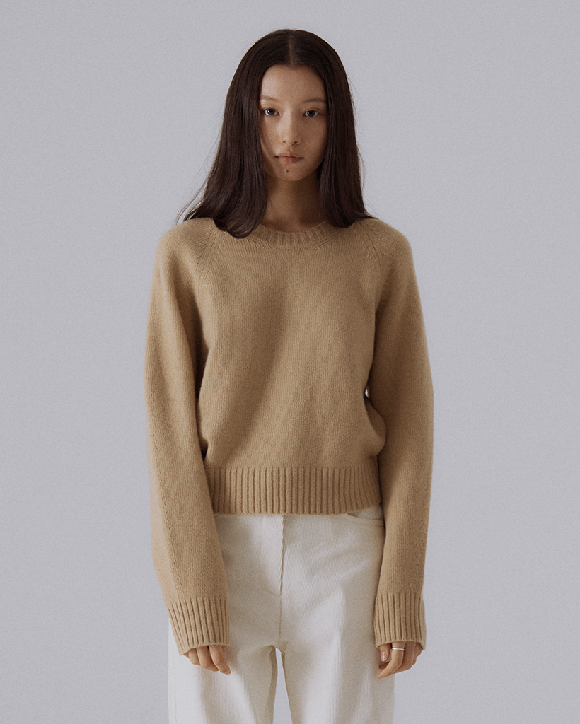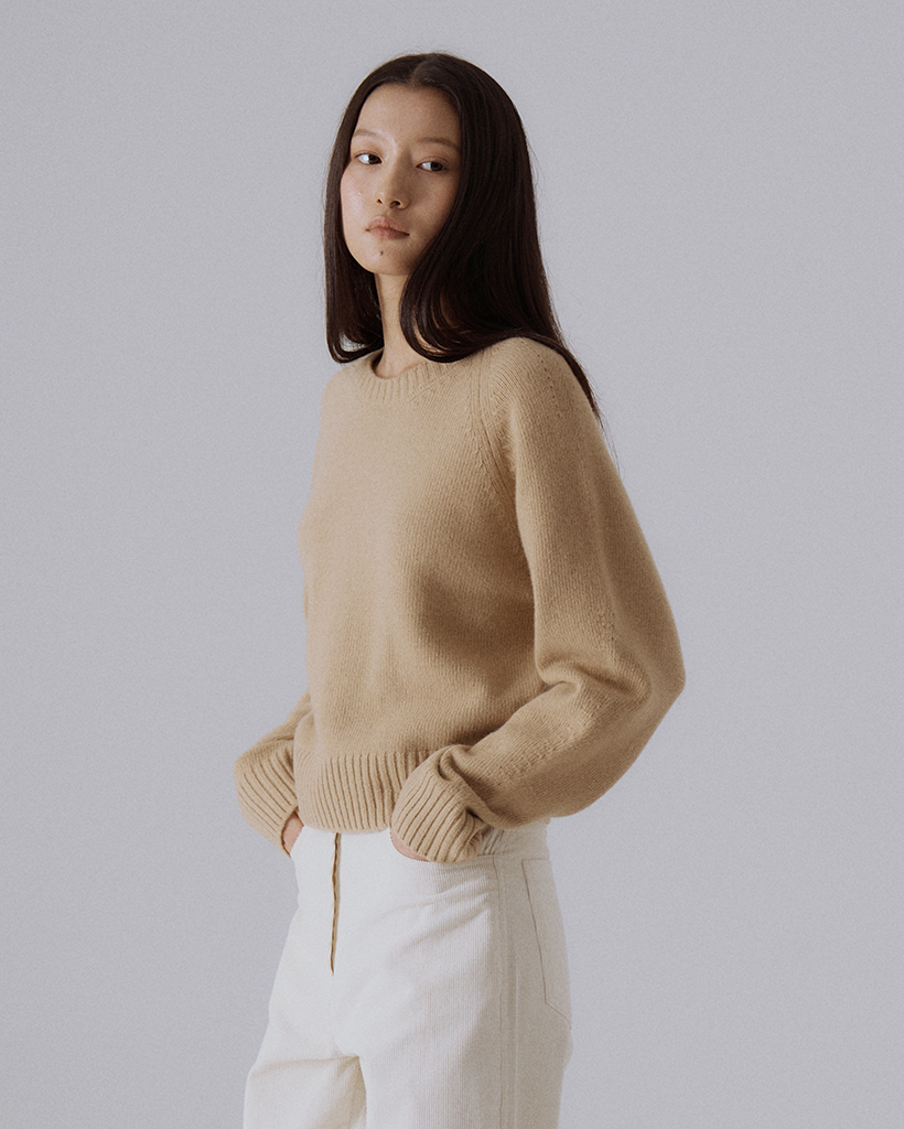ラグランショルダーの曲線に沿って丁寧に編まれたニット組織が自然な立体感を生み出し、ベーシックなシルエットの中でも上質なボリュームと構造感を感じられるニットです。
