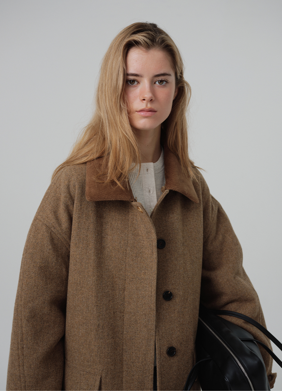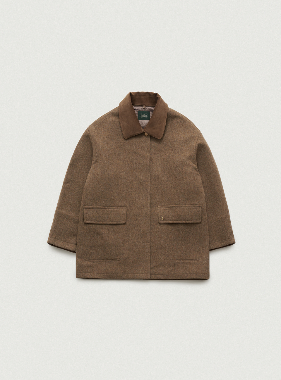 ラグランスリーブ、取り外し可能なコーデュロイカラー、Bロゴのない金属装飾などのディテールがポイントです。