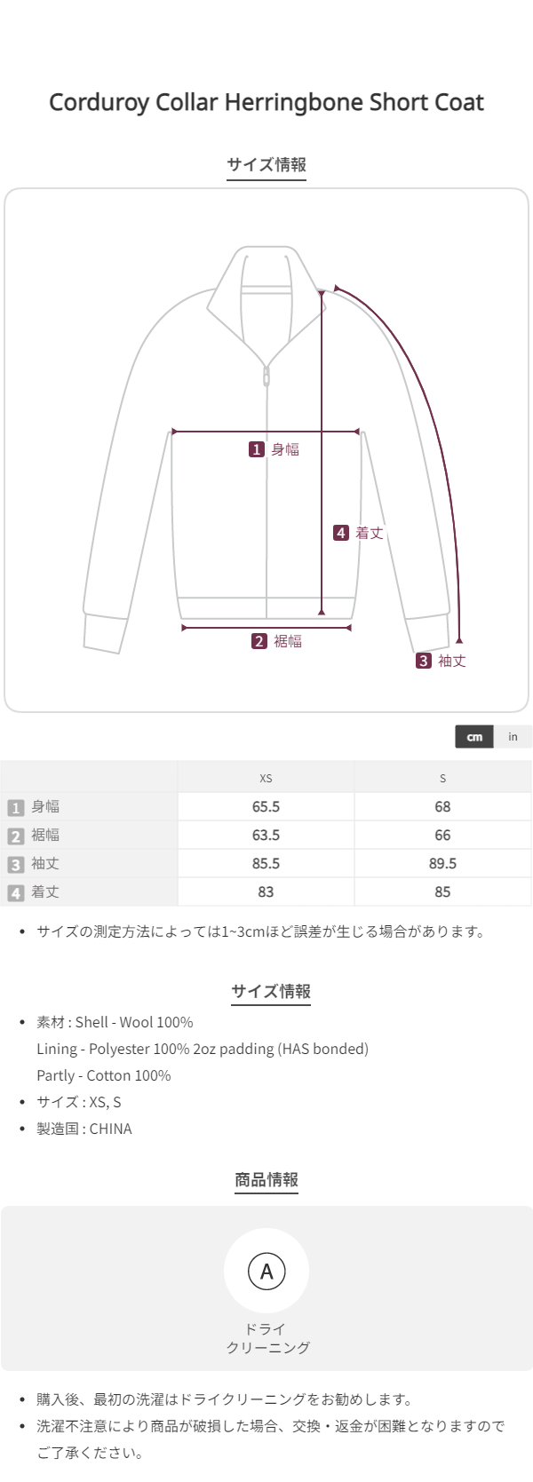 シングルブレスト、クラシックカラー、ボタン開閉仕様のショートコートタイプです。