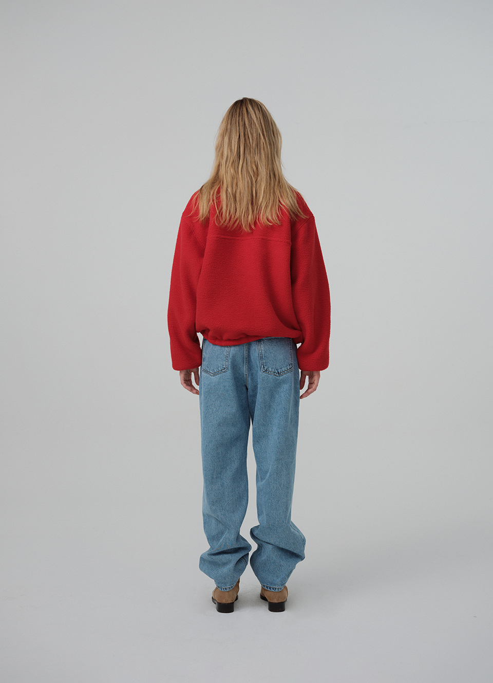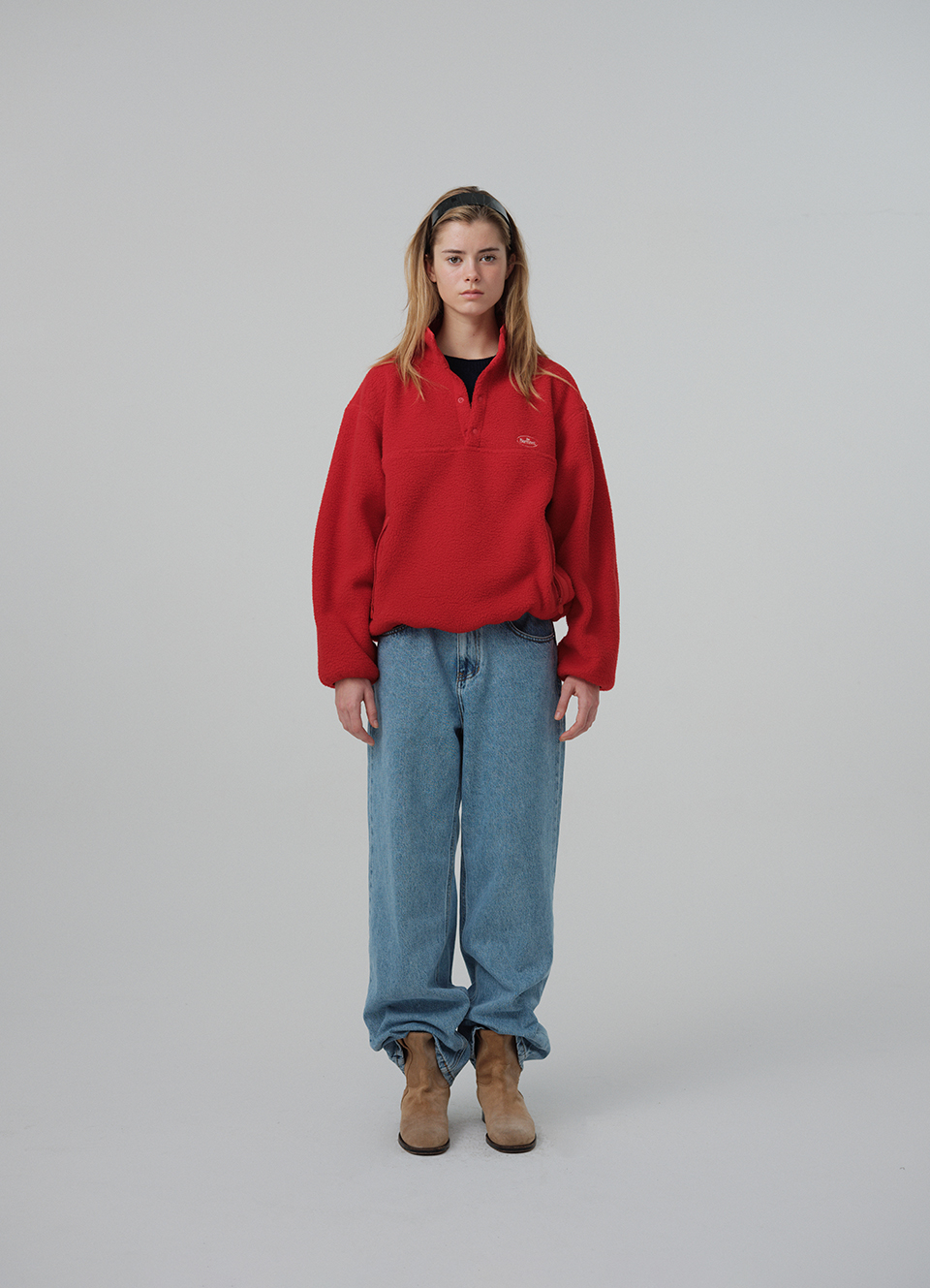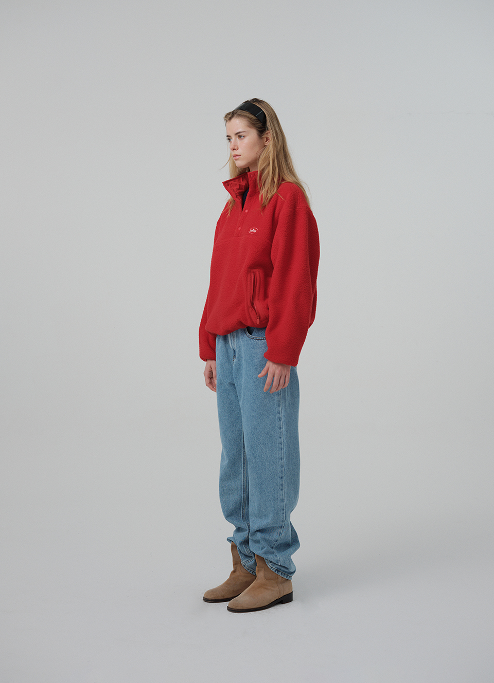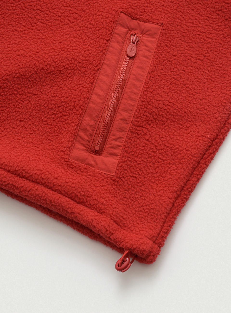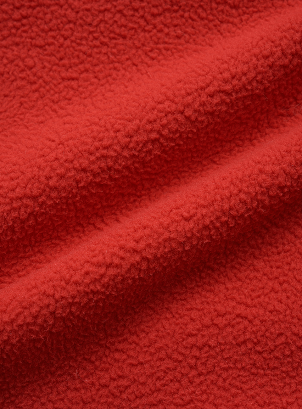 レッドカラーの、柔らかなテクスチャーが特徴のポリエステルフリースファブリックを使用。