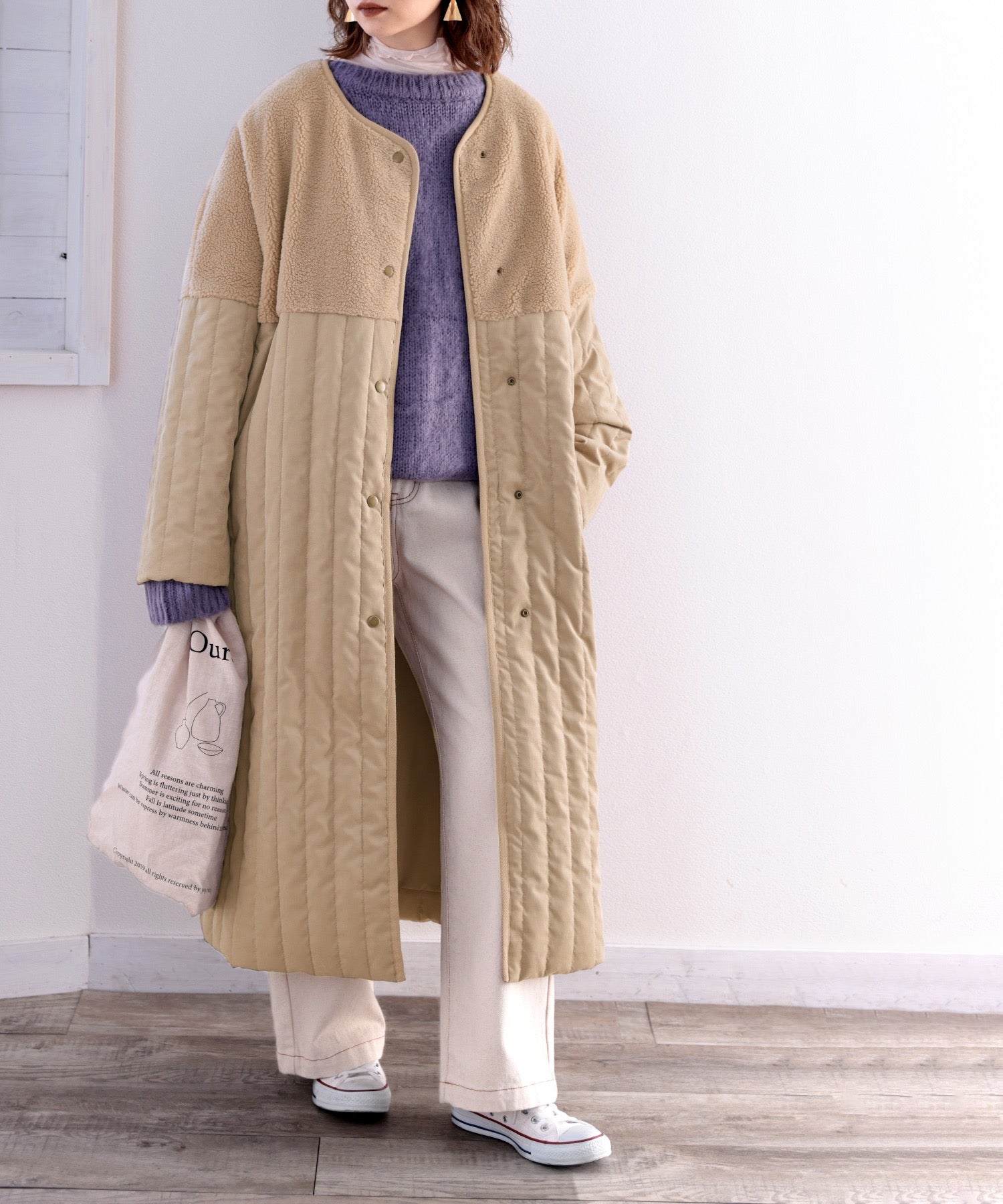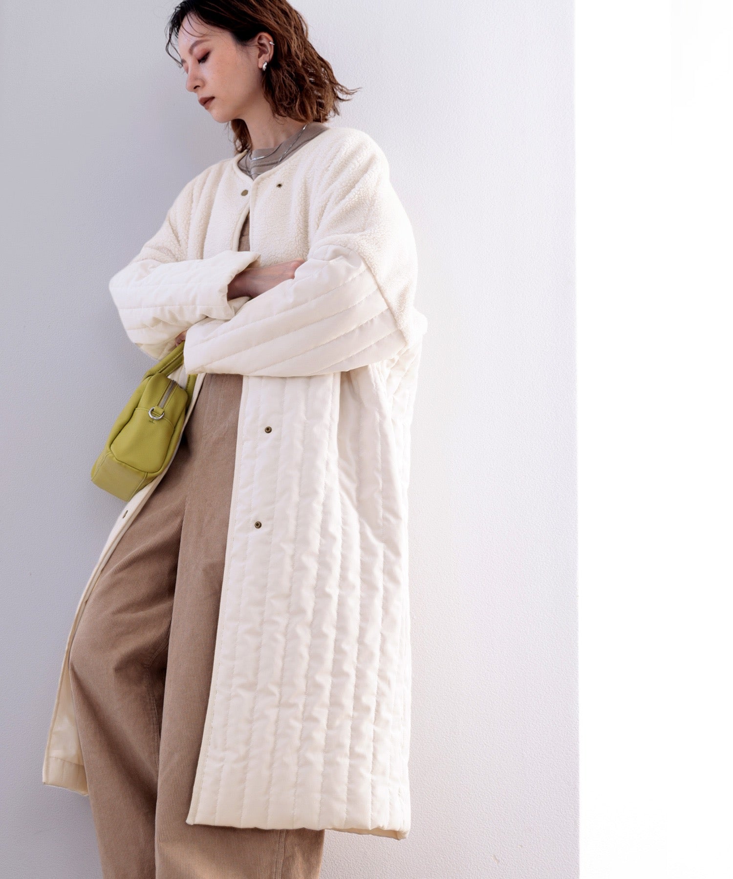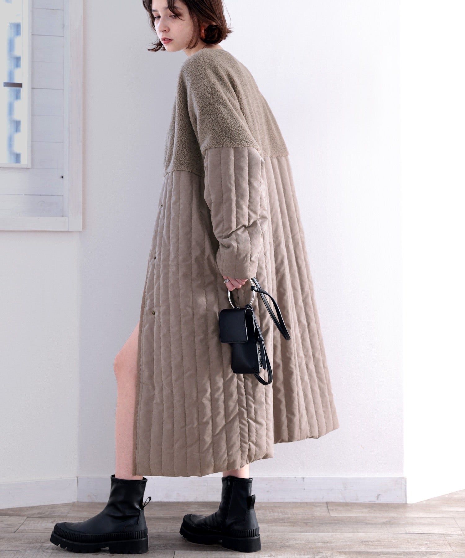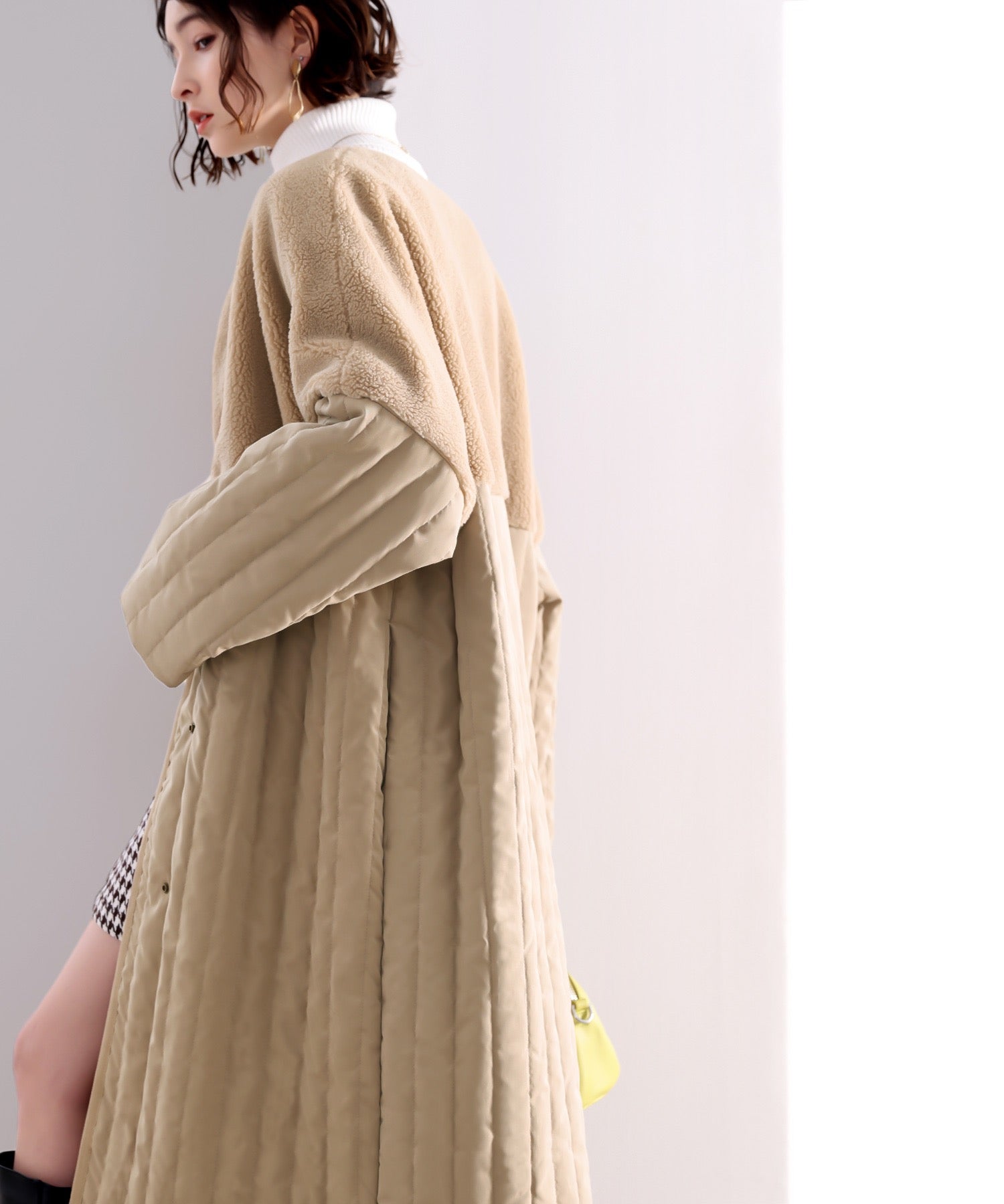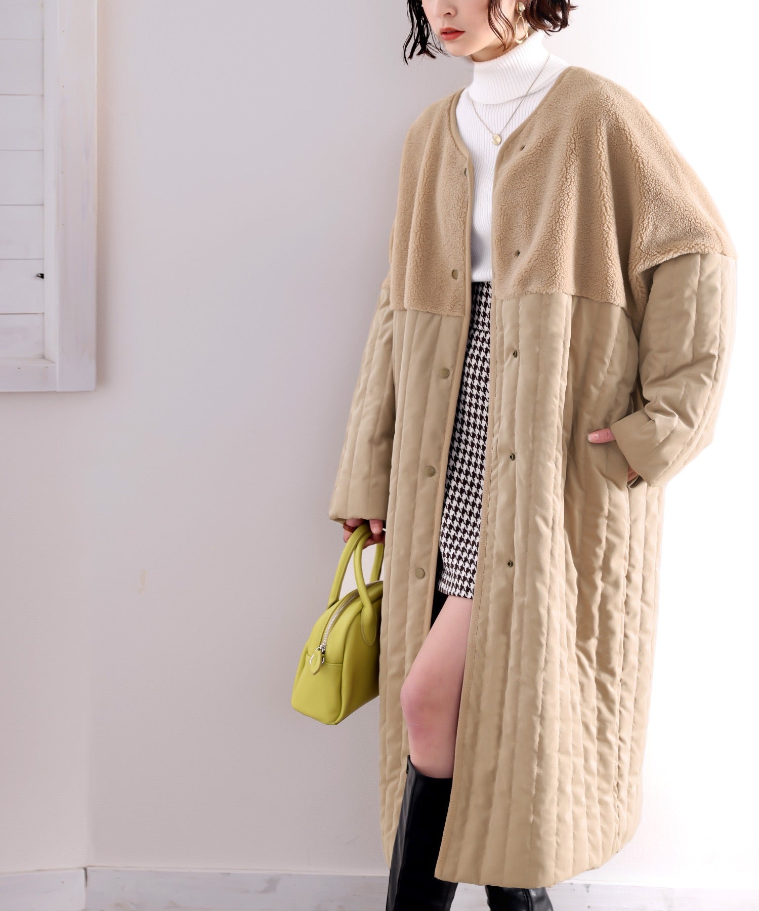 Iラインですっきり見せ。ボア切り替えフェザーキルティングコート ce0420007