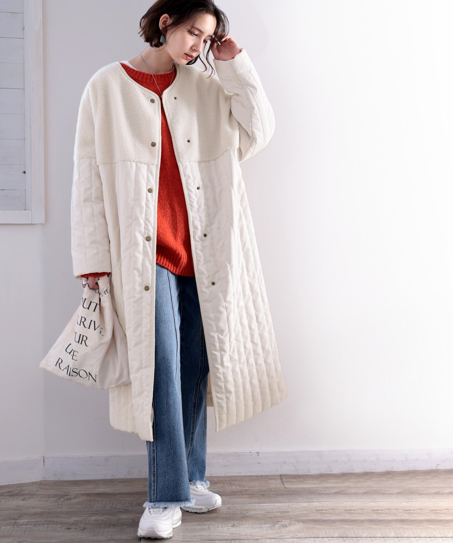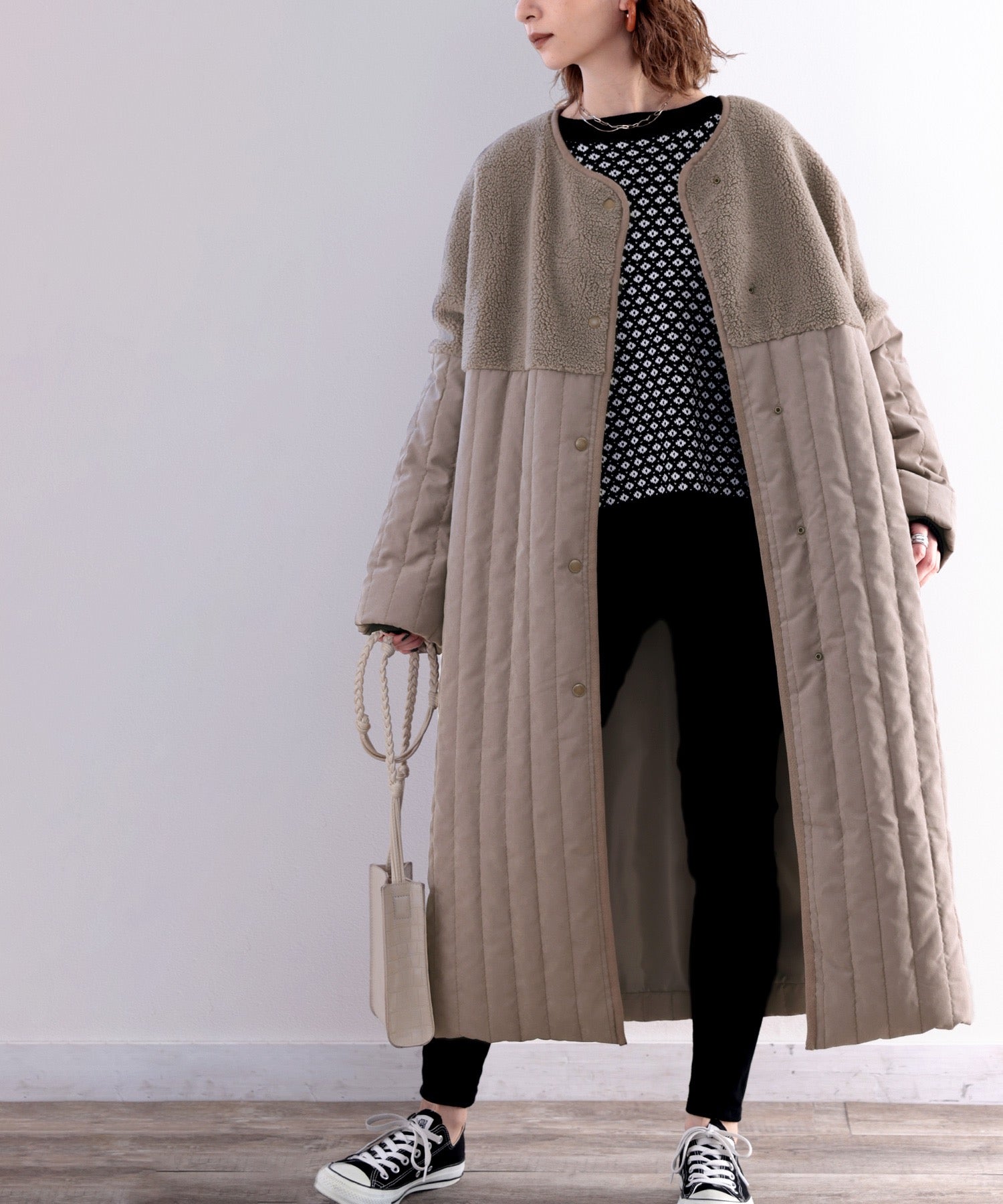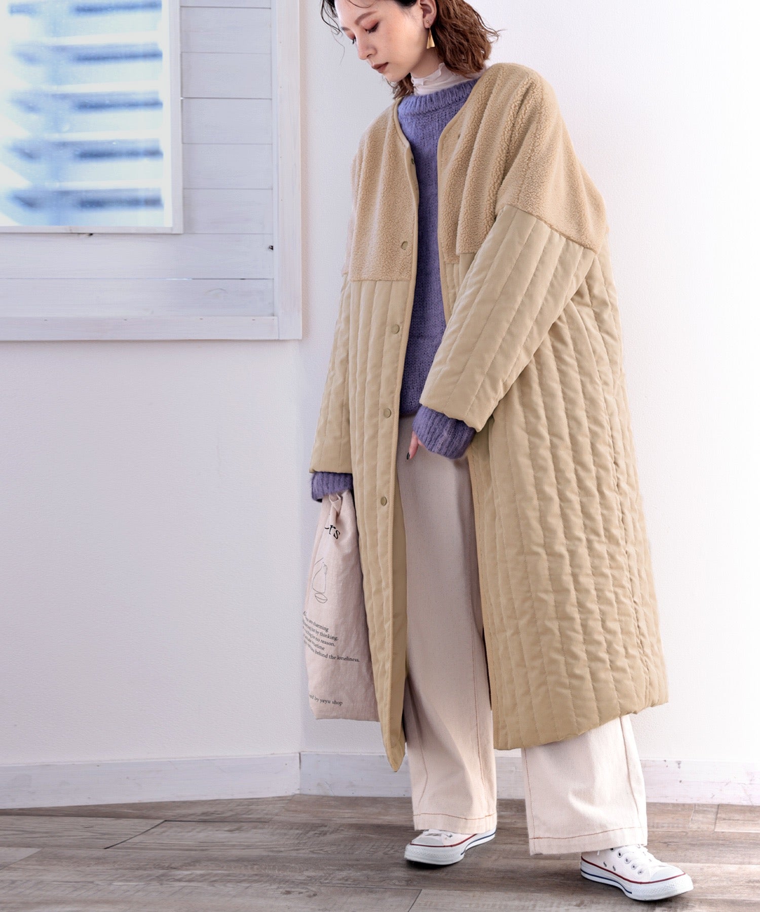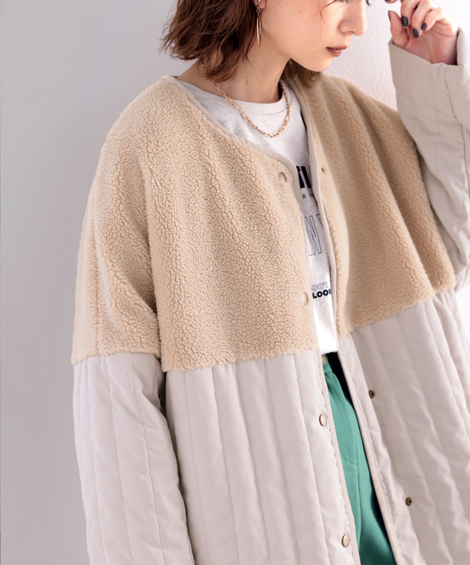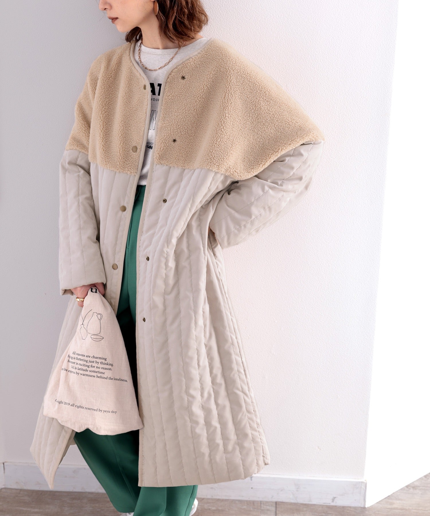 Iラインですっきり見せ。ボア切り替えフェザーキルティングコート ce0420007
