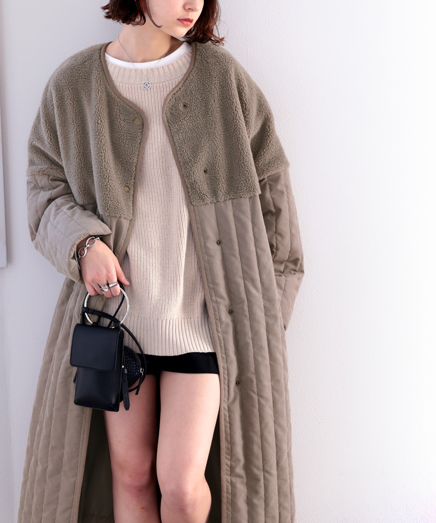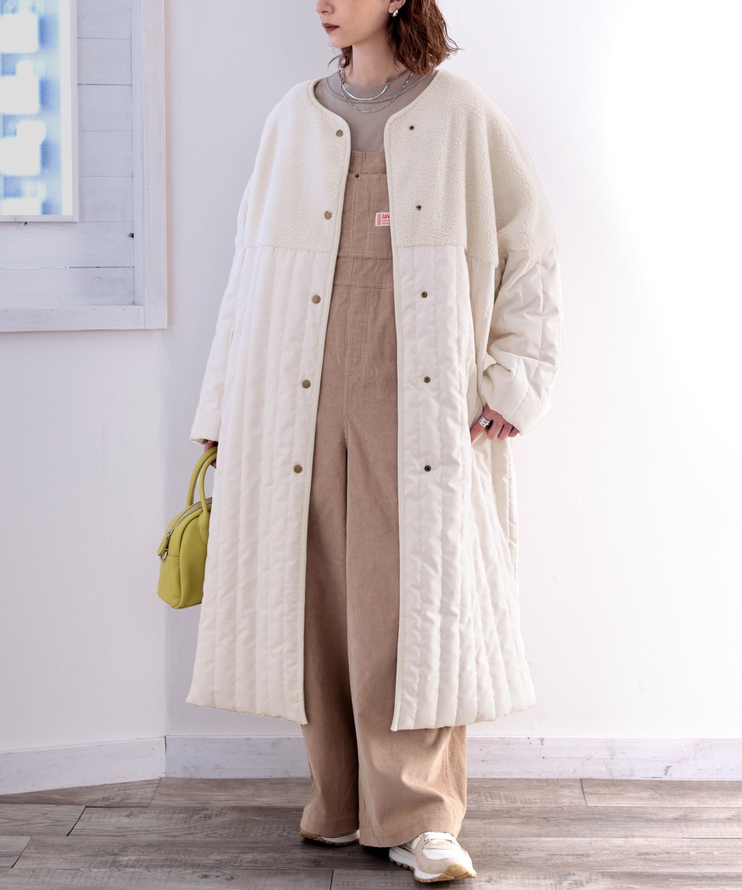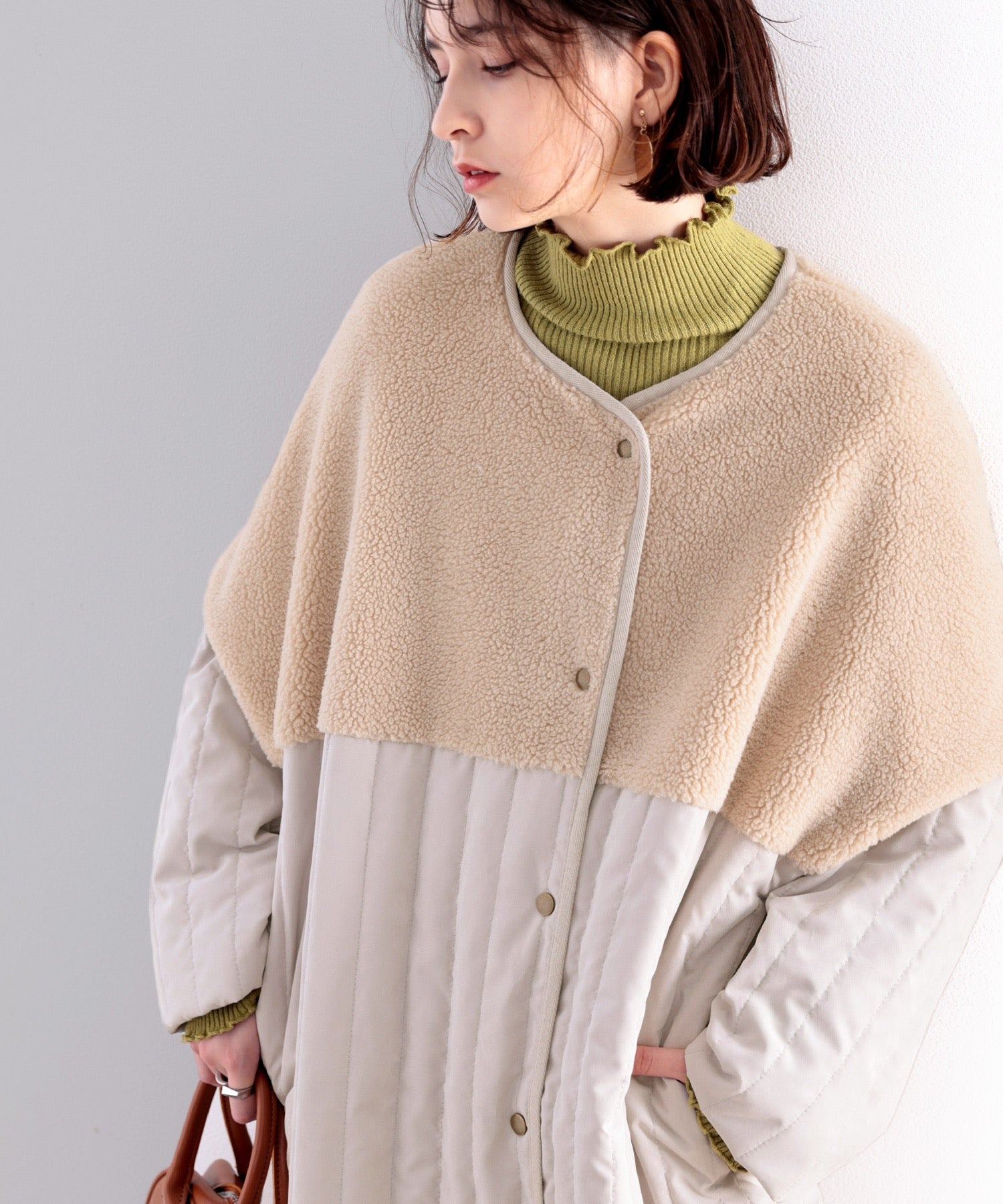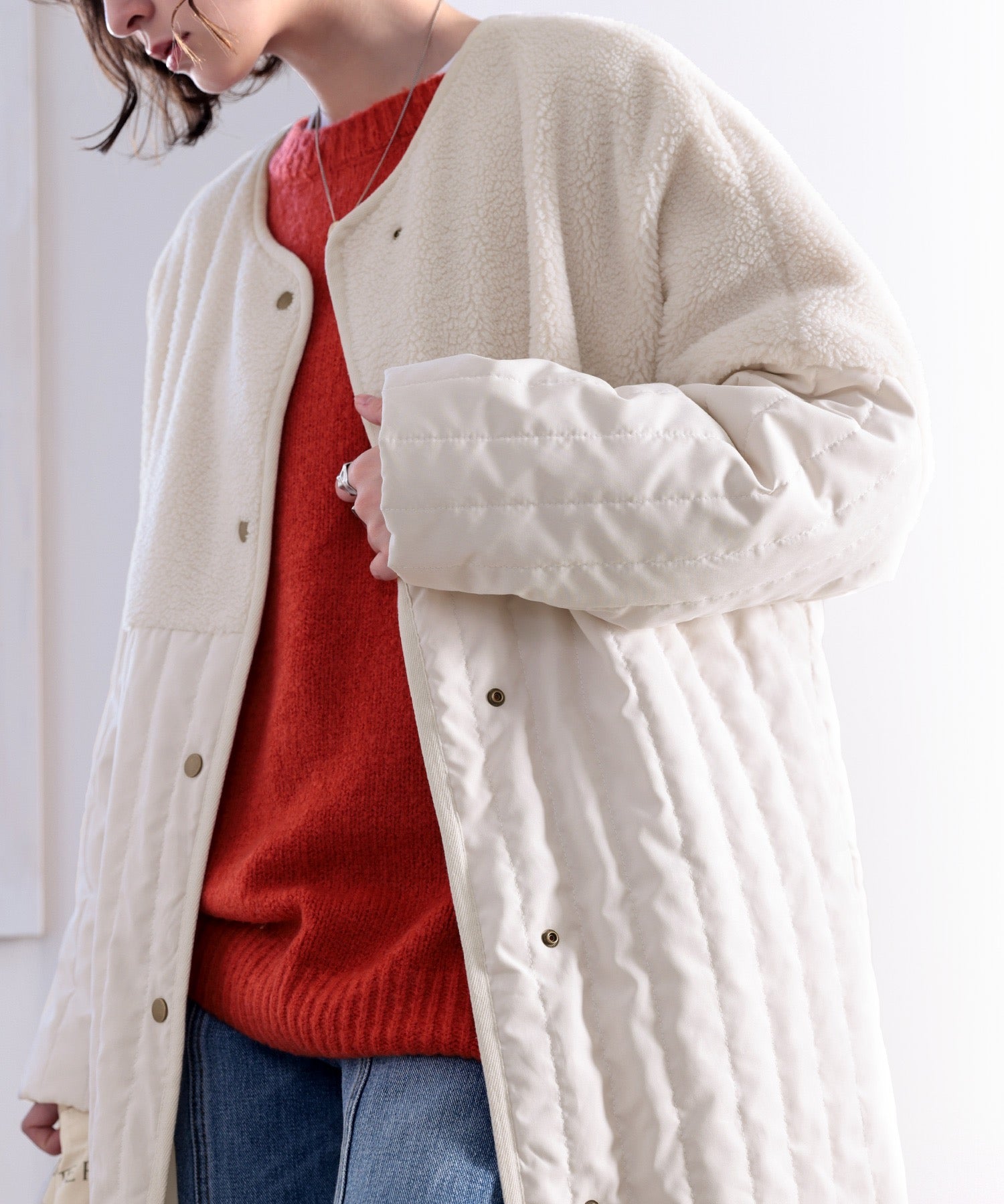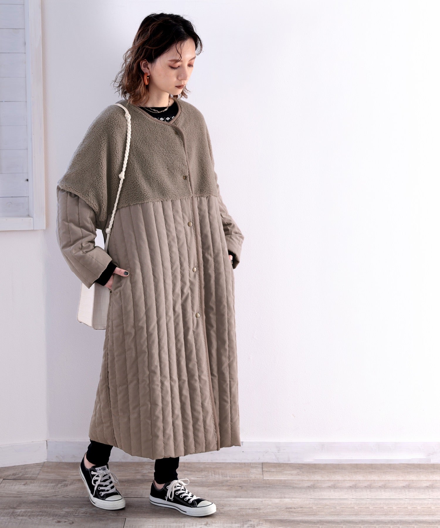 Iラインですっきり見せ。ボア切り替えフェザーキルティングコート ce0420007