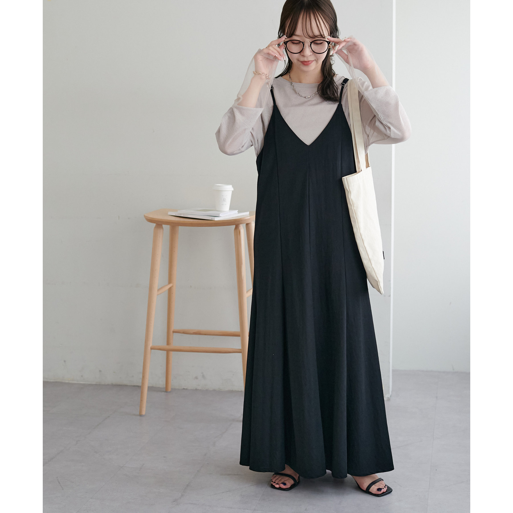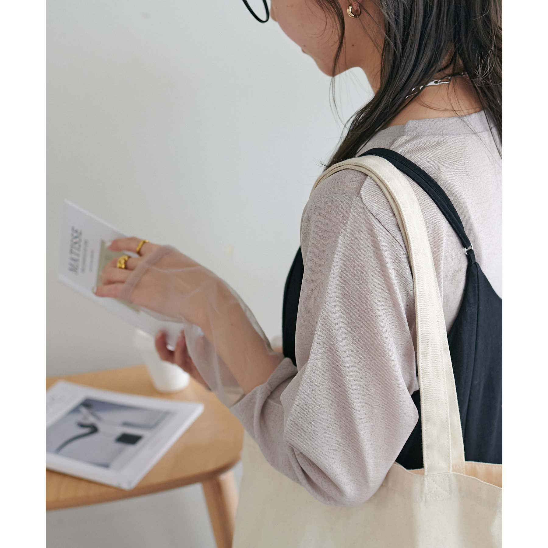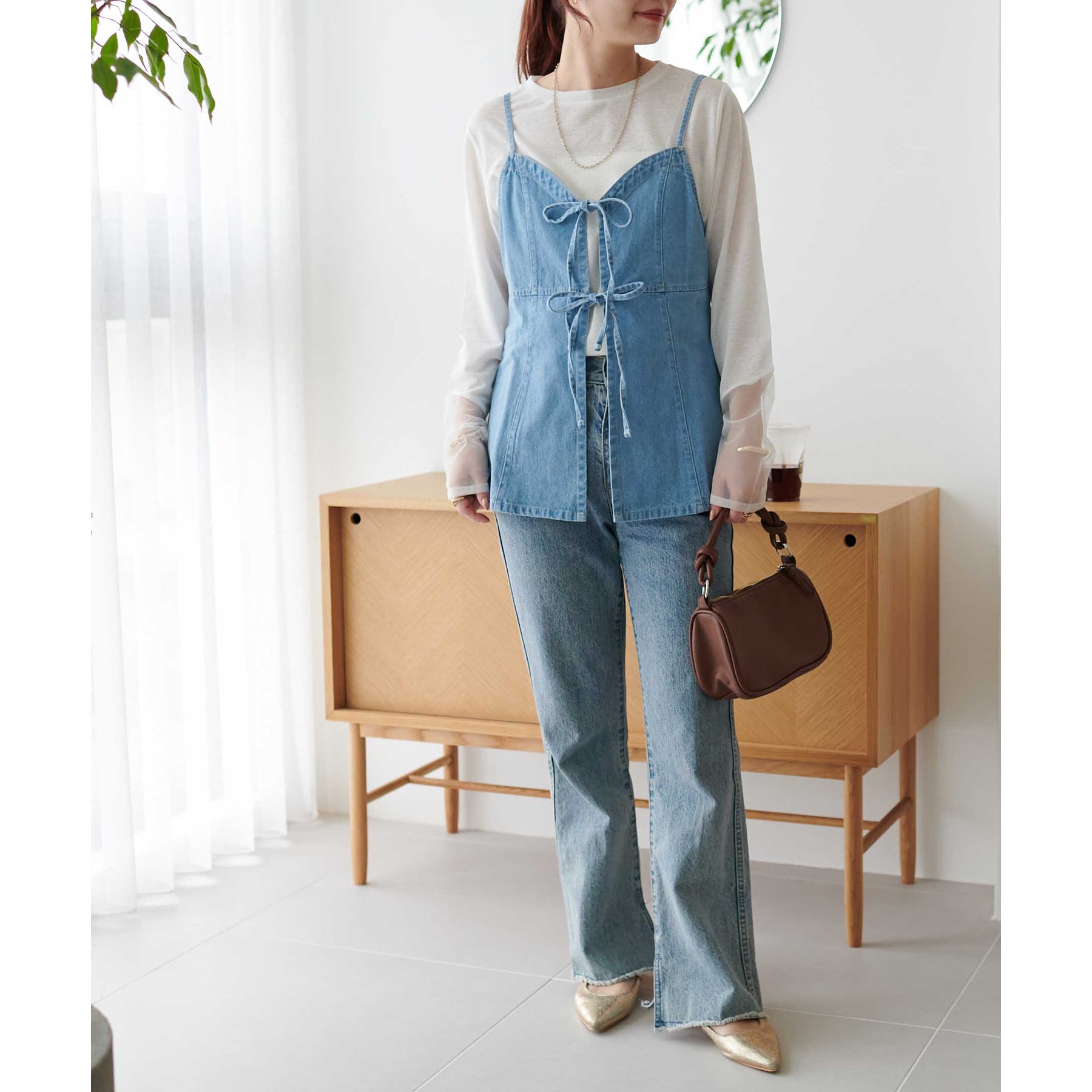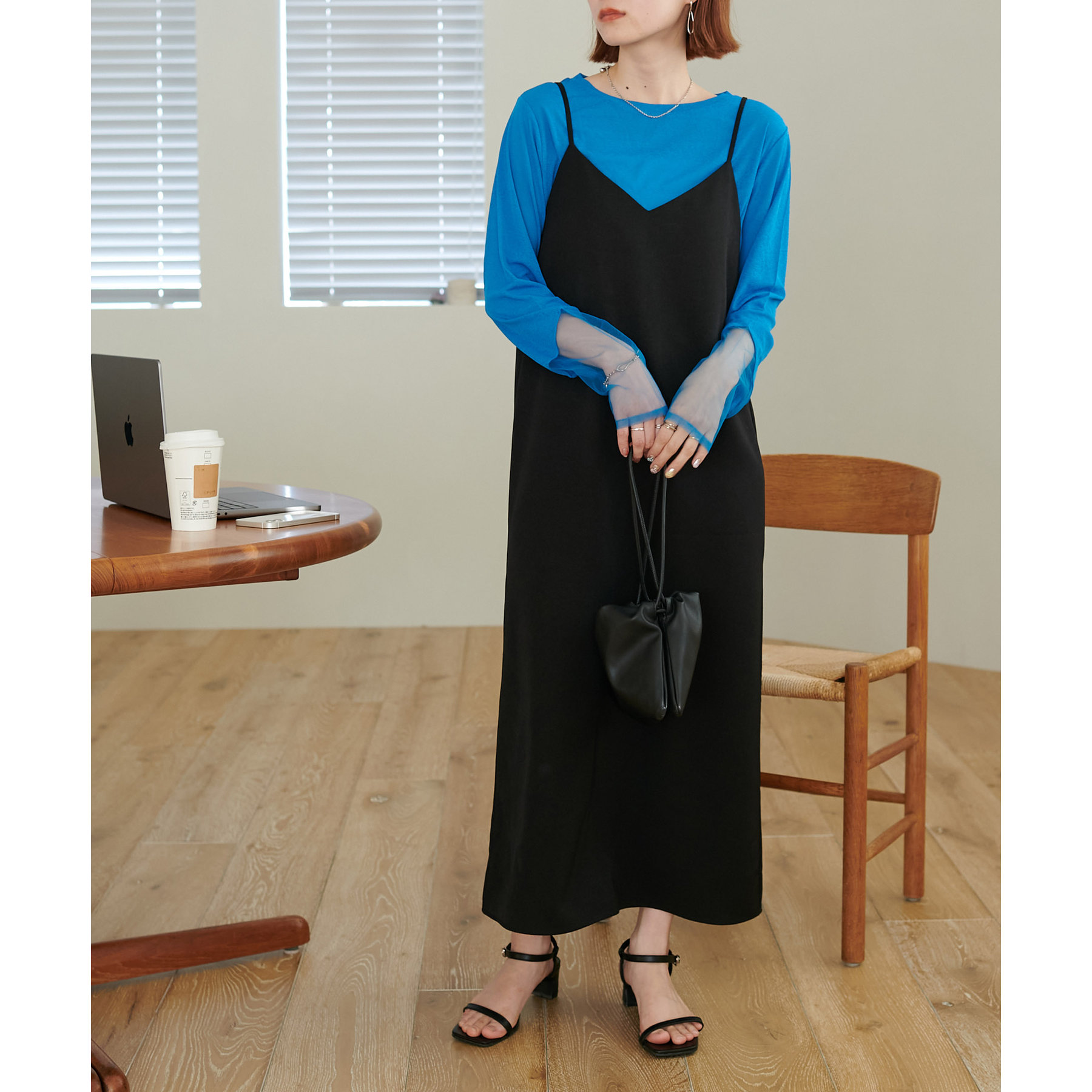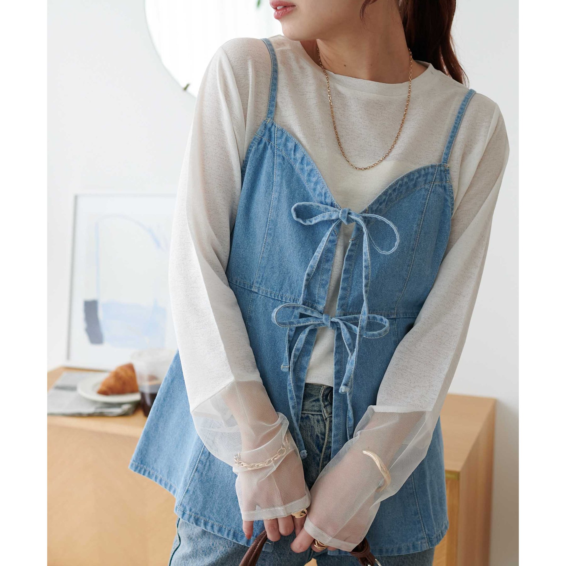 トレンドのカップ付きのキャミソールに重ねた、透け感を楽しむヘルシーな着こなしも是非。