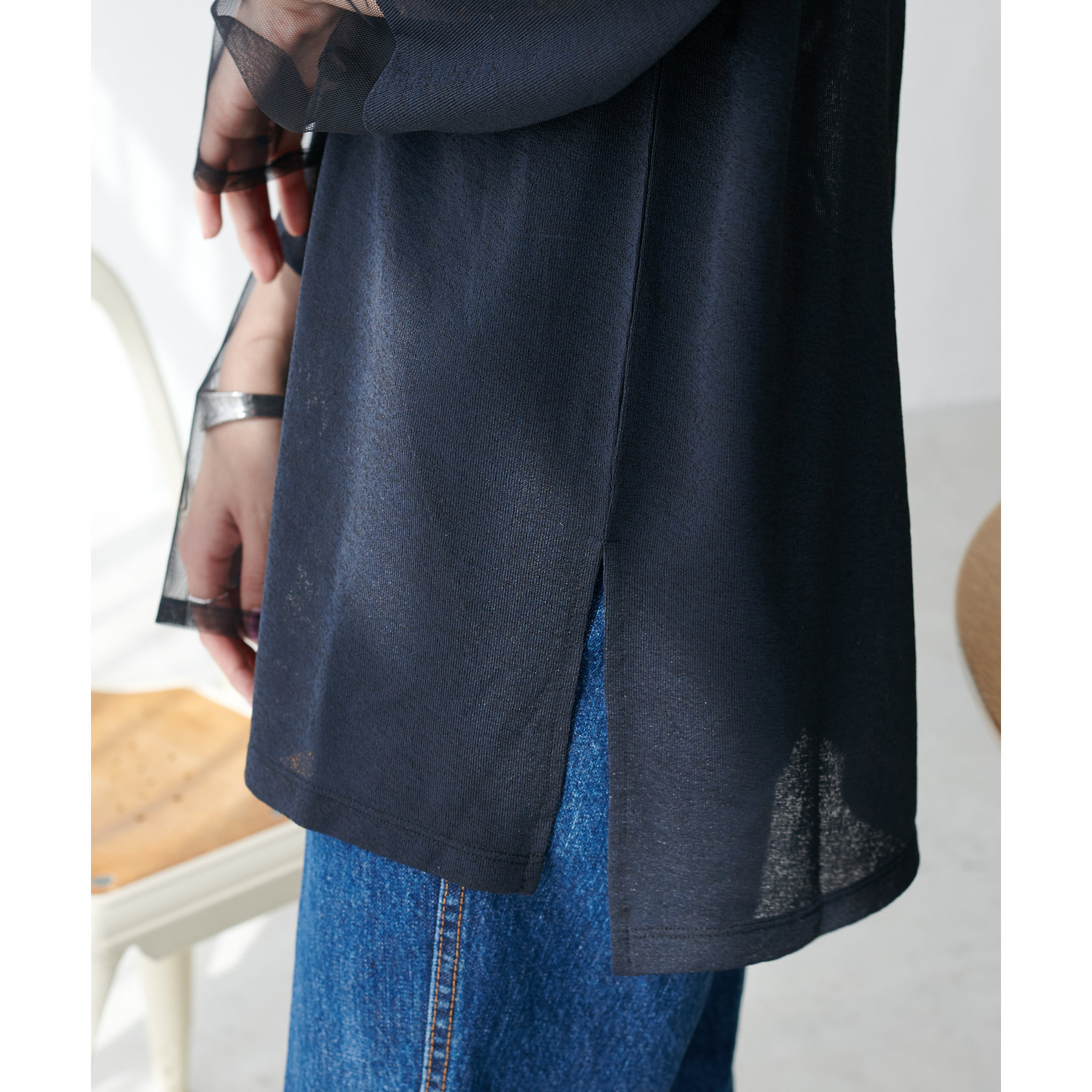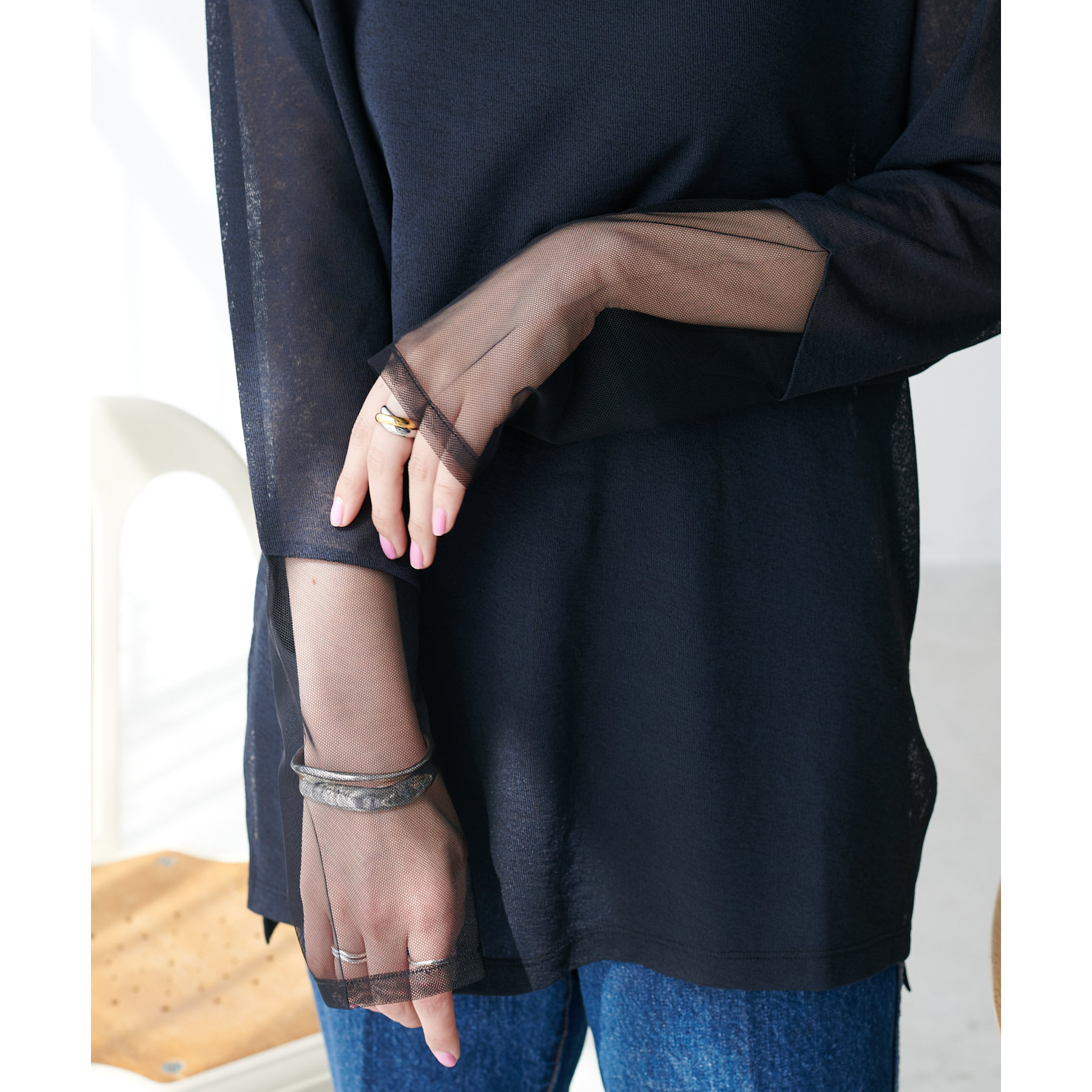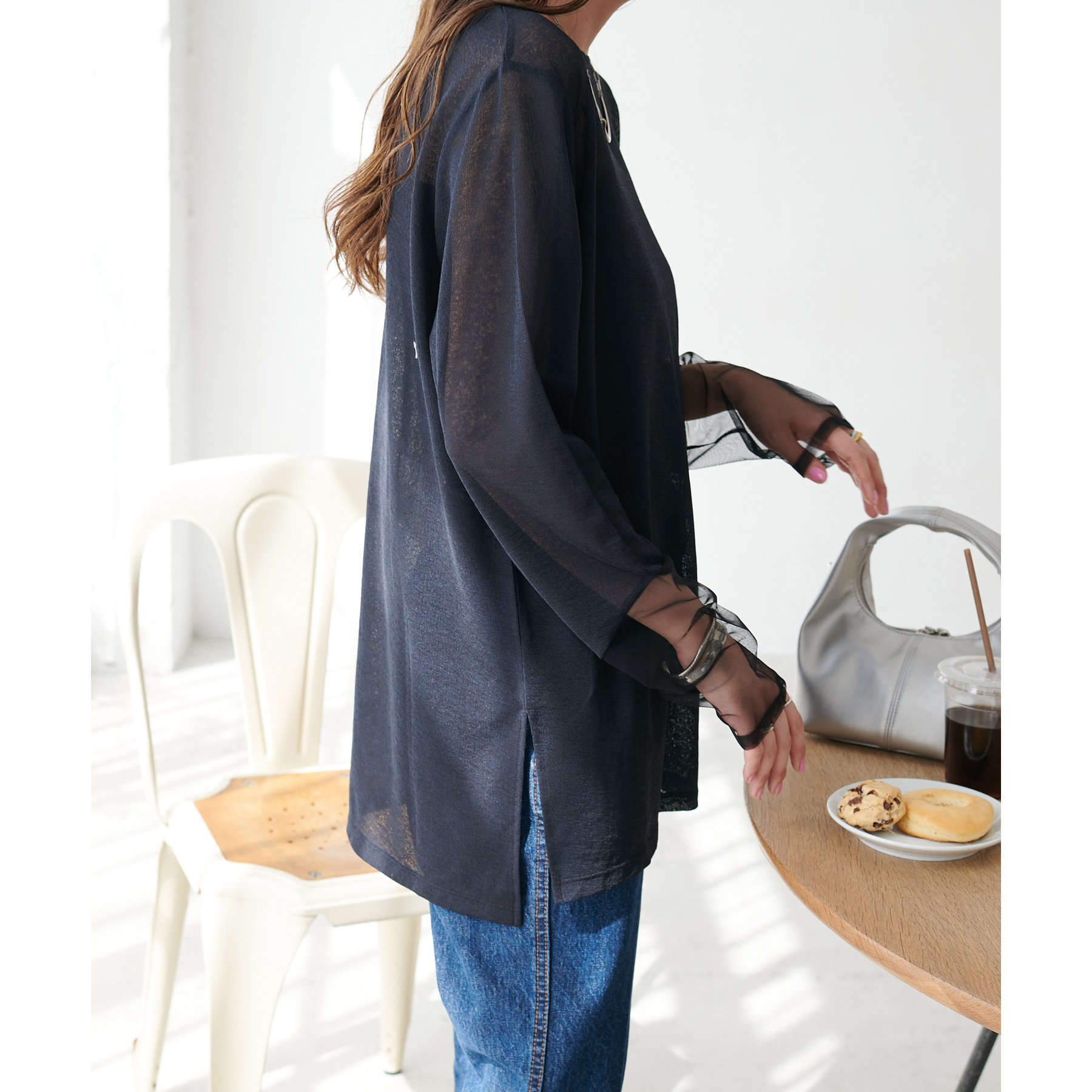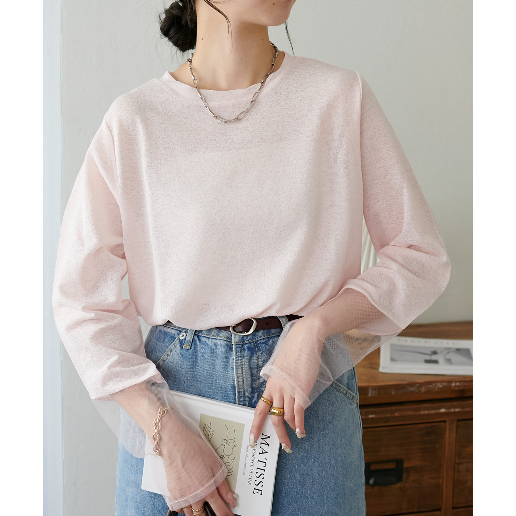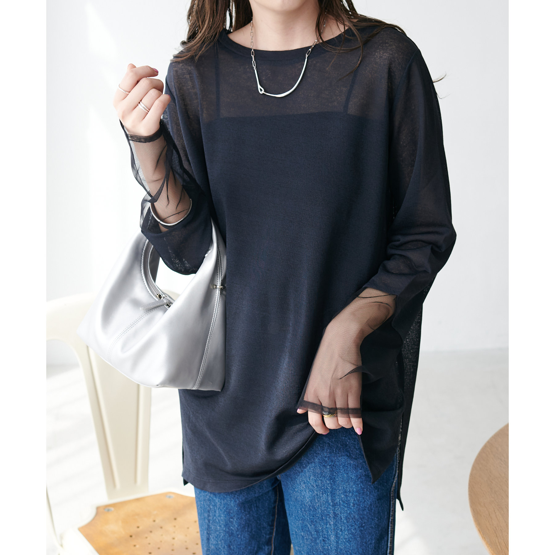 透け感が涼やかな印象を与え、シーズンスタイルにぴったりなプルオーバー。袖口の切り替えがアクセントになり、シンプルなコーディネートに抜け感を演出します。長めの着丈にはサイドスリットを入れ、タックアウトしても様になるデザインに。一枚ではもちろん、ジャケットやワンピースなどのインナーとしても活躍するアイテムです♪