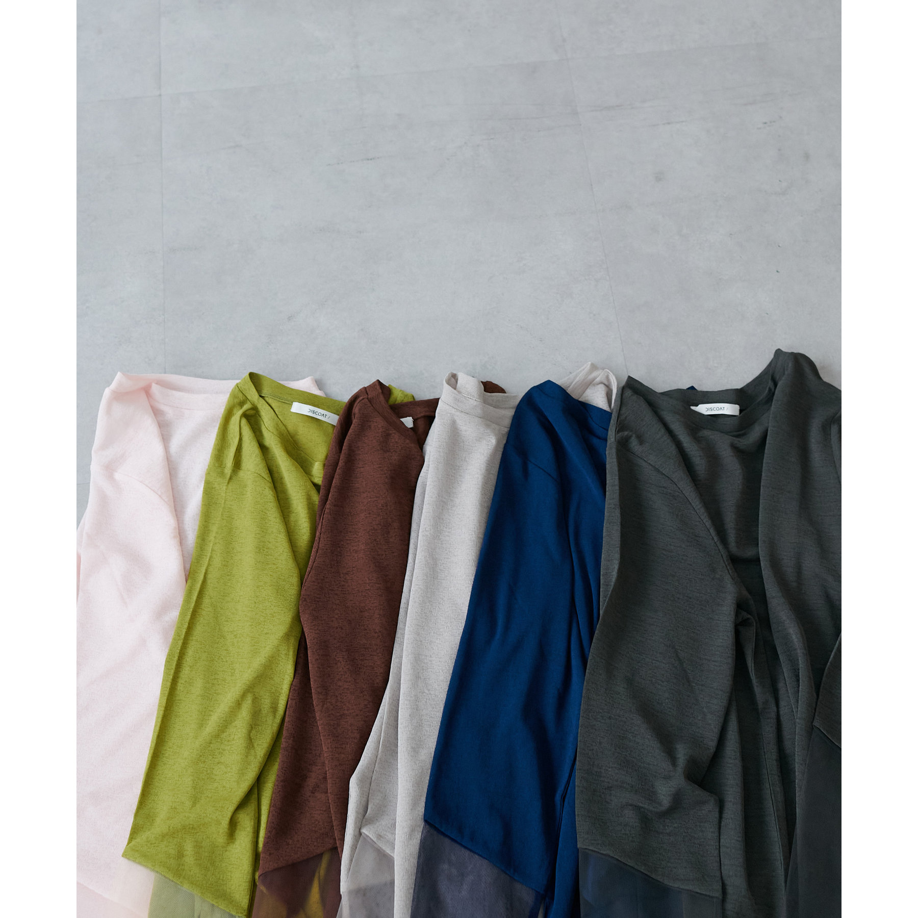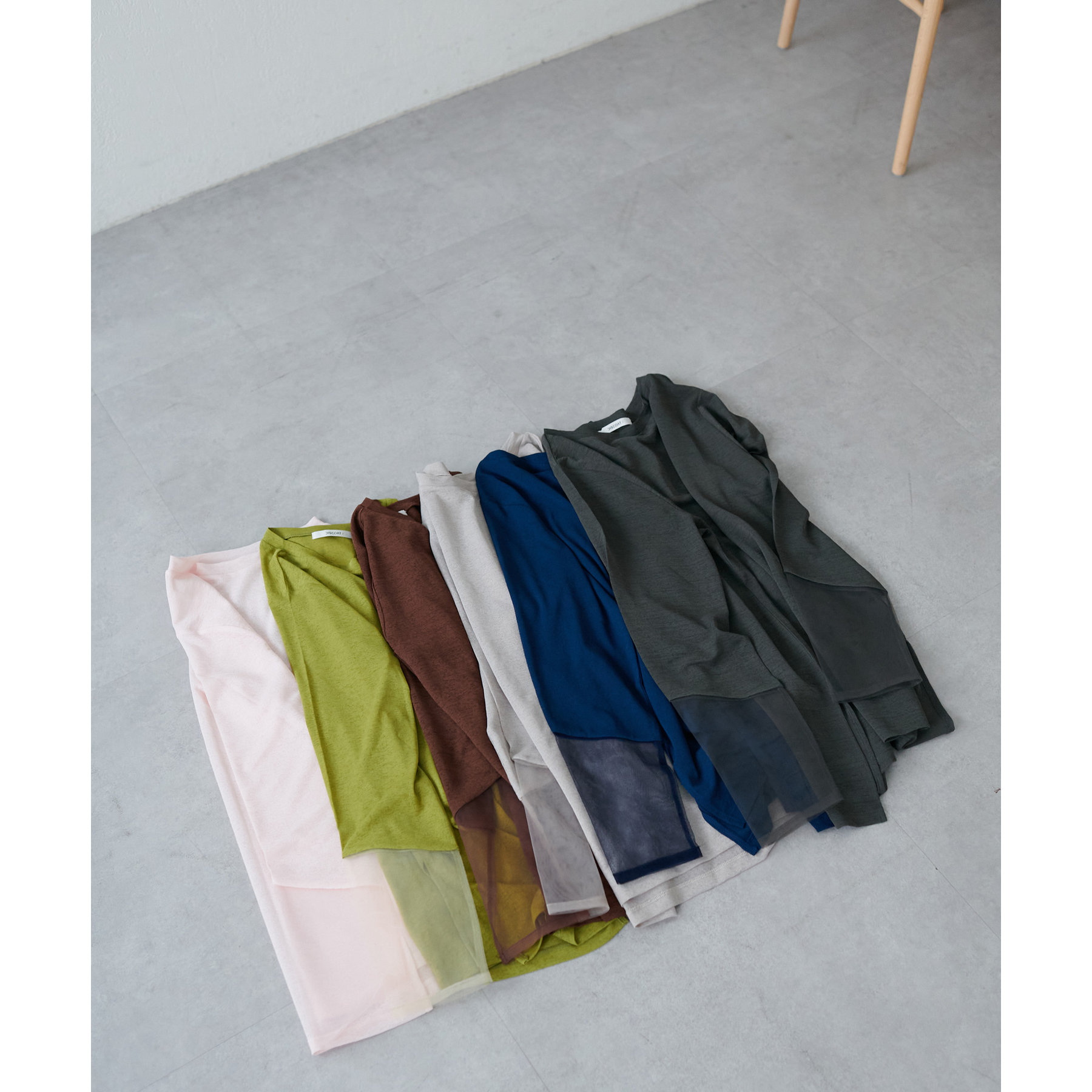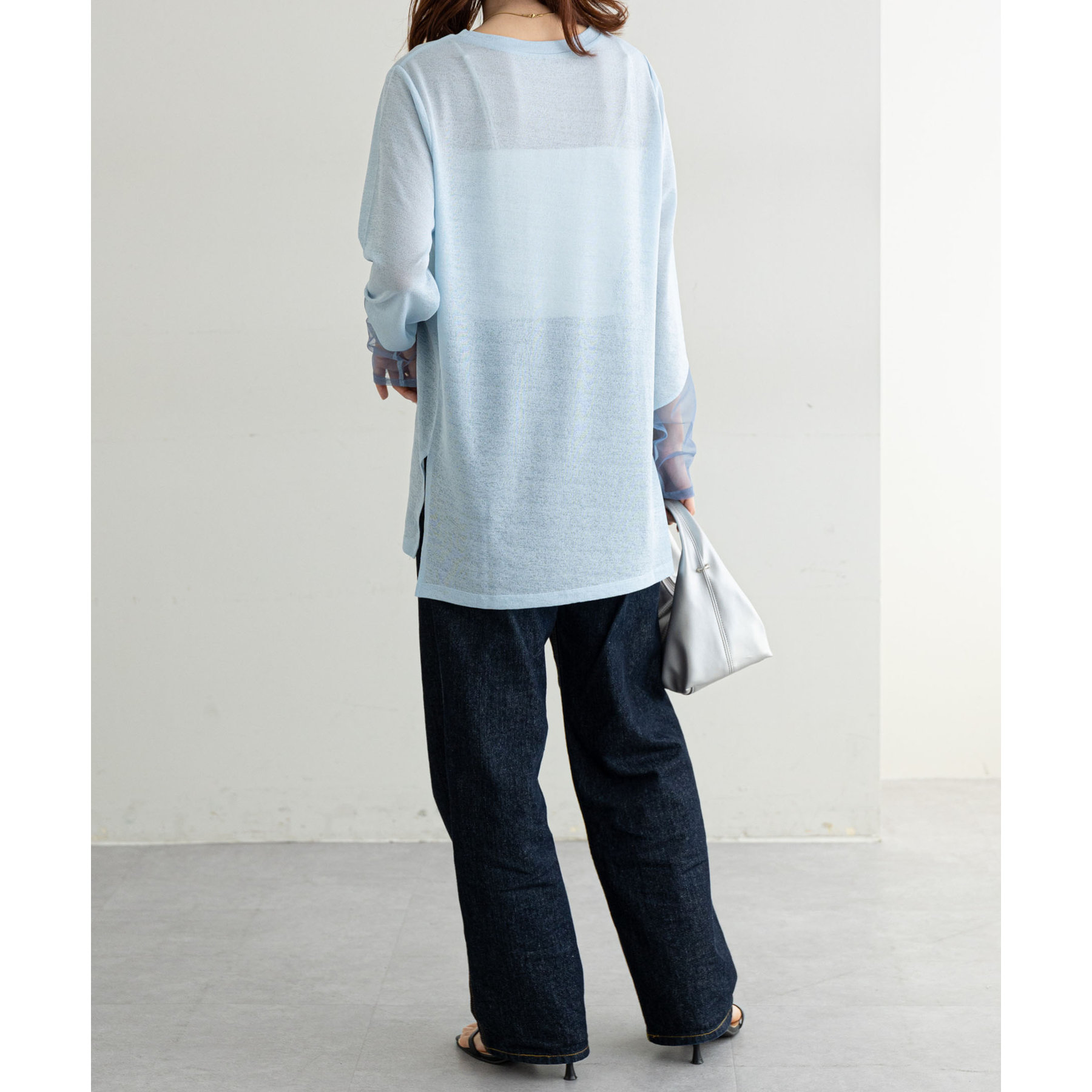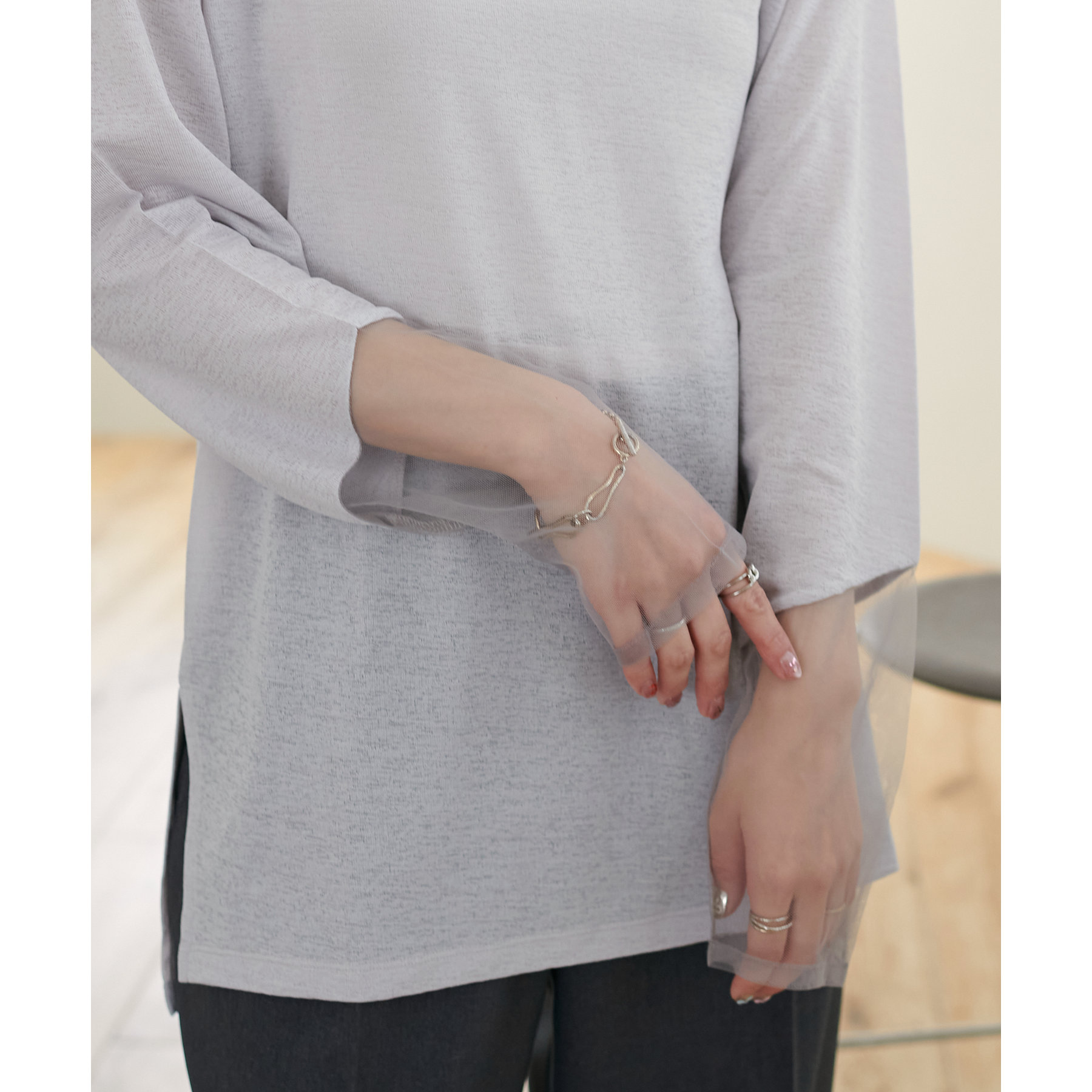 透け感が涼やかな印象を与え、シーズンスタイルにぴったりなプルオーバー。袖口の切り替えがアクセントになり、シンプルなコーディネートに抜け感を演出します。長めの着丈にはサイドスリットを入れ、タックアウトしても様になるデザインに。一枚ではもちろん、ジャケットやワンピースなどのインナーとしても活躍するアイテムです♪